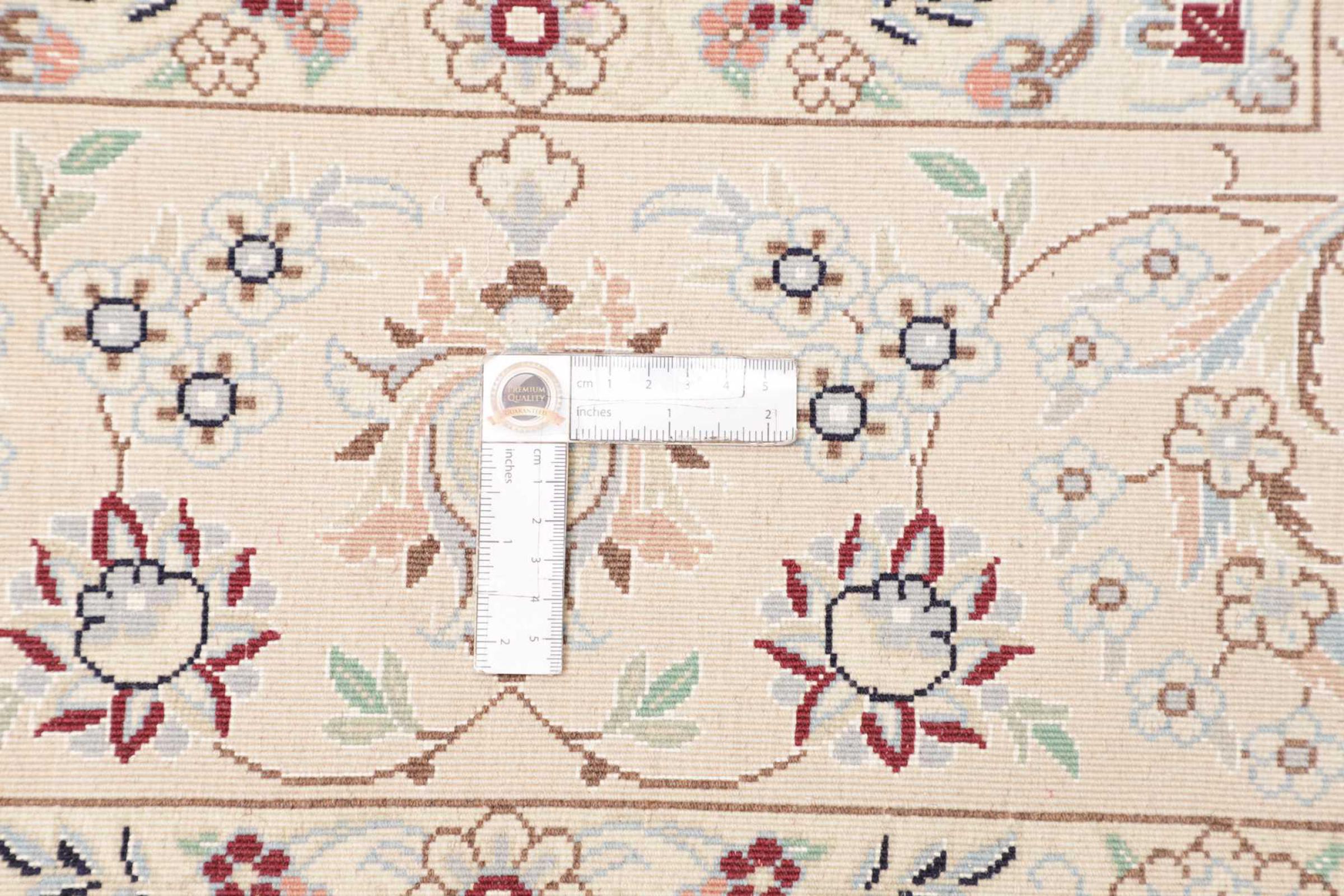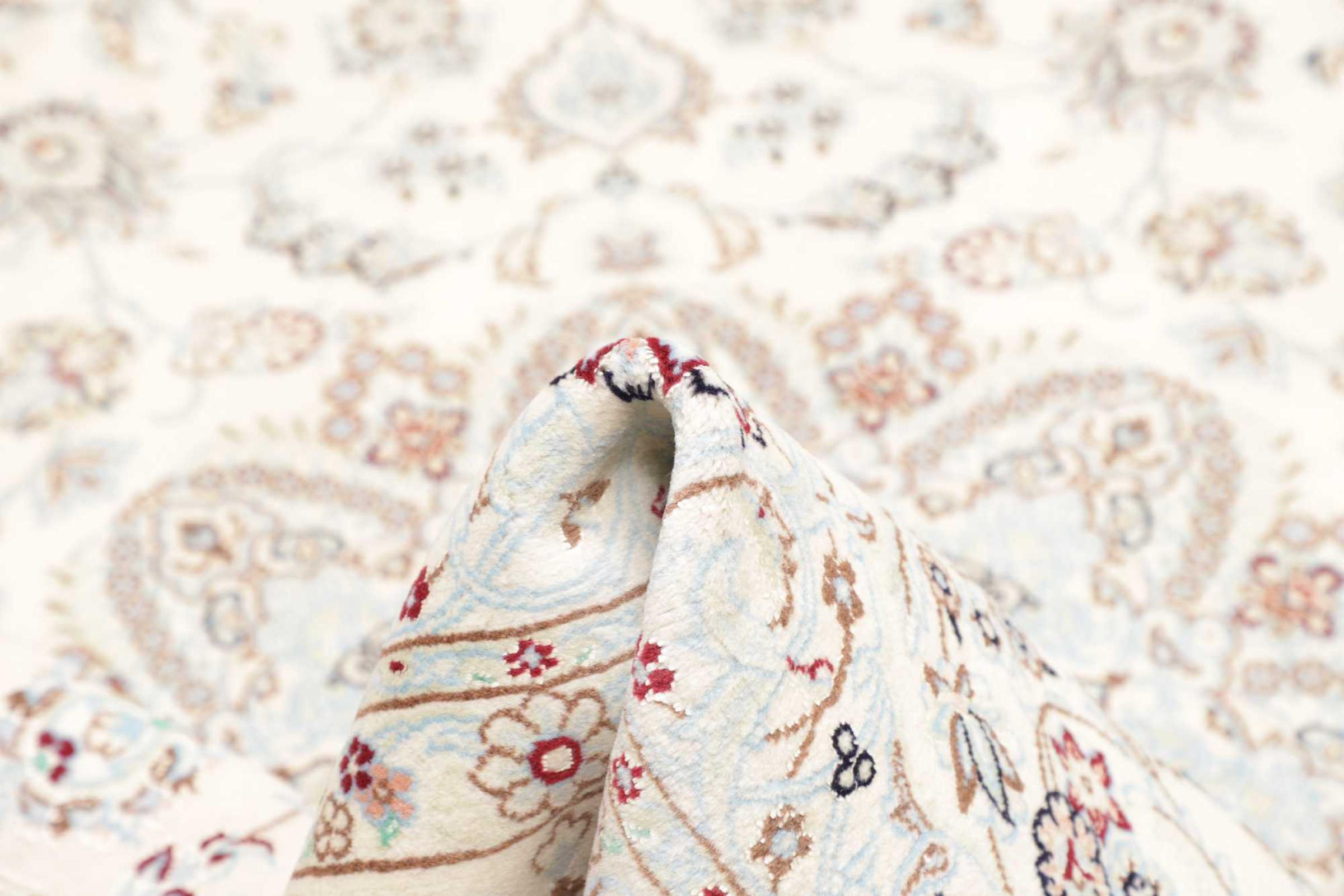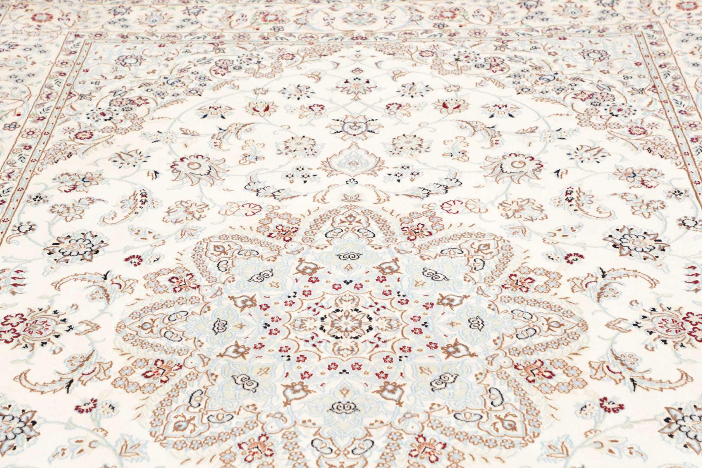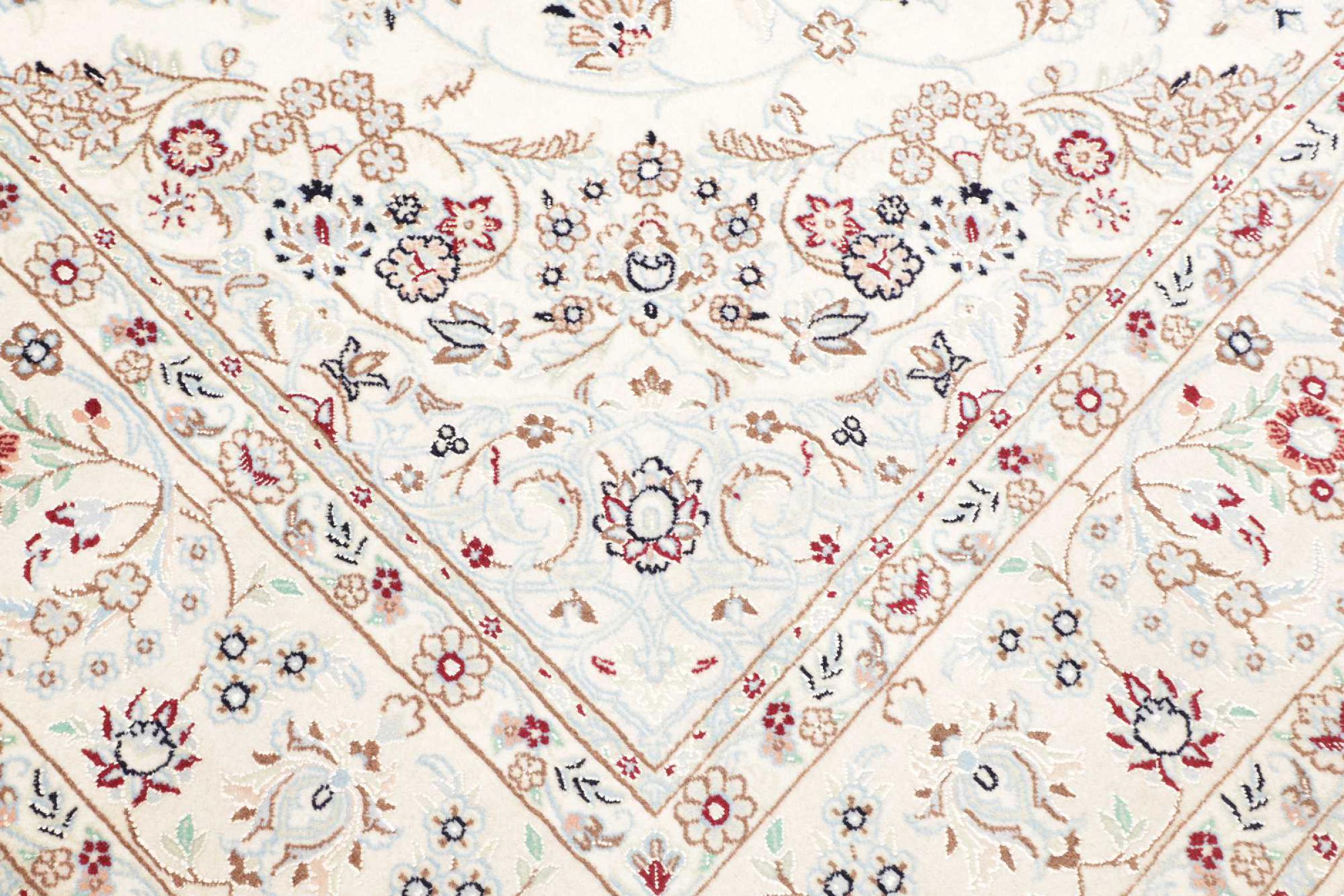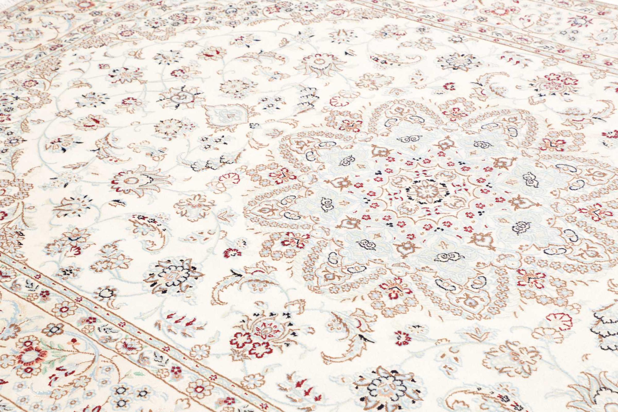 Dette Nain-tæppe er klassificeret 9La. Den fremragende kvalitet, det smukke orientalske design med sine buede mønstre glæder enhver køber. Dette persiske tæppe blev håndknyttet af højkvalitets uld og natursilke i byen Nain, som ligger i den vestlige udkant af Dasht-e-Kavir-ørkenen. 9La Nain er væsentligt finere end en 12La og viser allerede smukke detaljer.