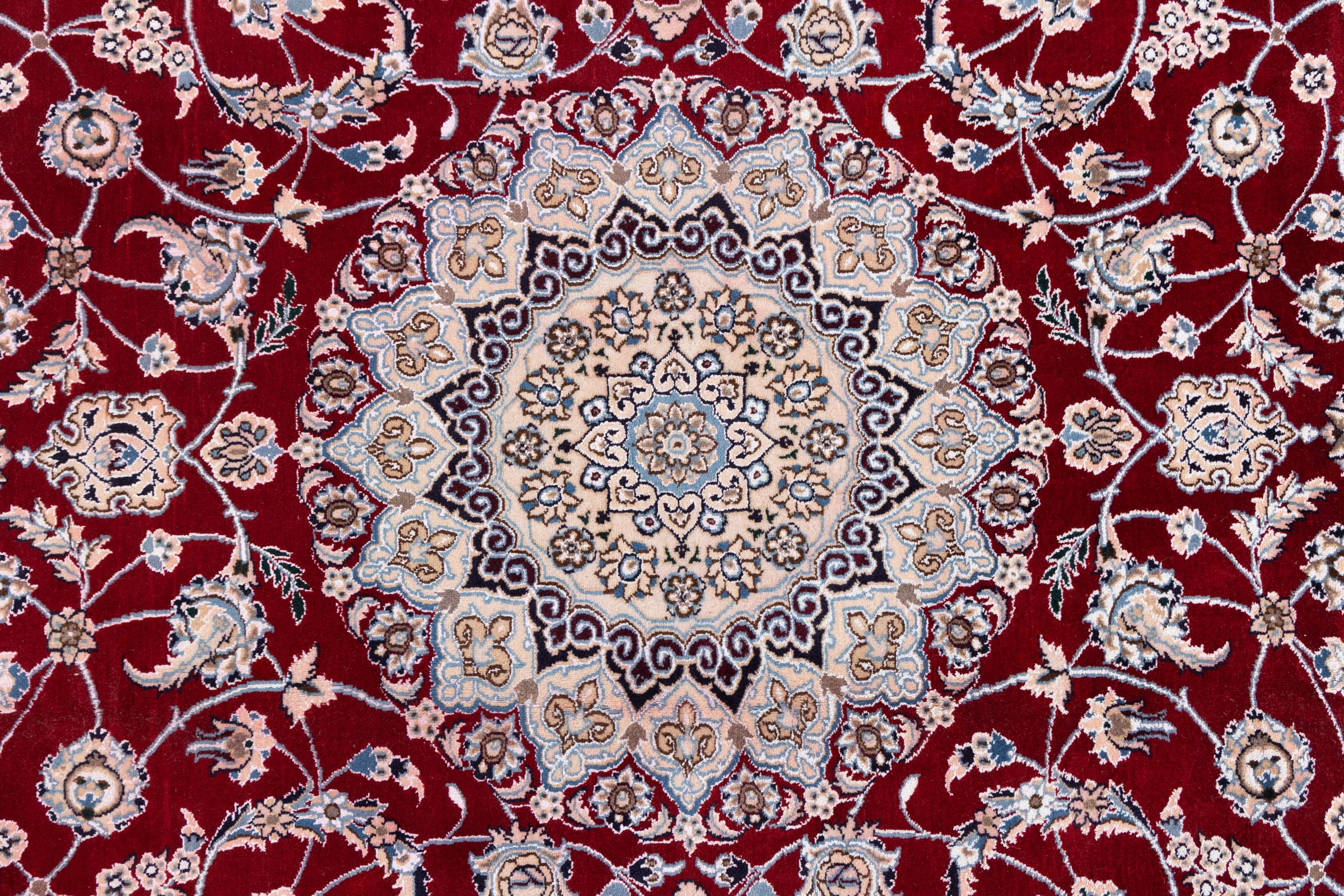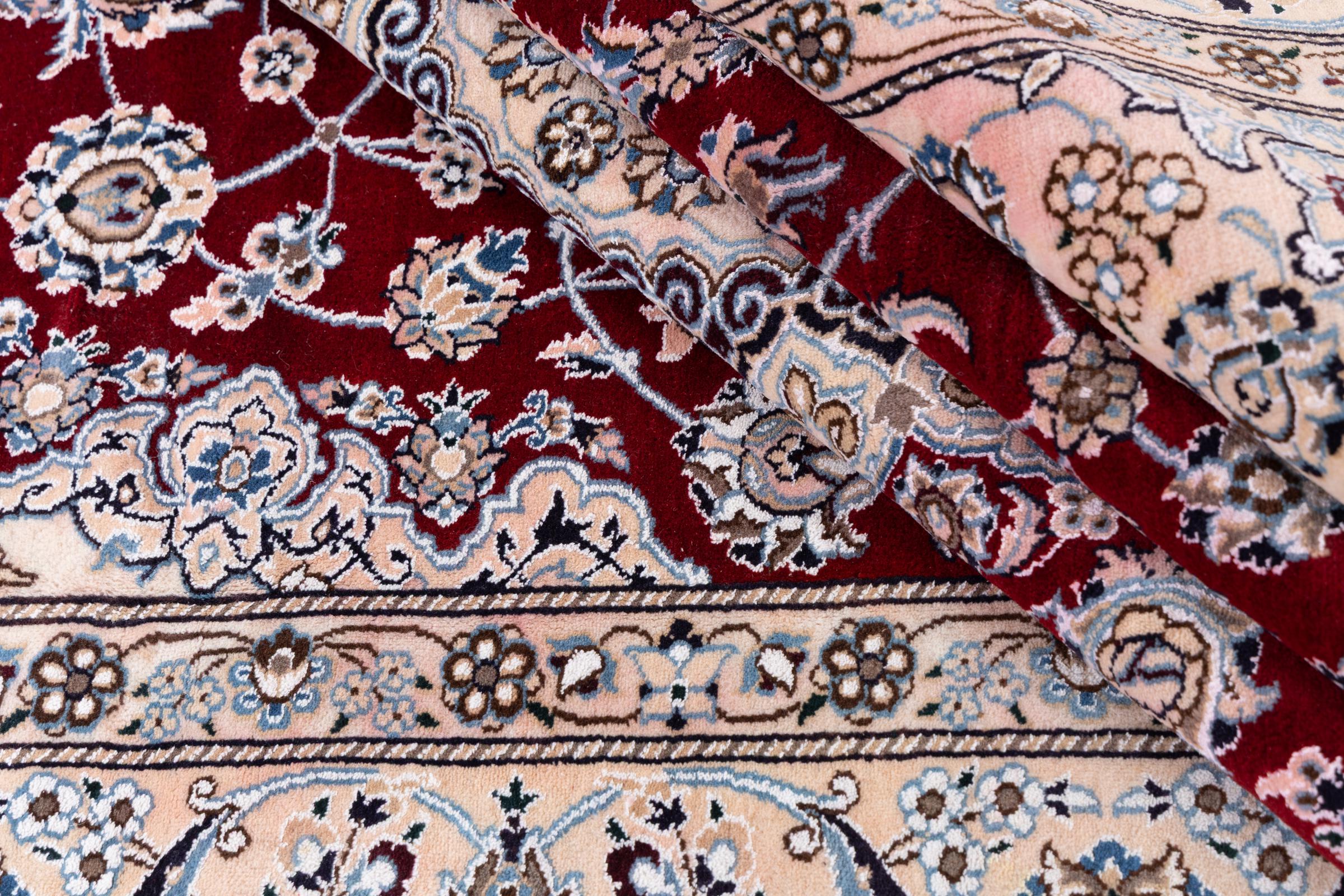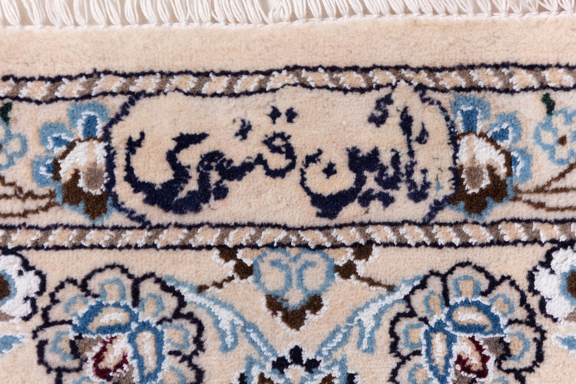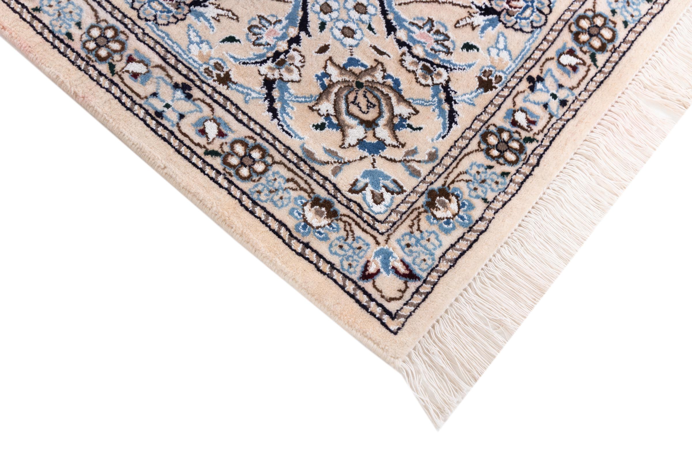 Dette Nain-tæppe er klassificeret 9La. Den fremragende kvalitet, det smukke orientalske design med sine buede mønstre glæder enhver køber. Dette persiske tæppe blev håndknyttet af højkvalitets uld og natursilke i byen Nain, som ligger i den vestlige udkant af Dasht-e-Kavir-ørkenen. 9La Nain er væsentligt finere end en 12La og viser allerede smukke detaljer.