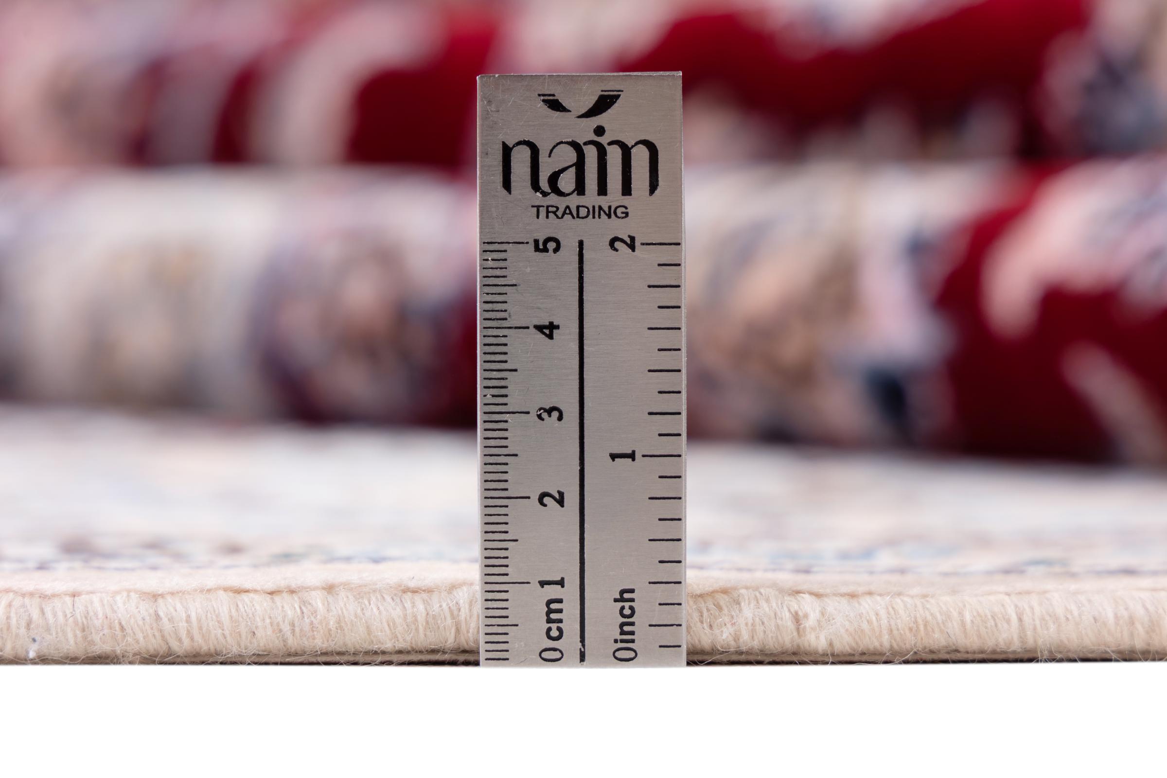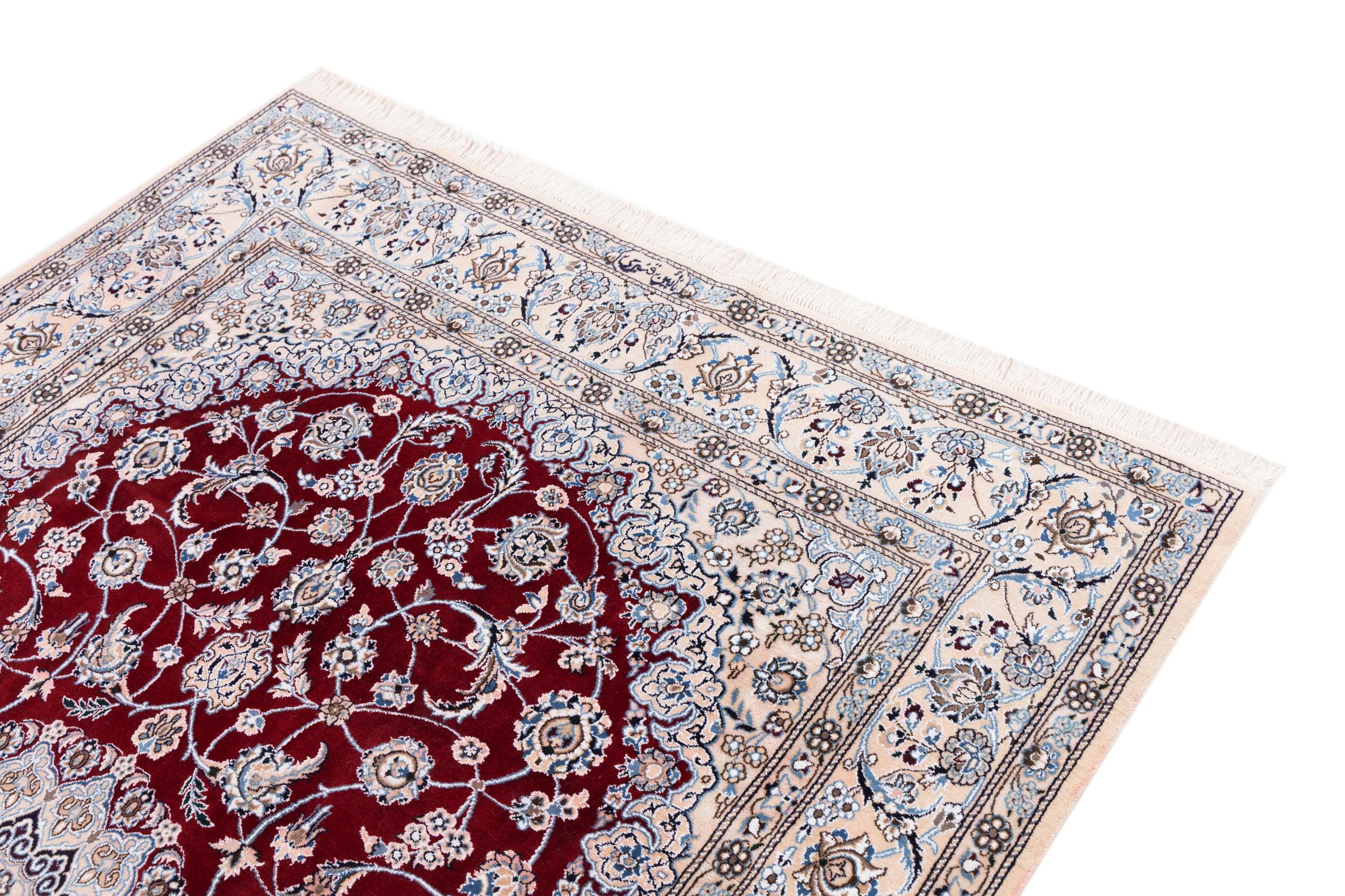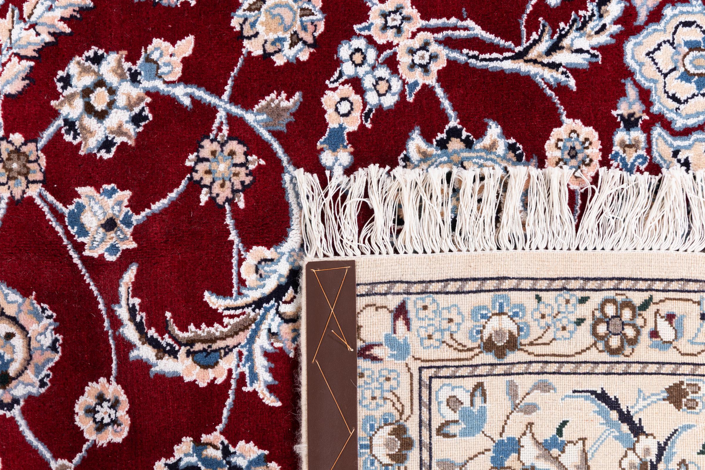 Dette Nain-tæppe er klassificeret 9La. Den fremragende kvalitet, det smukke orientalske design med sine buede mønstre glæder enhver køber. Dette persiske tæppe blev håndknyttet af højkvalitets uld og natursilke i byen Nain, som ligger i den vestlige udkant af Dasht-e-Kavir-ørkenen. 9La Nain er væsentligt finere end en 12La og viser allerede smukke detaljer.