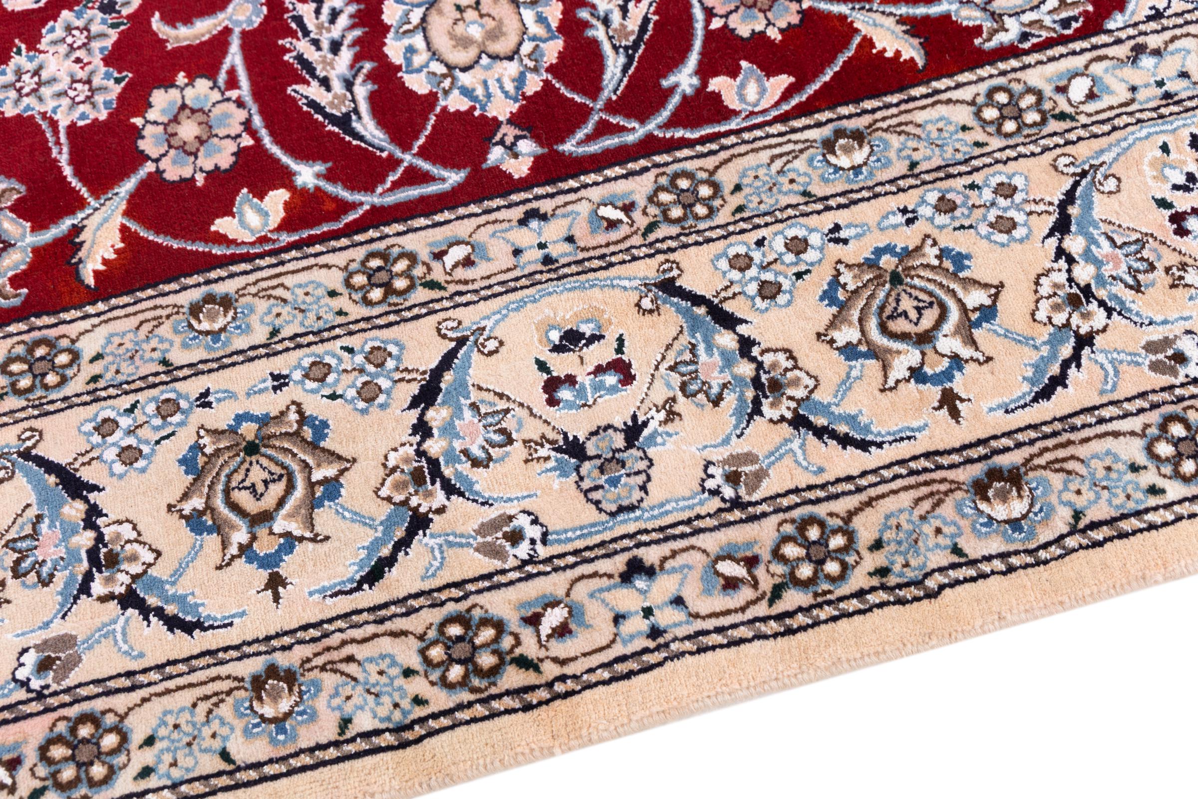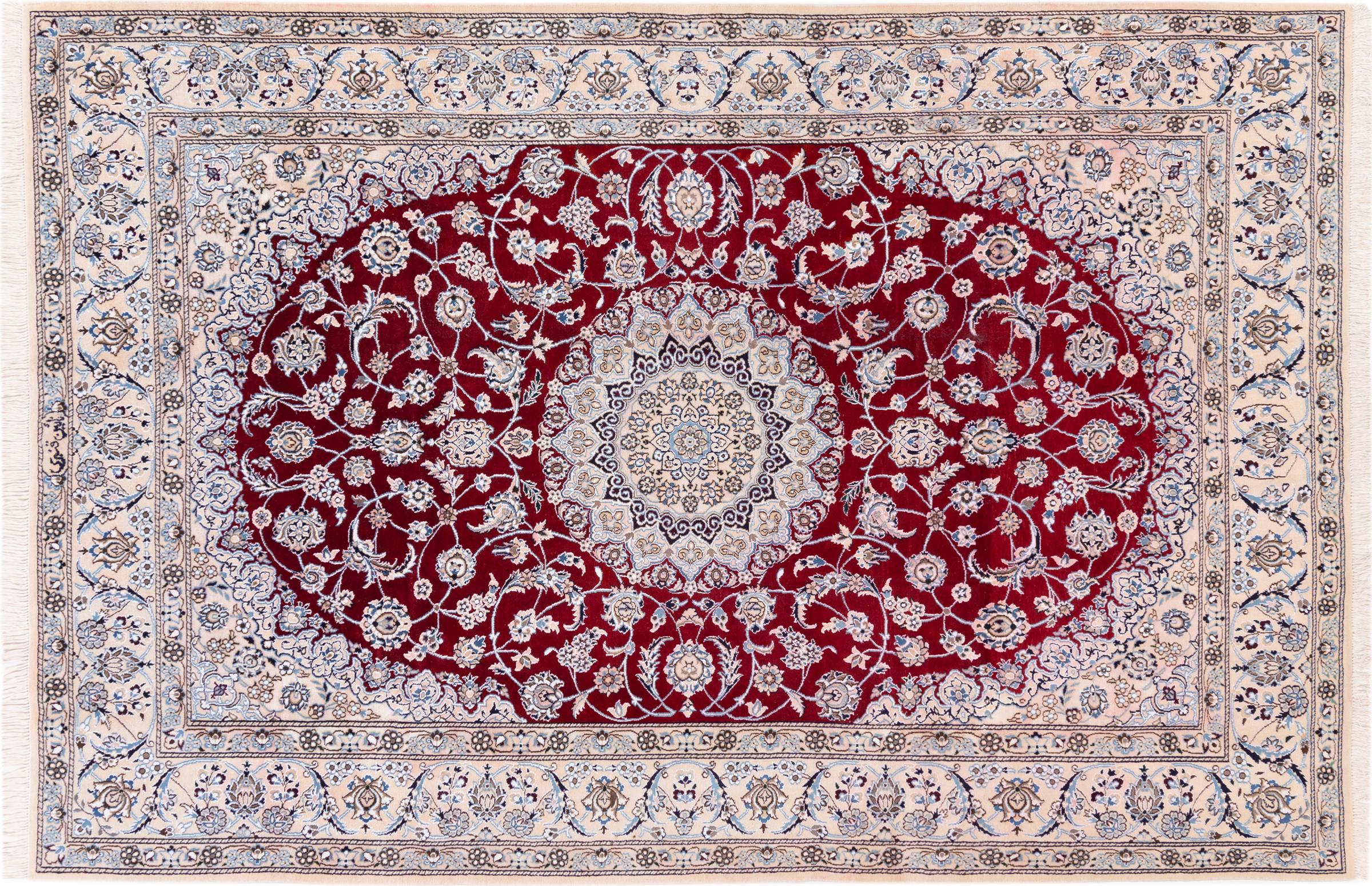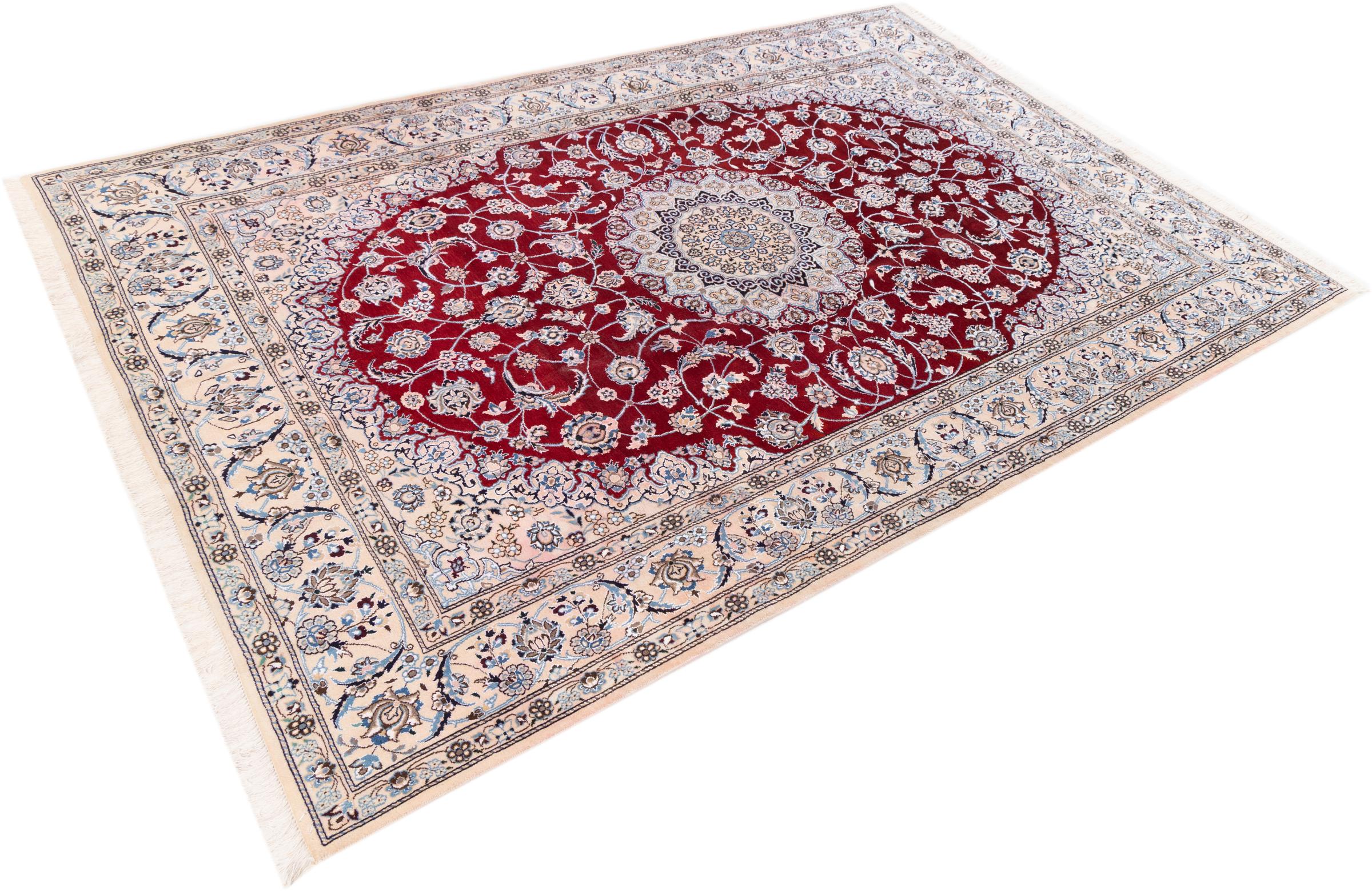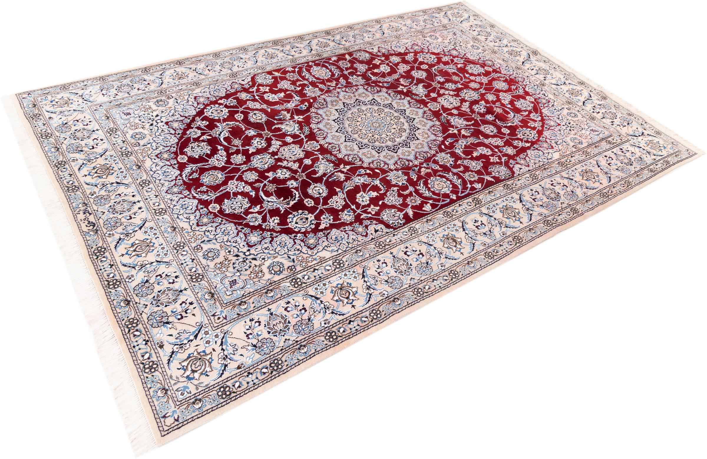 Dette Nain-tæppe er klassificeret 9La. Den fremragende kvalitet, det smukke orientalske design med sine buede mønstre glæder enhver køber. Dette persiske tæppe blev håndknyttet af højkvalitets uld og natursilke i byen Nain, som ligger i den vestlige udkant af Dasht-e-Kavir-ørkenen. 9La Nain er væsentligt finere end en 12La og viser allerede smukke detaljer.