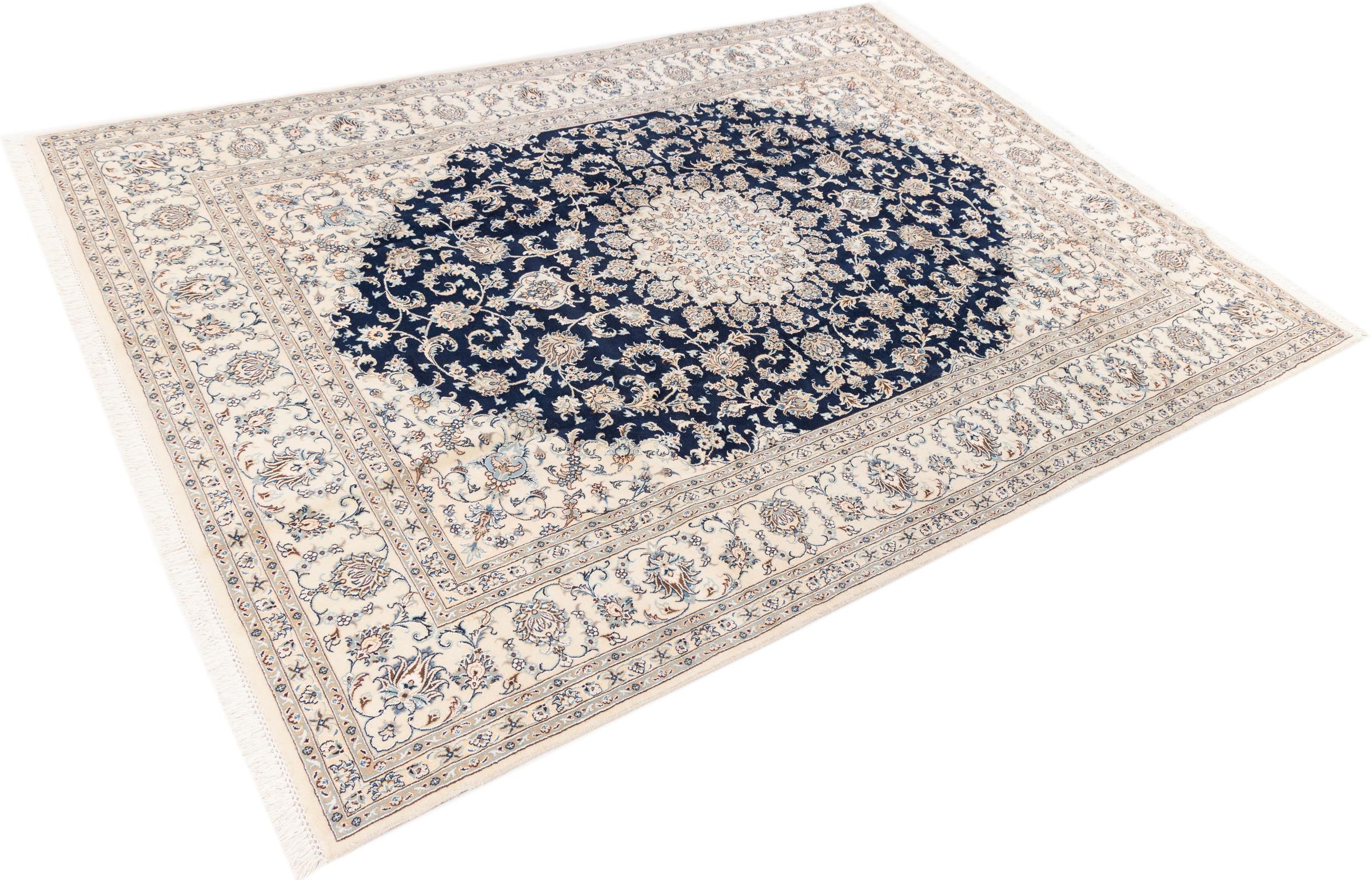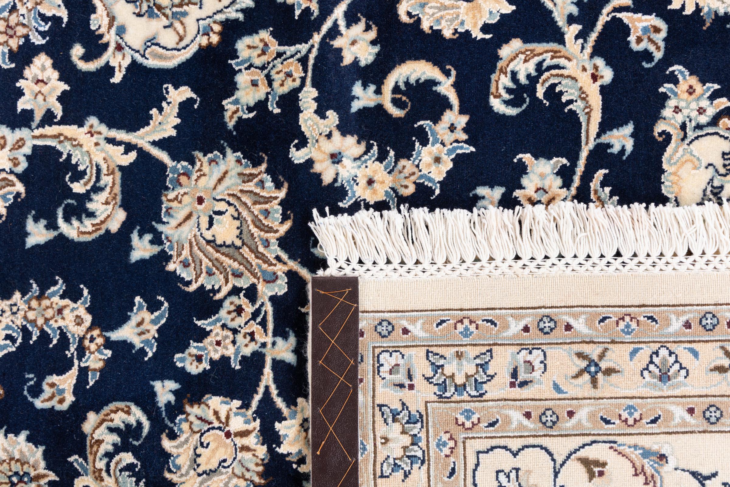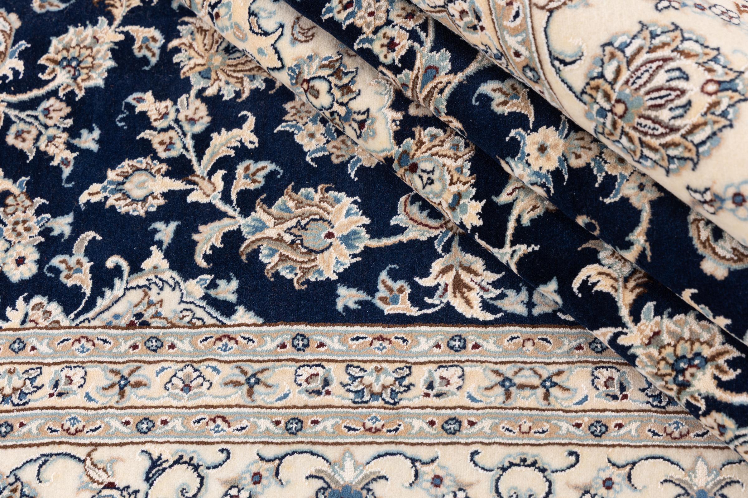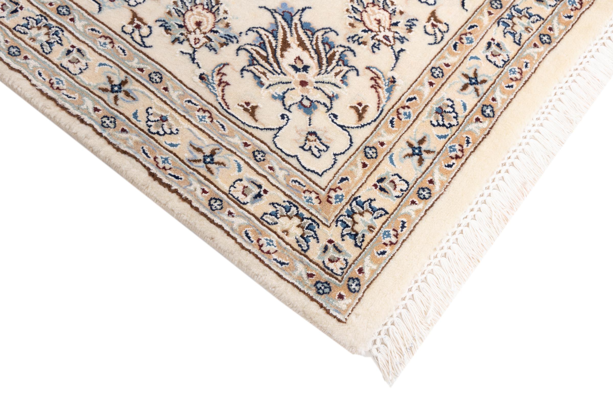 Dette Nain-tæppe er klassificeret 9La. Den fremragende kvalitet, det smukke orientalske design med sine buede mønstre glæder enhver køber. Dette persiske tæppe blev håndknyttet af højkvalitets uld og natursilke i byen Nain, som ligger i den vestlige udkant af Dasht-e-Kavir-ørkenen. 9La Nain er væsentligt finere end en 12La og viser allerede smukke detaljer.