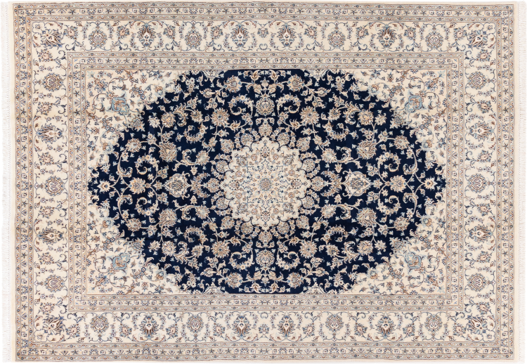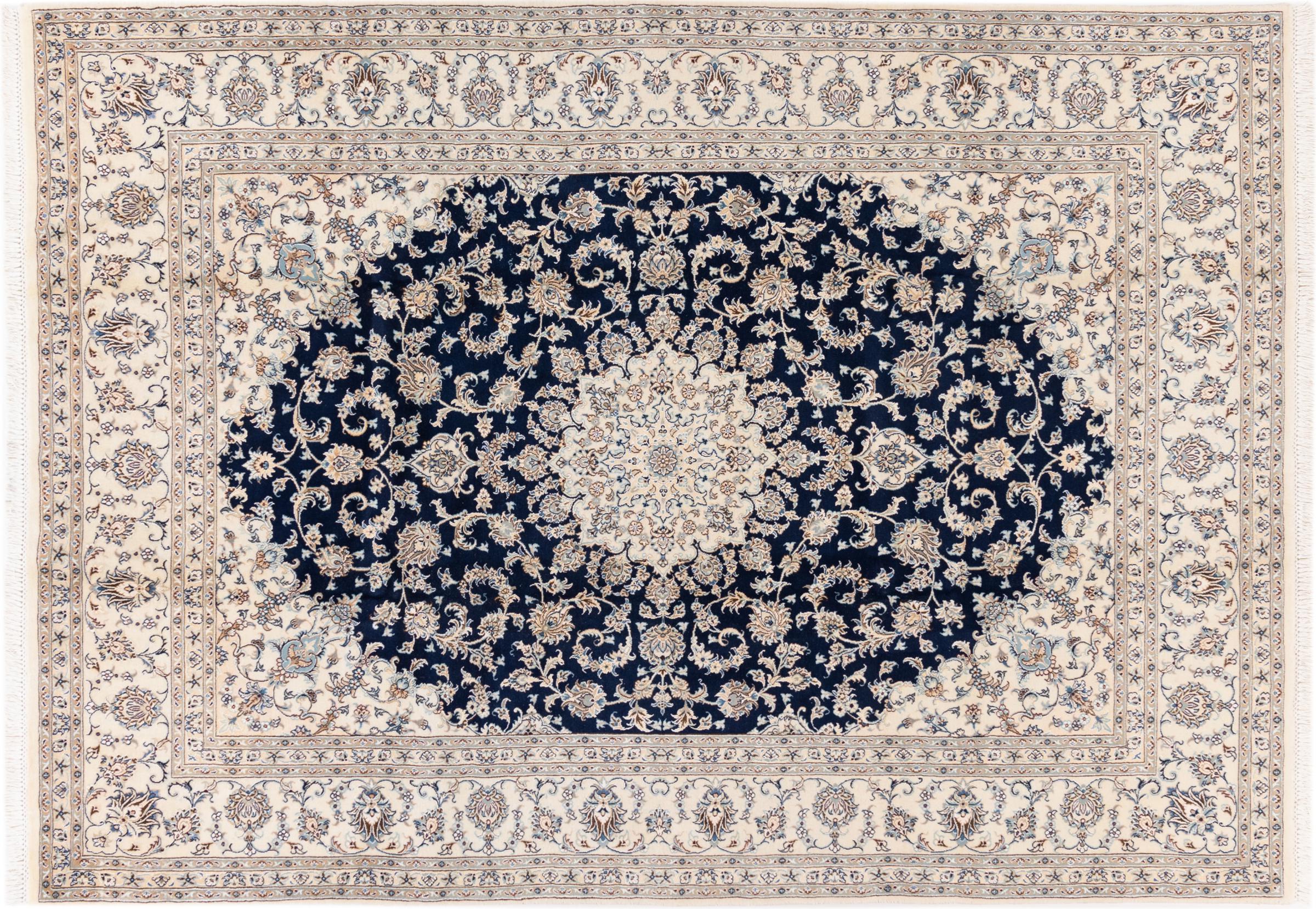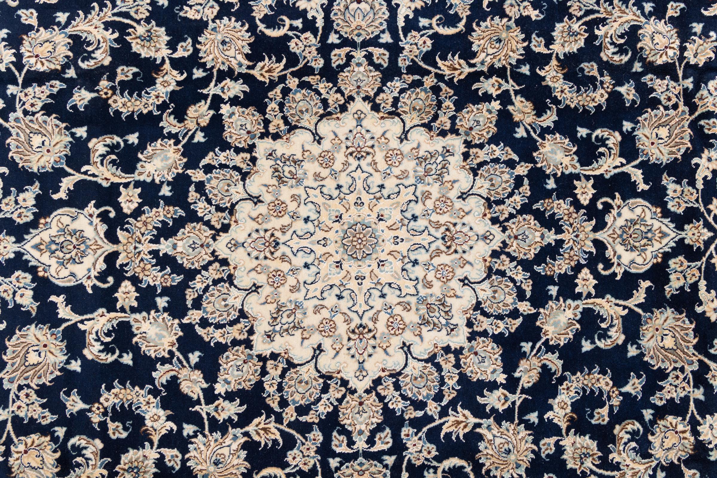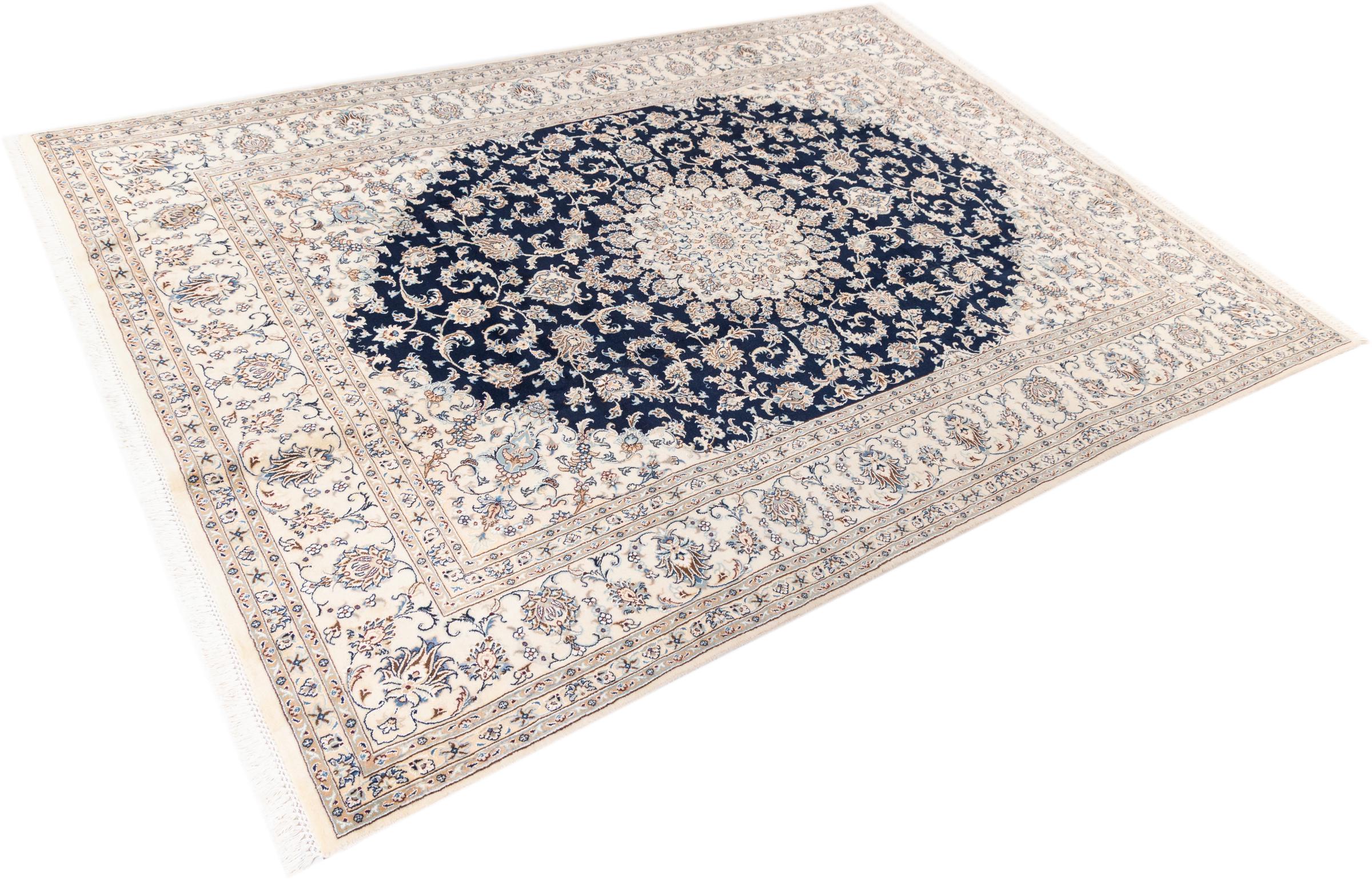 Dette Nain-tæppe er klassificeret 9La. Den fremragende kvalitet, det smukke orientalske design med sine buede mønstre glæder enhver køber. Dette persiske tæppe blev håndknyttet af højkvalitets uld og natursilke i byen Nain, som ligger i den vestlige udkant af Dasht-e-Kavir-ørkenen. 9La Nain er væsentligt finere end en 12La og viser allerede smukke detaljer.