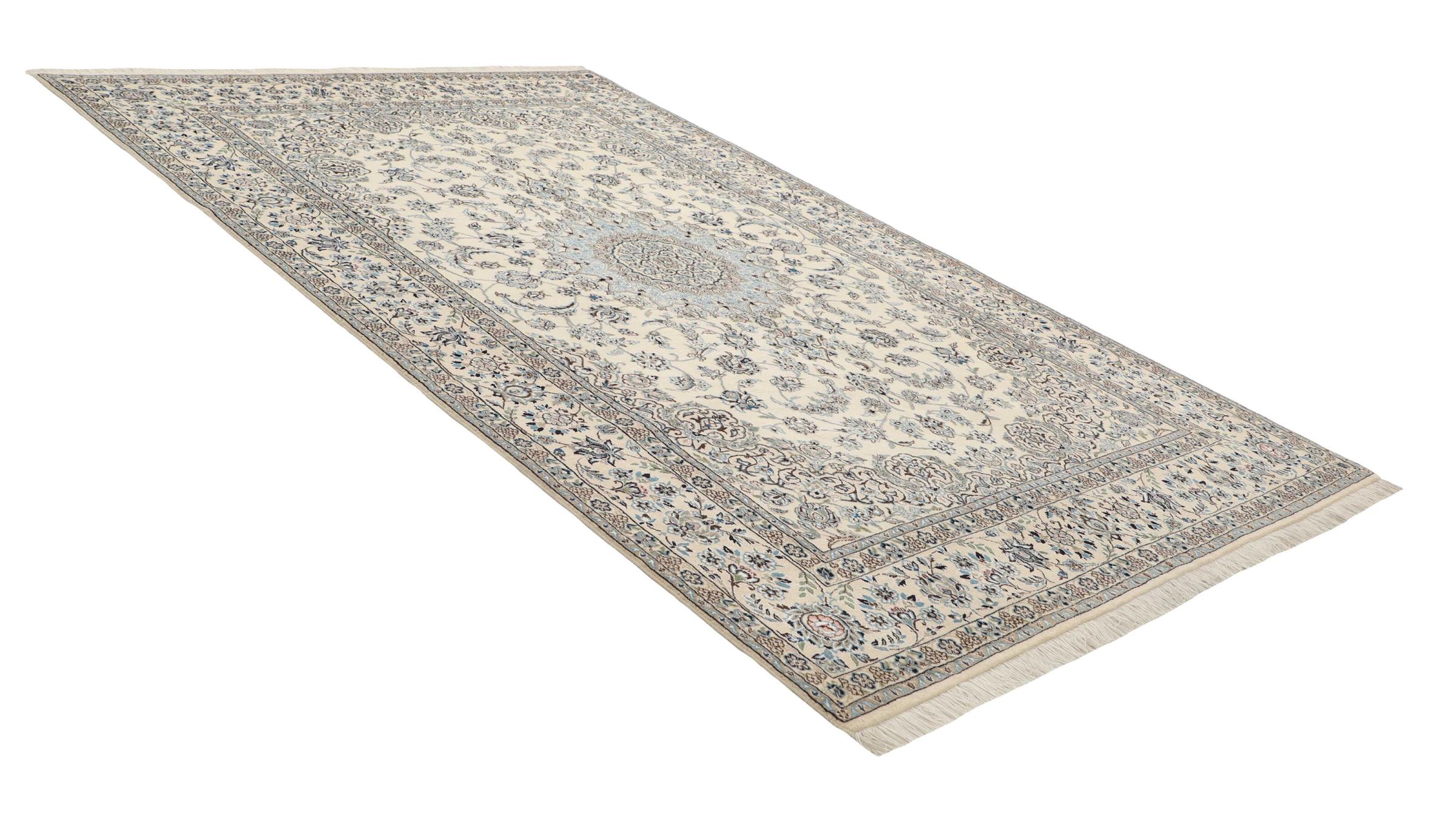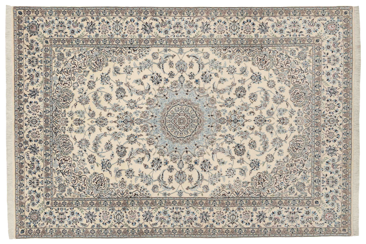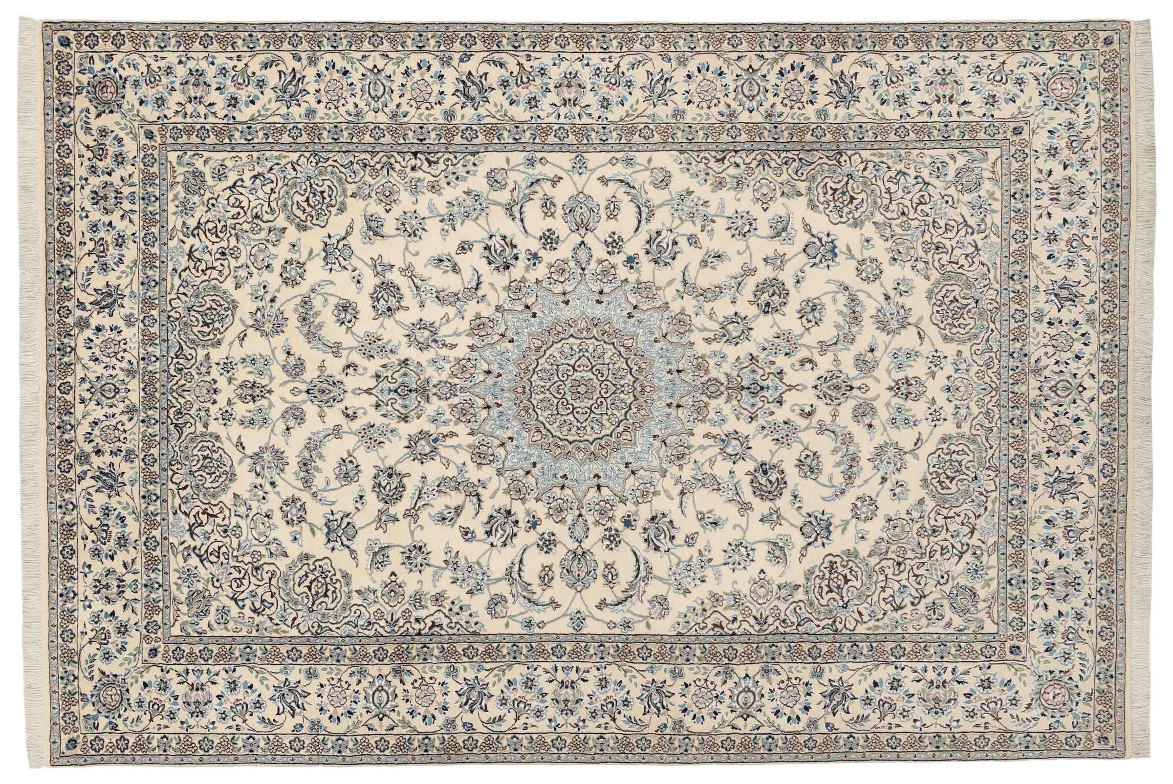 Dette Nain-tæppe er klassificeret 9La. Den fremragende kvalitet, det smukke orientalske design med sine buede mønstre glæder enhver køber. Dette persiske tæppe blev håndknyttet af højkvalitets uld og natursilke i byen Nain, som ligger i den vestlige udkant af Dasht-e-Kavir-ørkenen. 9La Nain er væsentligt finere end en 12La og viser allerede smukke detaljer.