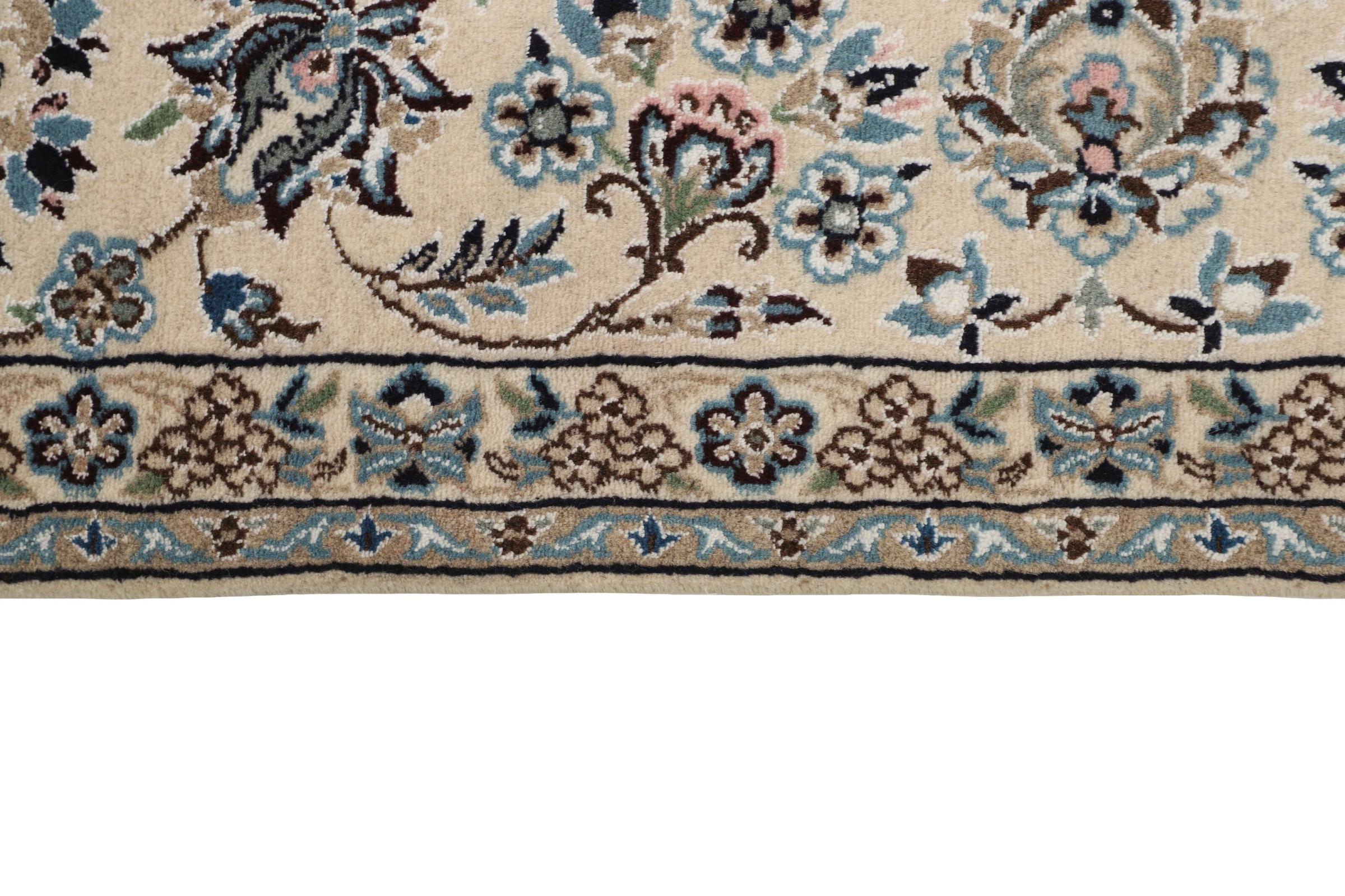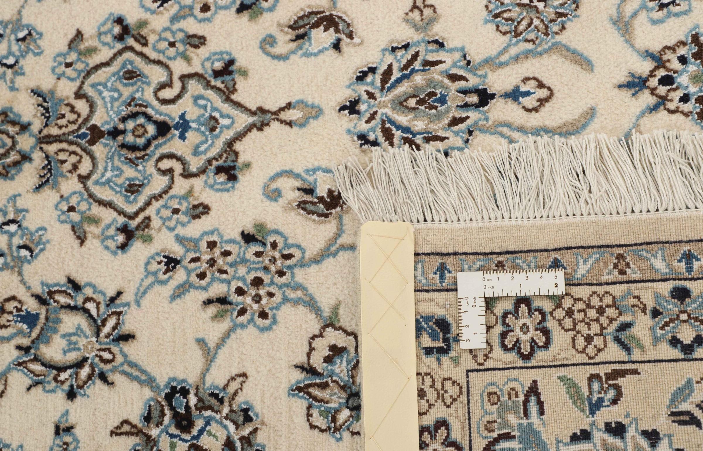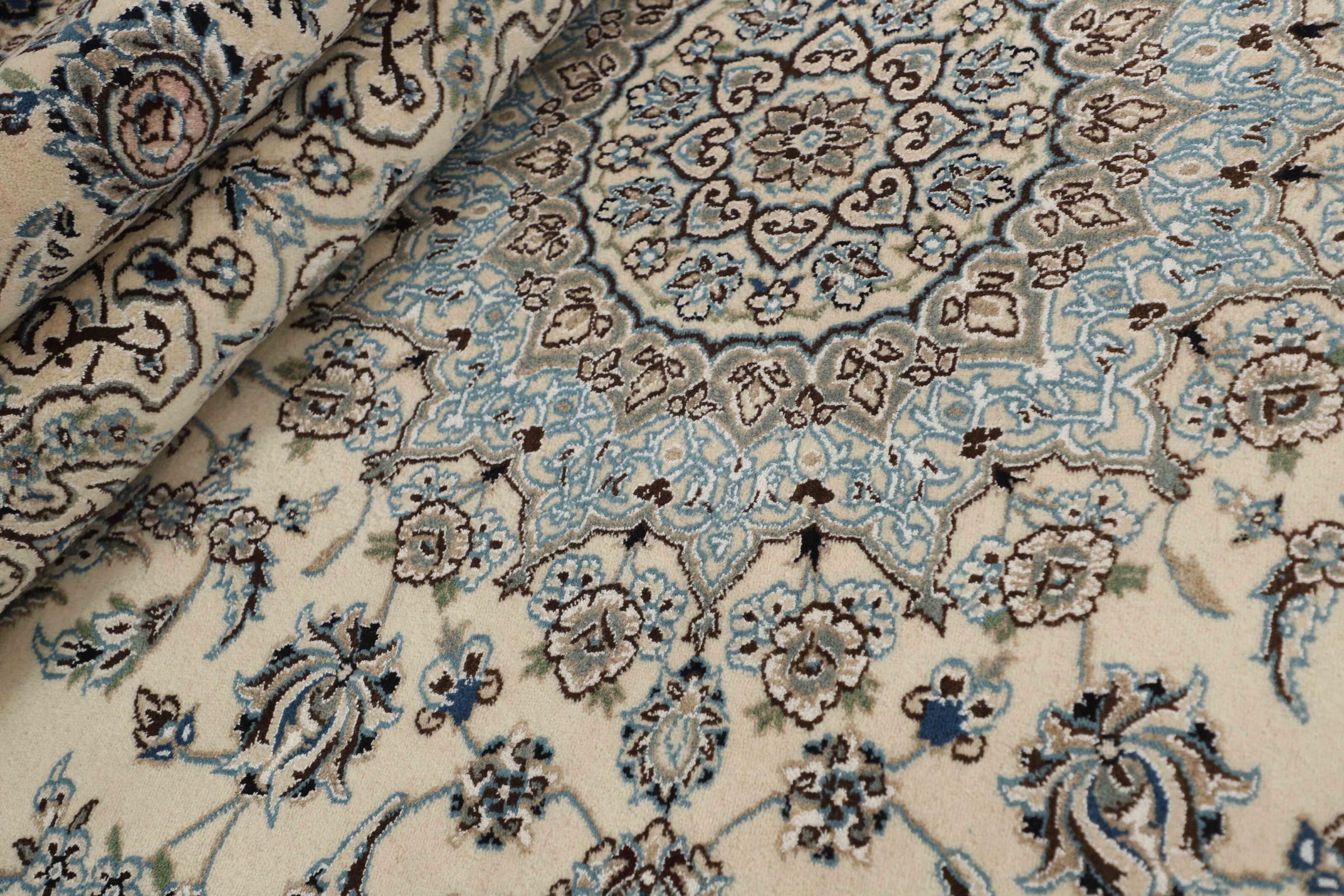 Dette Nain-tæppe er klassificeret 9La. Den fremragende kvalitet, det smukke orientalske design med sine buede mønstre glæder enhver køber. Dette persiske tæppe blev håndknyttet af højkvalitets uld og natursilke i byen Nain, som ligger i den vestlige udkant af Dasht-e-Kavir-ørkenen. 9La Nain er væsentligt finere end en 12La og viser allerede smukke detaljer.