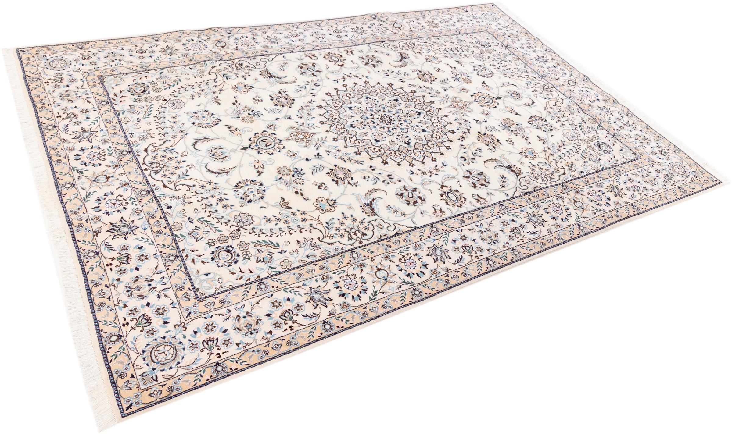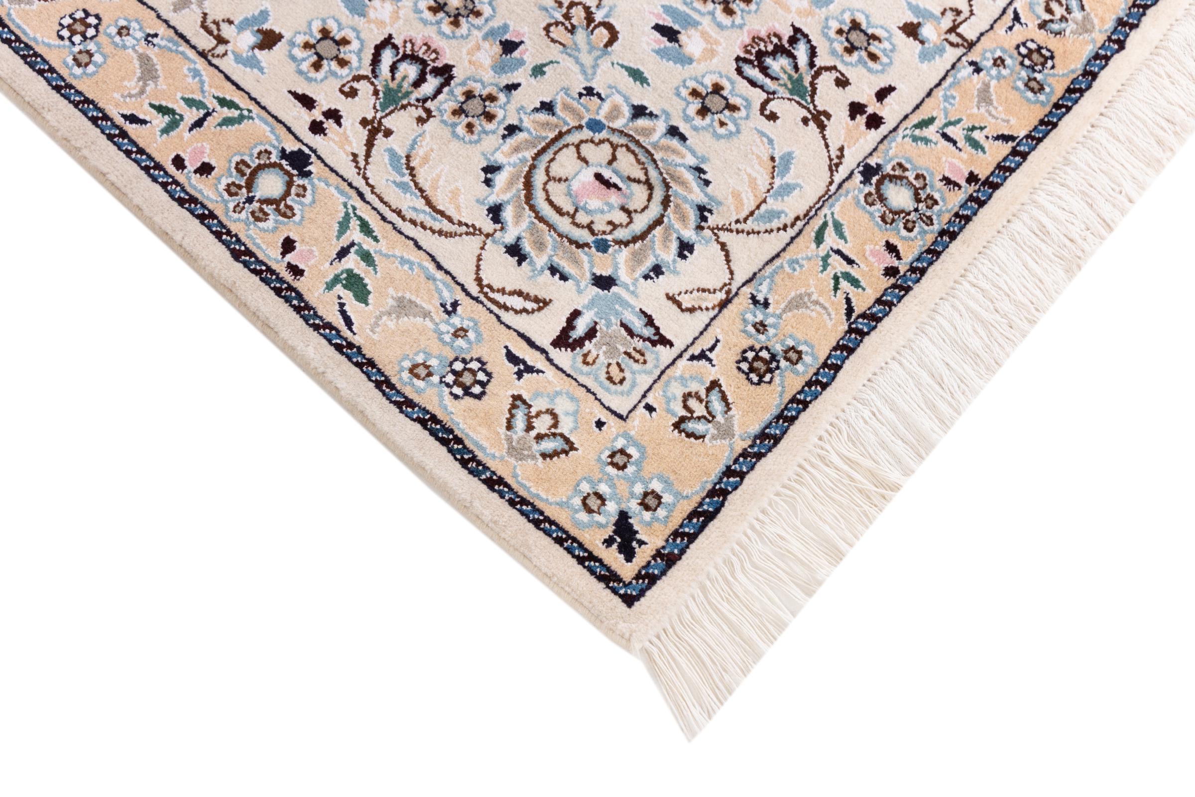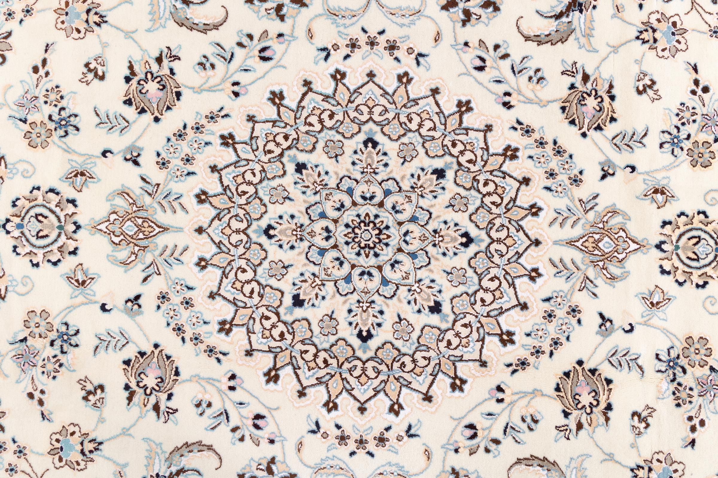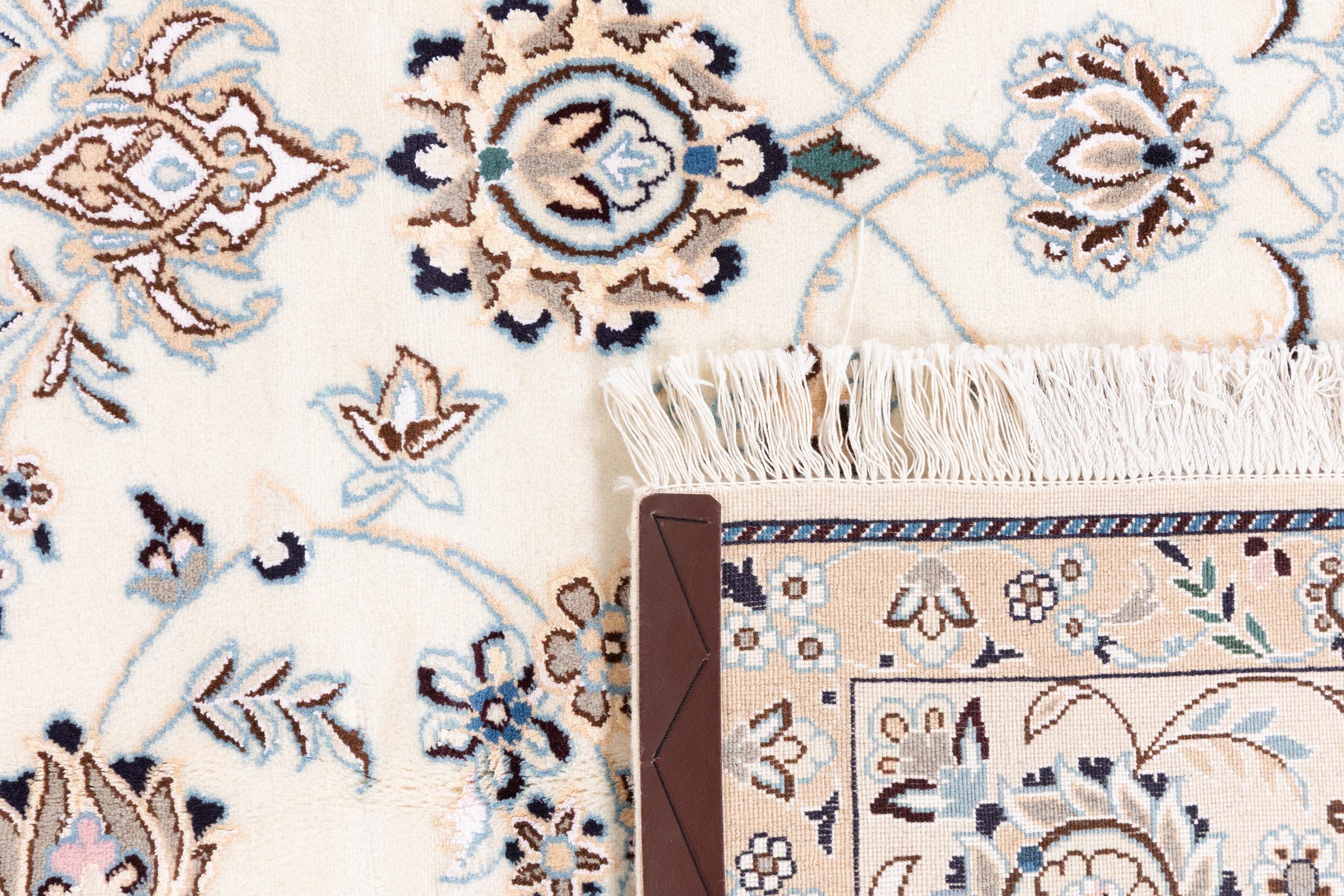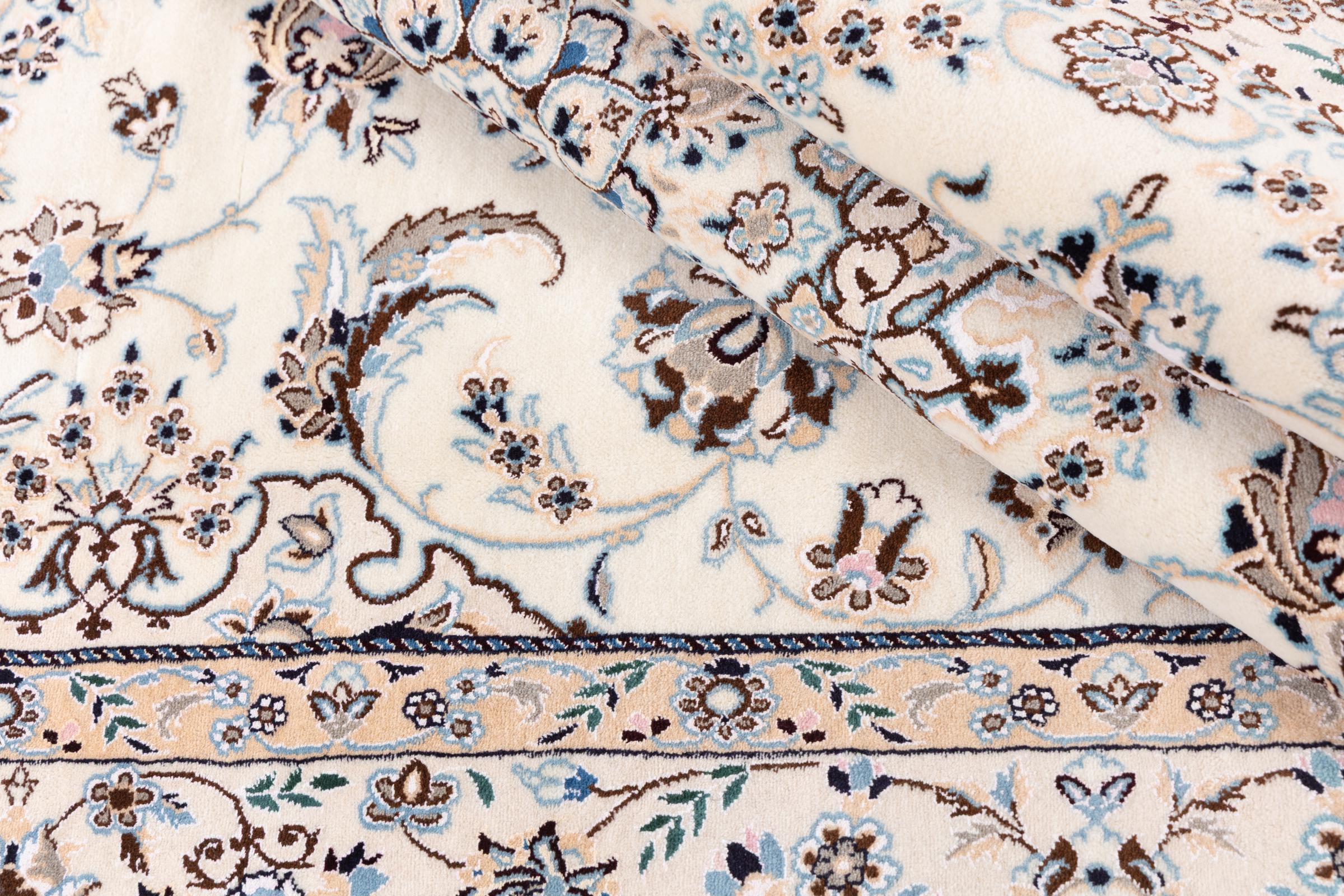 Dette Nain-tæppe er klassificeret 9La. Den fremragende kvalitet, det smukke orientalske design med sine buede mønstre glæder enhver køber. Dette persiske tæppe blev håndknyttet af højkvalitets uld og natursilke i byen Nain, som ligger i den vestlige udkant af Dasht-e-Kavir-ørkenen. 9La Nain er væsentligt finere end en 12La og viser allerede smukke detaljer.