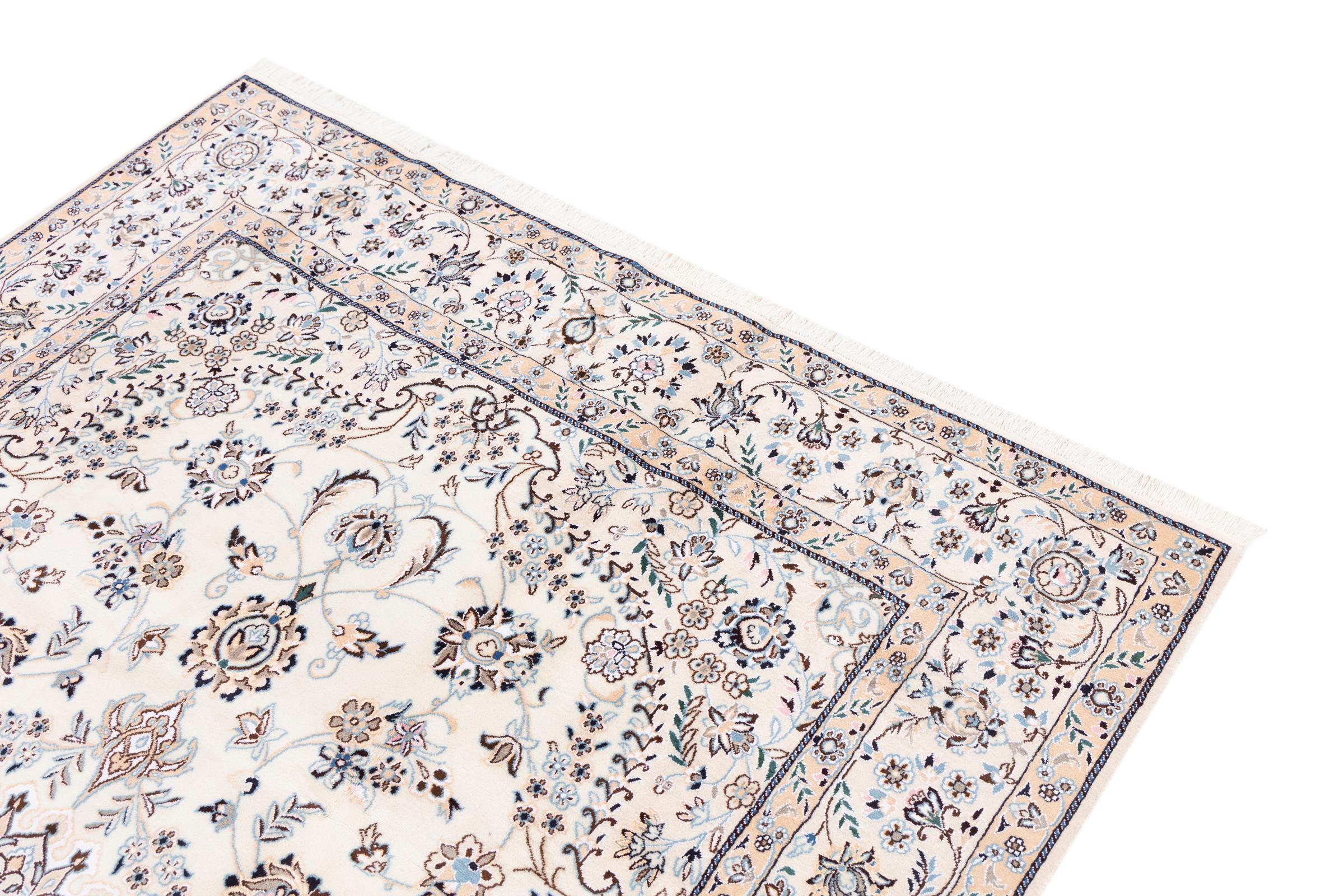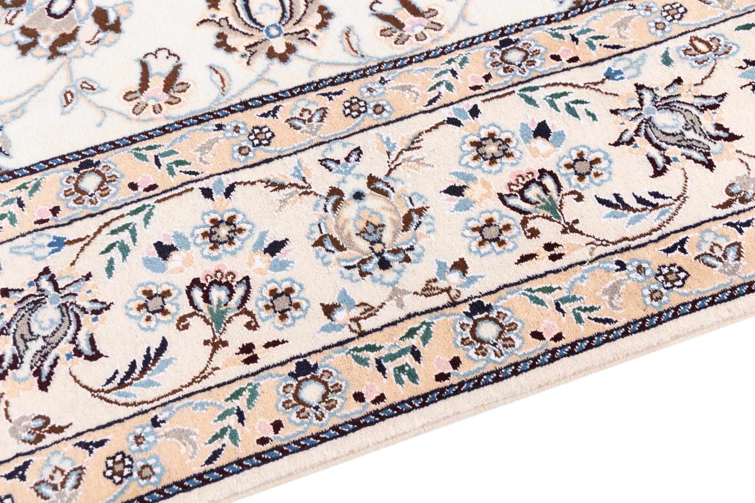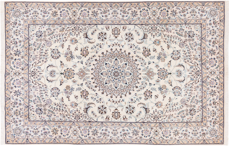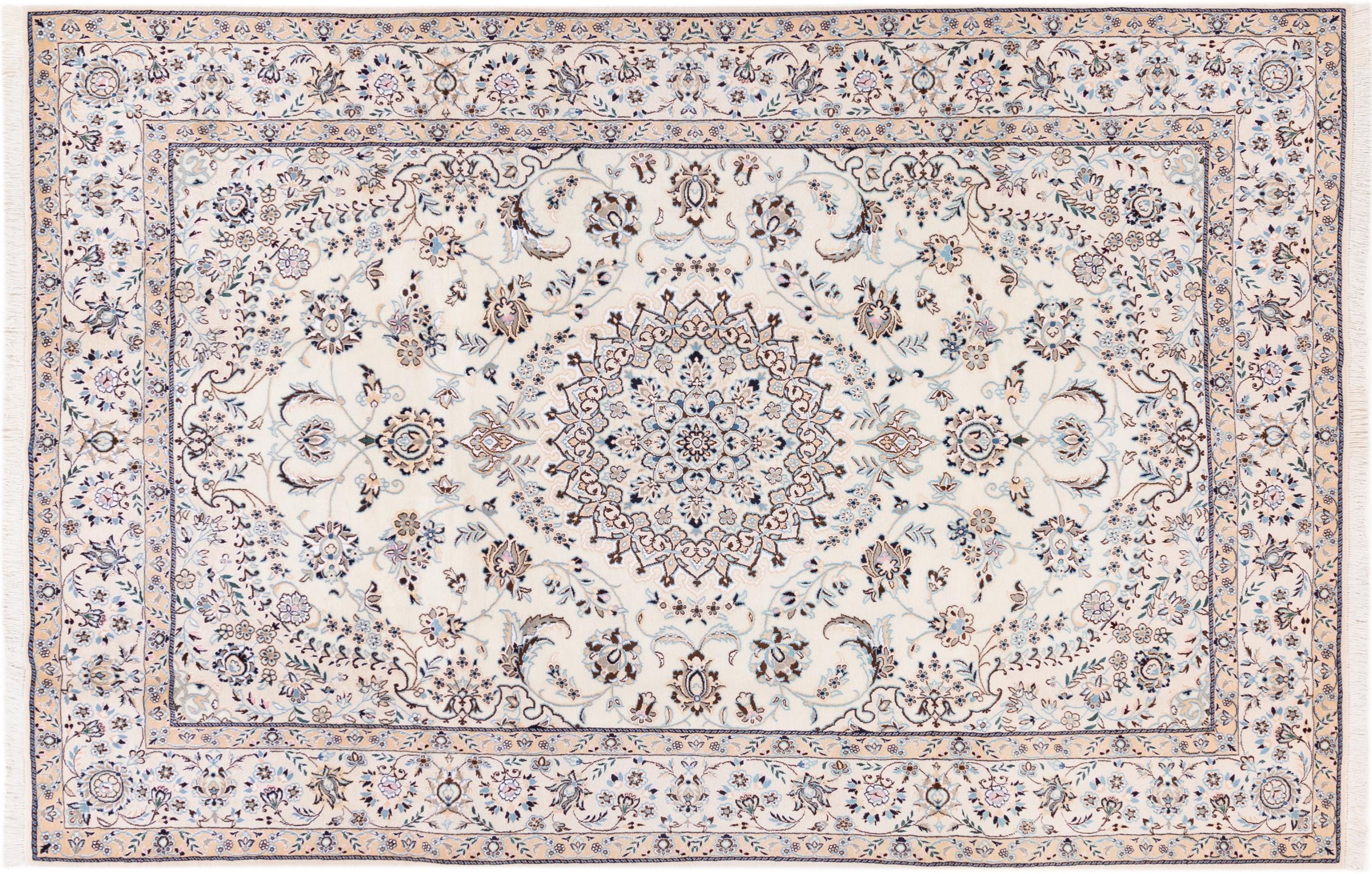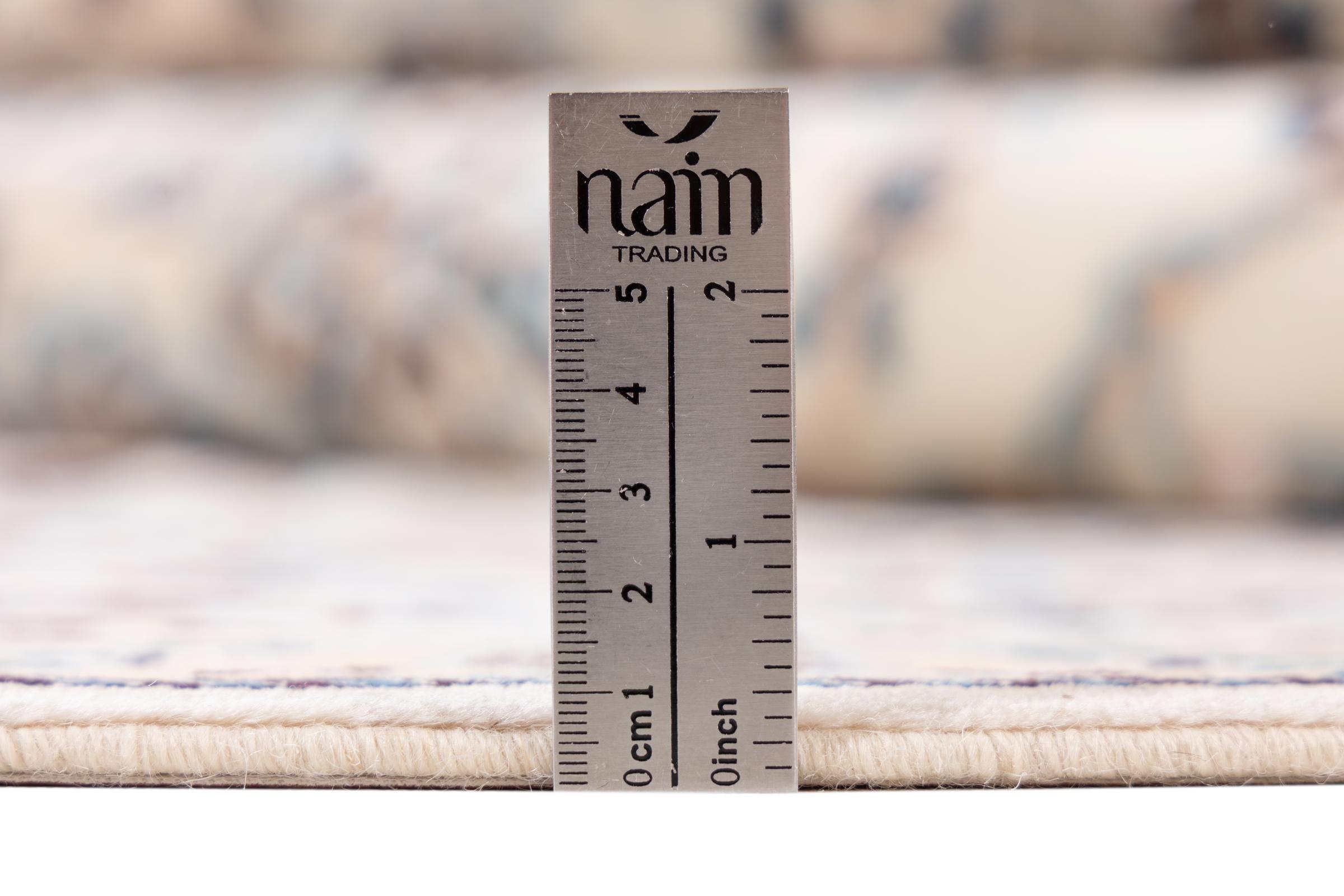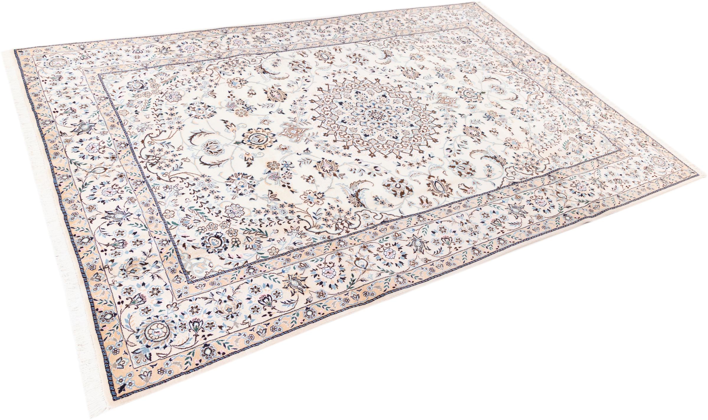Dette Nain-tæppe er klassificeret 9La. Den fremragende kvalitet, det smukke orientalske design med sine buede mønstre glæder enhver køber. Dette persiske tæppe blev håndknyttet af højkvalitets uld og natursilke i byen Nain, som ligger i den vestlige udkant af Dasht-e-Kavir-ørkenen. 9La Nain er væsentligt finere end en 12La og viser allerede smukke detaljer.