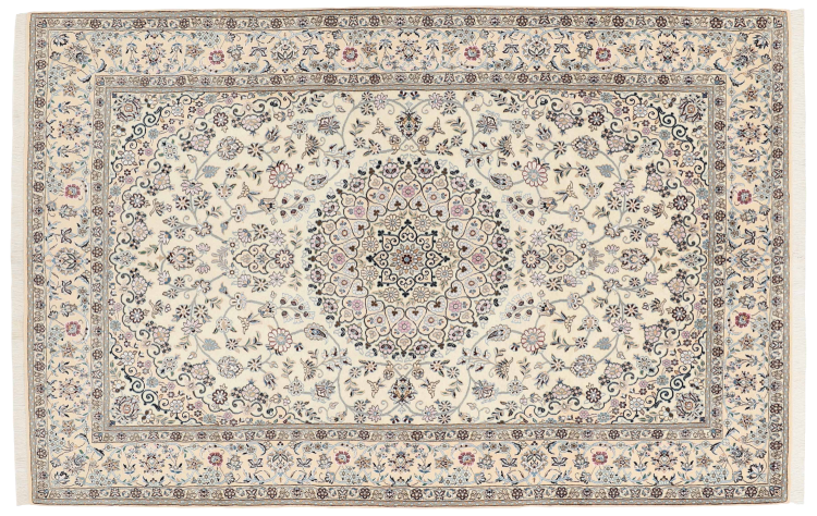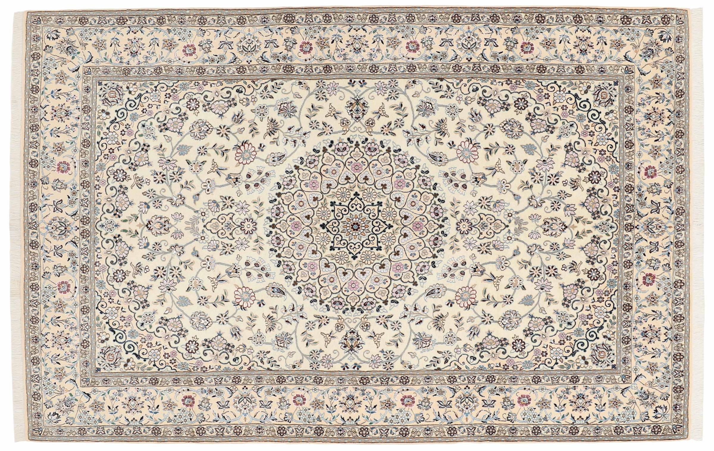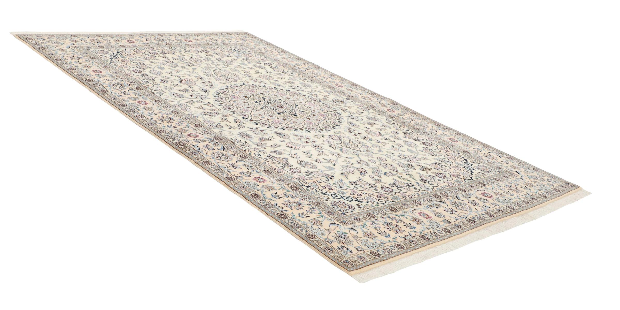 Dette Nain-tæppe er klassificeret 9La. Den fremragende kvalitet, det smukke orientalske design med sine buede mønstre glæder enhver køber. Dette persiske tæppe blev håndknyttet af højkvalitets uld og natursilke i byen Nain, som ligger i den vestlige udkant af Dasht-e-Kavir-ørkenen. 9La Nain er væsentligt finere end en 12La og viser allerede smukke detaljer.