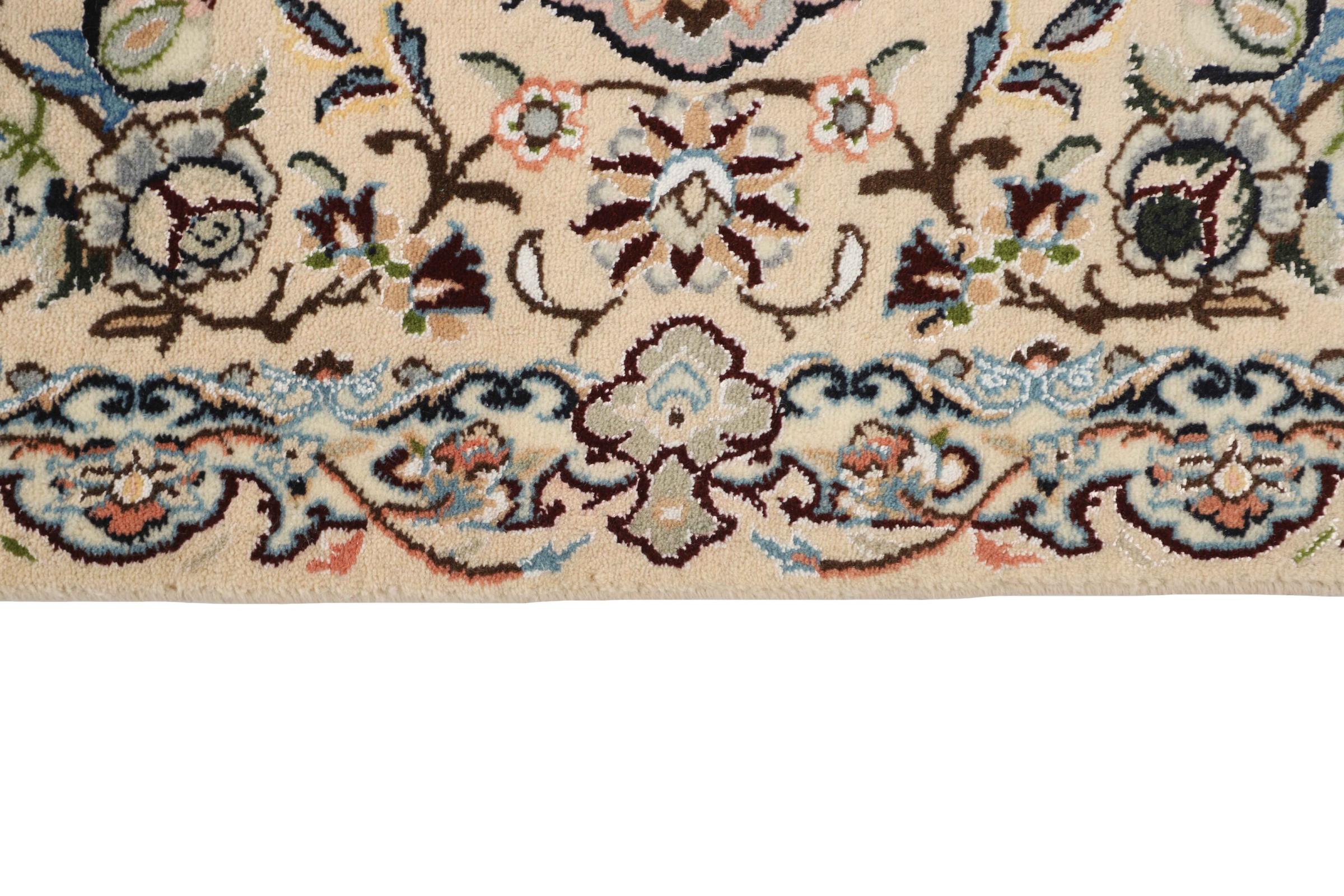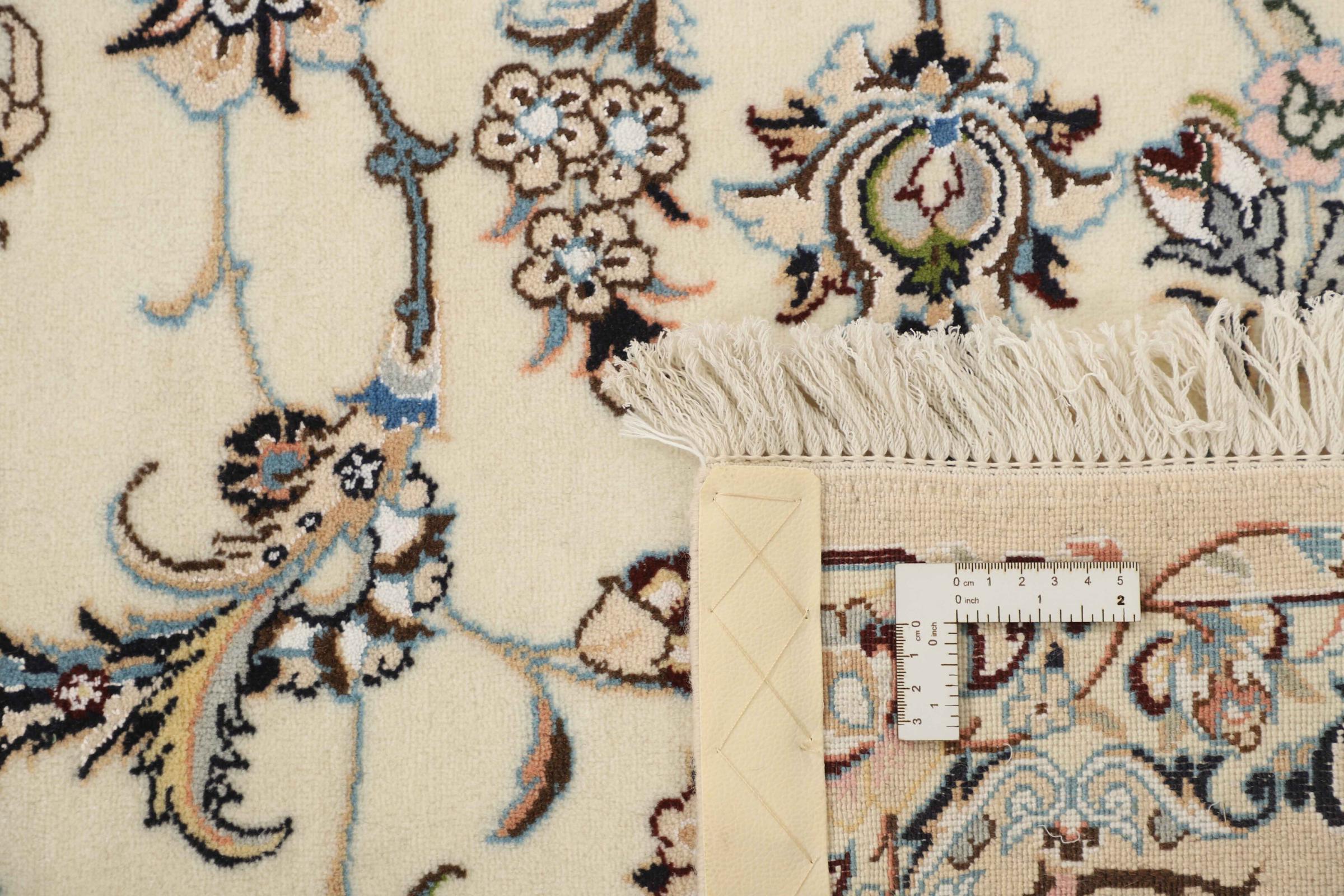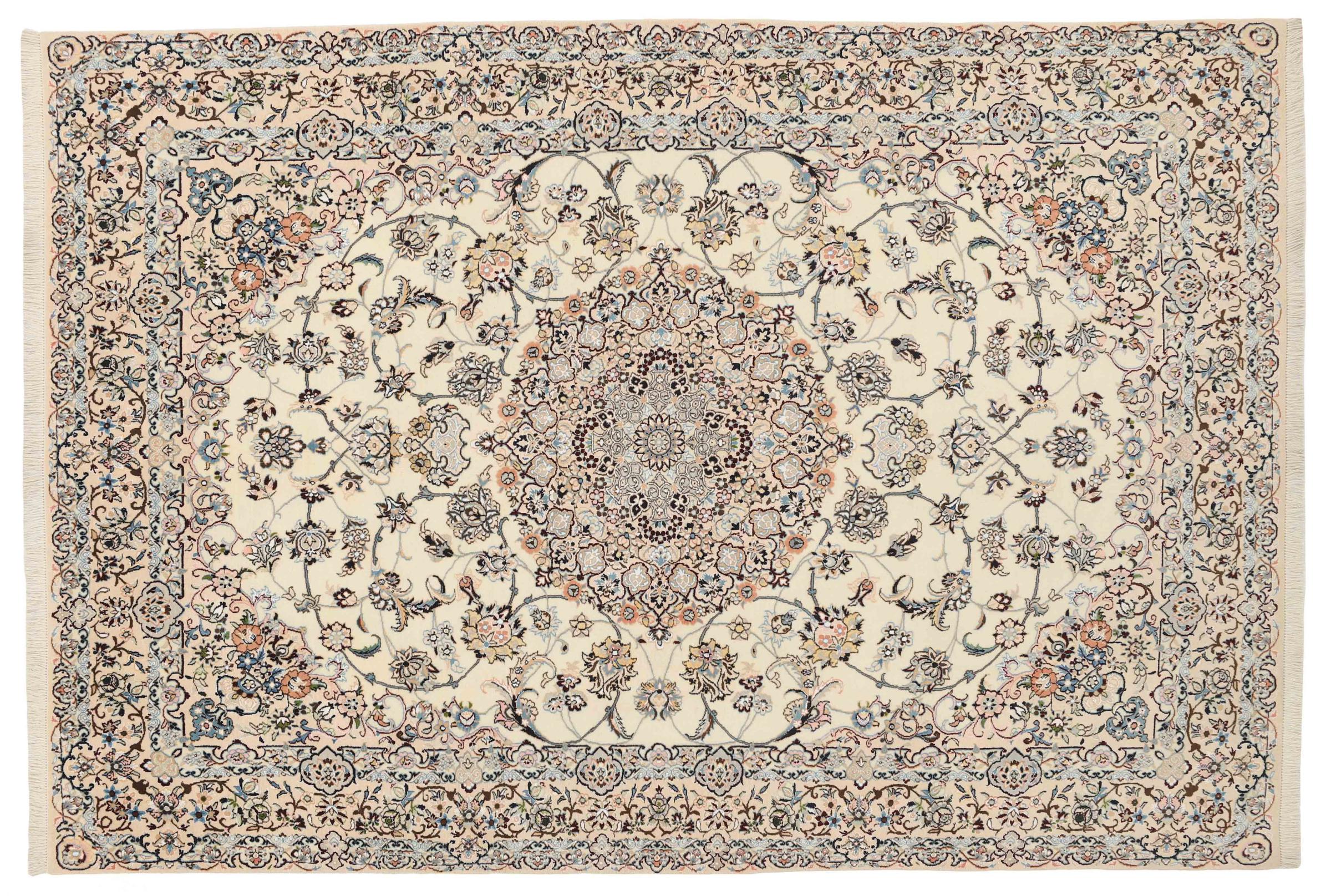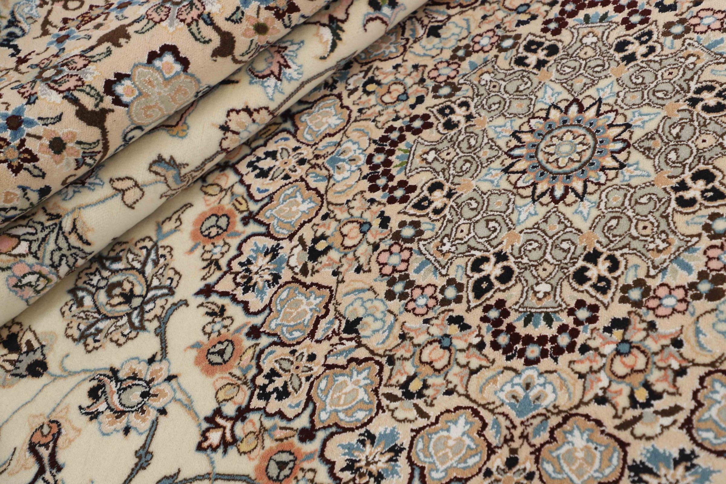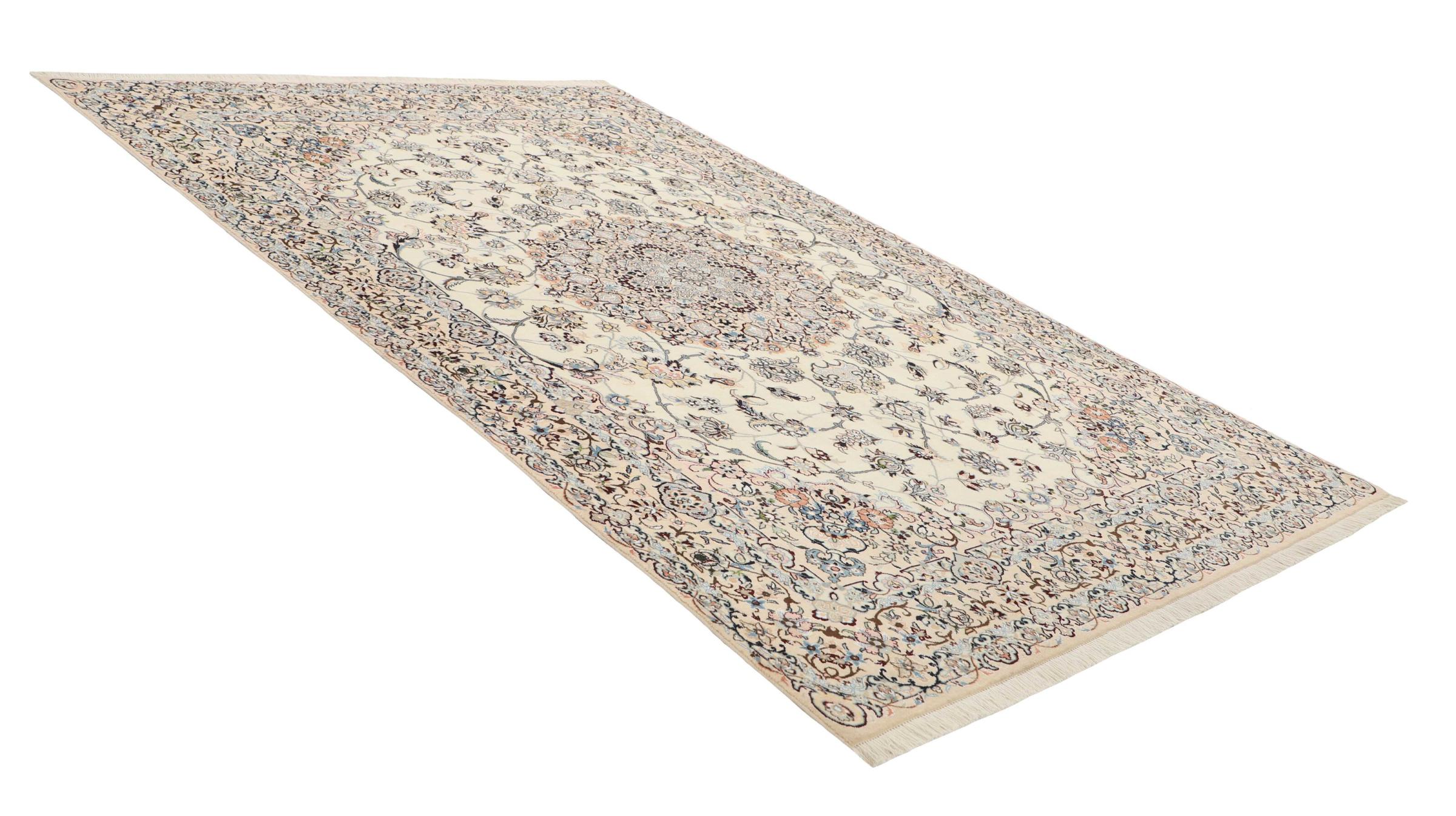 Dette Nain-tæppe er klassificeret 9La. Den fremragende kvalitet, det smukke orientalske design med sine buede mønstre glæder enhver køber. Dette persiske tæppe blev håndknyttet af højkvalitets uld og natursilke i byen Nain, som ligger i den vestlige udkant af Dasht-e-Kavir-ørkenen. 9La Nain er væsentligt finere end en 12La og viser allerede smukke detaljer.