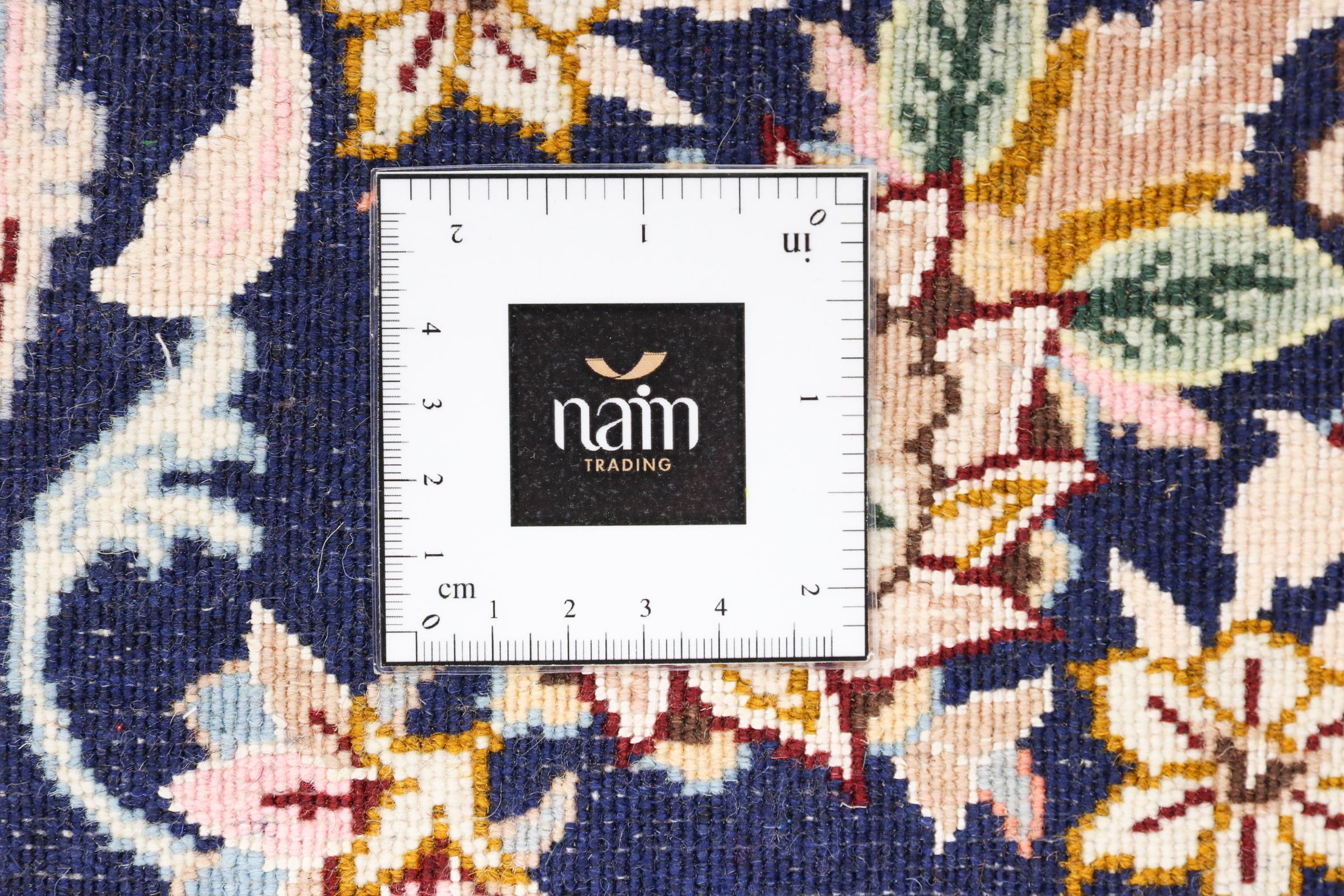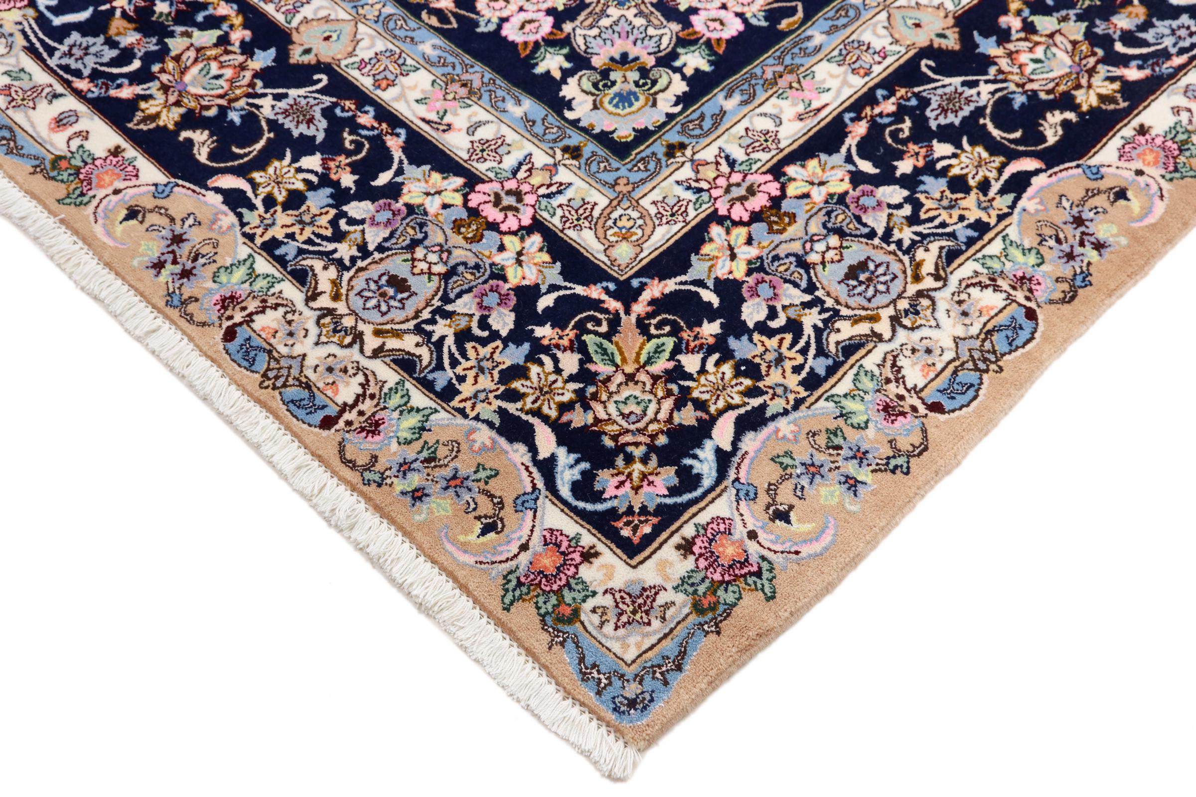 Dette Nain-tæppe er klassificeret 9La. Den fremragende kvalitet, det smukke orientalske design med sine buede mønstre glæder enhver køber. Dette persiske tæppe blev håndknyttet af højkvalitets uld og natursilke i byen Nain, som ligger i den vestlige udkant af Dasht-e-Kavir-ørkenen. 9La Nain er væsentligt finere end en 12La og viser allerede smukke detaljer.