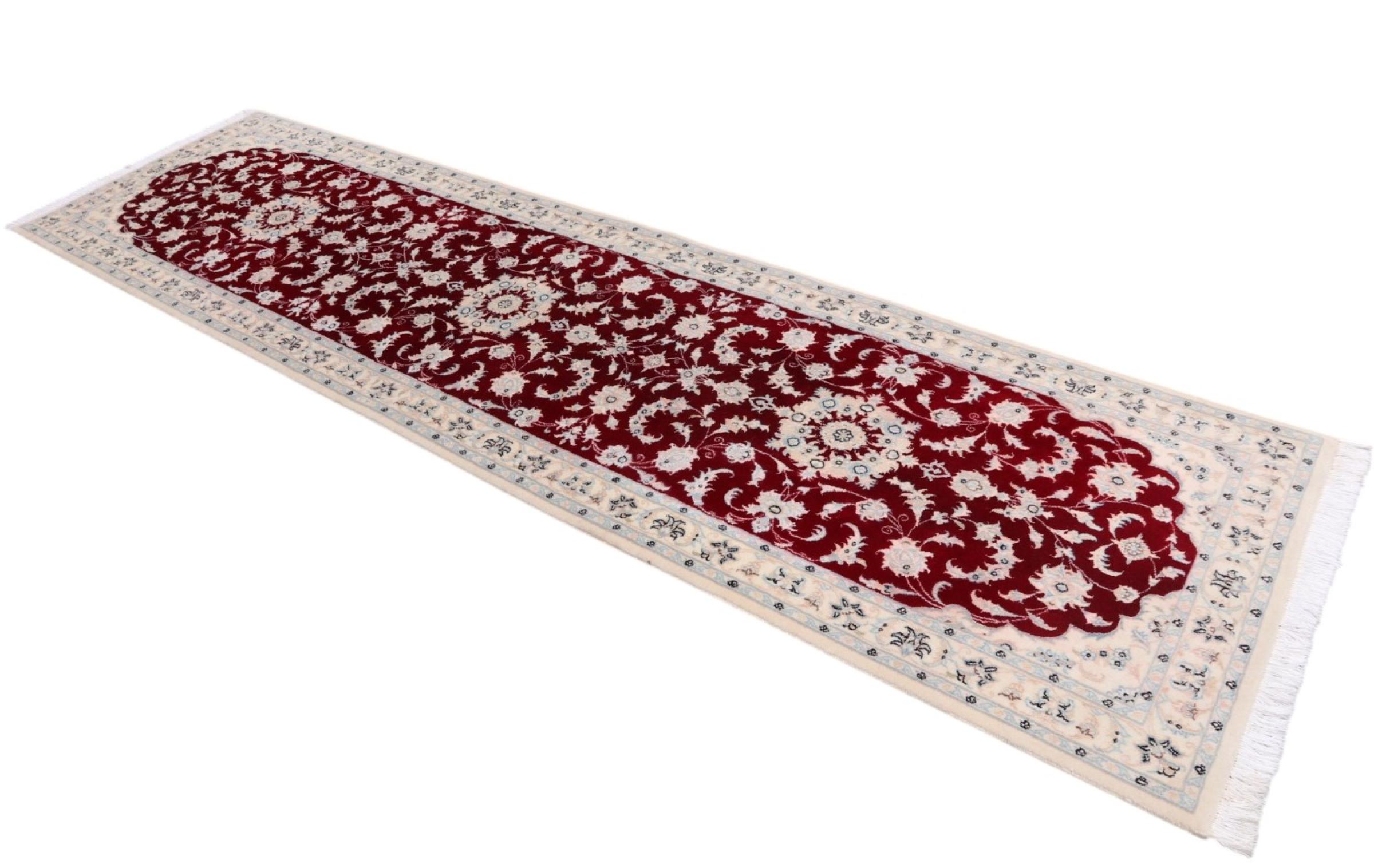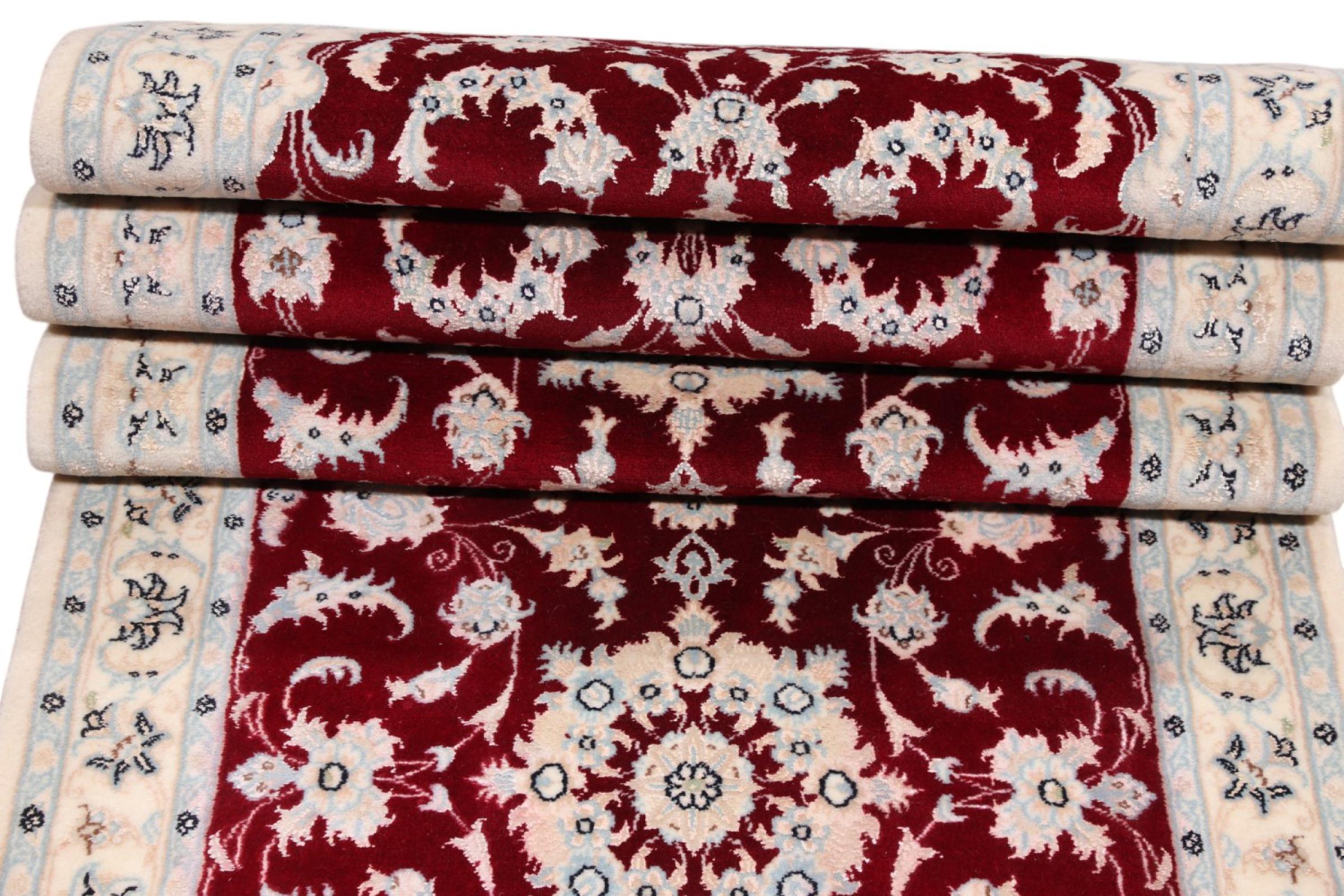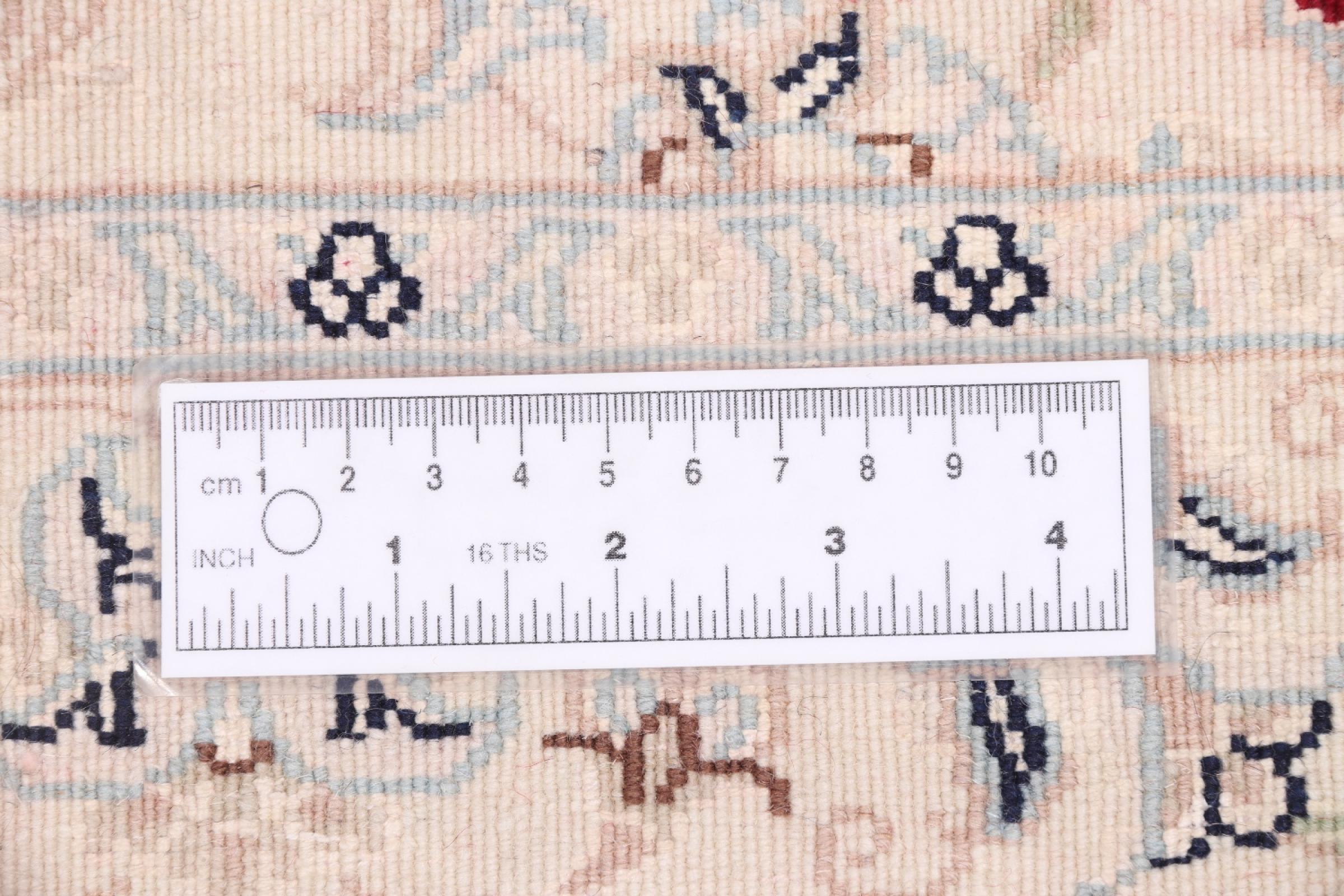 Dette Nain-tæppe er klassificeret 9La. Den fremragende kvalitet, det smukke orientalske design med sine buede mønstre glæder enhver køber. Dette persiske tæppe blev håndknyttet af højkvalitets uld og natursilke i byen Nain, som ligger i den vestlige udkant af Dasht-e-Kavir-ørkenen. 9La Nain er væsentligt finere end en 12La og viser allerede smukke detaljer.