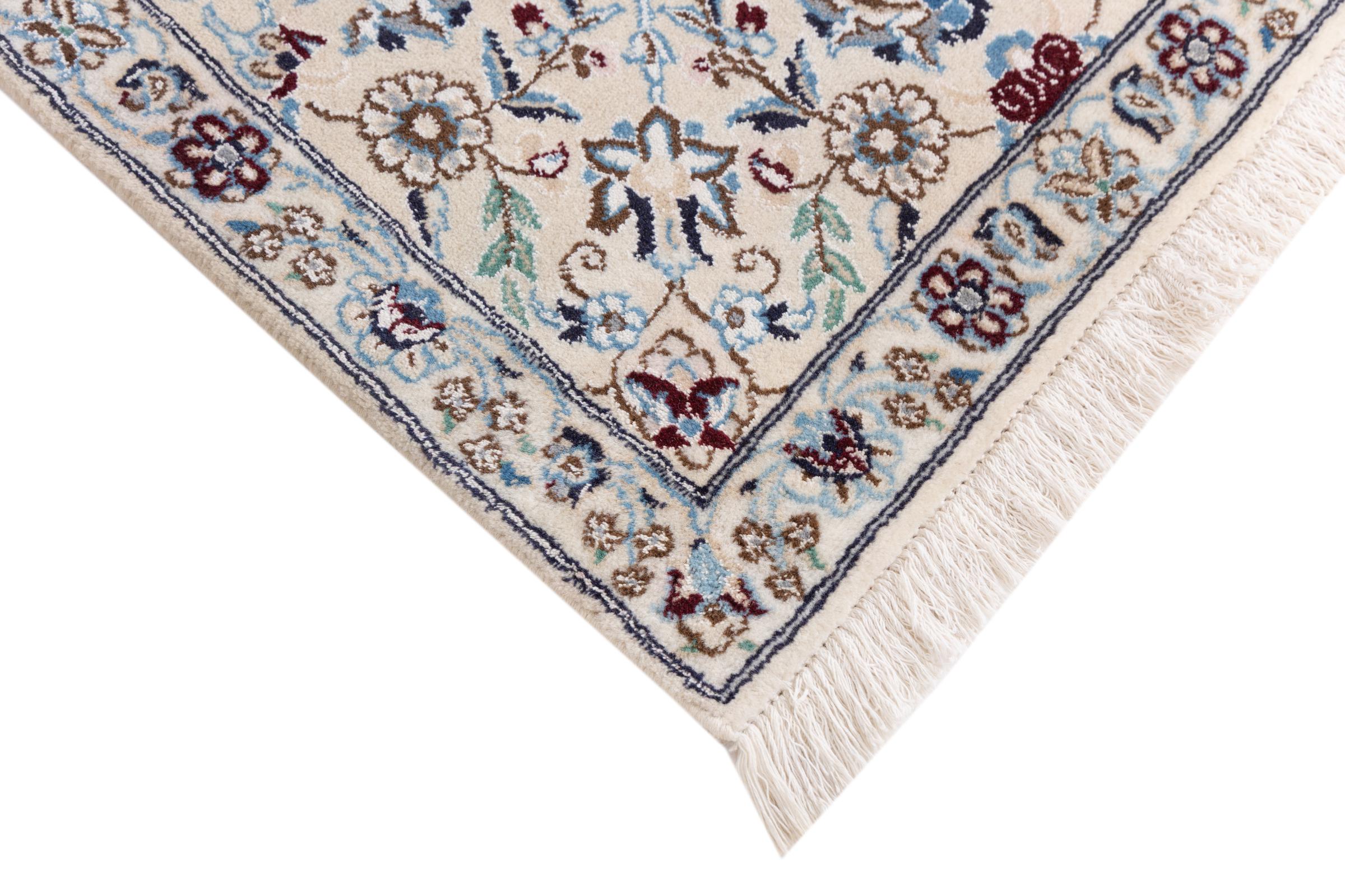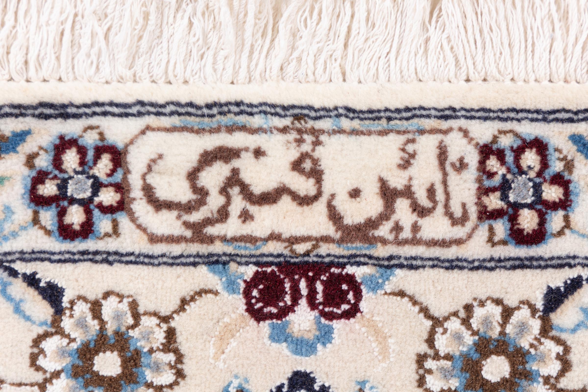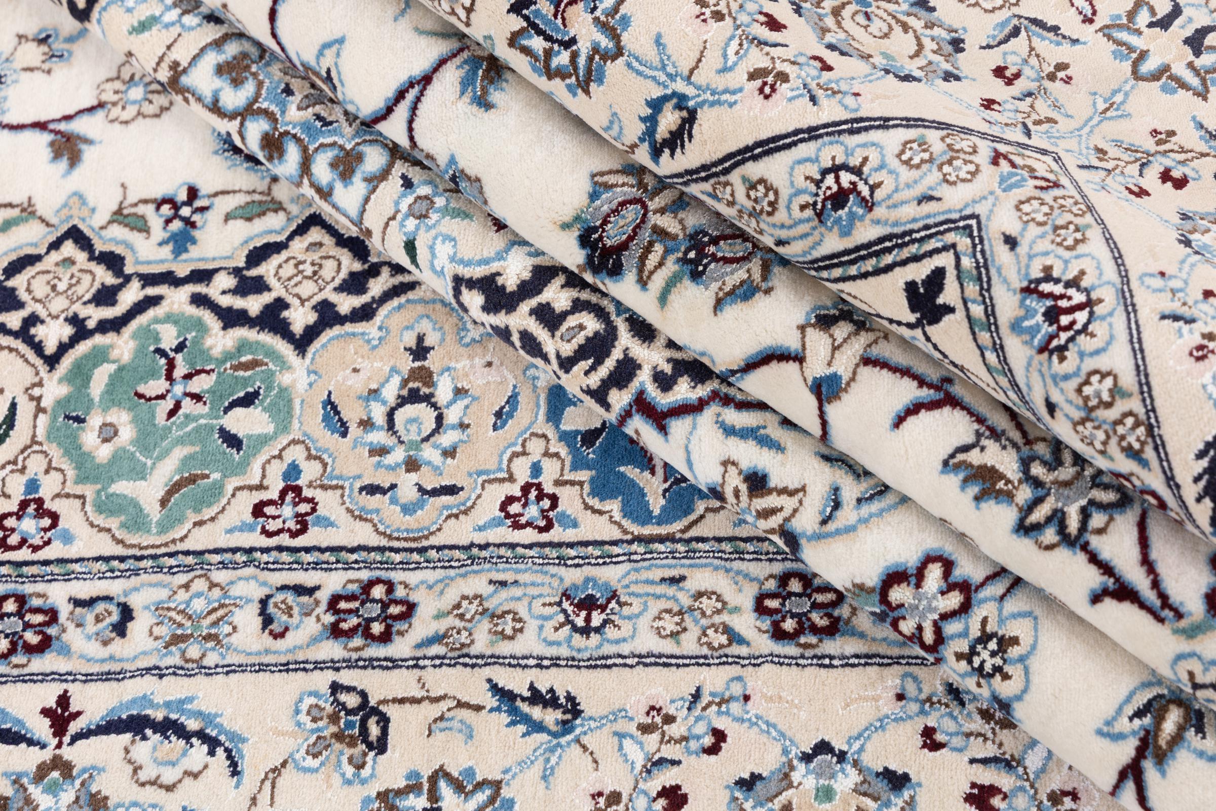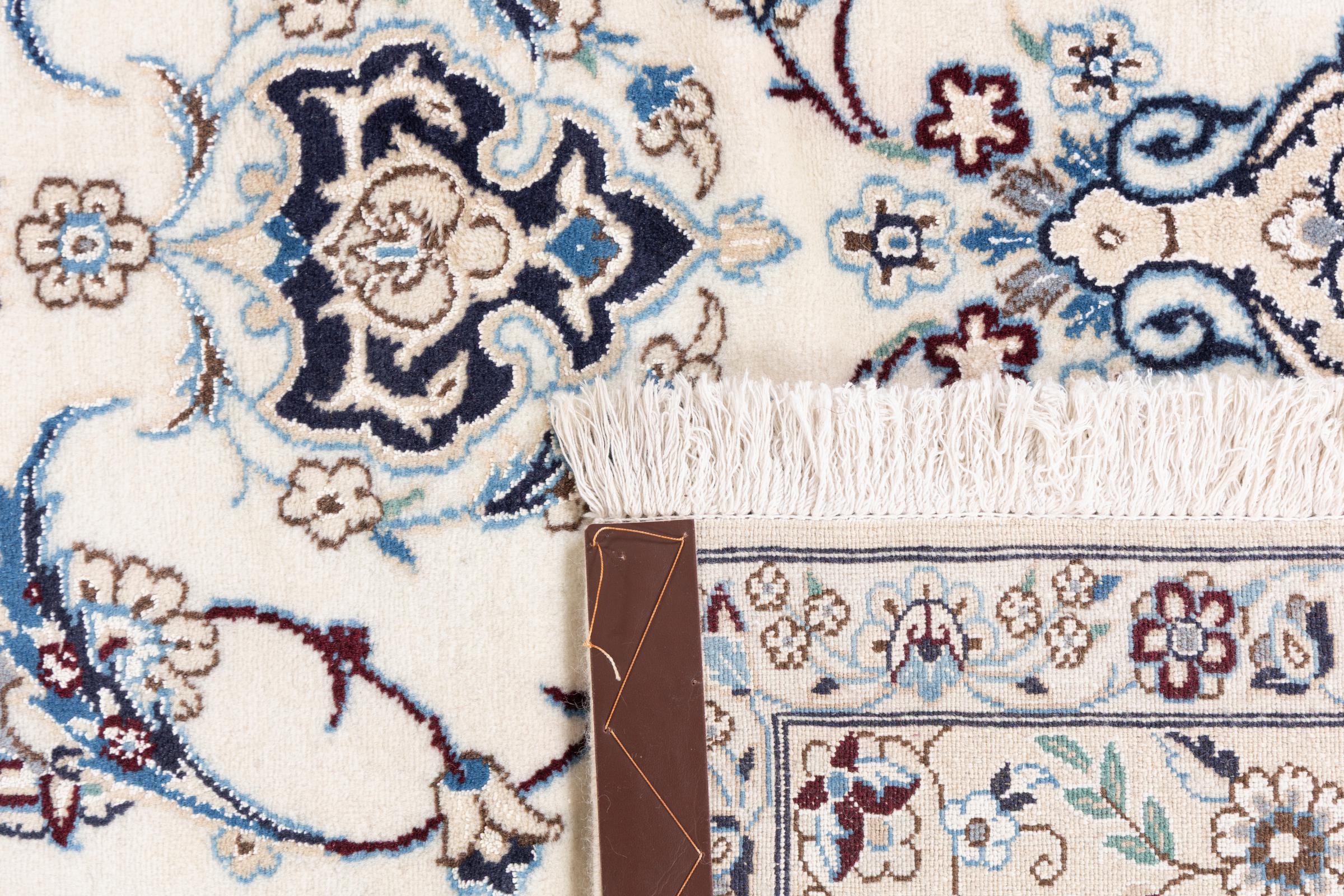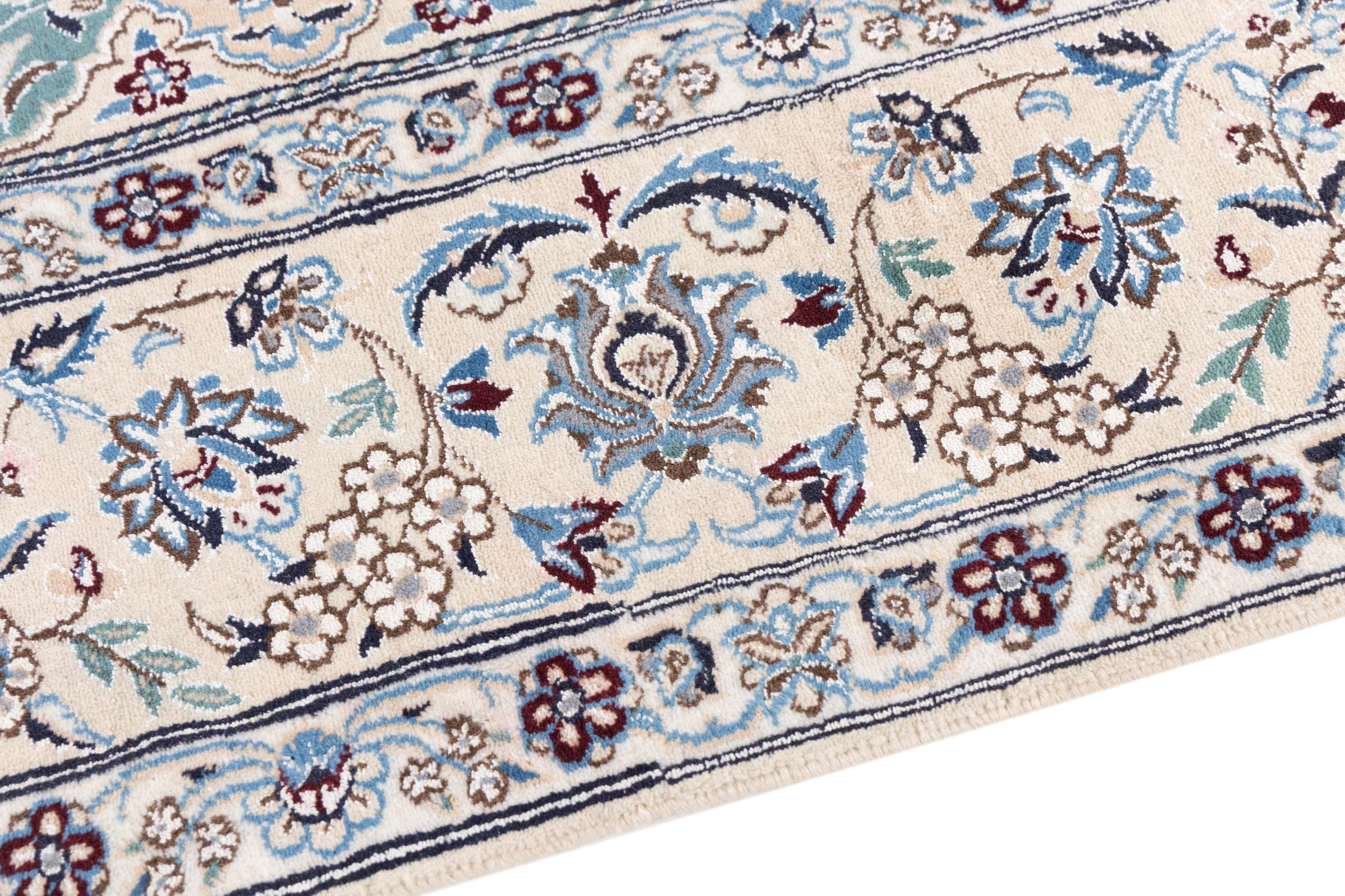 Dette Nain-tæppe er klassificeret 9La. Den fremragende kvalitet, det smukke orientalske design med sine buede mønstre glæder enhver køber. Dette persiske tæppe blev håndknyttet af højkvalitets uld og natursilke i byen Nain, som ligger i den vestlige udkant af Dasht-e-Kavir-ørkenen. 9La Nain er væsentligt finere end en 12La og viser allerede smukke detaljer.
