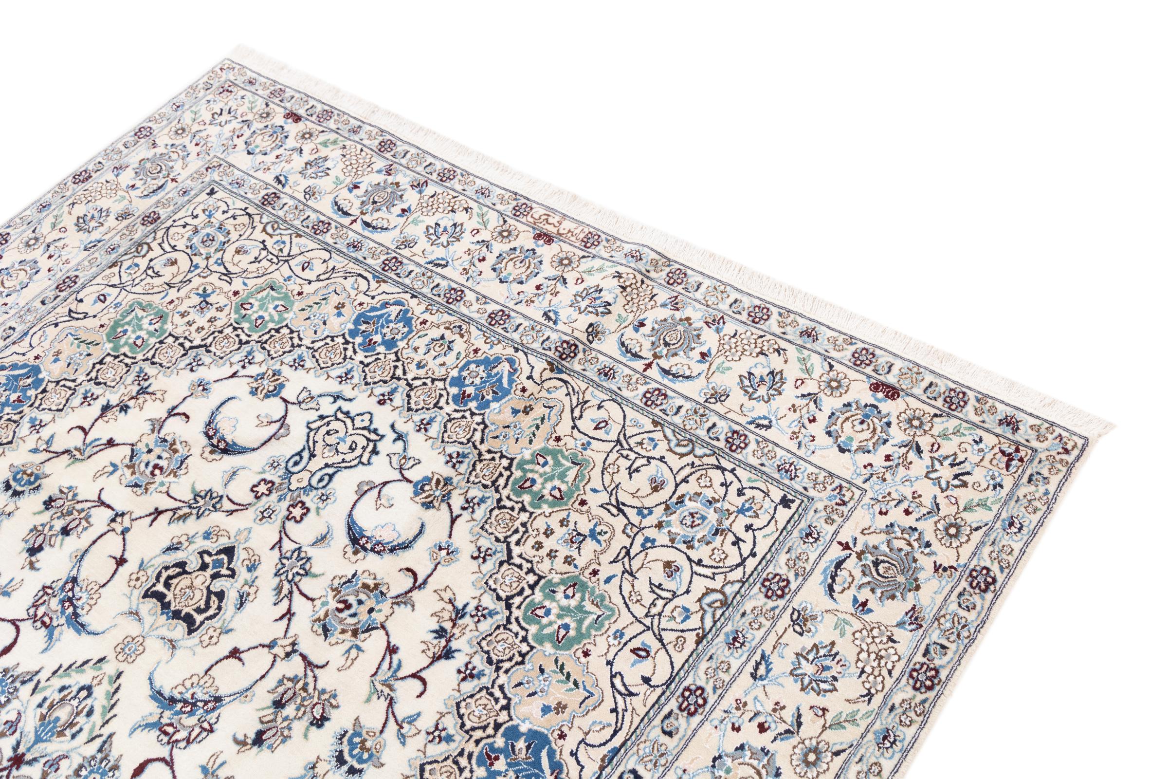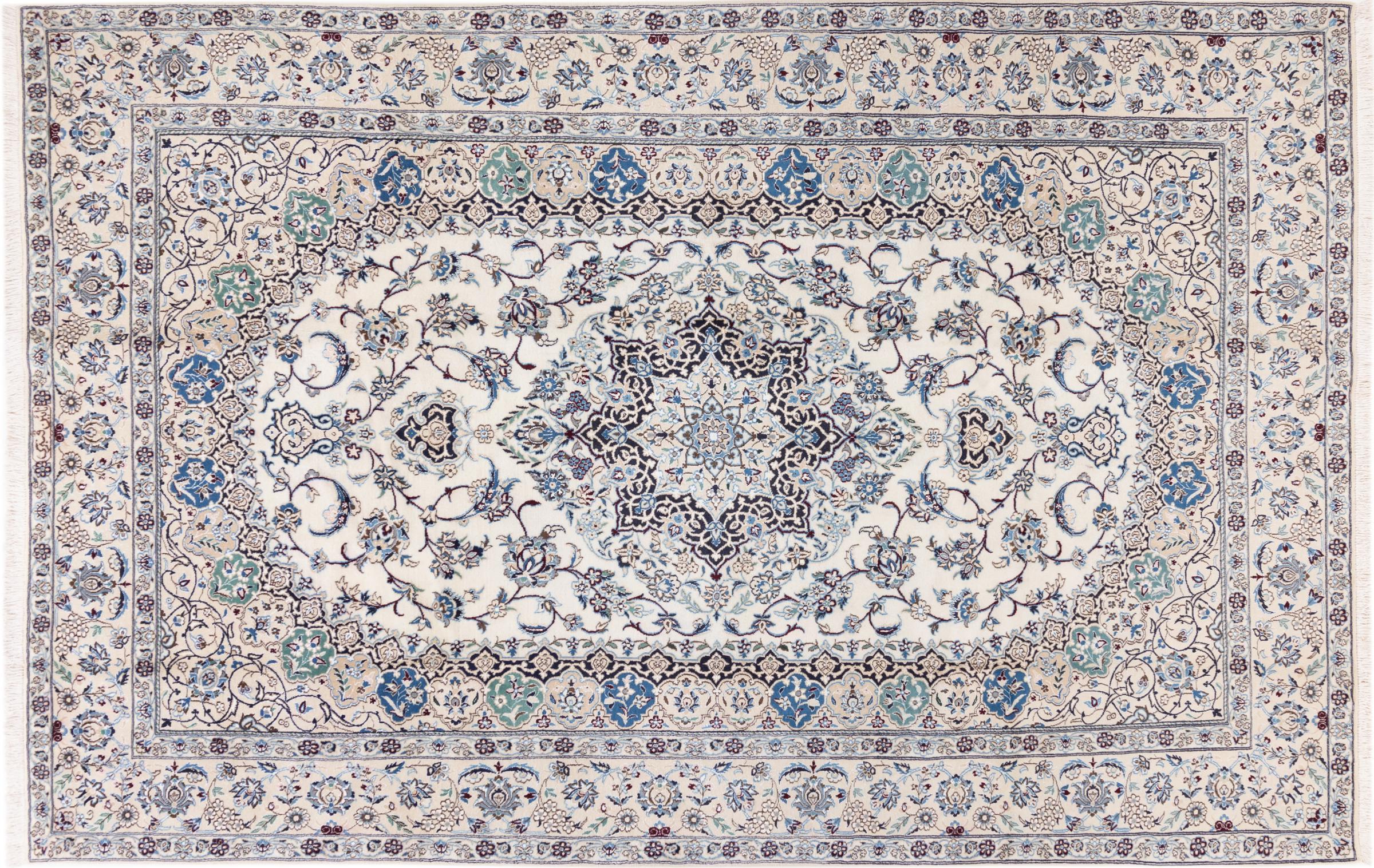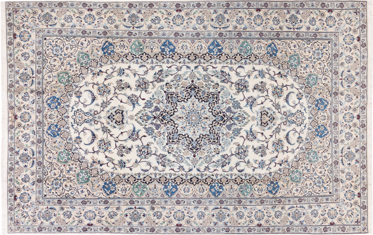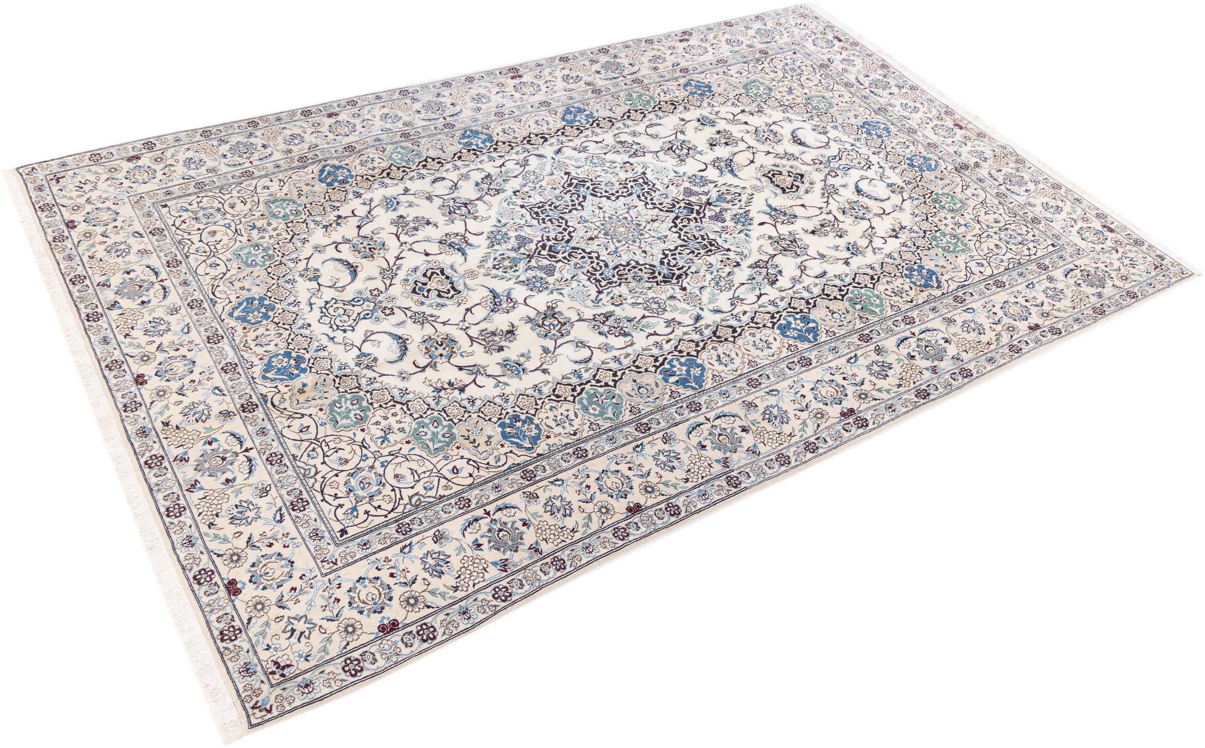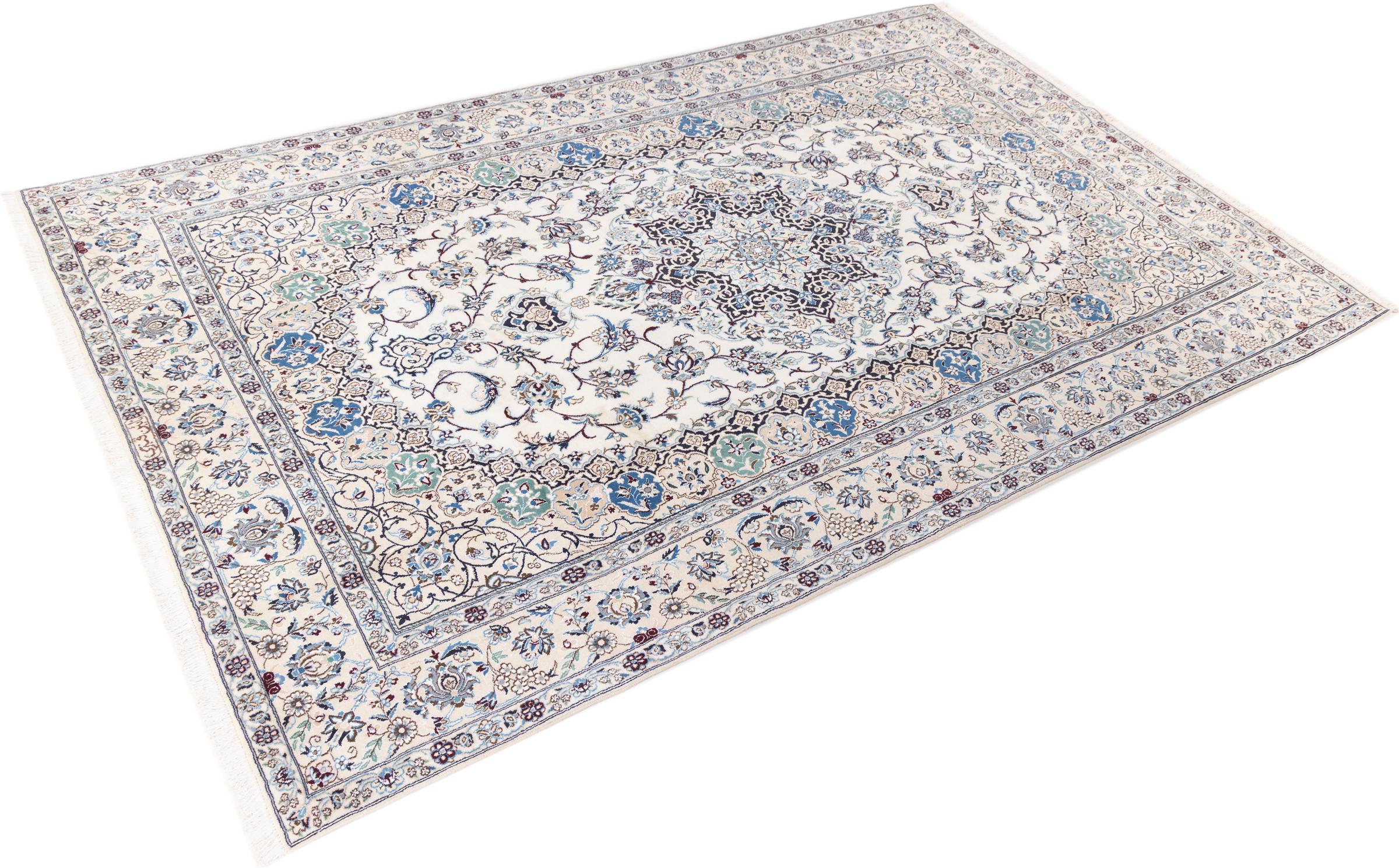 Dette Nain-tæppe er klassificeret 9La. Den fremragende kvalitet, det smukke orientalske design med sine buede mønstre glæder enhver køber. Dette persiske tæppe blev håndknyttet af højkvalitets uld og natursilke i byen Nain, som ligger i den vestlige udkant af Dasht-e-Kavir-ørkenen. 9La Nain er væsentligt finere end en 12La og viser allerede smukke detaljer.