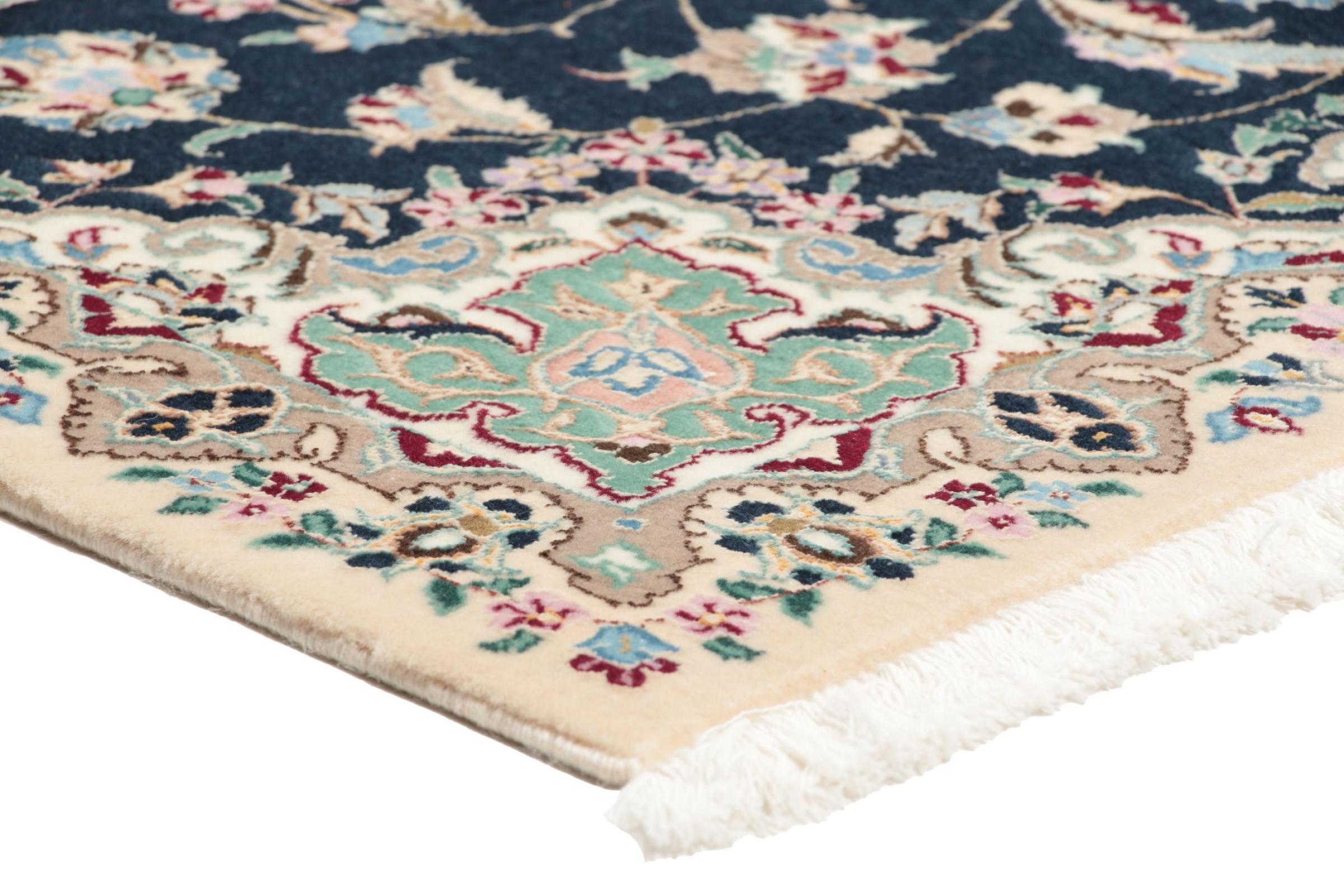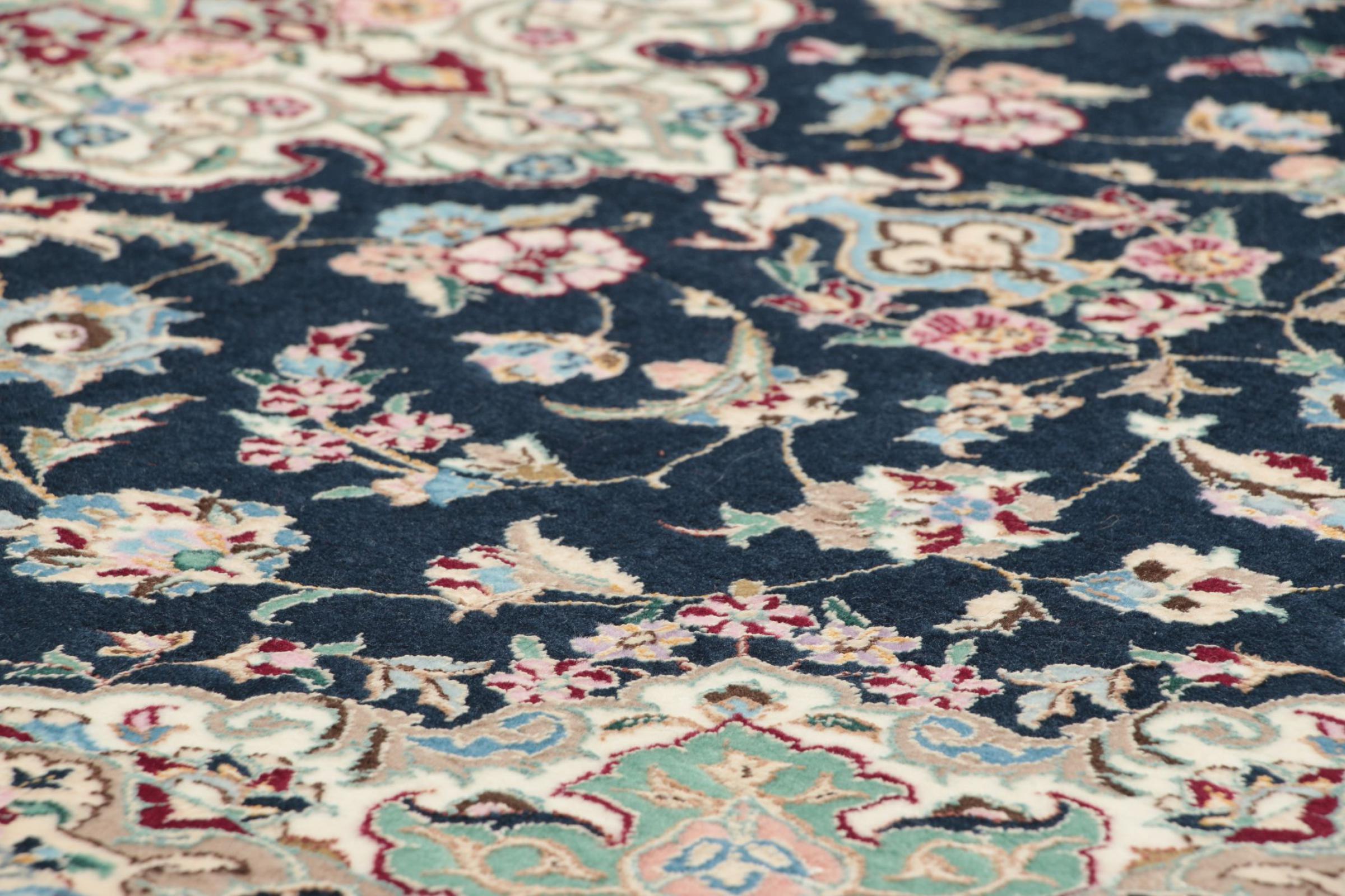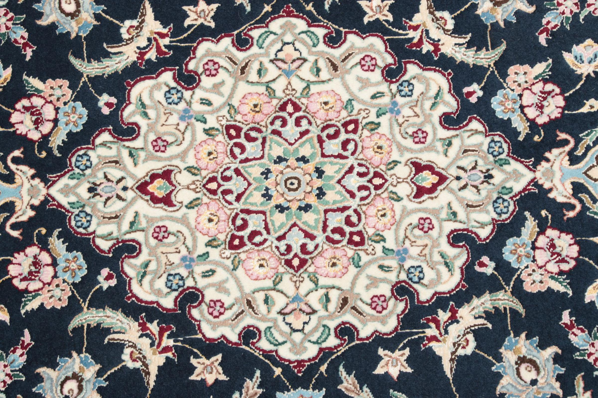 Dette Nain-tæppe er klassificeret 9La. Den fremragende kvalitet, det smukke orientalske design med sine buede mønstre glæder enhver køber. Dette persiske tæppe blev håndknyttet af højkvalitets uld og natursilke i byen Nain, som ligger i den vestlige udkant af Dasht-e-Kavir-ørkenen. 9La Nain er væsentligt finere end en 12La og viser allerede smukke detaljer.