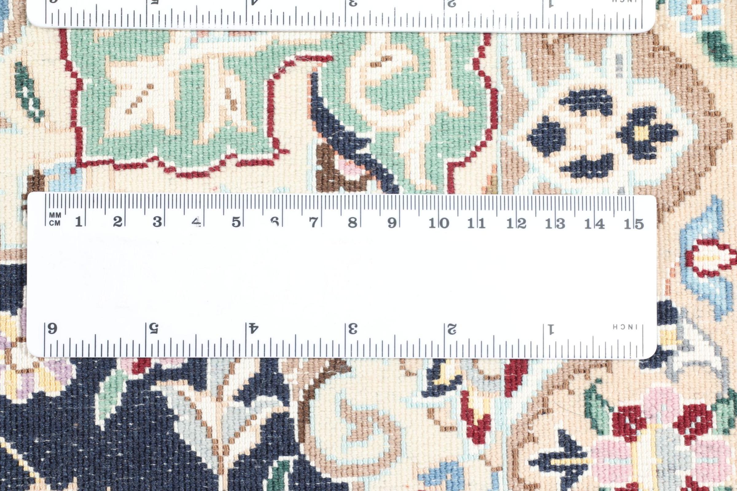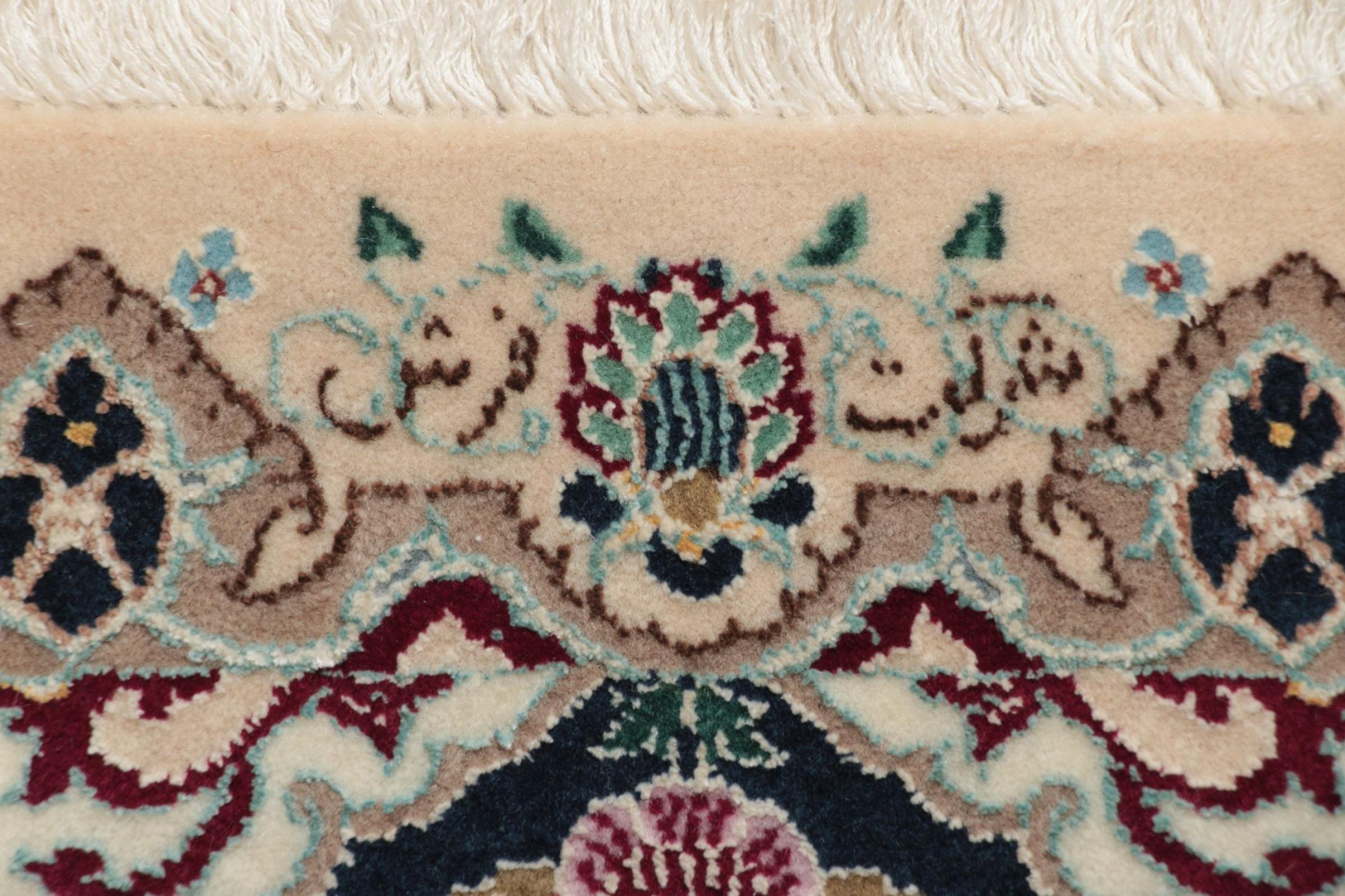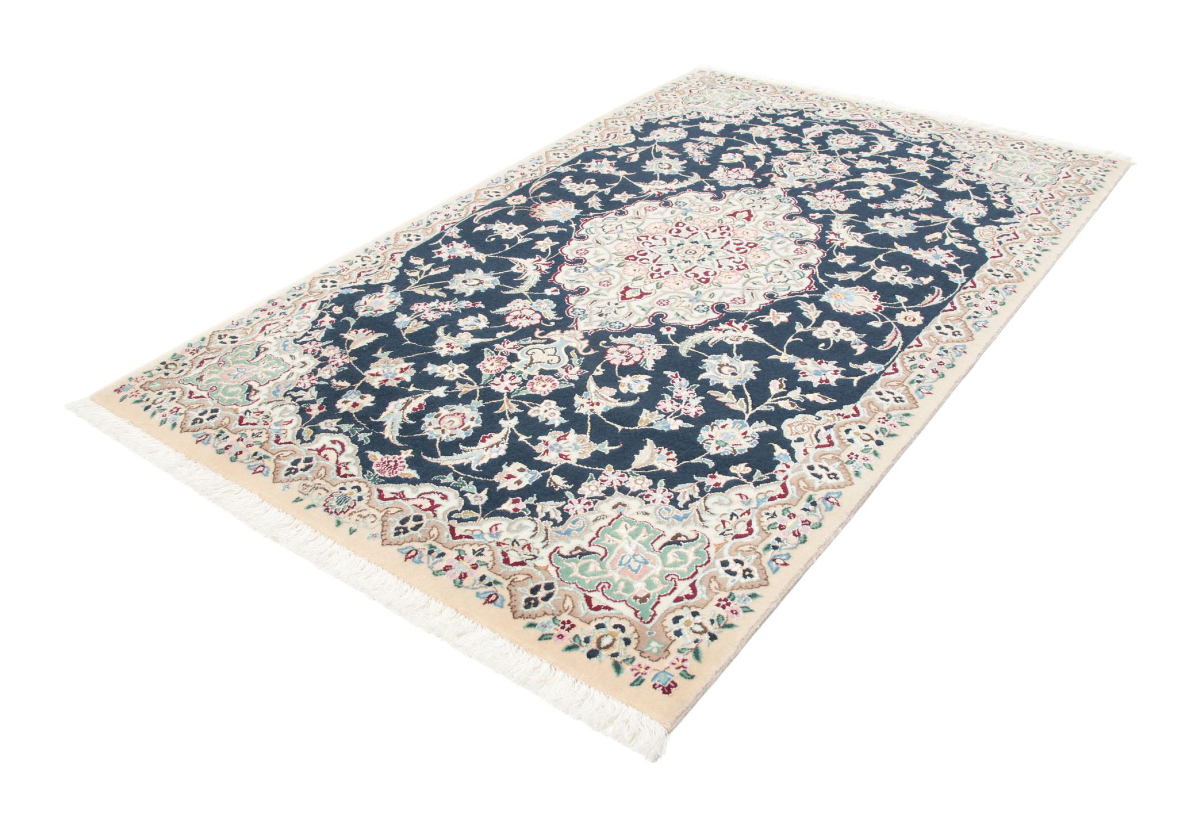 Dette Nain-tæppe er klassificeret 9La. Den fremragende kvalitet, det smukke orientalske design med sine buede mønstre glæder enhver køber. Dette persiske tæppe blev håndknyttet af højkvalitets uld og natursilke i byen Nain, som ligger i den vestlige udkant af Dasht-e-Kavir-ørkenen. 9La Nain er væsentligt finere end en 12La og viser allerede smukke detaljer.