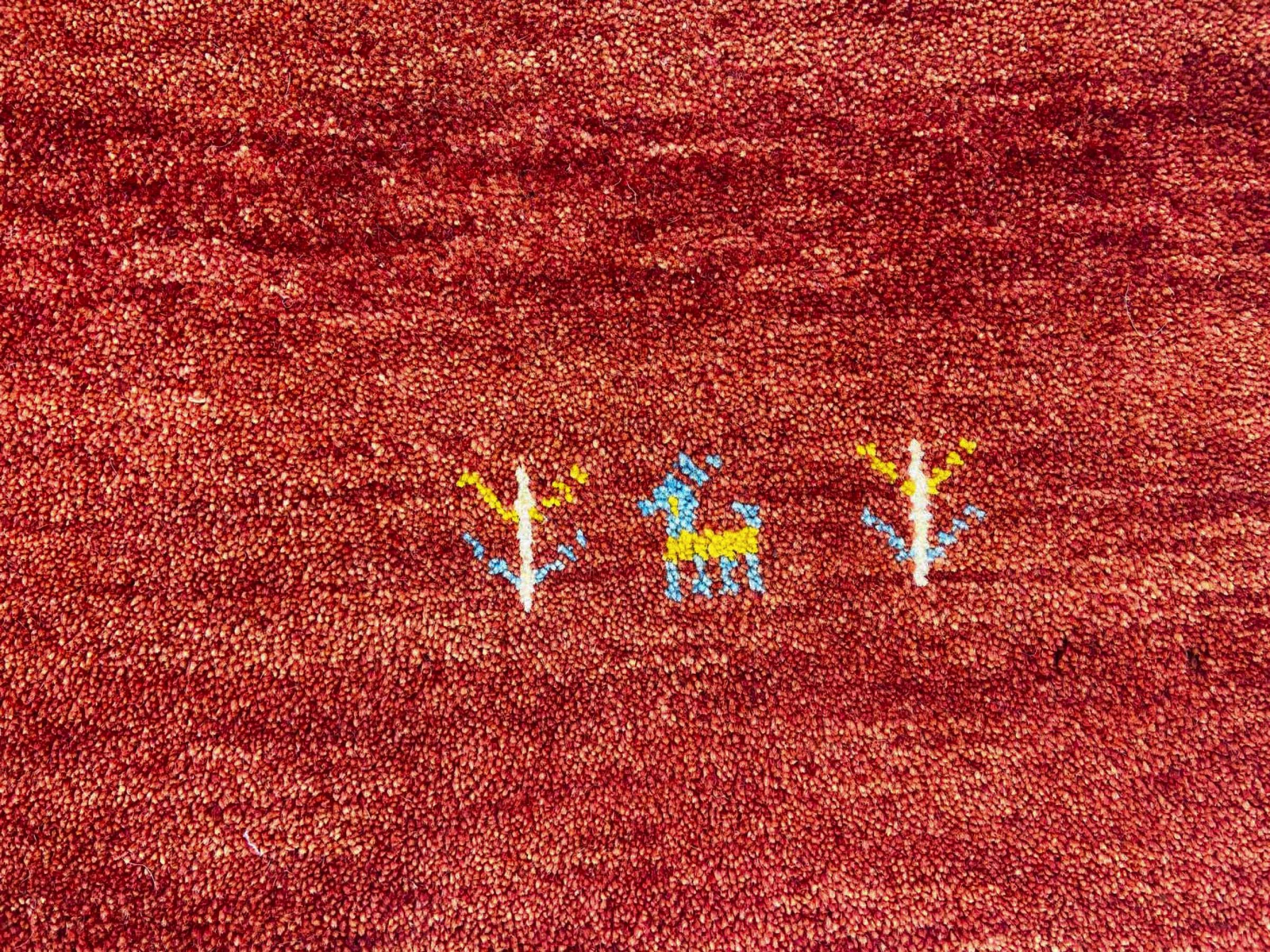 Dette smukke tæppe er en persisk Gabbeh og er en af ​​de højeste kvalitet Gabbeh tæpper. Tæpper er knyttet af nomader eller semi-nomader i Iran ved hjælp af traditionelt håndværk. De enkle motiver og mønstre er for det meste inspireret af nomadernes umiddelbare omgivelser. F.eks. Kan kameler, træer eller buske findes på traditionelle tæpper. Persiske Gabbeh-tæpper er lavet af uld fra lokale fårbesætninger. Ulden er derfor for det meste spundet for hånd. Hver af disse orientalske tæpper udgør en unik karakter af århundreder gammel kultur.
