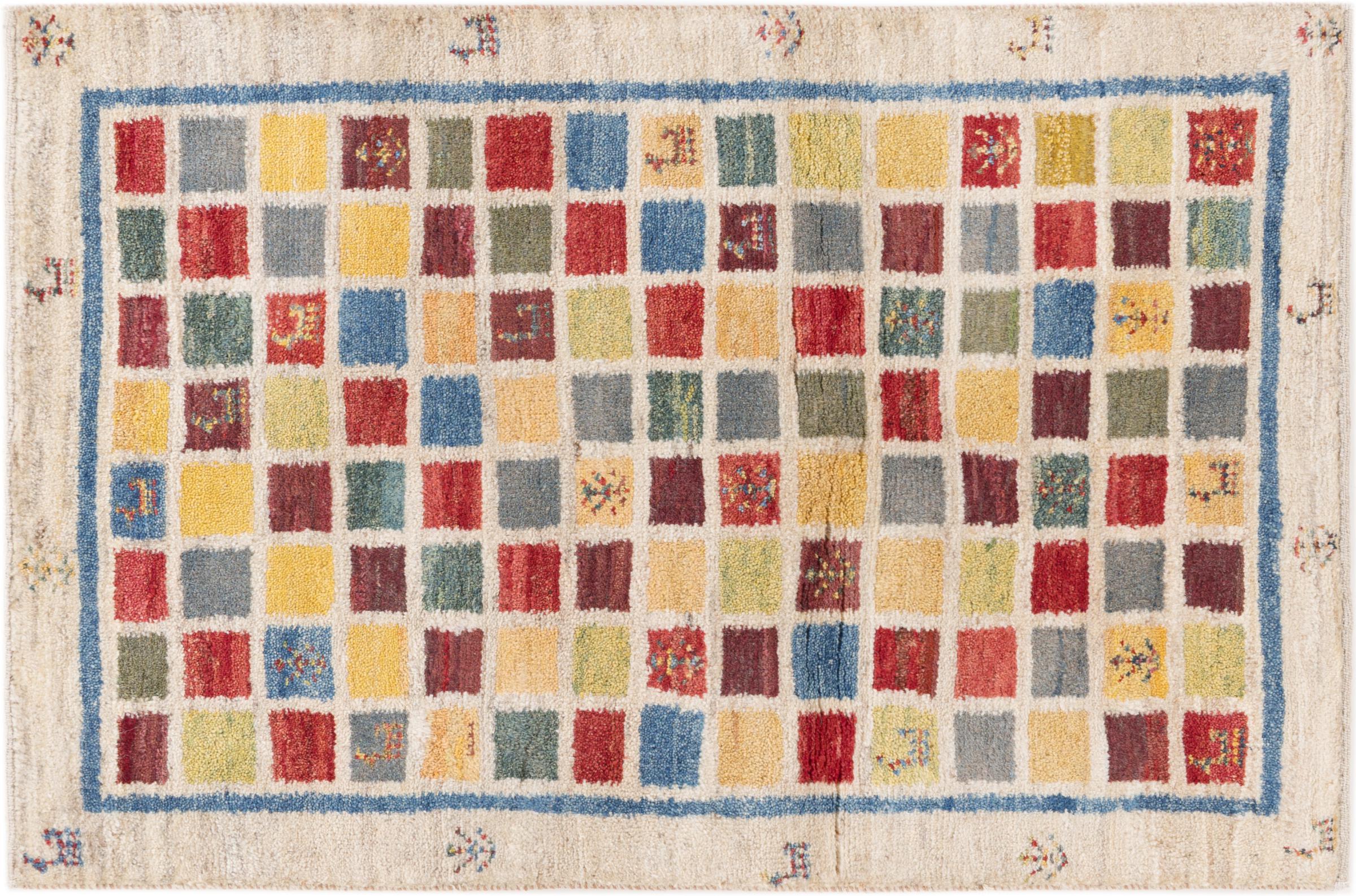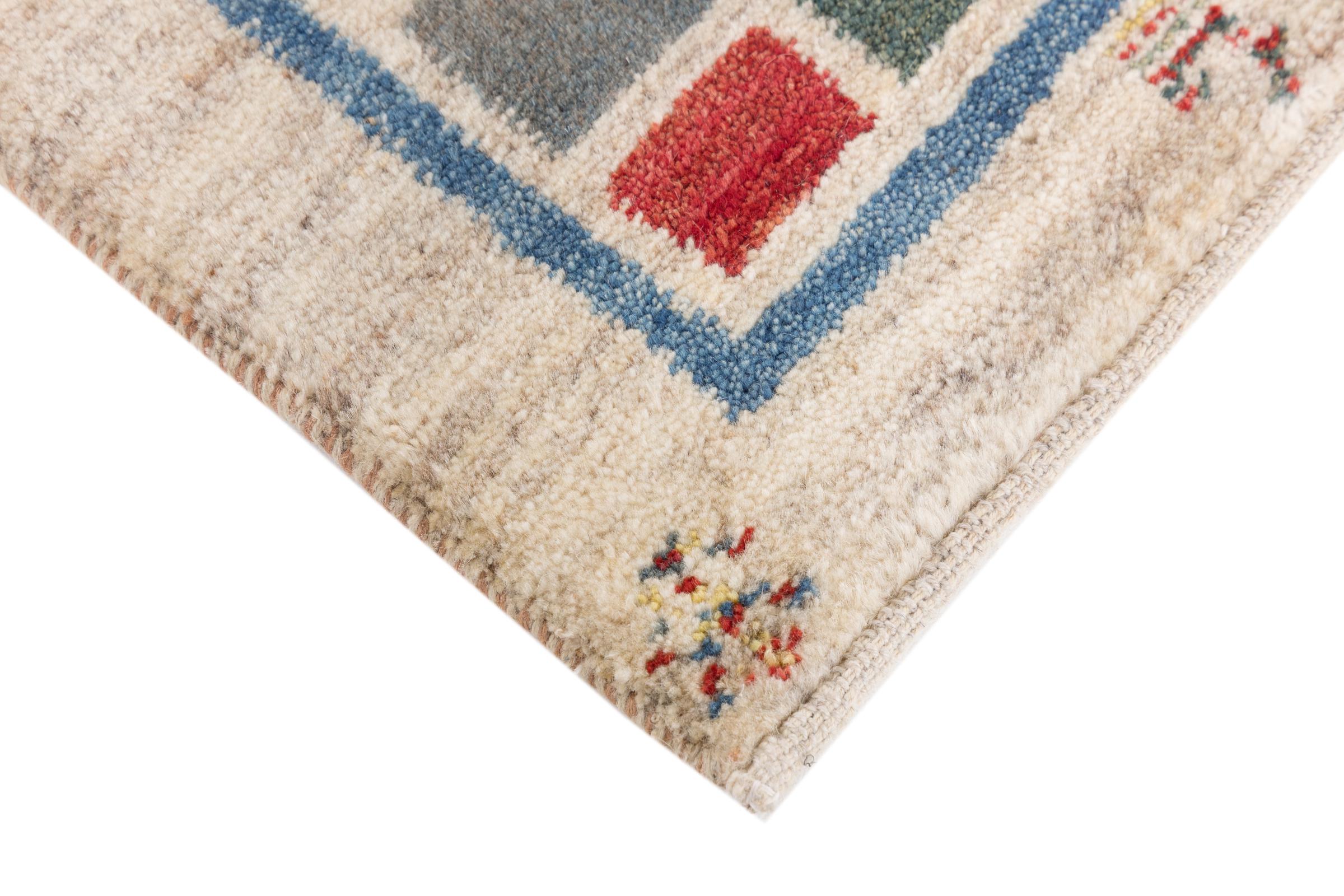 Dette smukke tæppe er en persisk Gabbeh og er en af ​​de højeste kvalitet Gabbeh tæpper. Tæpper er knyttet af nomader eller semi-nomader i Iran ved hjælp af traditionelt håndværk. De enkle motiver og mønstre er for det meste inspireret af nomadernes umiddelbare omgivelser. F.eks. Kan kameler, træer eller buske findes på traditionelle tæpper. Persiske Gabbeh-tæpper er lavet af uld fra lokale fårbesætninger. Ulden er derfor for det meste spundet for hånd. Hver af disse orientalske tæpper udgør en unik karakter af århundreder gammel kultur.