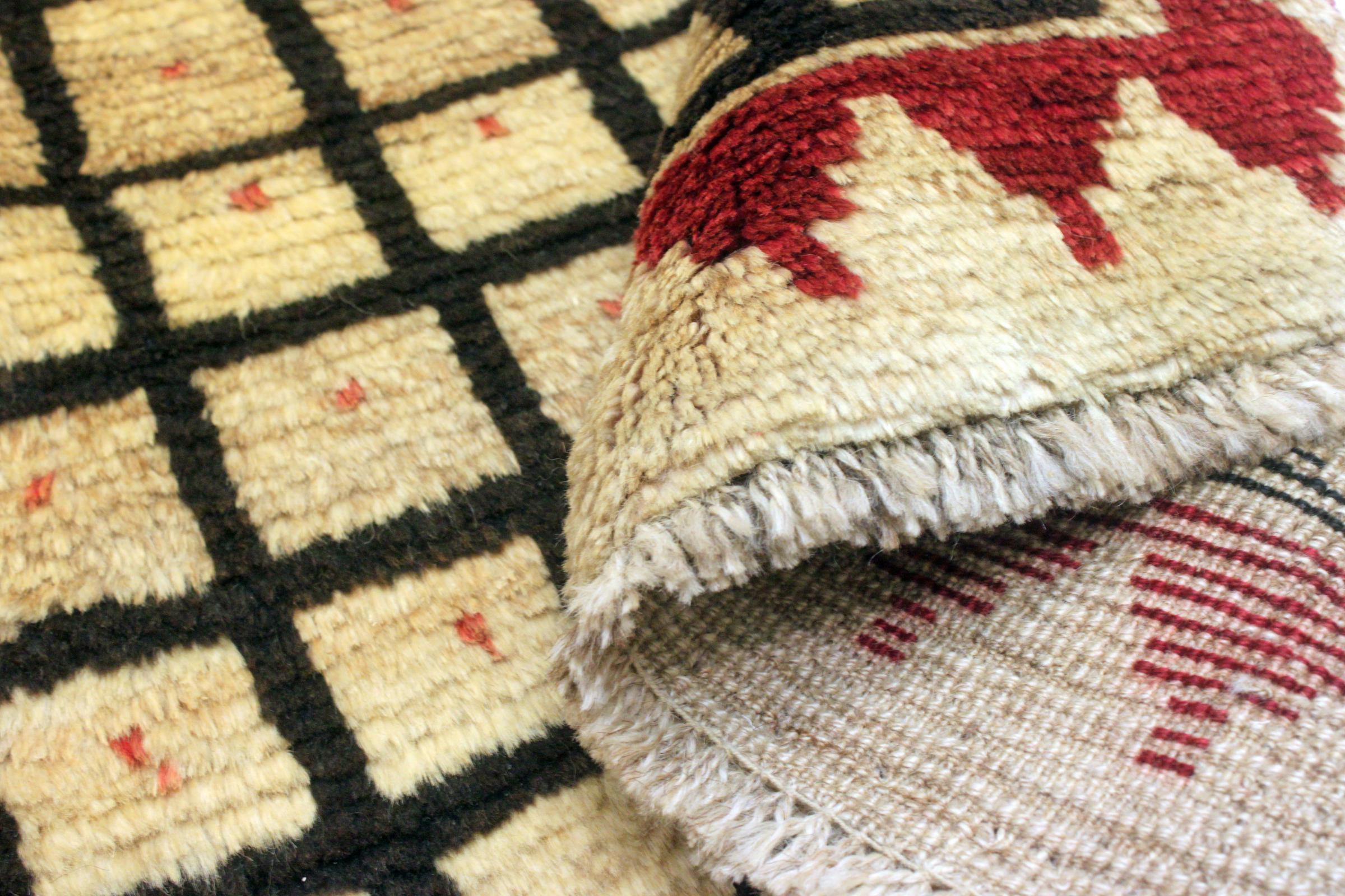 Dette smukke tæppe er en persisk Gabbeh og er en af ​​de højeste kvalitet Gabbeh tæpper. Tæpper er knyttet af nomader eller semi-nomader i Iran ved hjælp af traditionelt håndværk. De enkle motiver og mønstre er for det meste inspireret af nomadernes umiddelbare omgivelser. F.eks. Kan kameler, træer eller buske findes på traditionelle tæpper. Persiske Gabbeh-tæpper er lavet af uld fra lokale fårbesætninger. Ulden er derfor for det meste spundet for hånd. Hver af disse orientalske tæpper udgør en unik karakter af århundreder gammel kultur.