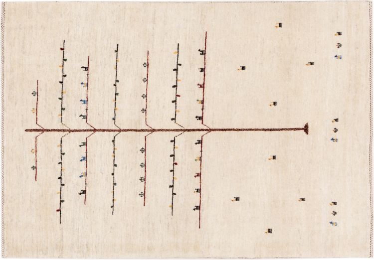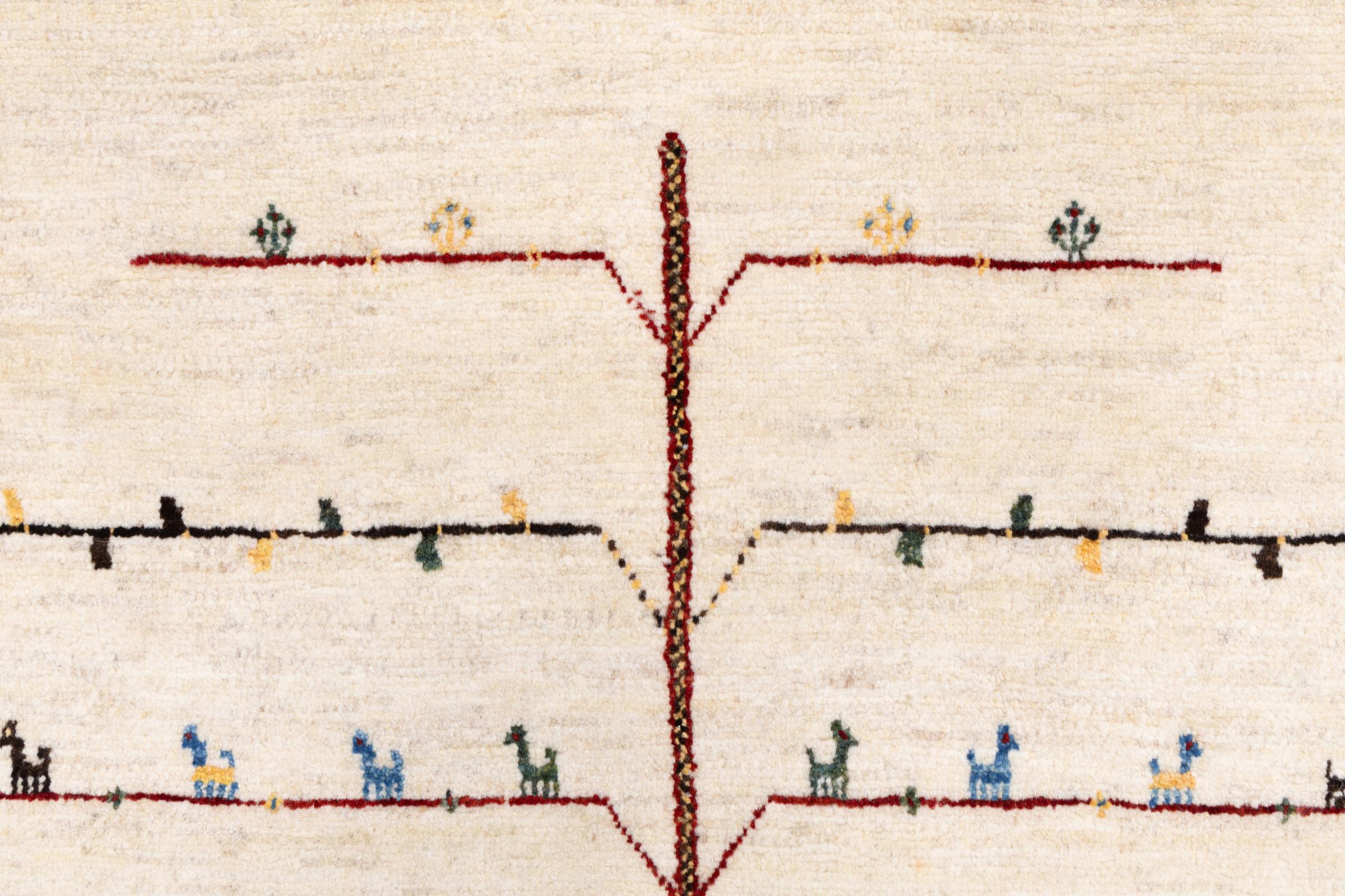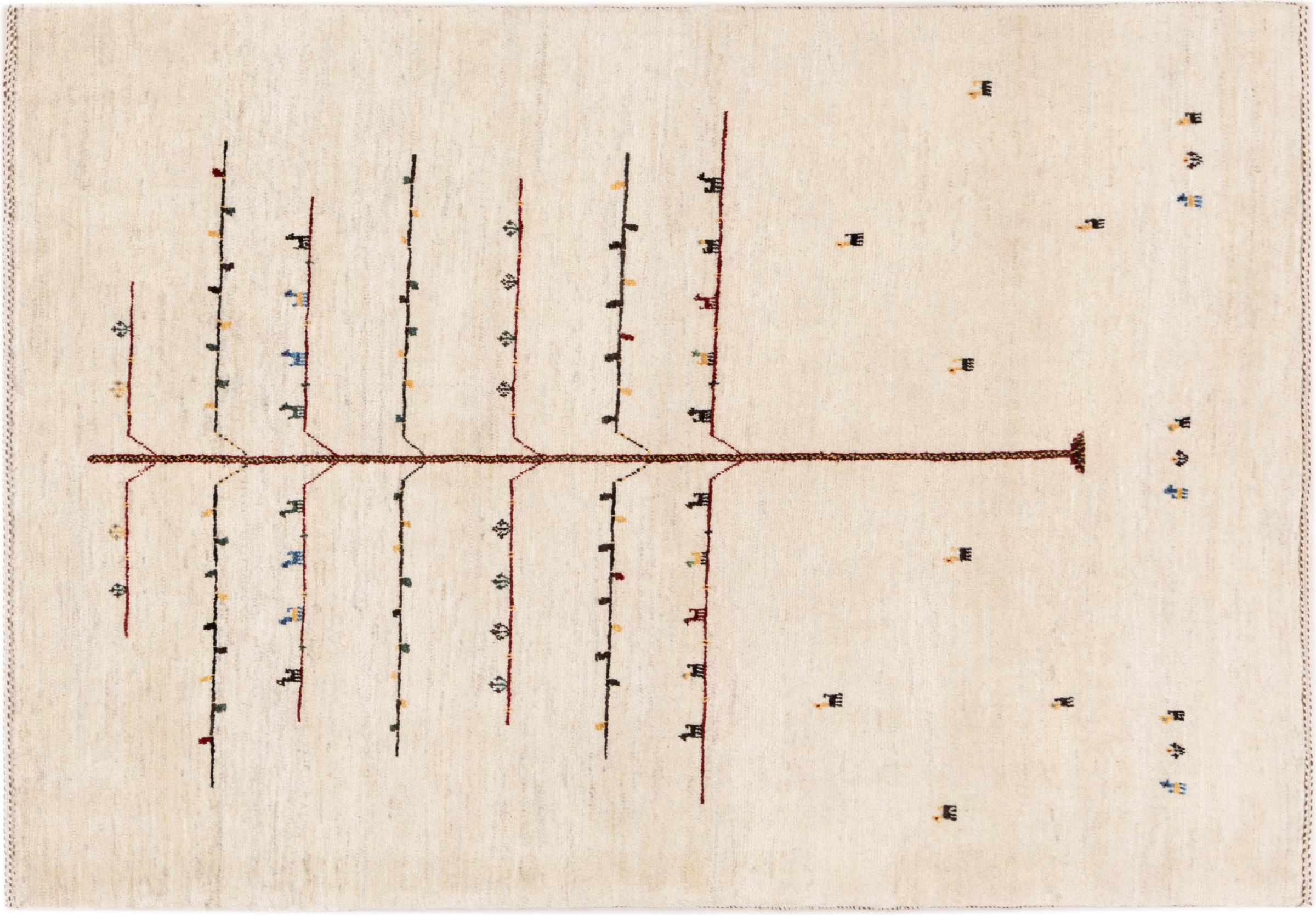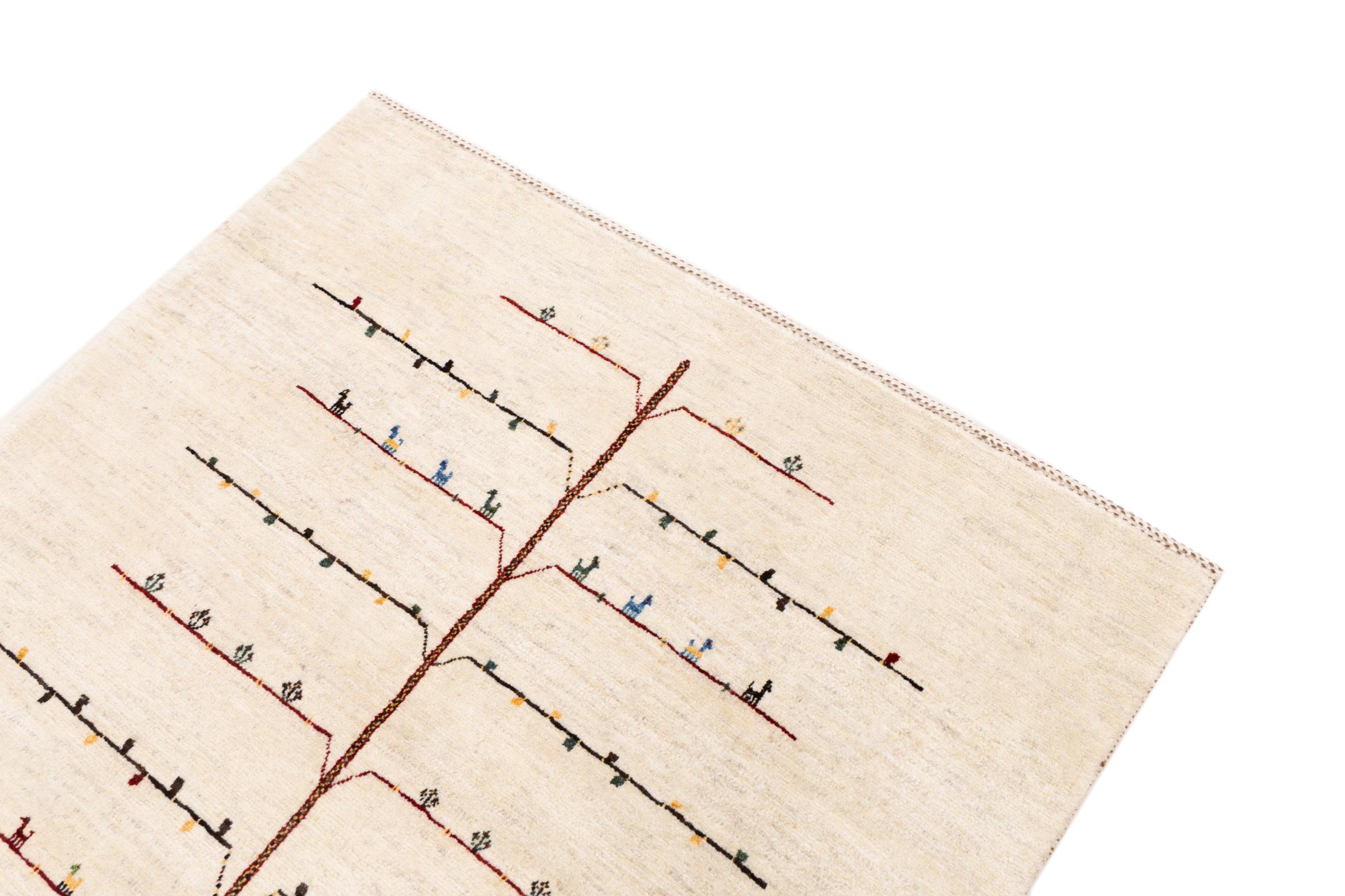 Dette smukke tæppe er en persisk Gabbeh og er en af ​​de højeste kvalitet Gabbeh tæpper. Tæpper er knyttet af nomader eller semi-nomader i Iran ved hjælp af traditionelt håndværk. De enkle motiver og mønstre er for det meste inspireret af nomadernes umiddelbare omgivelser. F.eks. Kan kameler, træer eller buske findes på traditionelle tæpper. Persiske Gabbeh-tæpper er lavet af uld fra lokale fårbesætninger. Ulden er derfor for det meste spundet for hånd. Hver af disse orientalske tæpper udgør en unik karakter af århundreder gammel kultur.
