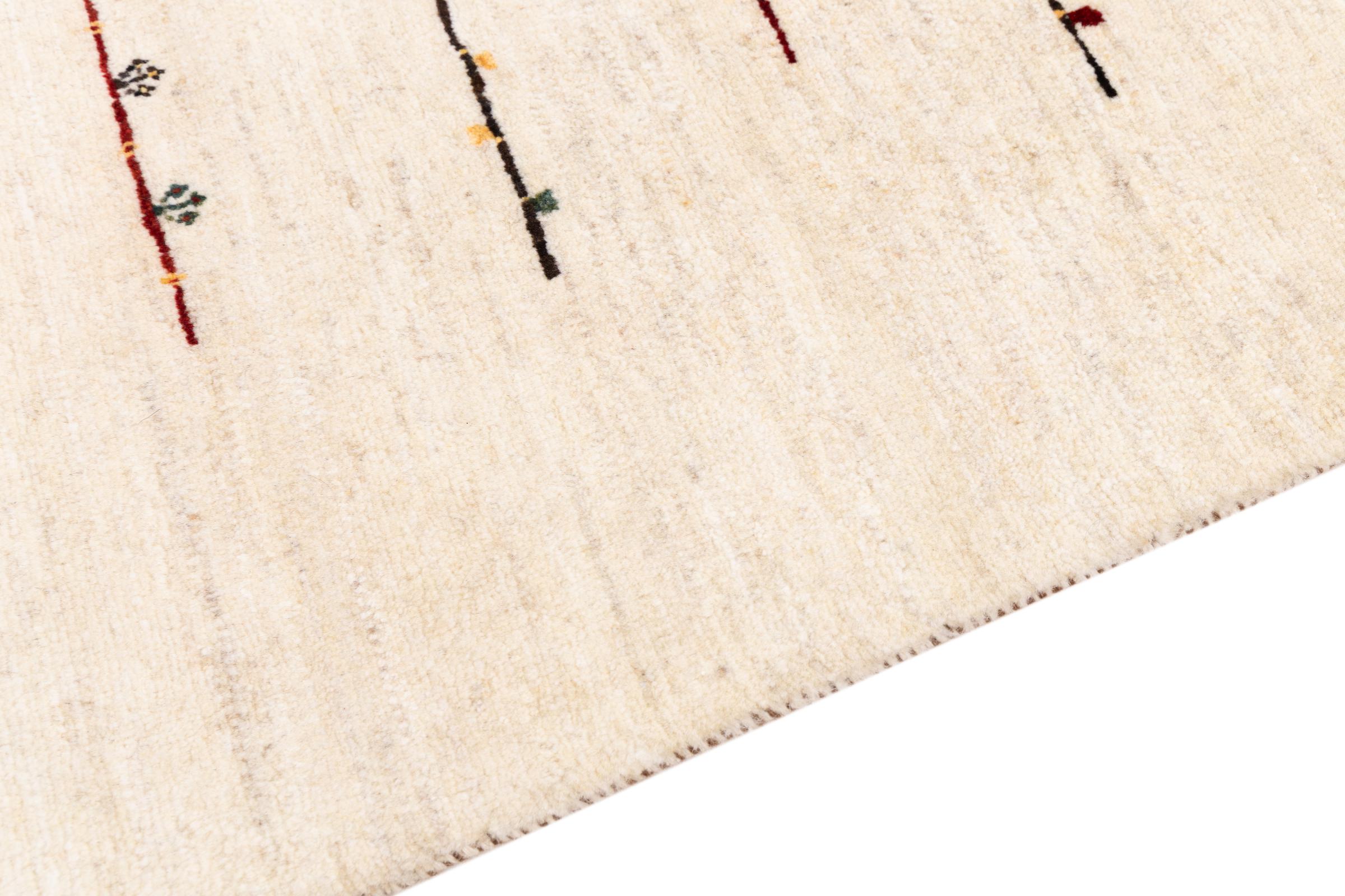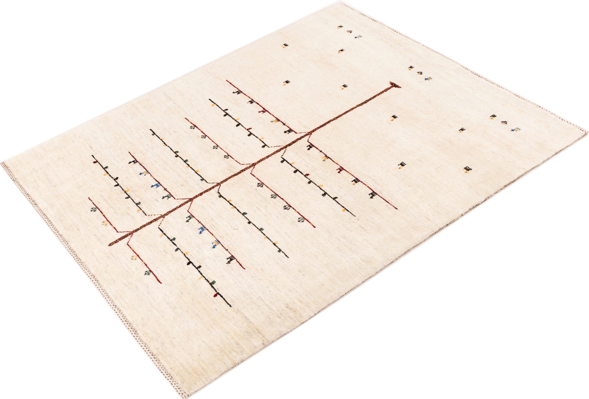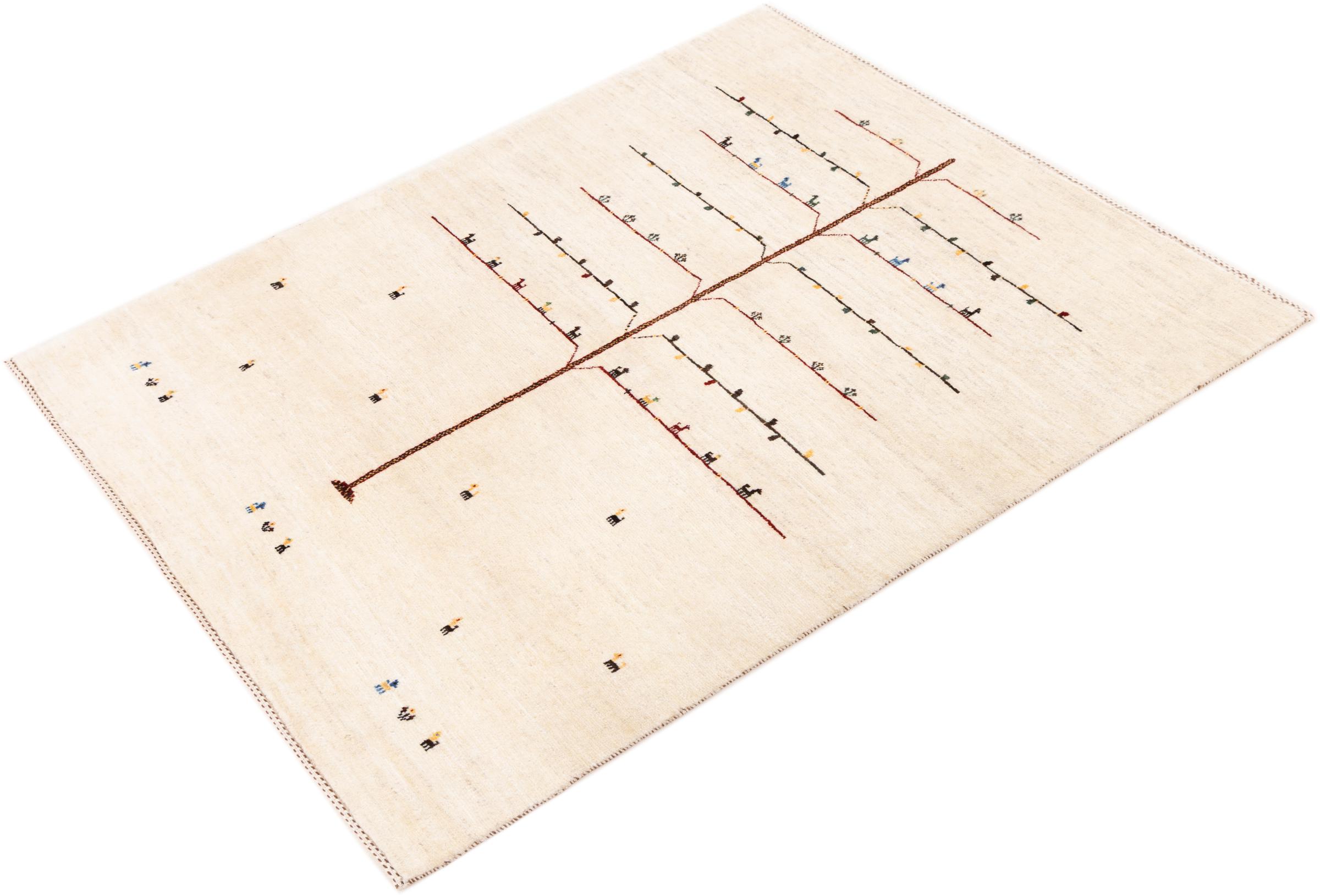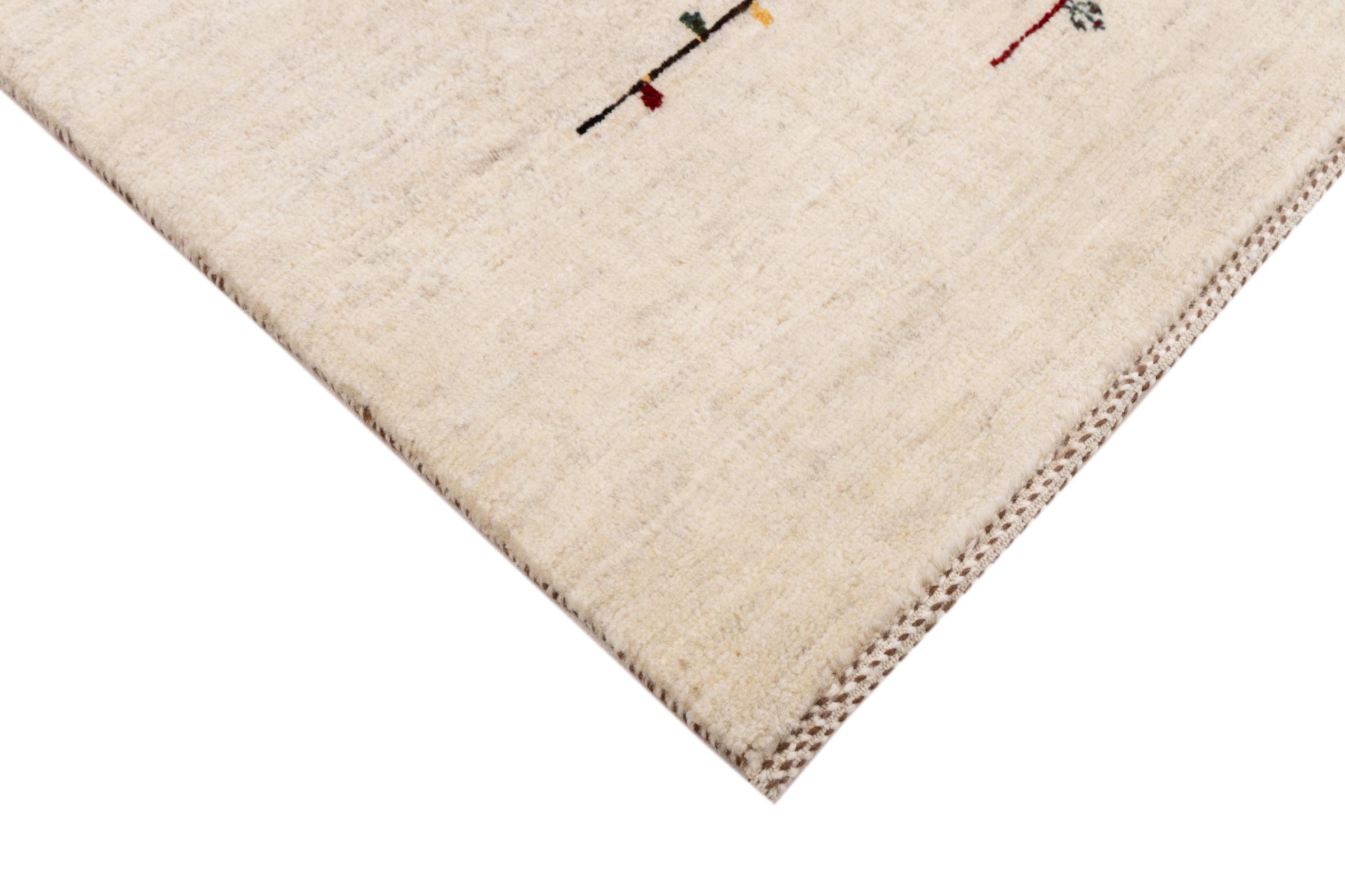 Dette smukke tæppe er en persisk Gabbeh og er en af ​​de højeste kvalitet Gabbeh tæpper. Tæpper er knyttet af nomader eller semi-nomader i Iran ved hjælp af traditionelt håndværk. De enkle motiver og mønstre er for det meste inspireret af nomadernes umiddelbare omgivelser. F.eks. Kan kameler, træer eller buske findes på traditionelle tæpper. Persiske Gabbeh-tæpper er lavet af uld fra lokale fårbesætninger. Ulden er derfor for det meste spundet for hånd. Hver af disse orientalske tæpper udgør en unik karakter af århundreder gammel kultur.