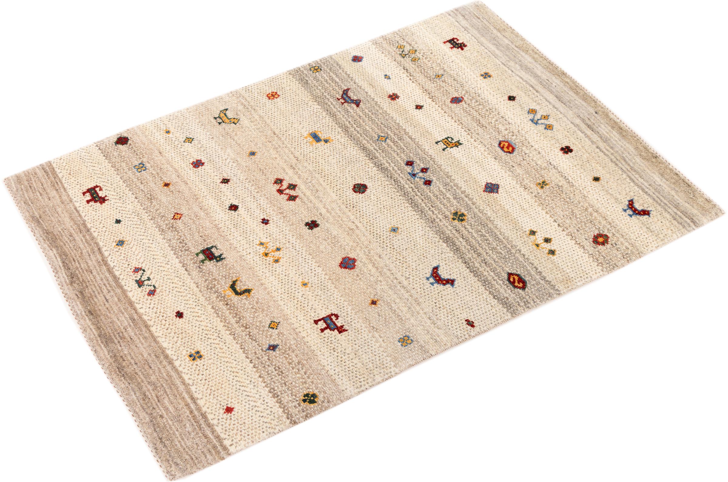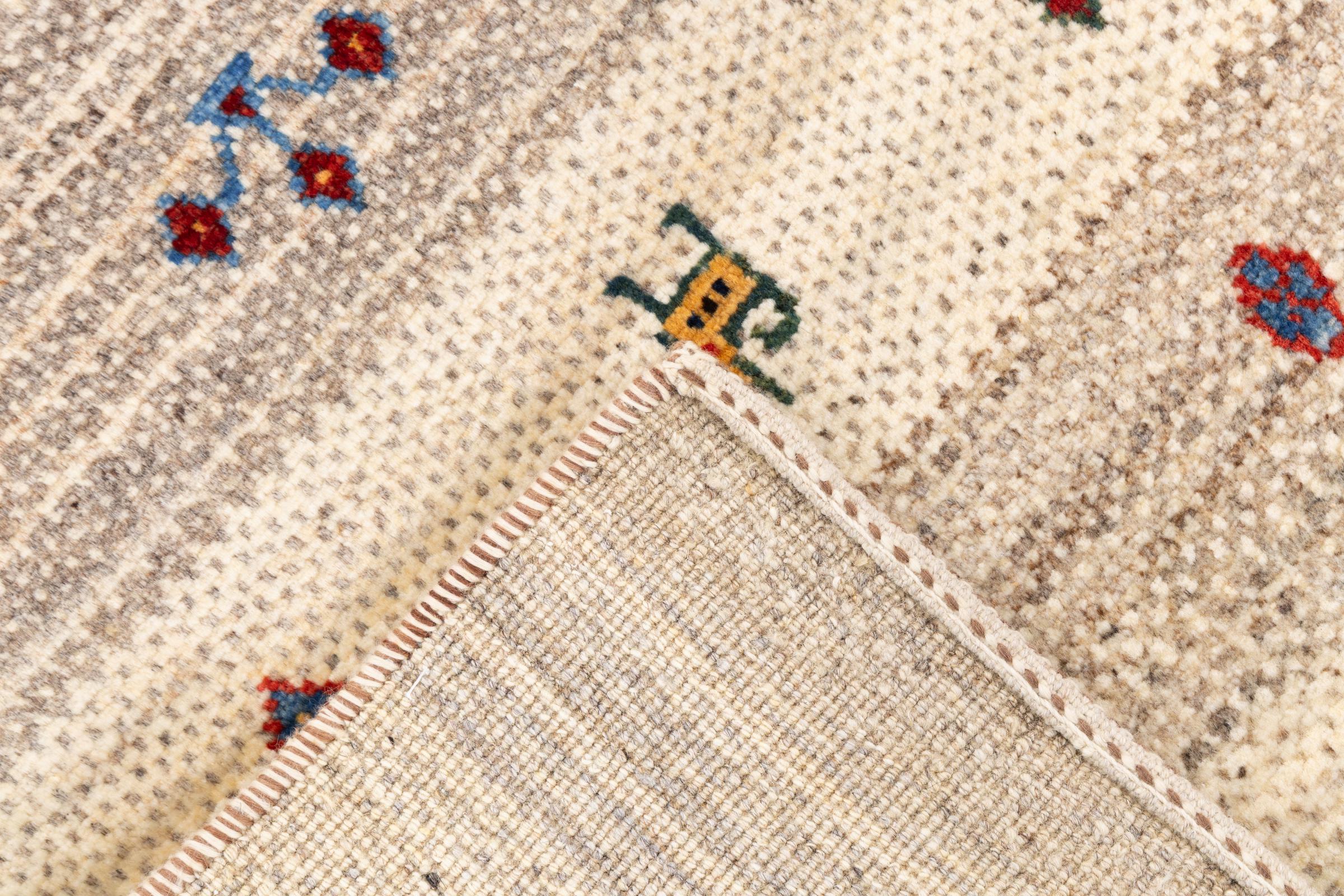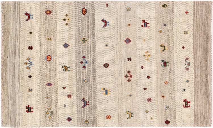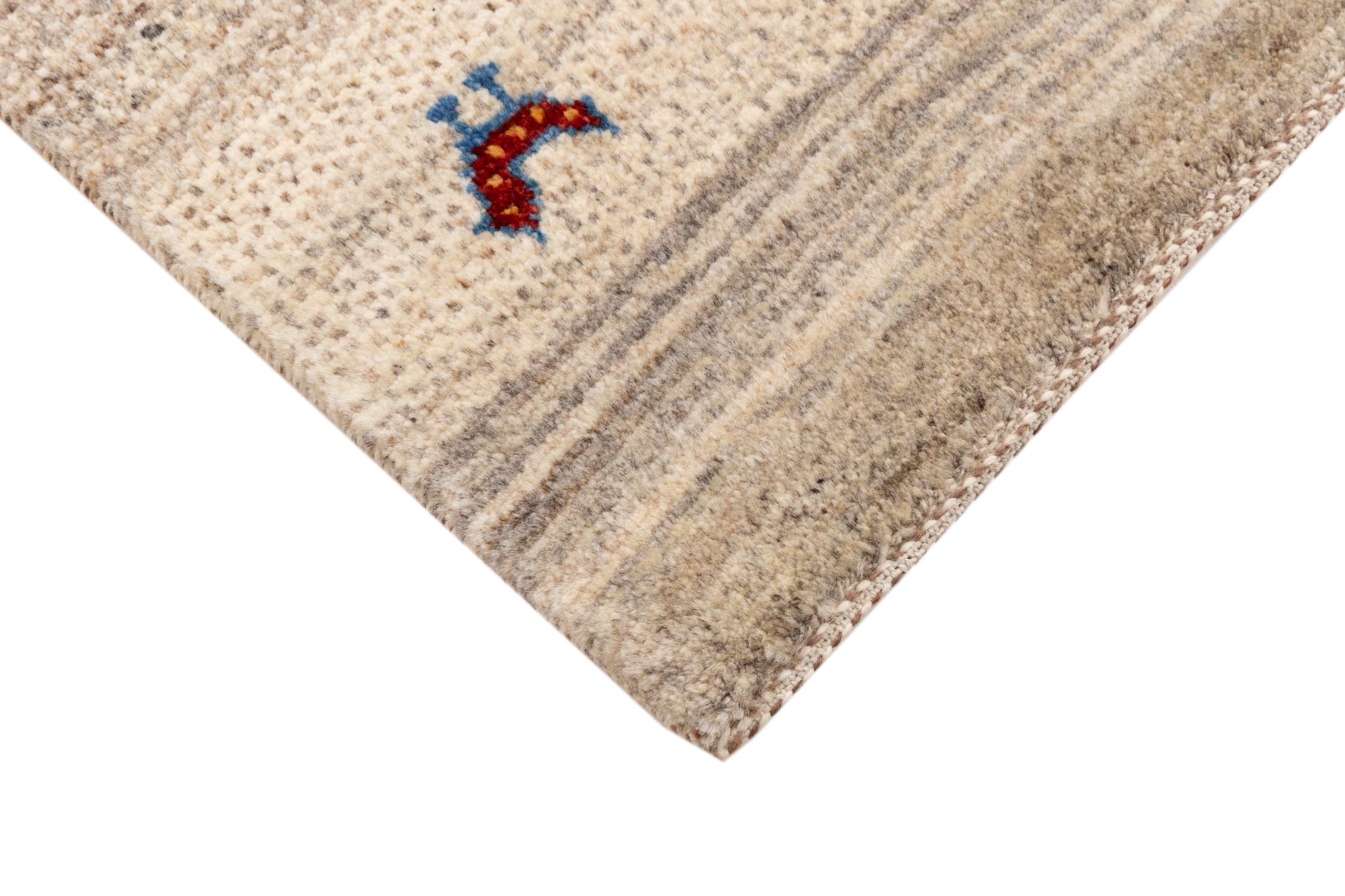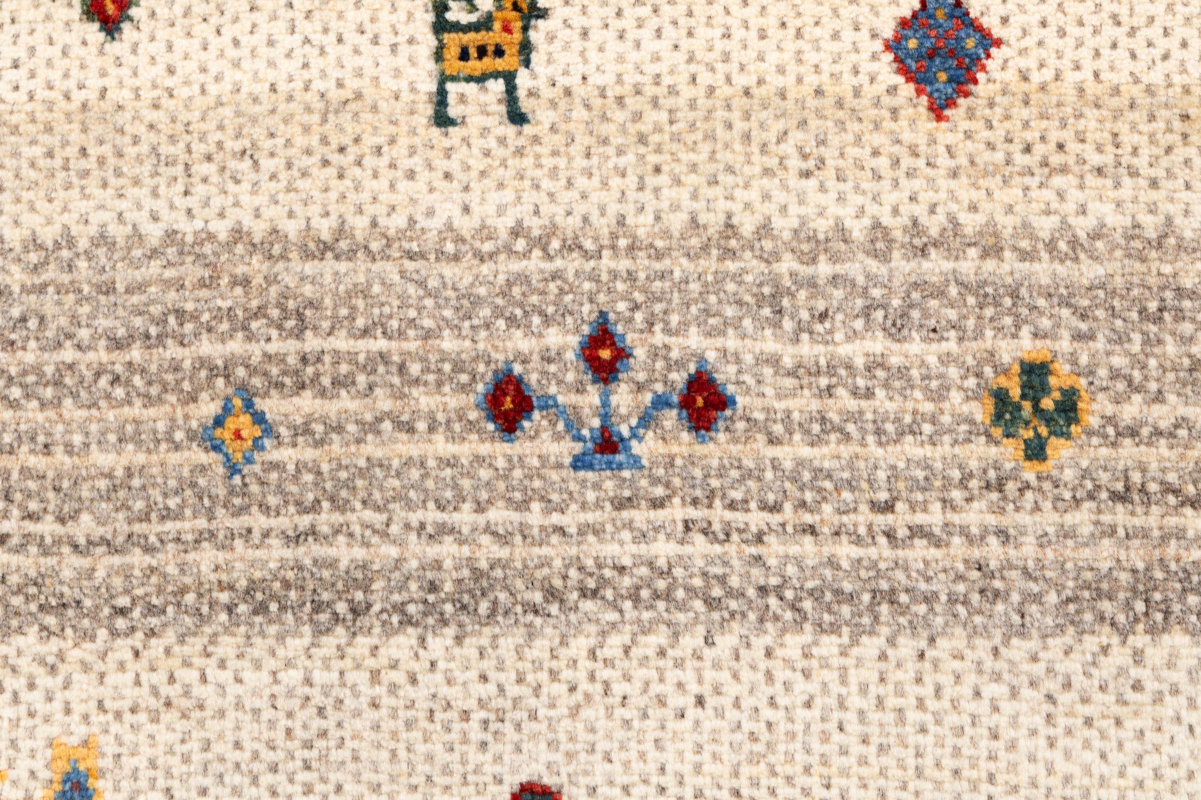 Dette smukke tæppe er en persisk Gabbeh og er en af ​​de højeste kvalitet Gabbeh tæpper. Tæpper er knyttet af nomader eller semi-nomader i Iran ved hjælp af traditionelt håndværk. De enkle motiver og mønstre er for det meste inspireret af nomadernes umiddelbare omgivelser. F.eks. Kan kameler, træer eller buske findes på traditionelle tæpper. Persiske Gabbeh-tæpper er lavet af uld fra lokale fårbesætninger. Ulden er derfor for det meste spundet for hånd. Hver af disse orientalske tæpper udgør en unik karakter af århundreder gammel kultur.