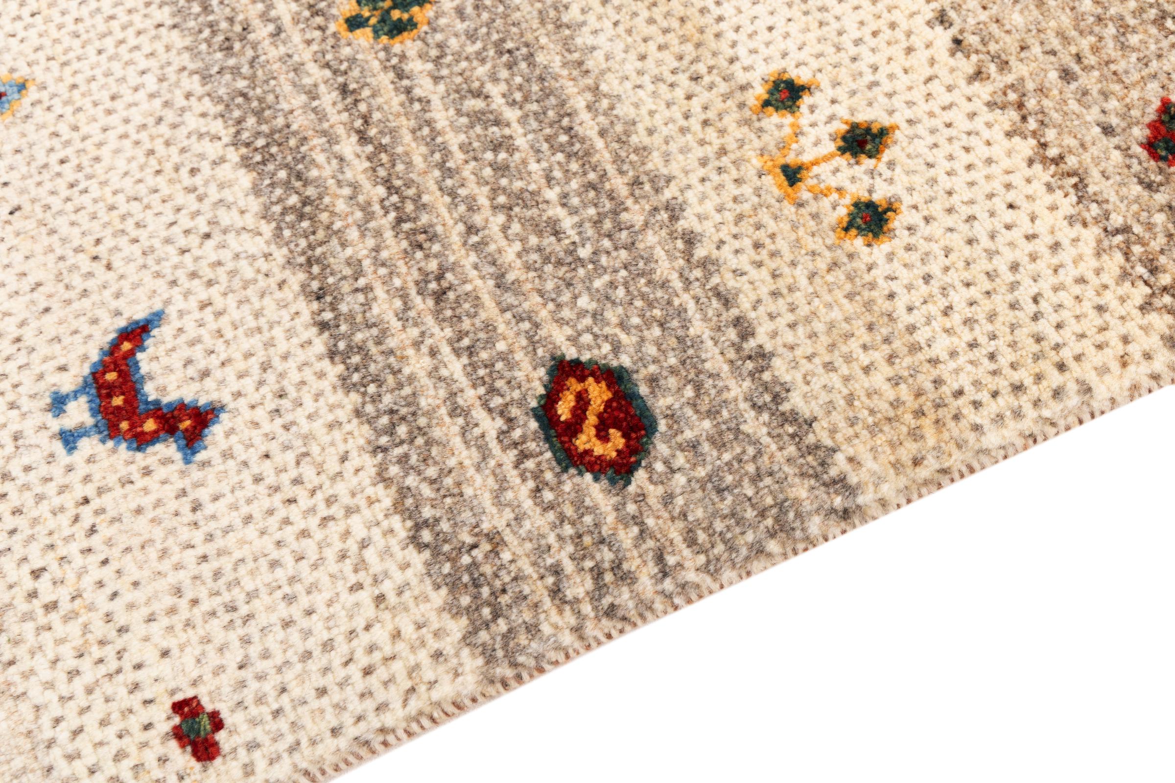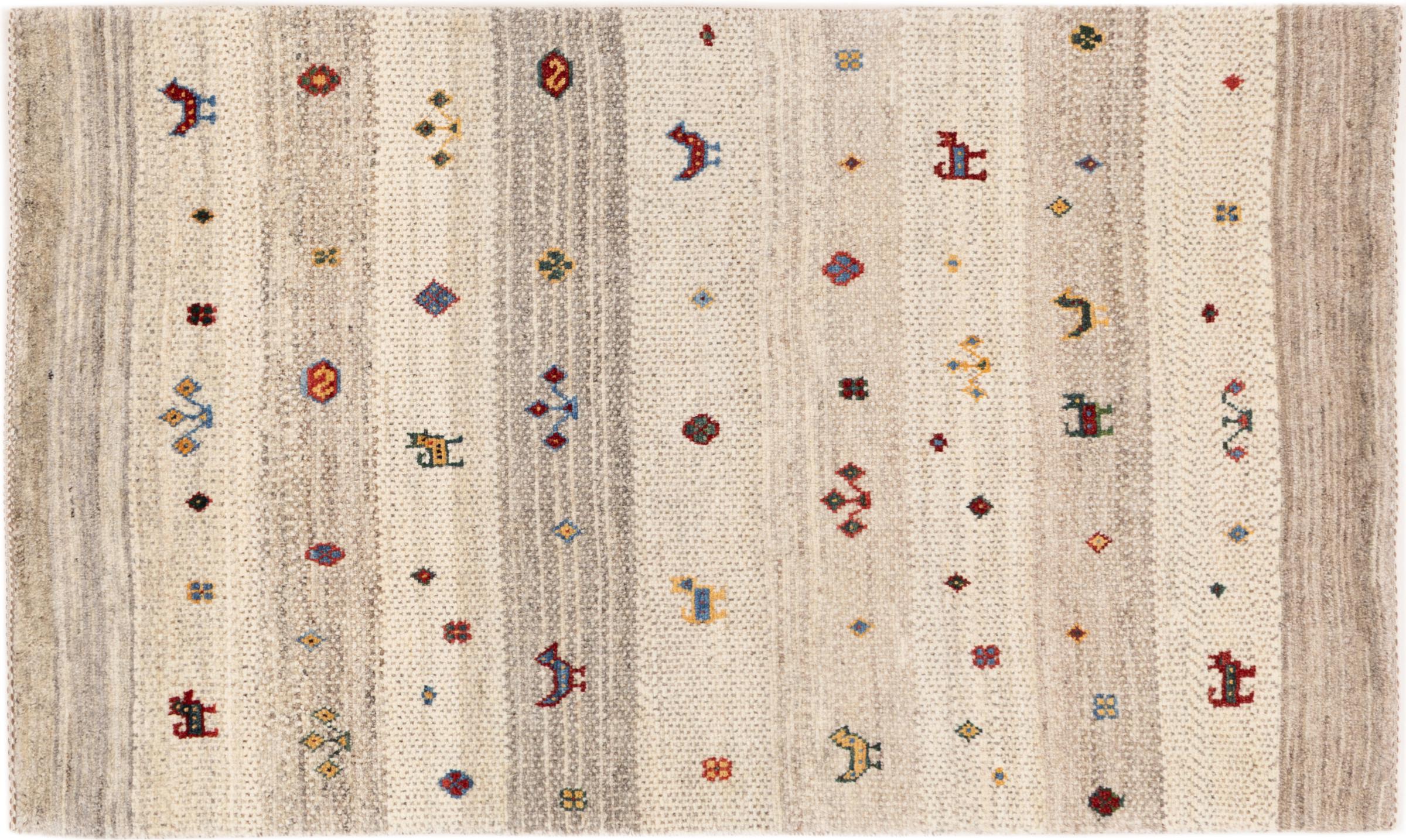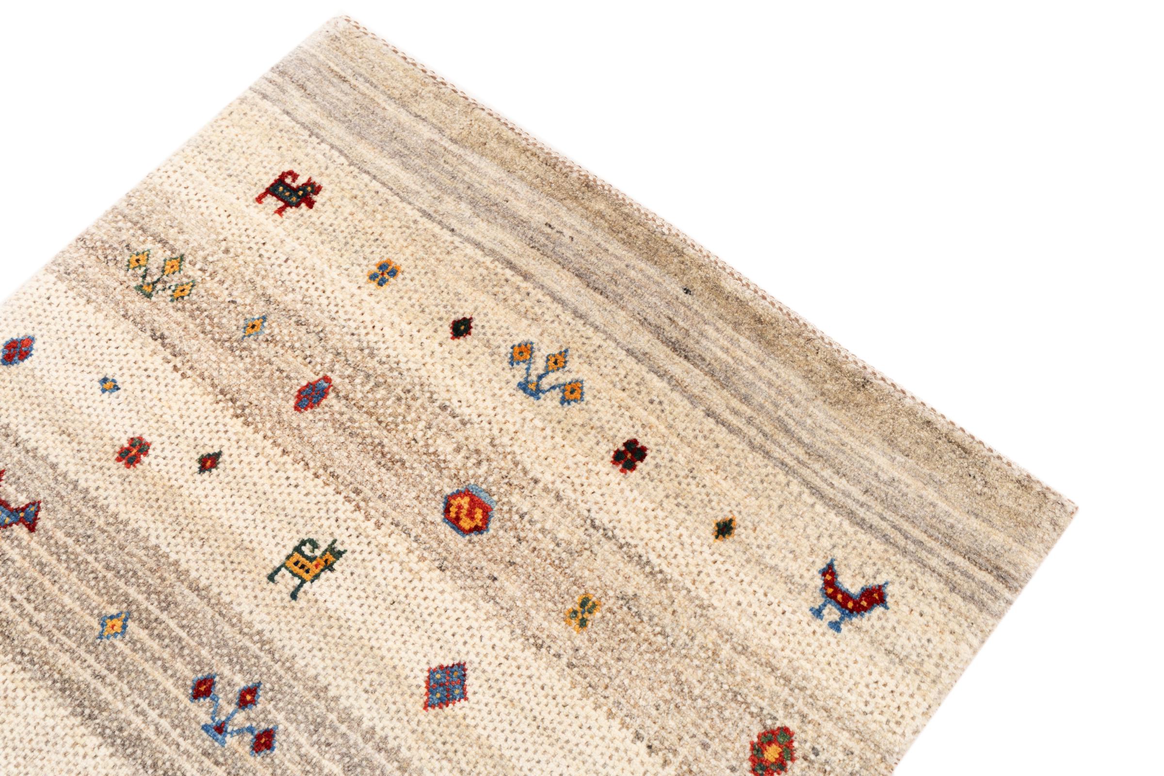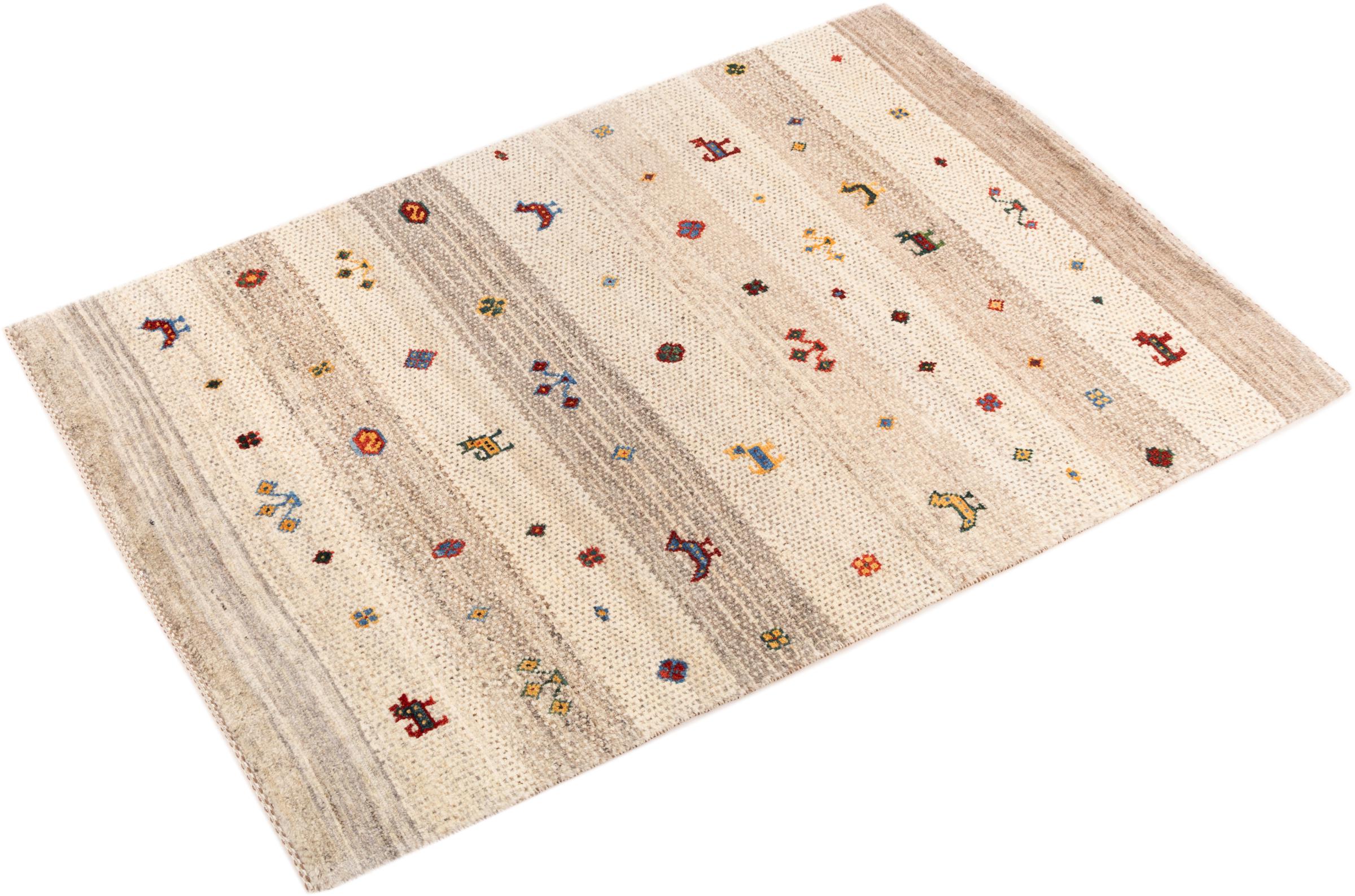 Dette smukke tæppe er en persisk Gabbeh og er en af ​​de højeste kvalitet Gabbeh tæpper. Tæpper er knyttet af nomader eller semi-nomader i Iran ved hjælp af traditionelt håndværk. De enkle motiver og mønstre er for det meste inspireret af nomadernes umiddelbare omgivelser. F.eks. Kan kameler, træer eller buske findes på traditionelle tæpper. Persiske Gabbeh-tæpper er lavet af uld fra lokale fårbesætninger. Ulden er derfor for det meste spundet for hånd. Hver af disse orientalske tæpper udgør en unik karakter af århundreder gammel kultur.