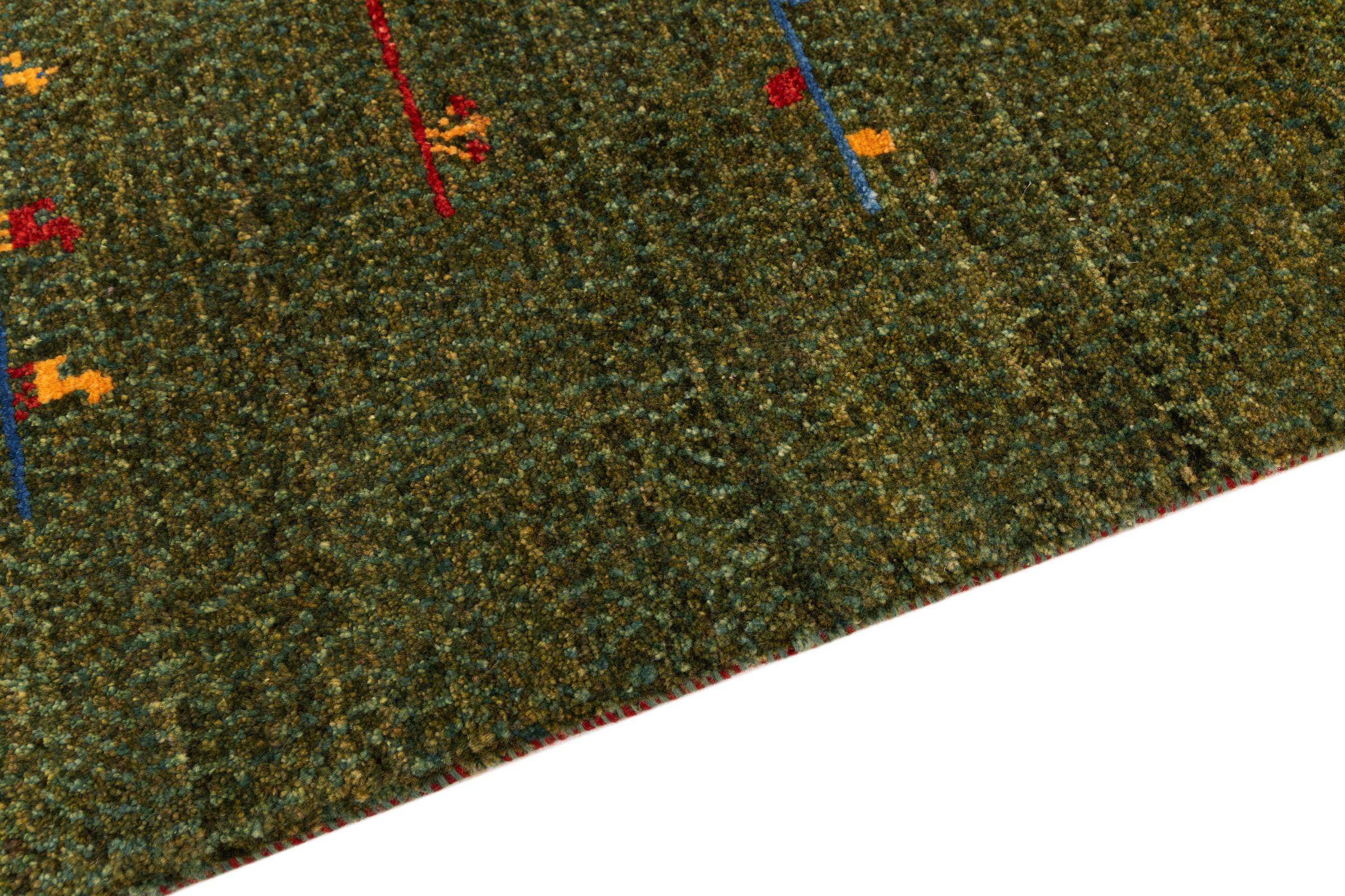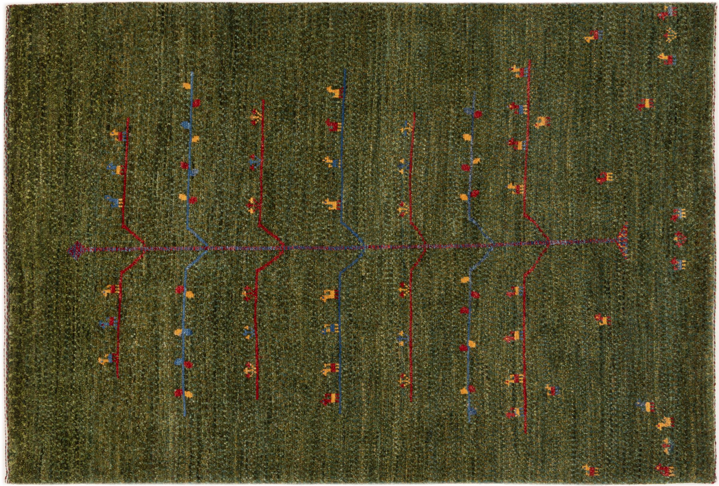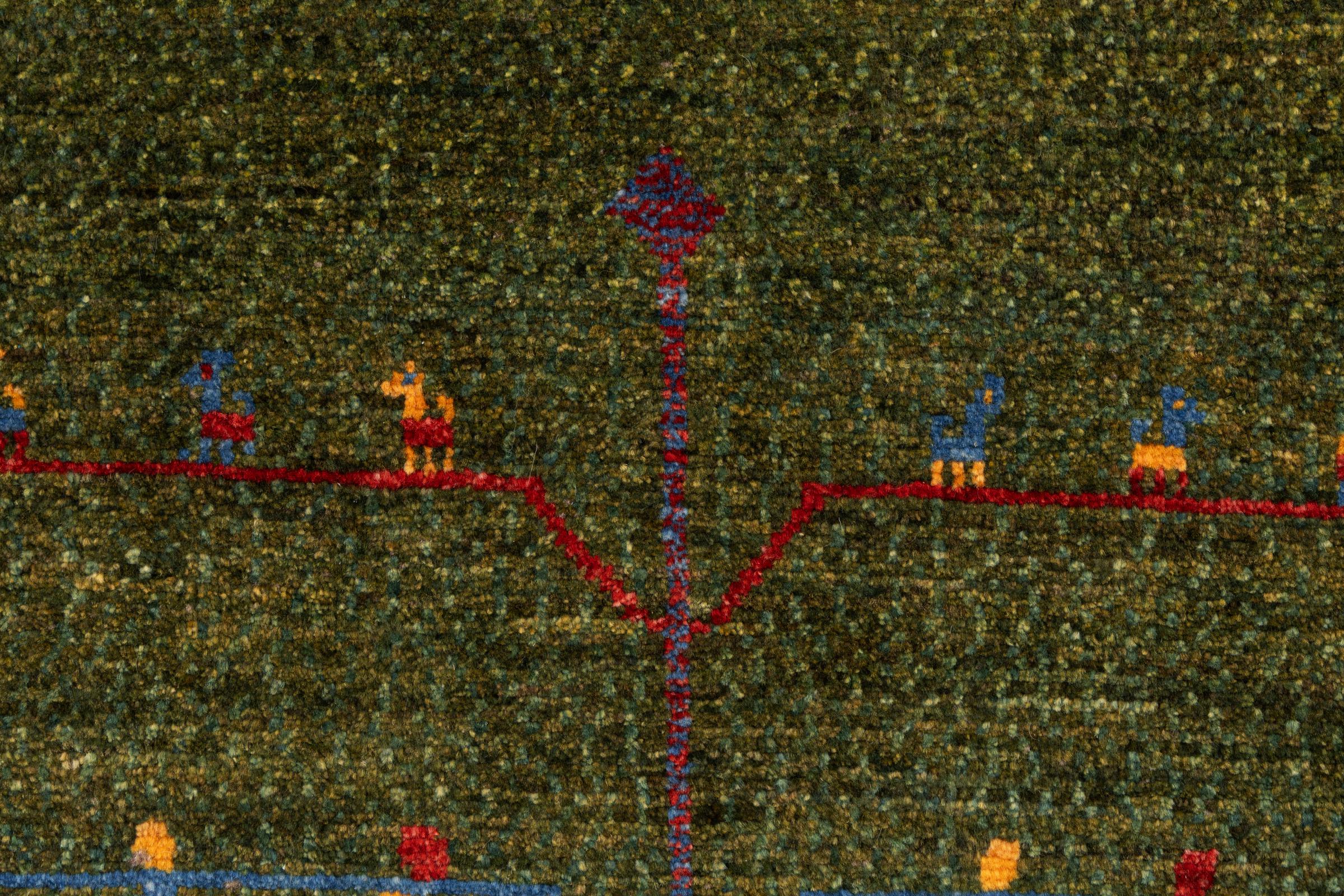 Dette smukke tæppe er en persisk Gabbeh og er en af ​​de højeste kvalitet Gabbeh tæpper. Tæpper er knyttet af nomader eller semi-nomader i Iran ved hjælp af traditionelt håndværk. De enkle motiver og mønstre er for det meste inspireret af nomadernes umiddelbare omgivelser. F.eks. Kan kameler, træer eller buske findes på traditionelle tæpper. Persiske Gabbeh-tæpper er lavet af uld fra lokale fårbesætninger. Ulden er derfor for det meste spundet for hånd. Hver af disse orientalske tæpper udgør en unik karakter af århundreder gammel kultur.