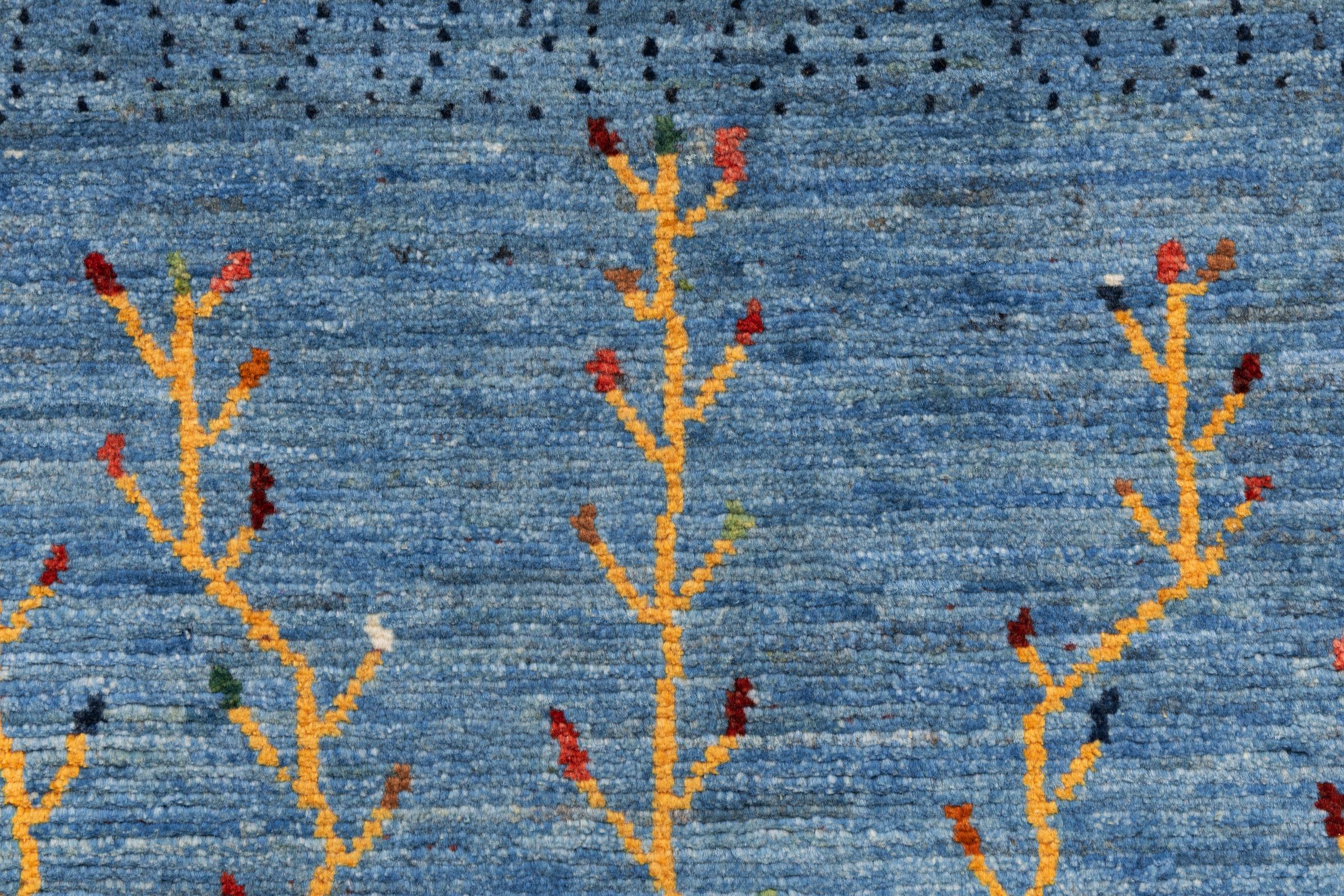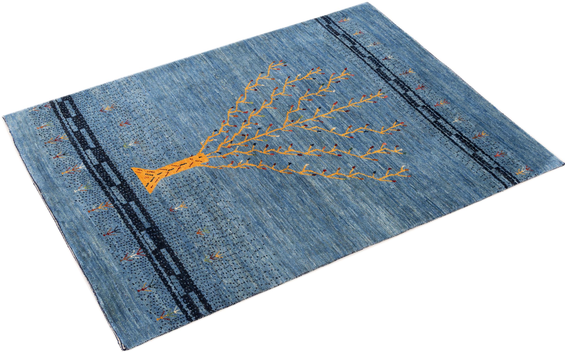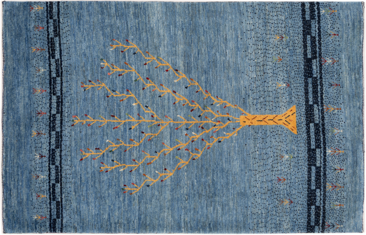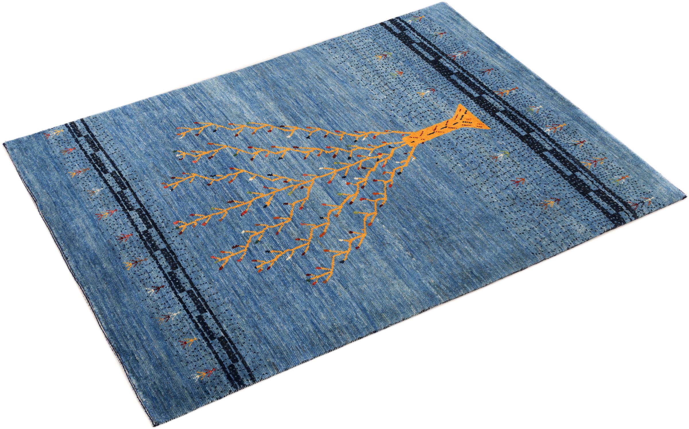 Dette smukke tæppe er en persisk Gabbeh og er en af ​​de højeste kvalitet Gabbeh tæpper. Tæpper er knyttet af nomader eller semi-nomader i Iran ved hjælp af traditionelt håndværk. De enkle motiver og mønstre er for det meste inspireret af nomadernes umiddelbare omgivelser. F.eks. Kan kameler, træer eller buske findes på traditionelle tæpper. Persiske Gabbeh-tæpper er lavet af uld fra lokale fårbesætninger. Ulden er derfor for det meste spundet for hånd. Hver af disse orientalske tæpper udgør en unik karakter af århundreder gammel kultur.