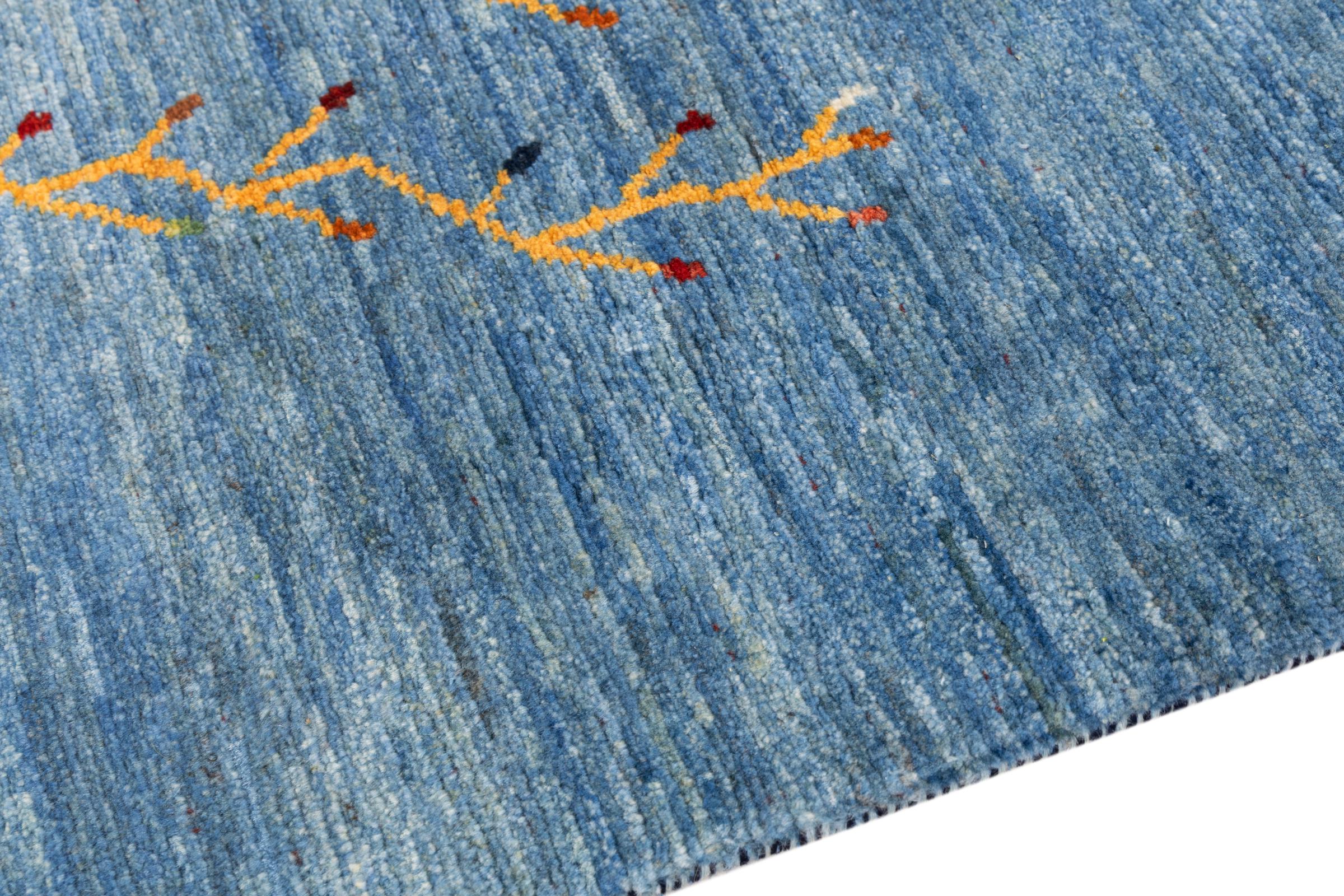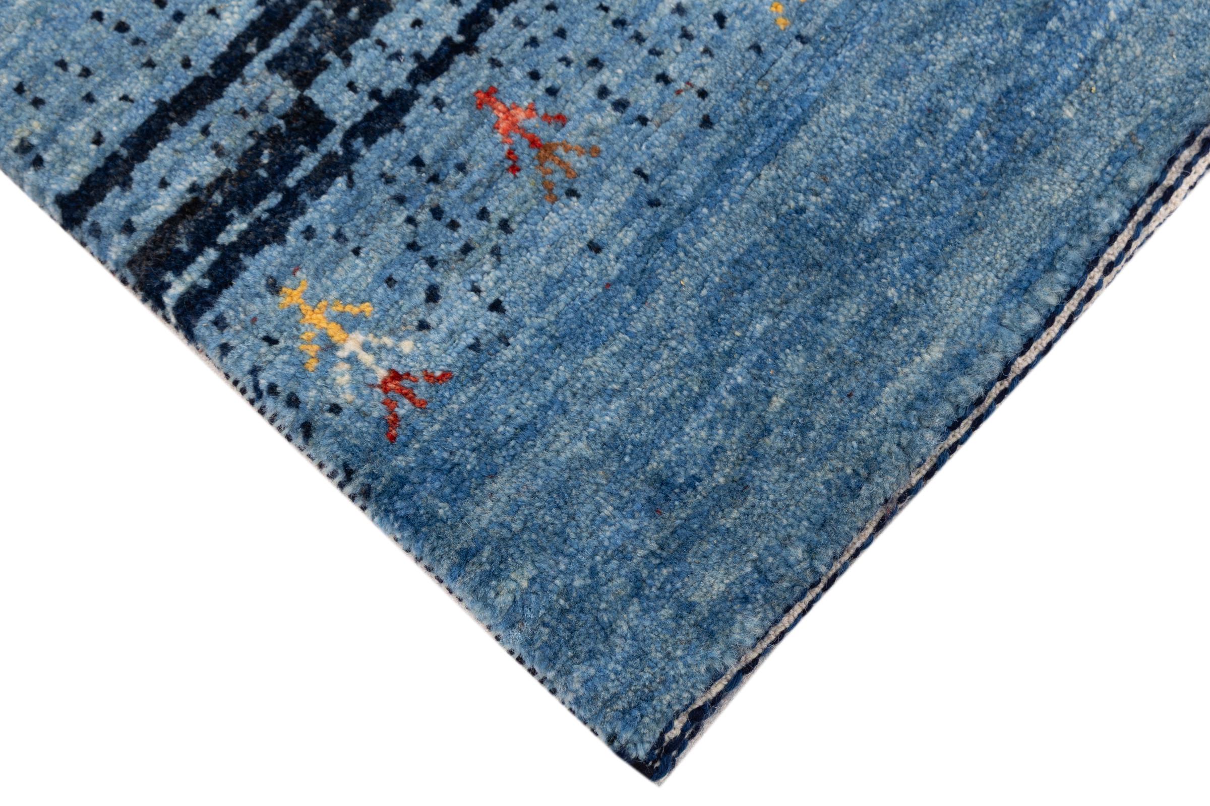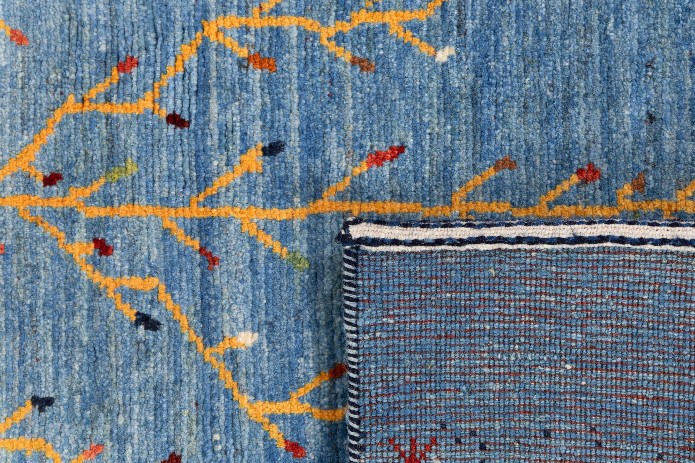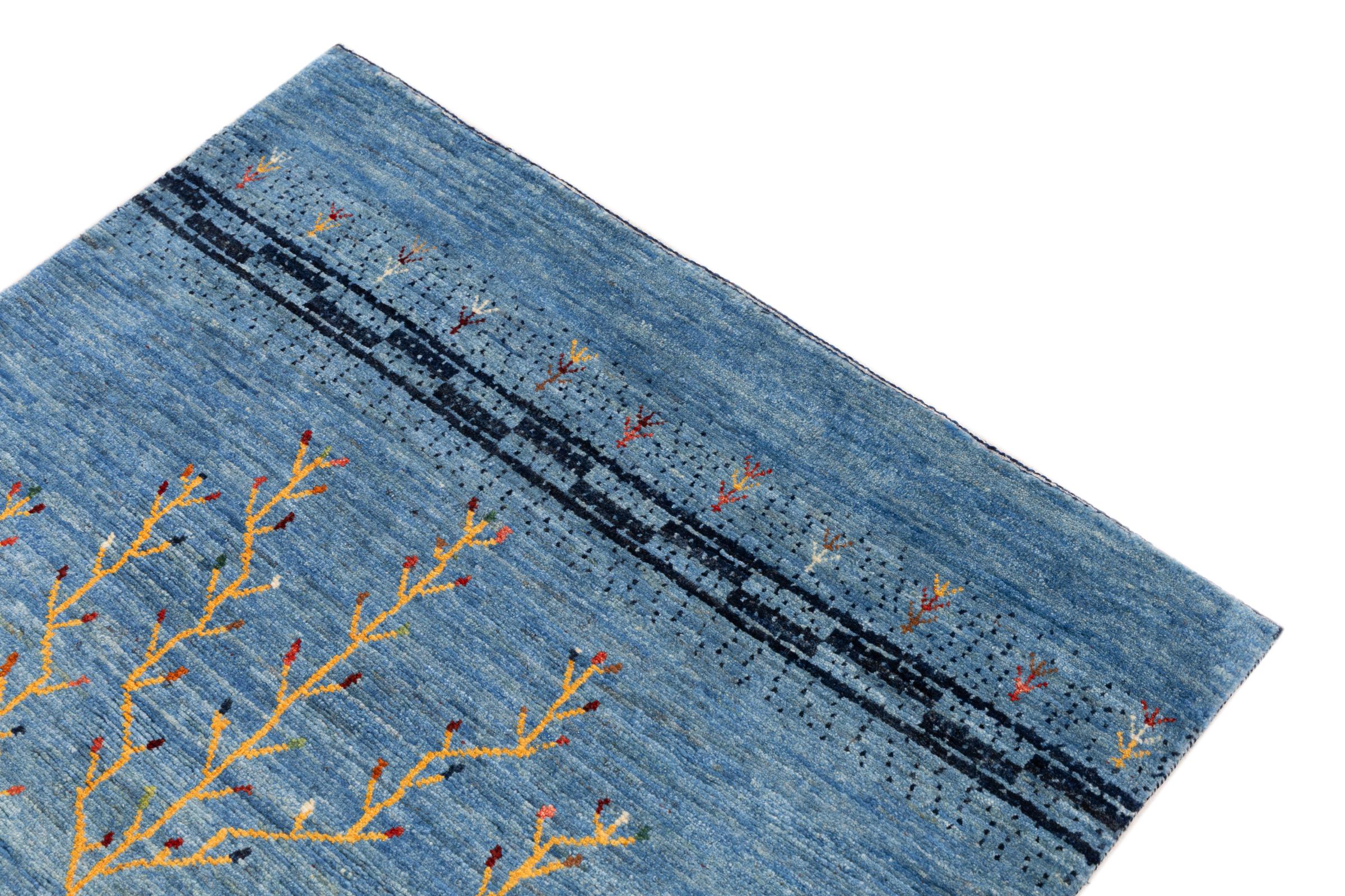 Dette smukke tæppe er en persisk Gabbeh og er en af ​​de højeste kvalitet Gabbeh tæpper. Tæpper er knyttet af nomader eller semi-nomader i Iran ved hjælp af traditionelt håndværk. De enkle motiver og mønstre er for det meste inspireret af nomadernes umiddelbare omgivelser. F.eks. Kan kameler, træer eller buske findes på traditionelle tæpper. Persiske Gabbeh-tæpper er lavet af uld fra lokale fårbesætninger. Ulden er derfor for det meste spundet for hånd. Hver af disse orientalske tæpper udgør en unik karakter af århundreder gammel kultur.