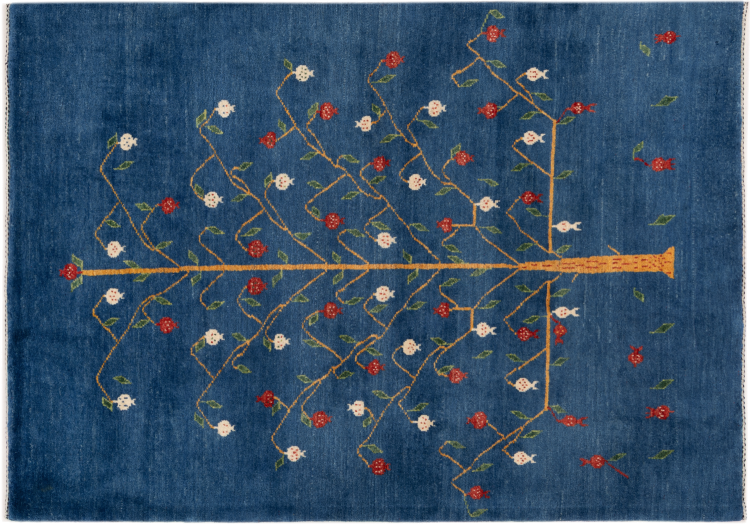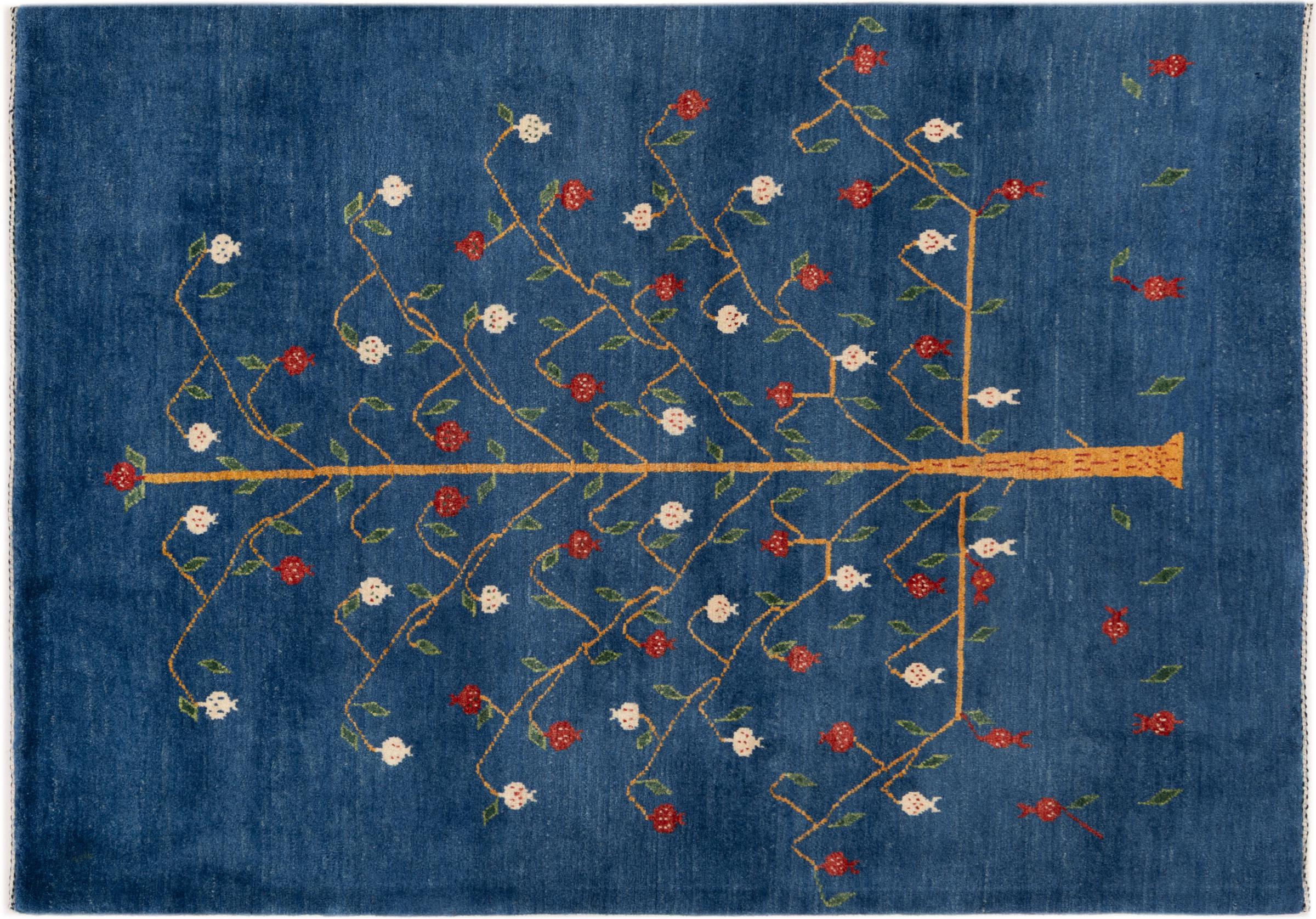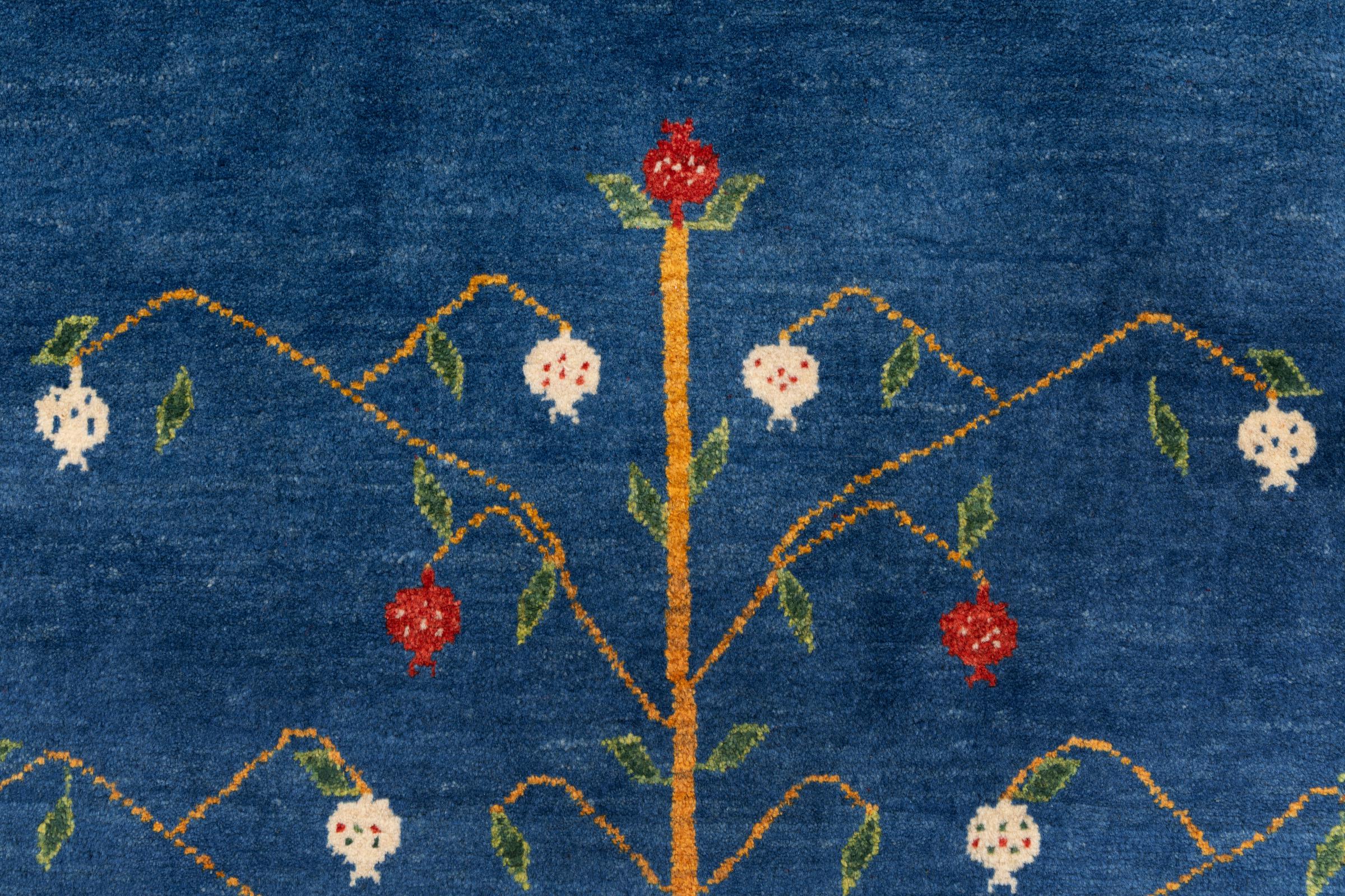 Dette smukke tæppe er en persisk Gabbeh og er en af ​​de højeste kvalitet Gabbeh tæpper. Tæpper er knyttet af nomader eller semi-nomader i Iran ved hjælp af traditionelt håndværk. De enkle motiver og mønstre er for det meste inspireret af nomadernes umiddelbare omgivelser. F.eks. Kan kameler, træer eller buske findes på traditionelle tæpper. Persiske Gabbeh-tæpper er lavet af uld fra lokale fårbesætninger. Ulden er derfor for det meste spundet for hånd. Hver af disse orientalske tæpper udgør en unik karakter af århundreder gammel kultur.