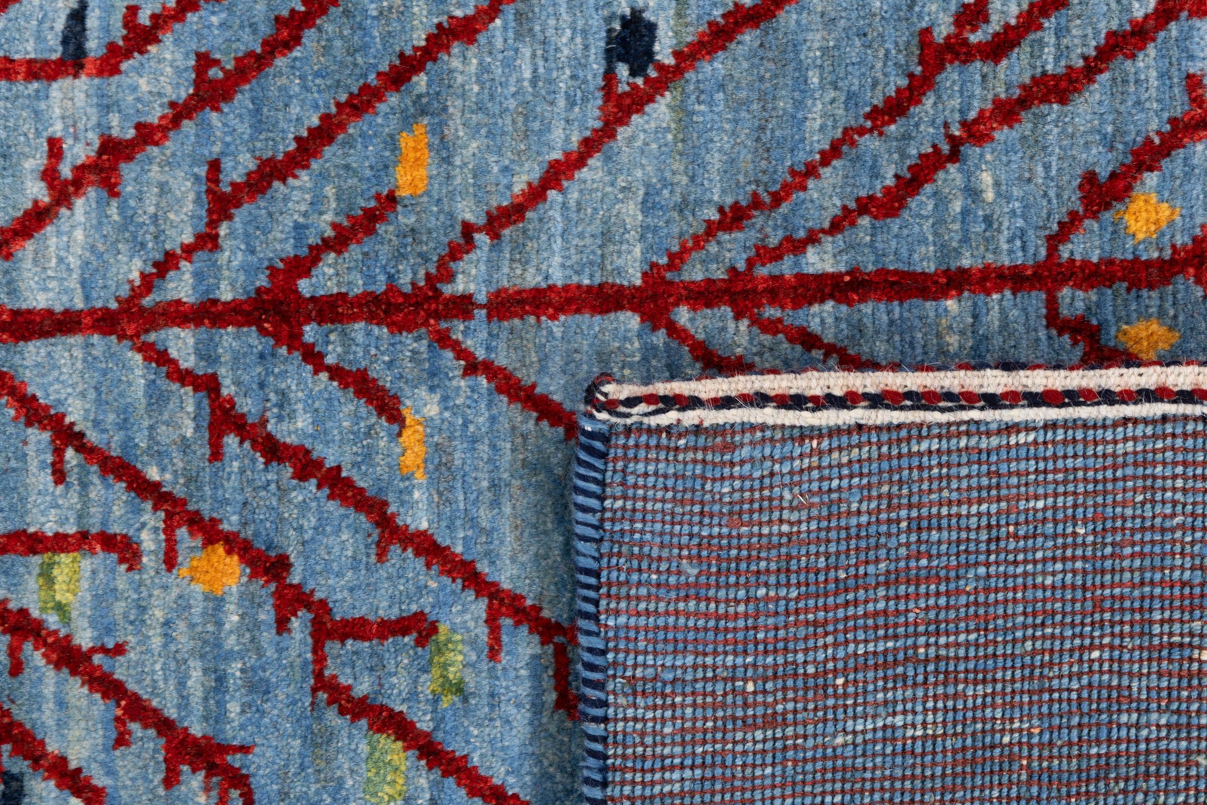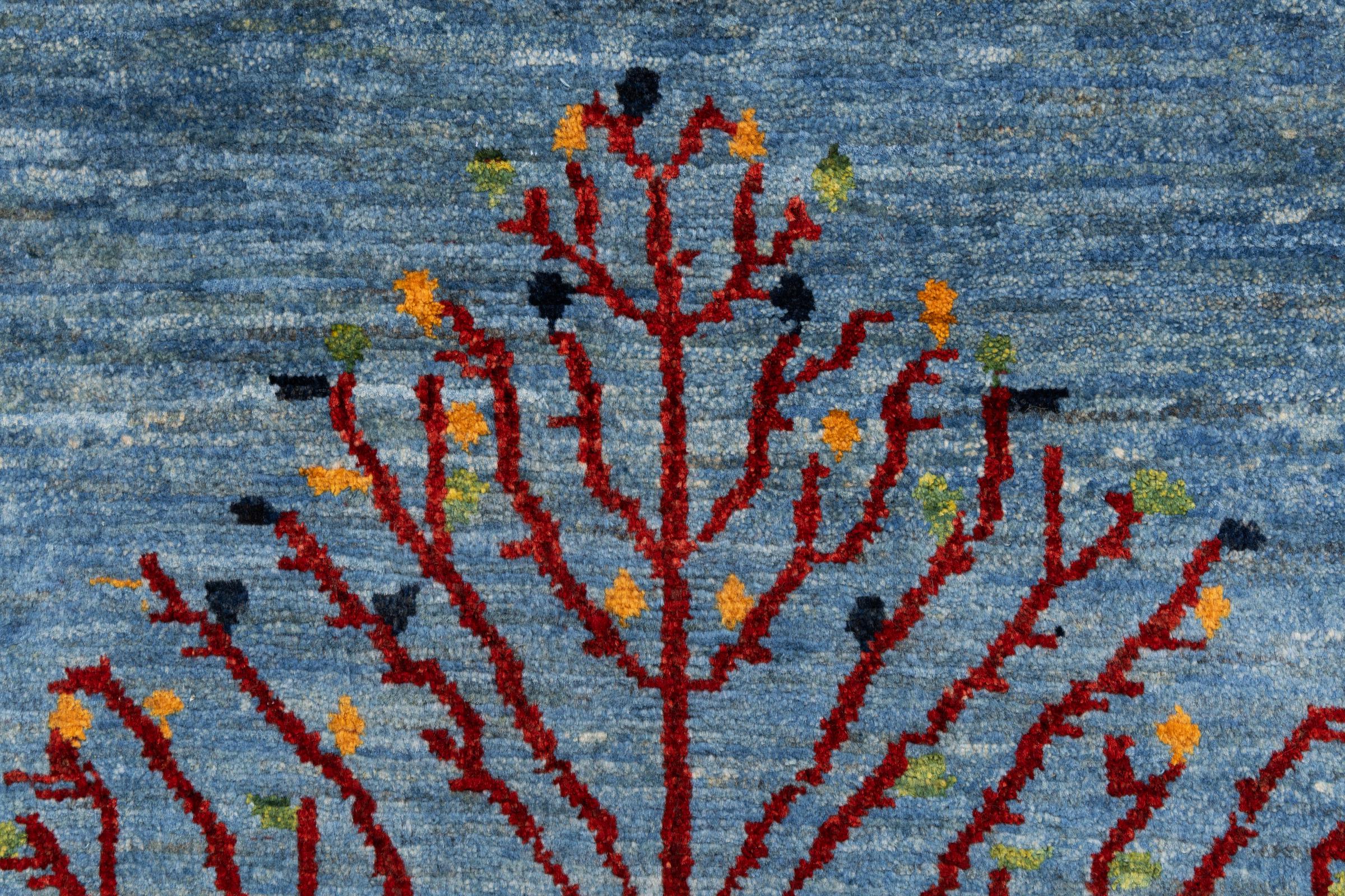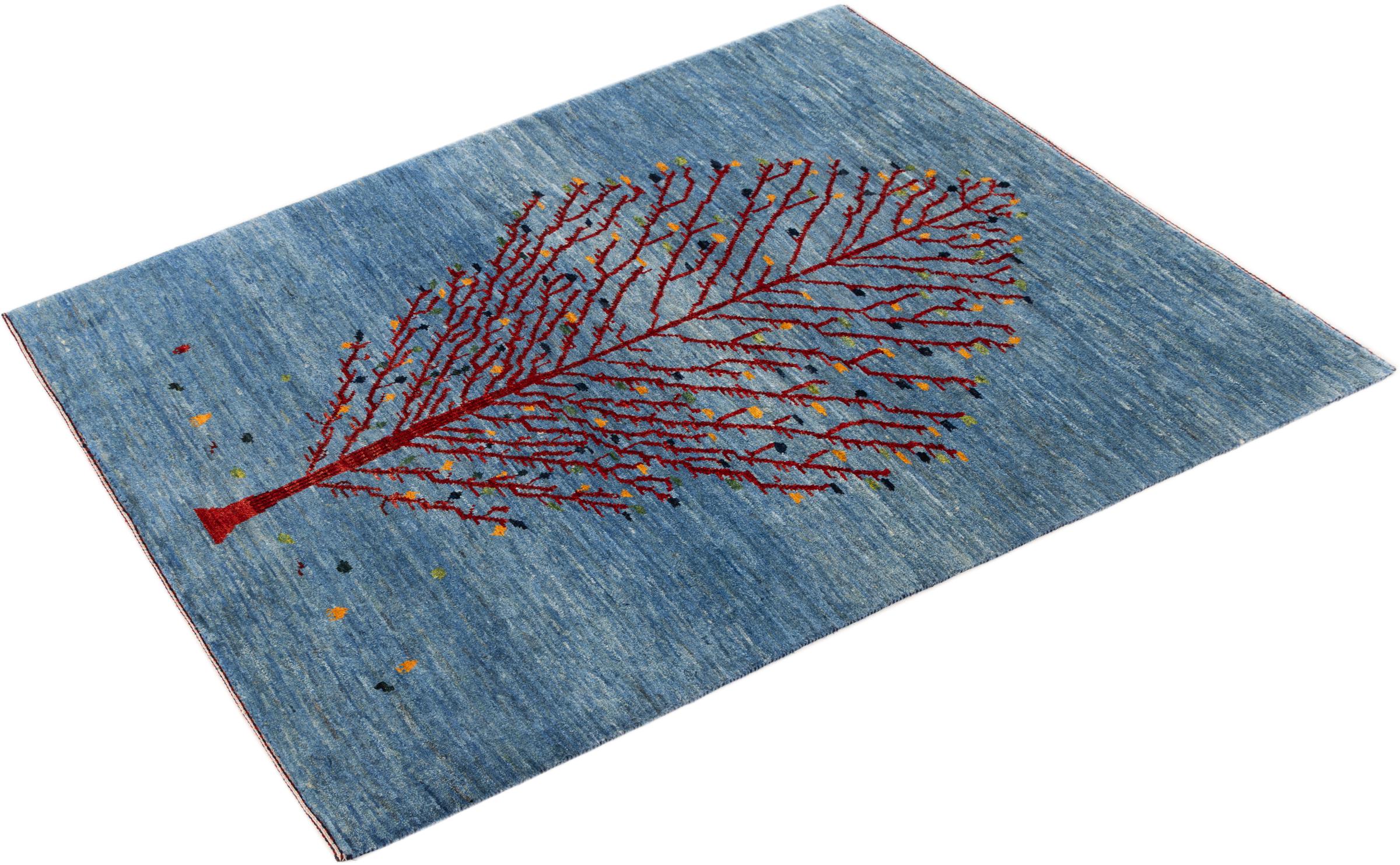 Dette smukke tæppe er en persisk Gabbeh og er en af ​​de højeste kvalitet Gabbeh tæpper. Tæpper er knyttet af nomader eller semi-nomader i Iran ved hjælp af traditionelt håndværk. De enkle motiver og mønstre er for det meste inspireret af nomadernes umiddelbare omgivelser. F.eks. Kan kameler, træer eller buske findes på traditionelle tæpper. Persiske Gabbeh-tæpper er lavet af uld fra lokale fårbesætninger. Ulden er derfor for det meste spundet for hånd. Hver af disse orientalske tæpper udgør en unik karakter af århundreder gammel kultur.