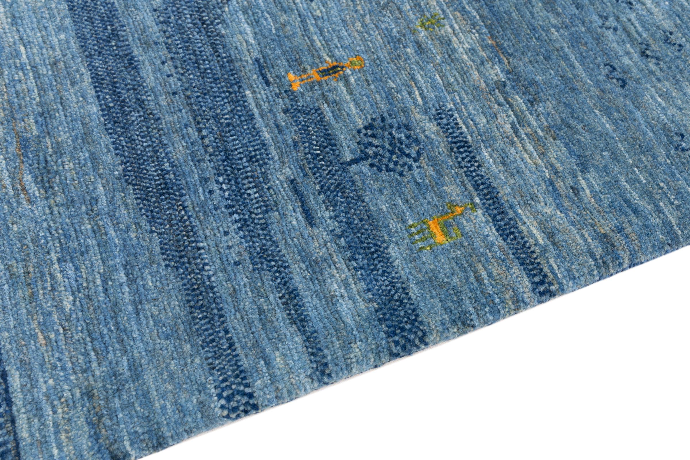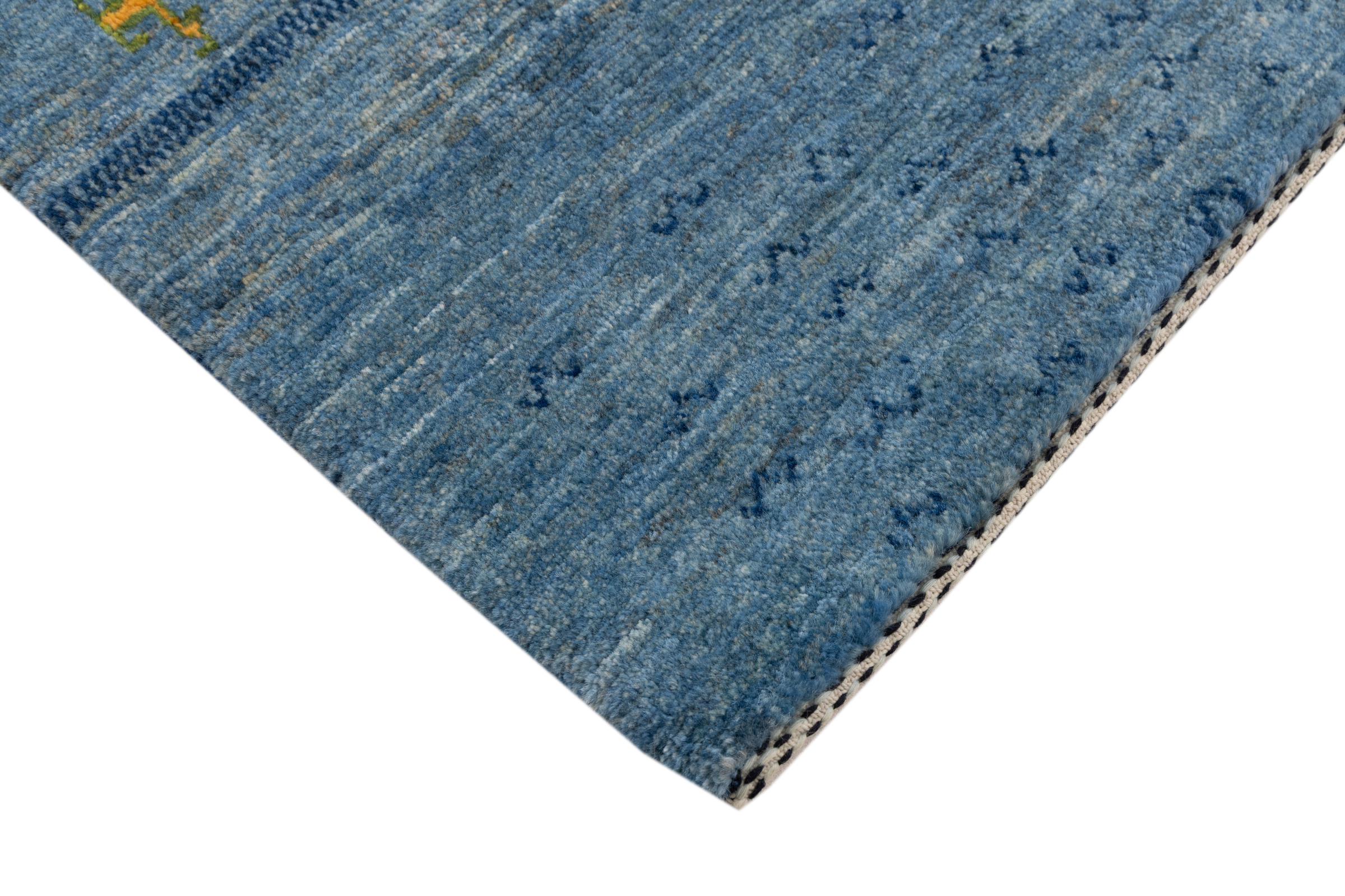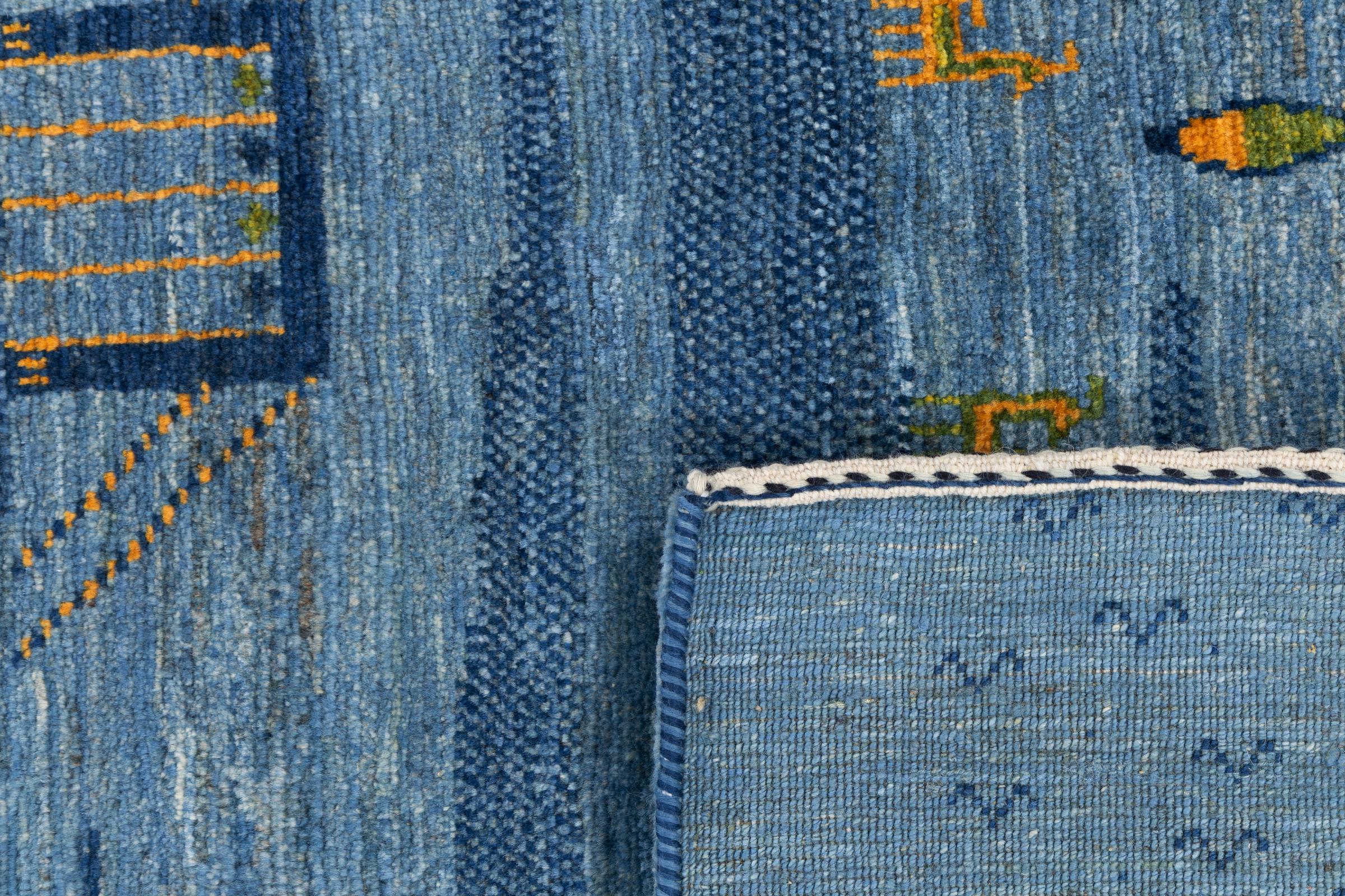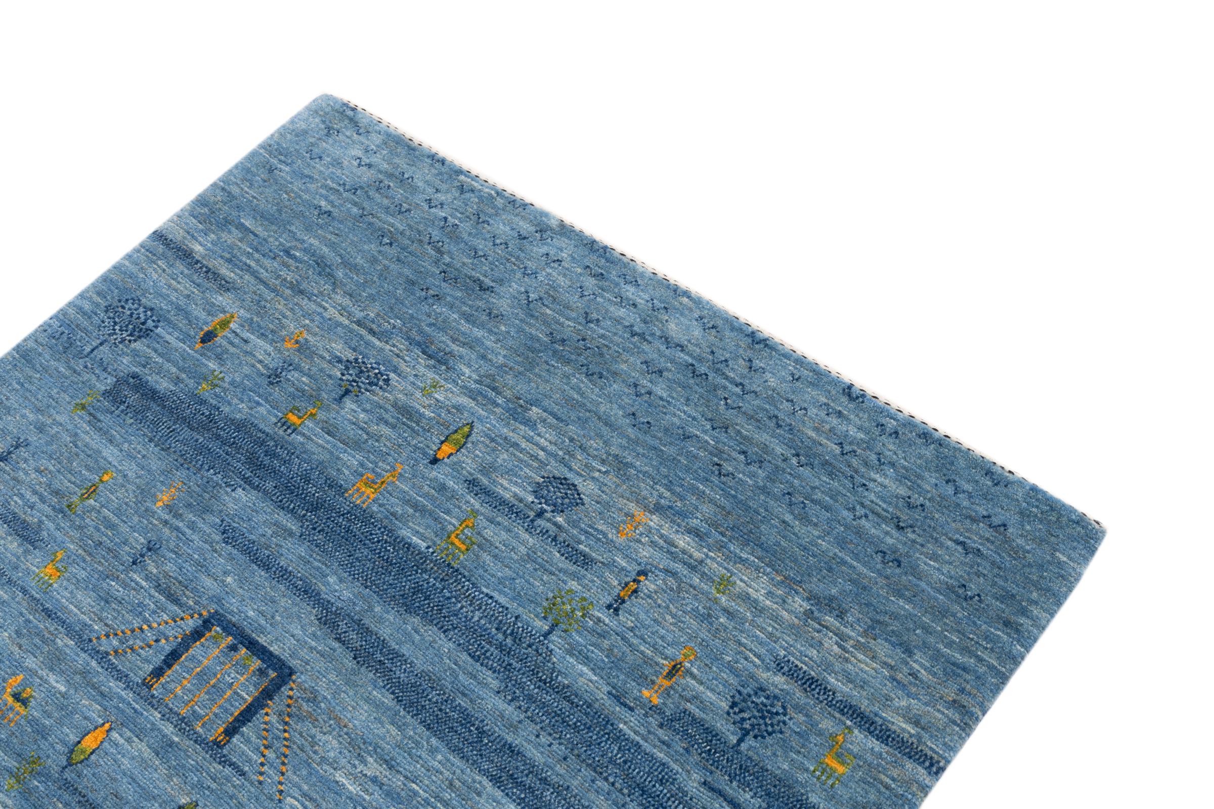 Dette smukke tæppe er en persisk Gabbeh og er en af ​​de højeste kvalitet Gabbeh tæpper. Tæpper er knyttet af nomader eller semi-nomader i Iran ved hjælp af traditionelt håndværk. De enkle motiver og mønstre er for det meste inspireret af nomadernes umiddelbare omgivelser. F.eks. Kan kameler, træer eller buske findes på traditionelle tæpper. Persiske Gabbeh-tæpper er lavet af uld fra lokale fårbesætninger. Ulden er derfor for det meste spundet for hånd. Hver af disse orientalske tæpper udgør en unik karakter af århundreder gammel kultur.