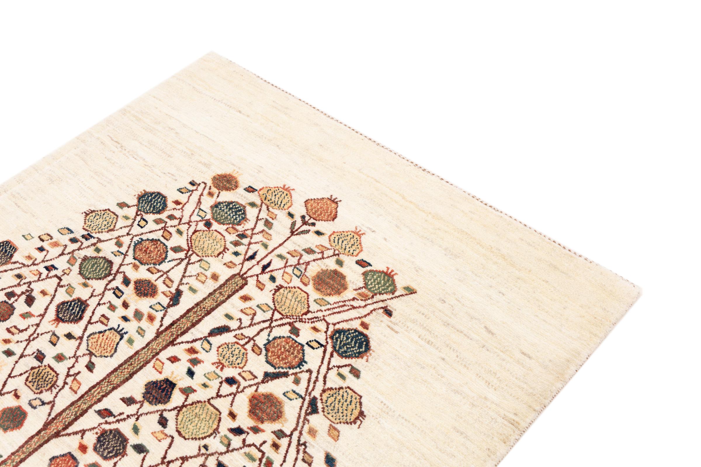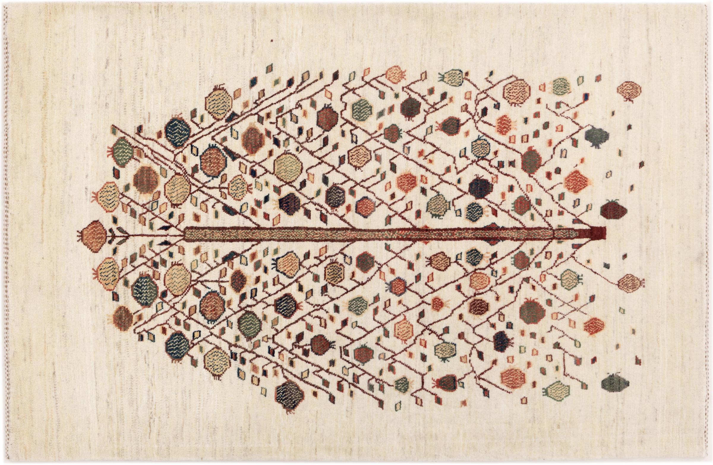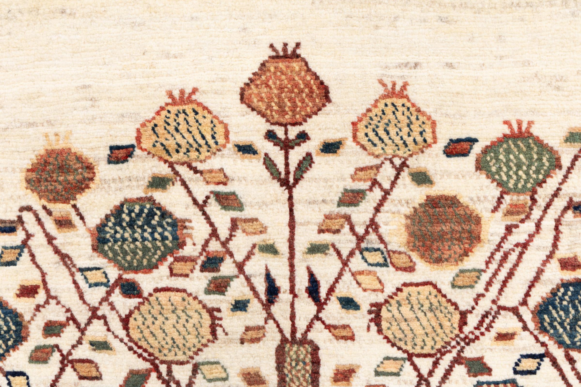 Dette smukke tæppe er en persisk Gabbeh og er en af ​​de højeste kvalitet Gabbeh tæpper. Tæpper er knyttet af nomader eller semi-nomader i Iran ved hjælp af traditionelt håndværk. De enkle motiver og mønstre er for det meste inspireret af nomadernes umiddelbare omgivelser. F.eks. Kan kameler, træer eller buske findes på traditionelle tæpper. Persiske Gabbeh-tæpper er lavet af uld fra lokale fårbesætninger. Ulden er derfor for det meste spundet for hånd. Hver af disse orientalske tæpper udgør en unik karakter af århundreder gammel kultur.
