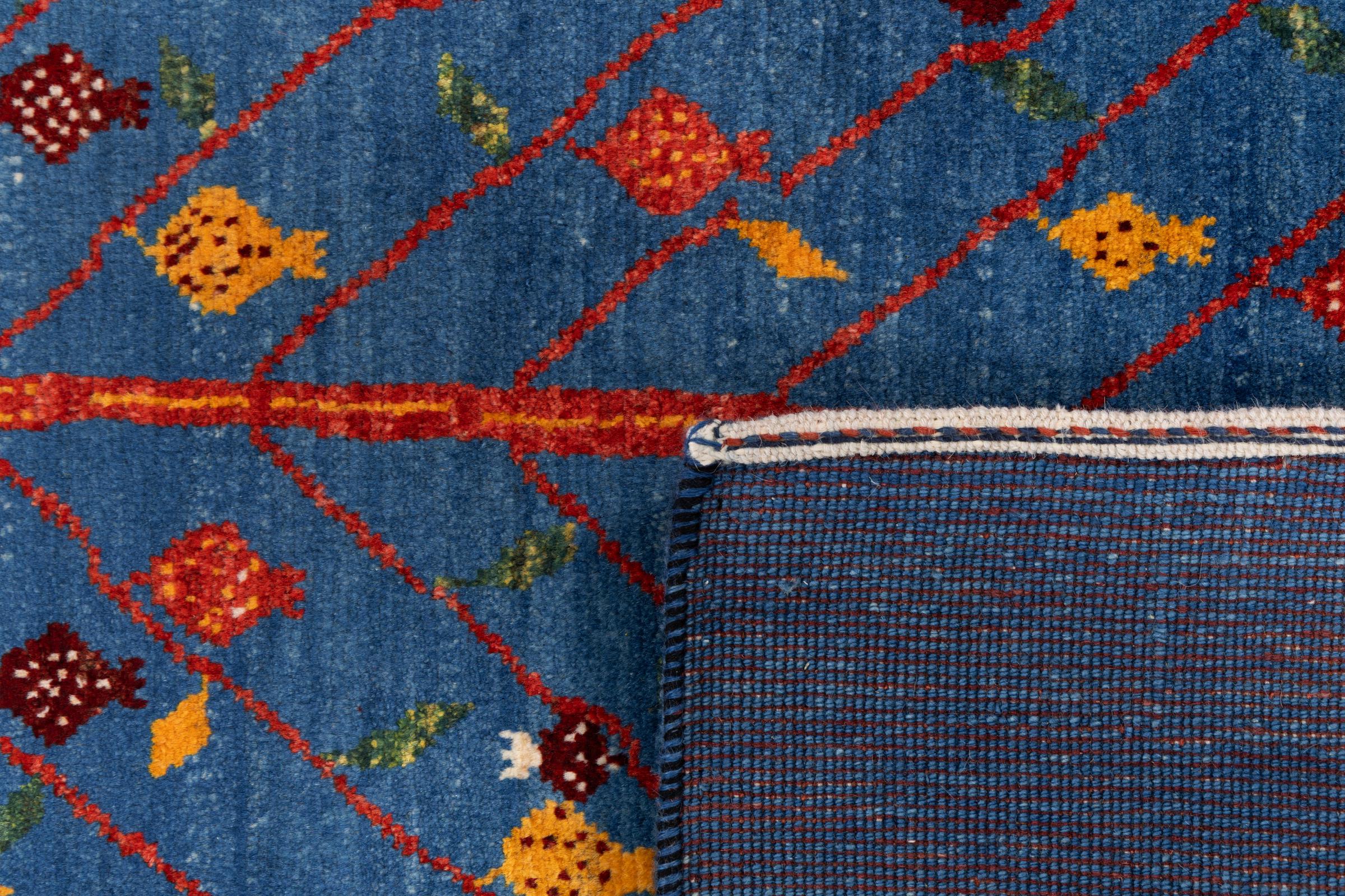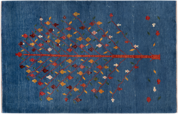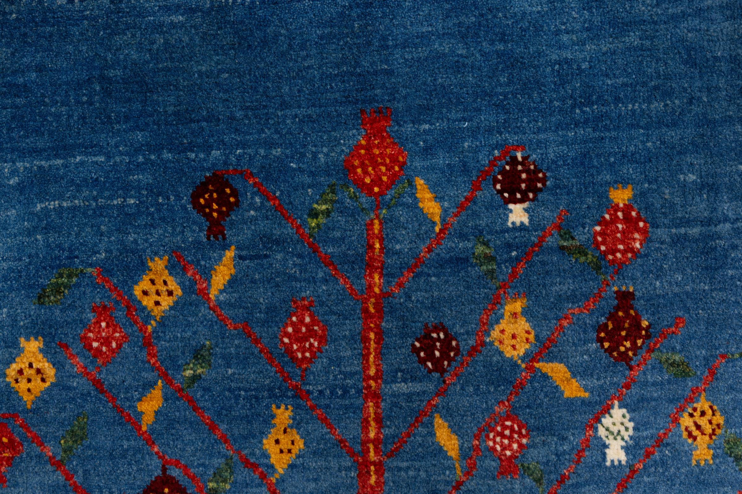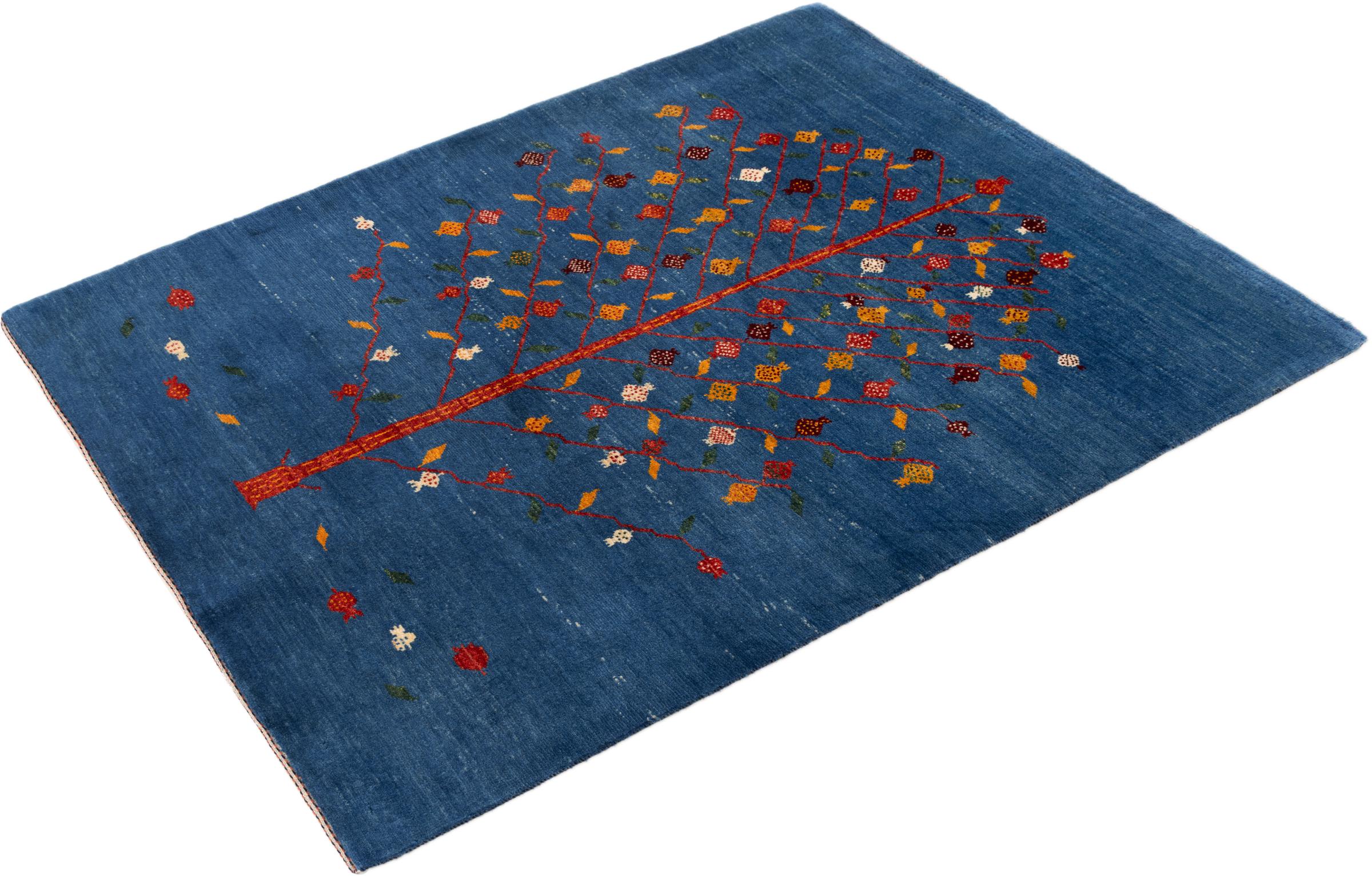 Dette smukke tæppe er en persisk Gabbeh og er en af ​​de højeste kvalitet Gabbeh tæpper. Tæpper er knyttet af nomader eller semi-nomader i Iran ved hjælp af traditionelt håndværk. De enkle motiver og mønstre er for det meste inspireret af nomadernes umiddelbare omgivelser. F.eks. Kan kameler, træer eller buske findes på traditionelle tæpper. Persiske Gabbeh-tæpper er lavet af uld fra lokale fårbesætninger. Ulden er derfor for det meste spundet for hånd. Hver af disse orientalske tæpper udgør en unik karakter af århundreder gammel kultur.