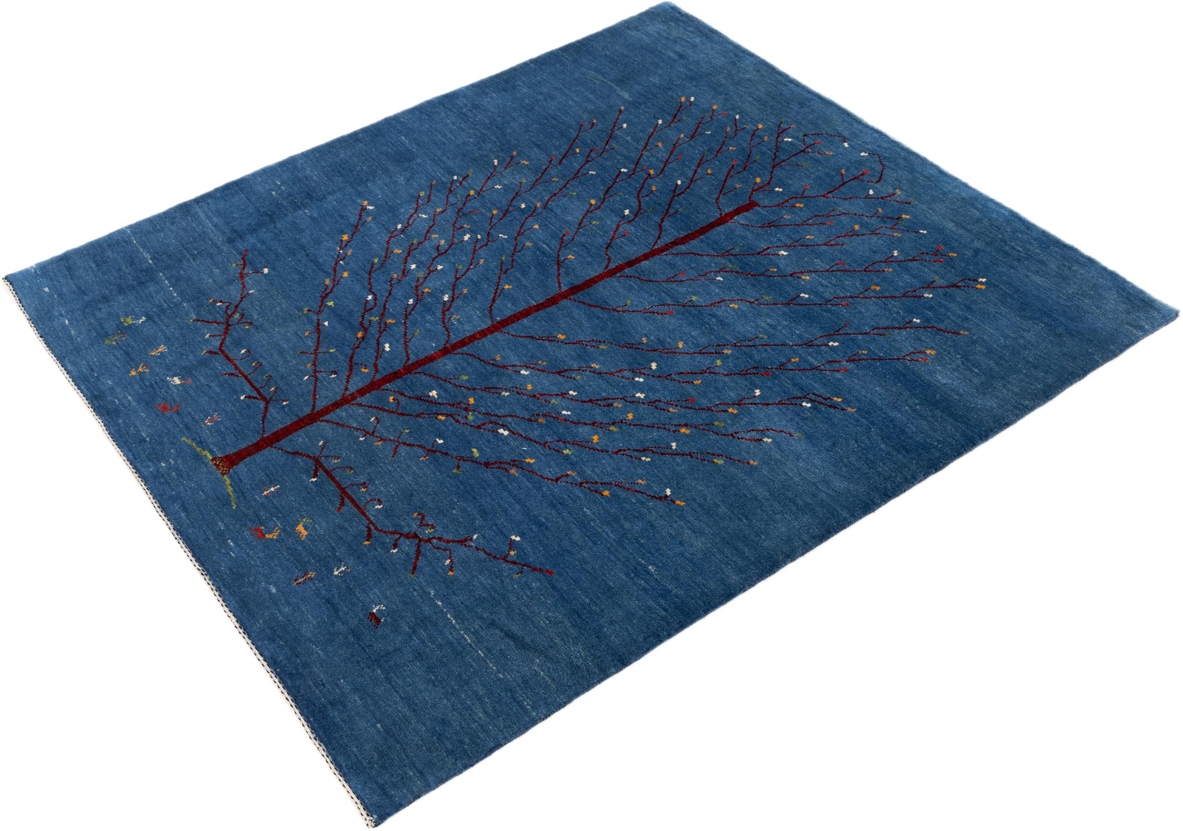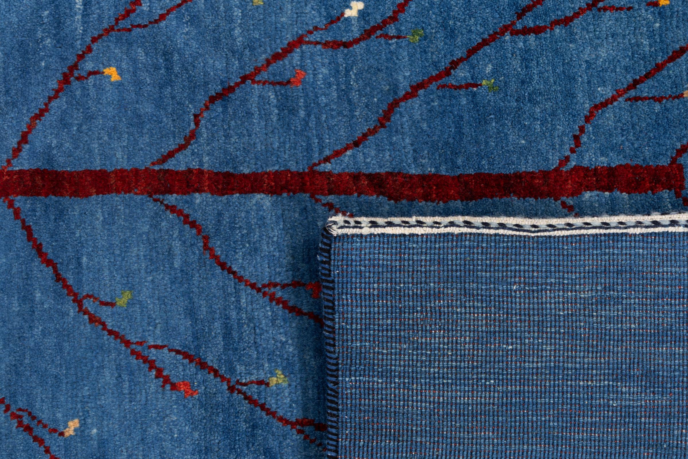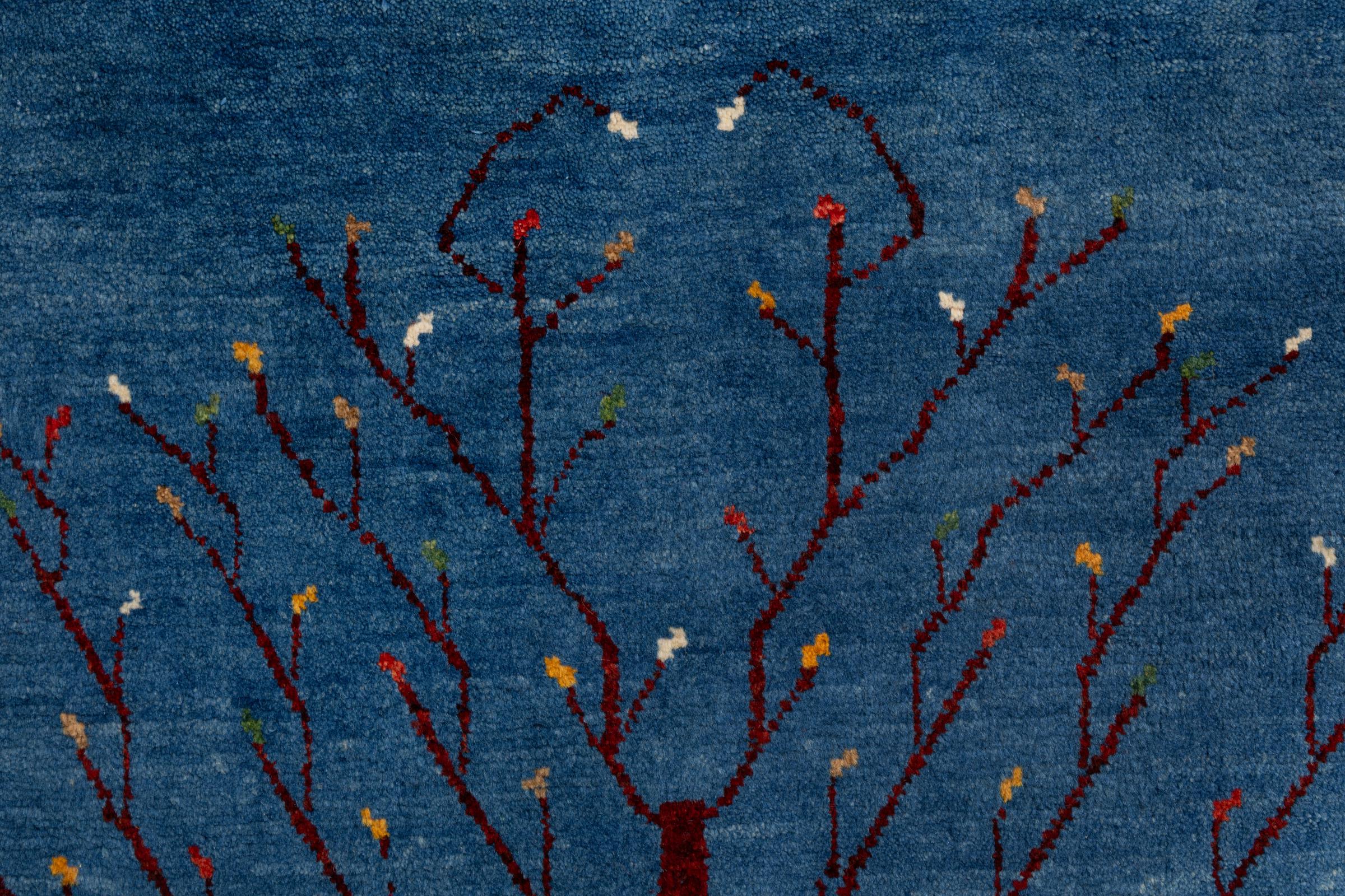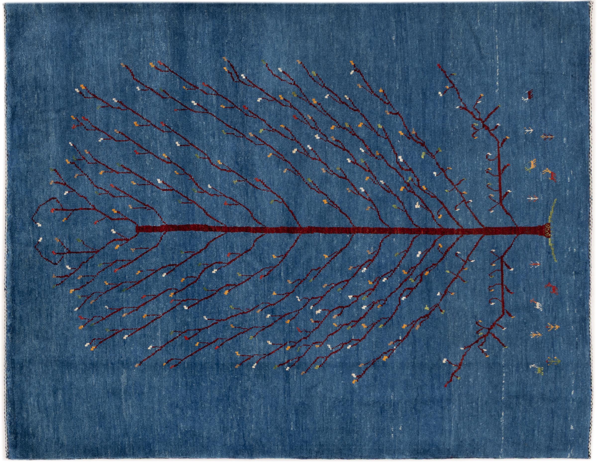 Dette smukke tæppe er en persisk Gabbeh og er en af ​​de højeste kvalitet Gabbeh tæpper. Tæpper er knyttet af nomader eller semi-nomader i Iran ved hjælp af traditionelt håndværk. De enkle motiver og mønstre er for det meste inspireret af nomadernes umiddelbare omgivelser. F.eks. Kan kameler, træer eller buske findes på traditionelle tæpper. Persiske Gabbeh-tæpper er lavet af uld fra lokale fårbesætninger. Ulden er derfor for det meste spundet for hånd. Hver af disse orientalske tæpper udgør en unik karakter af århundreder gammel kultur.