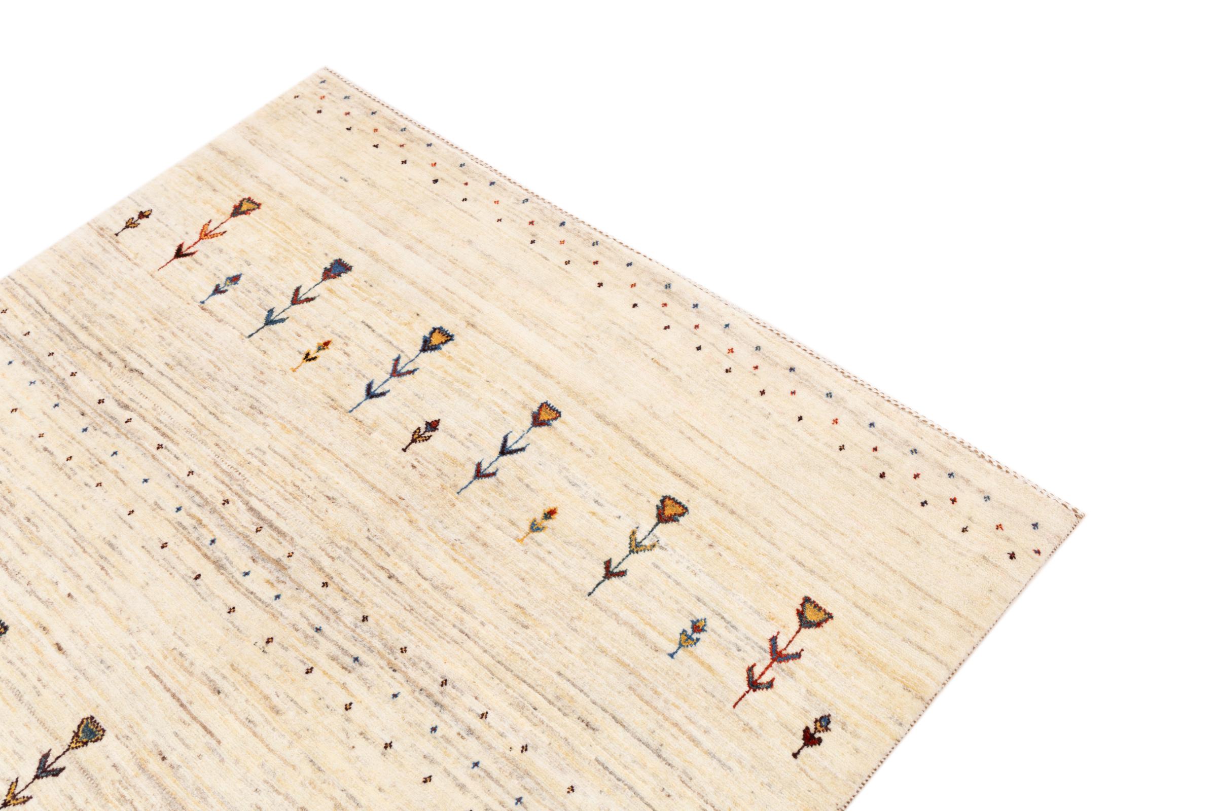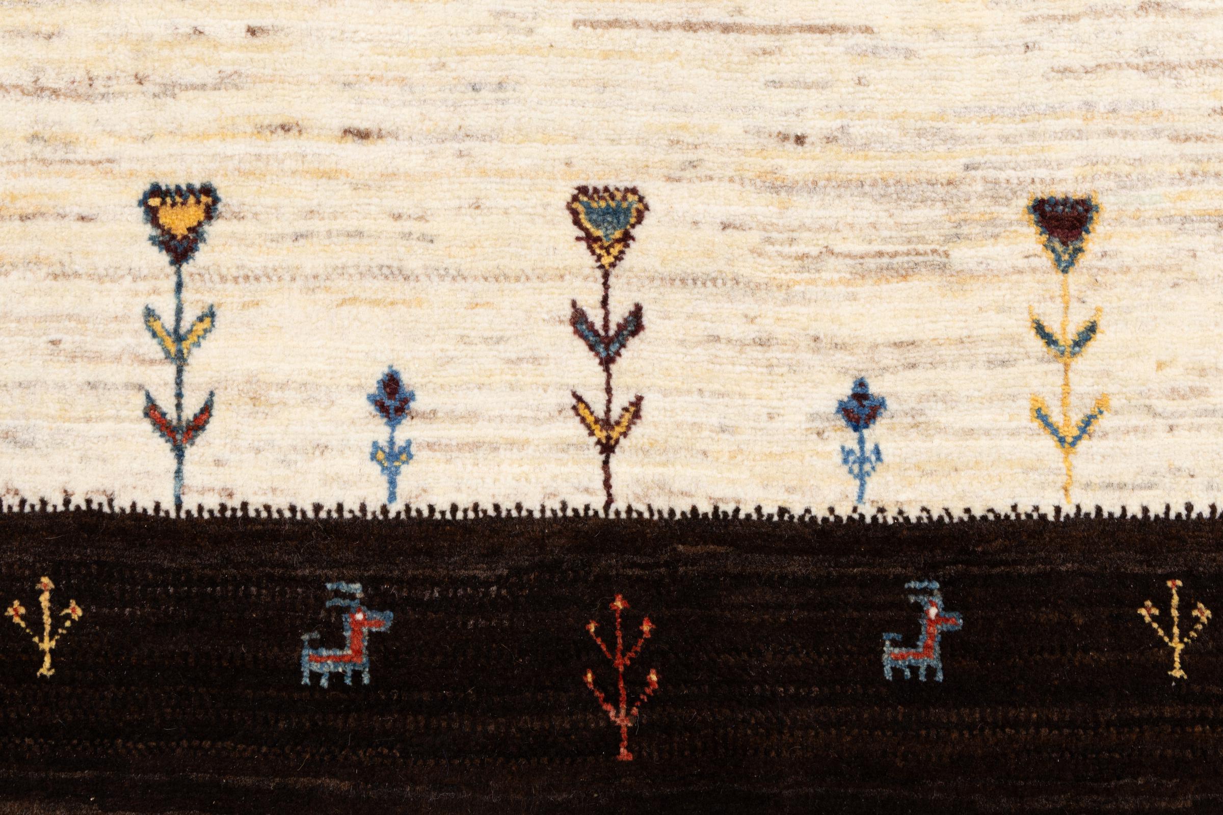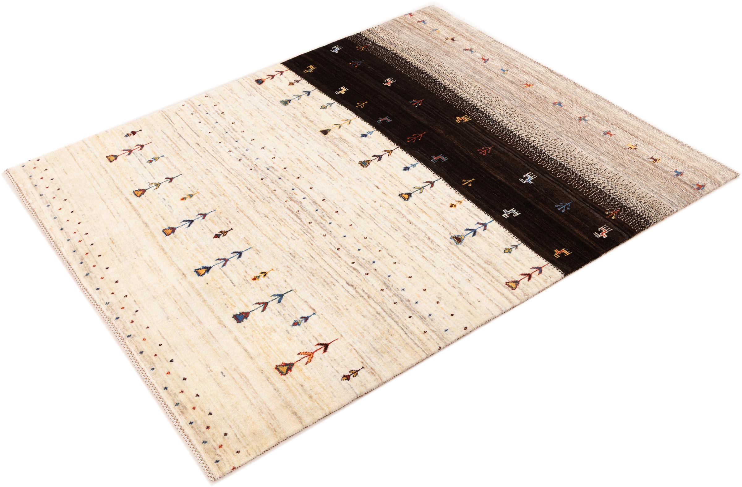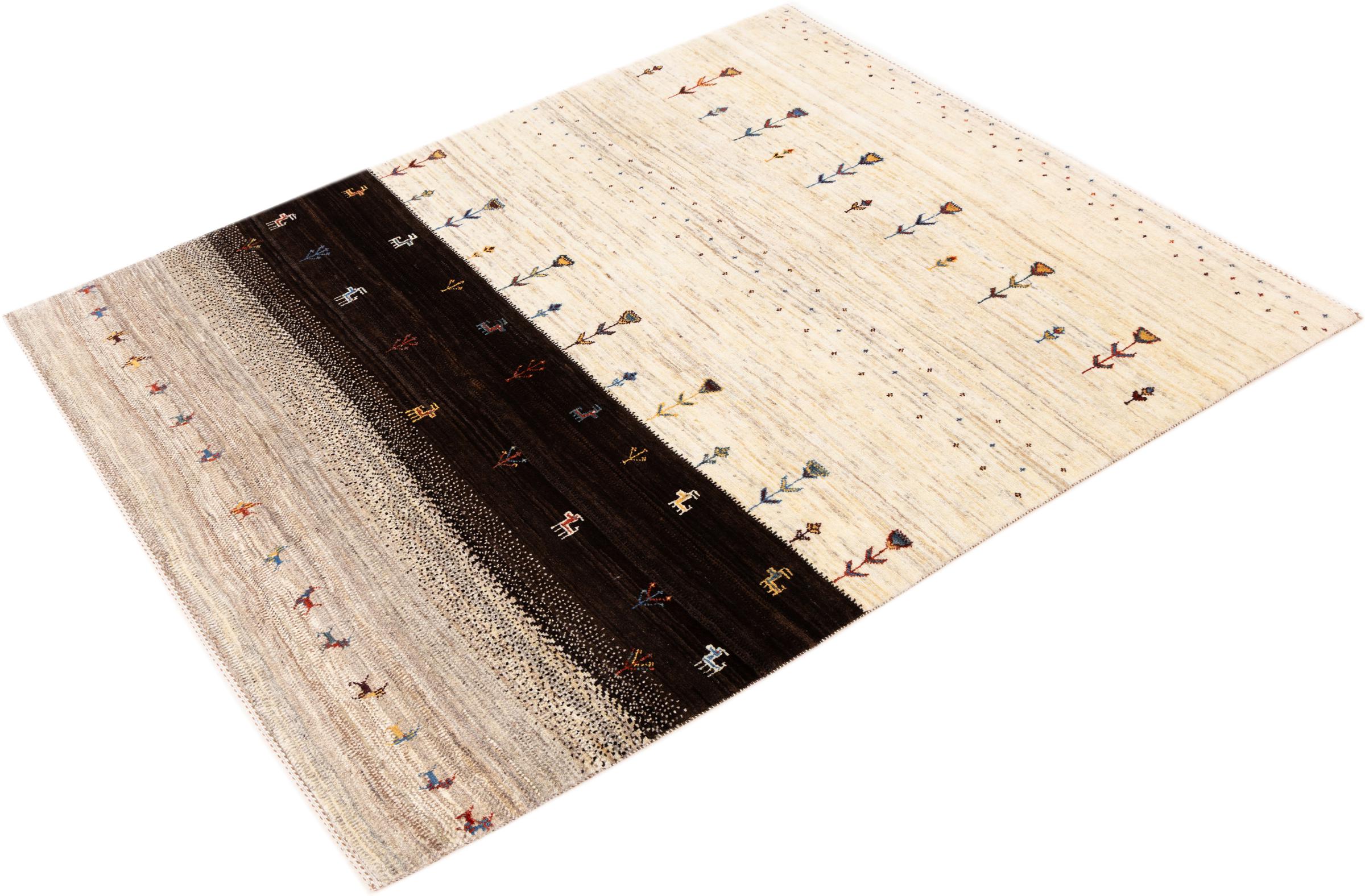 Dette smukke tæppe er en persisk Gabbeh og er en af ​​de højeste kvalitet Gabbeh tæpper. Tæpper er knyttet af nomader eller semi-nomader i Iran ved hjælp af traditionelt håndværk. De enkle motiver og mønstre er for det meste inspireret af nomadernes umiddelbare omgivelser. F.eks. Kan kameler, træer eller buske findes på traditionelle tæpper. Persiske Gabbeh-tæpper er lavet af uld fra lokale fårbesætninger. Ulden er derfor for det meste spundet for hånd. Hver af disse orientalske tæpper udgør en unik karakter af århundreder gammel kultur.
