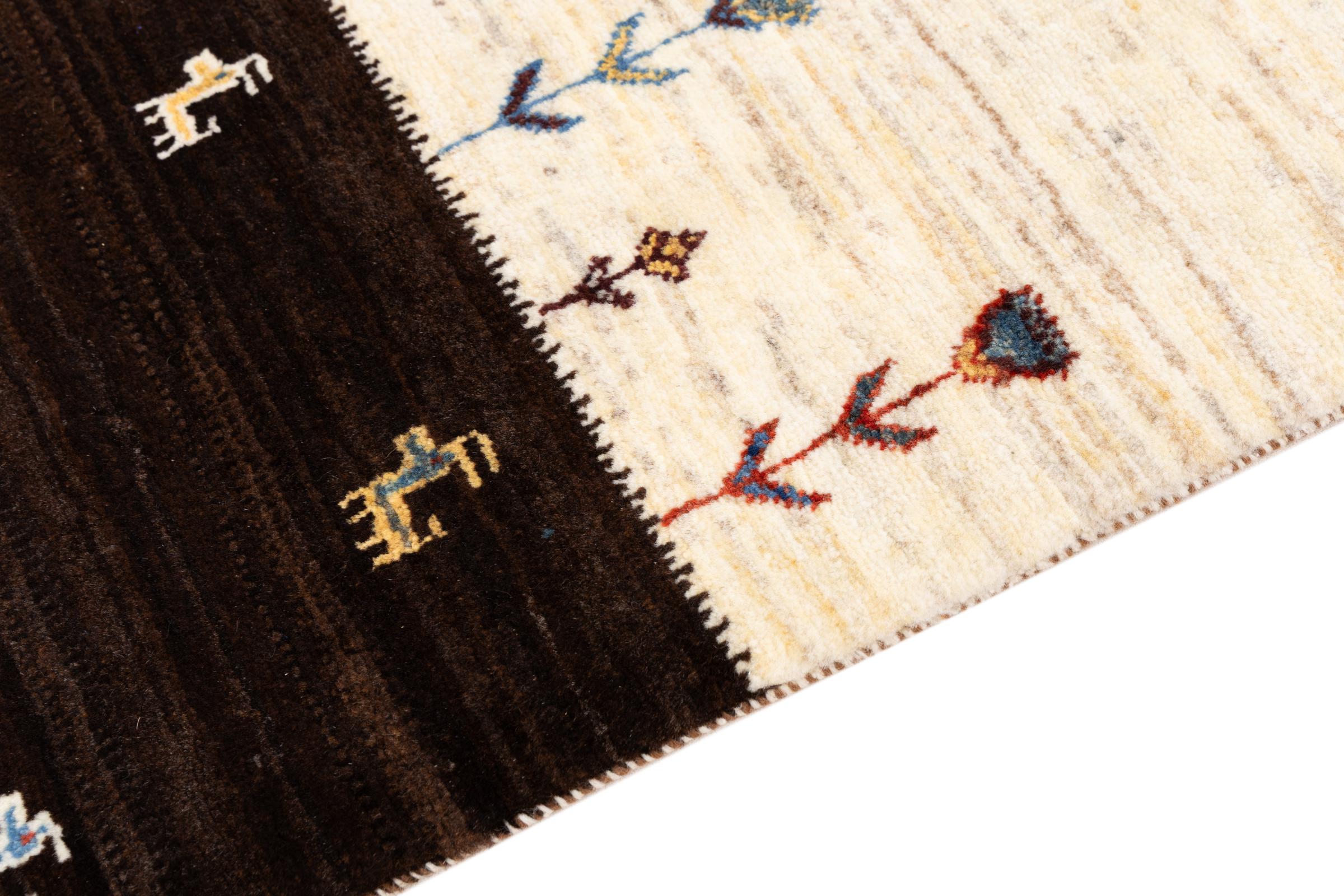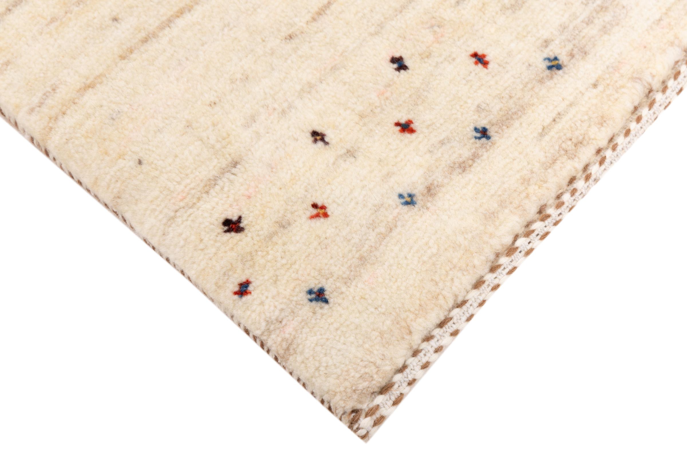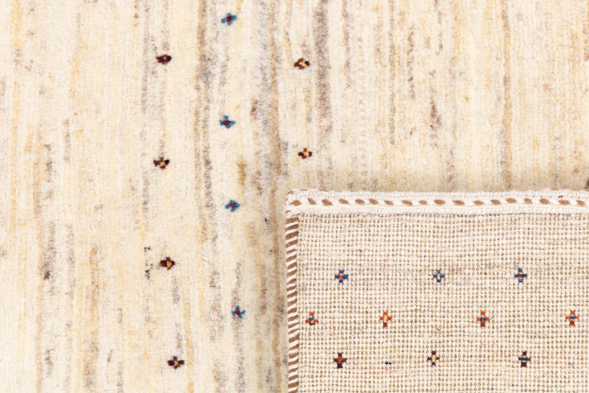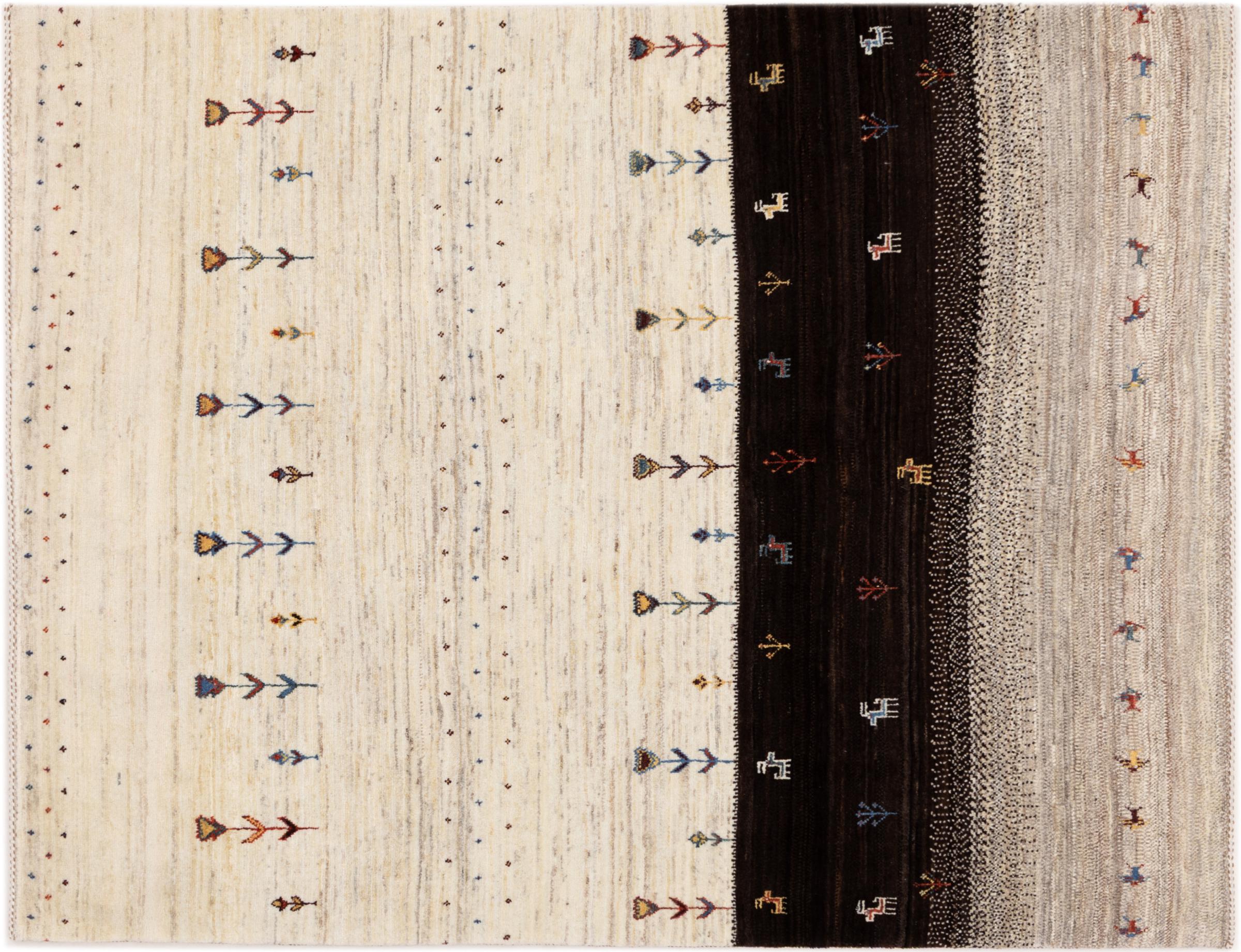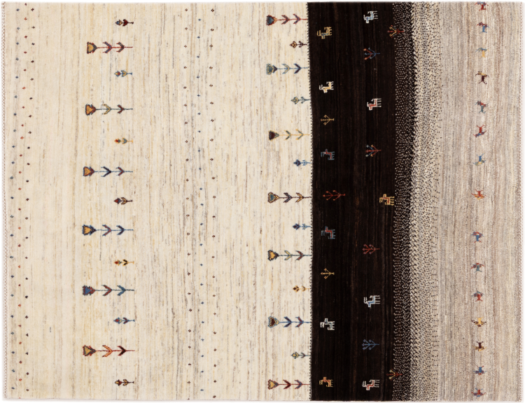 Dette smukke tæppe er en persisk Gabbeh og er en af ​​de højeste kvalitet Gabbeh tæpper. Tæpper er knyttet af nomader eller semi-nomader i Iran ved hjælp af traditionelt håndværk. De enkle motiver og mønstre er for det meste inspireret af nomadernes umiddelbare omgivelser. F.eks. Kan kameler, træer eller buske findes på traditionelle tæpper. Persiske Gabbeh-tæpper er lavet af uld fra lokale fårbesætninger. Ulden er derfor for det meste spundet for hånd. Hver af disse orientalske tæpper udgør en unik karakter af århundreder gammel kultur.