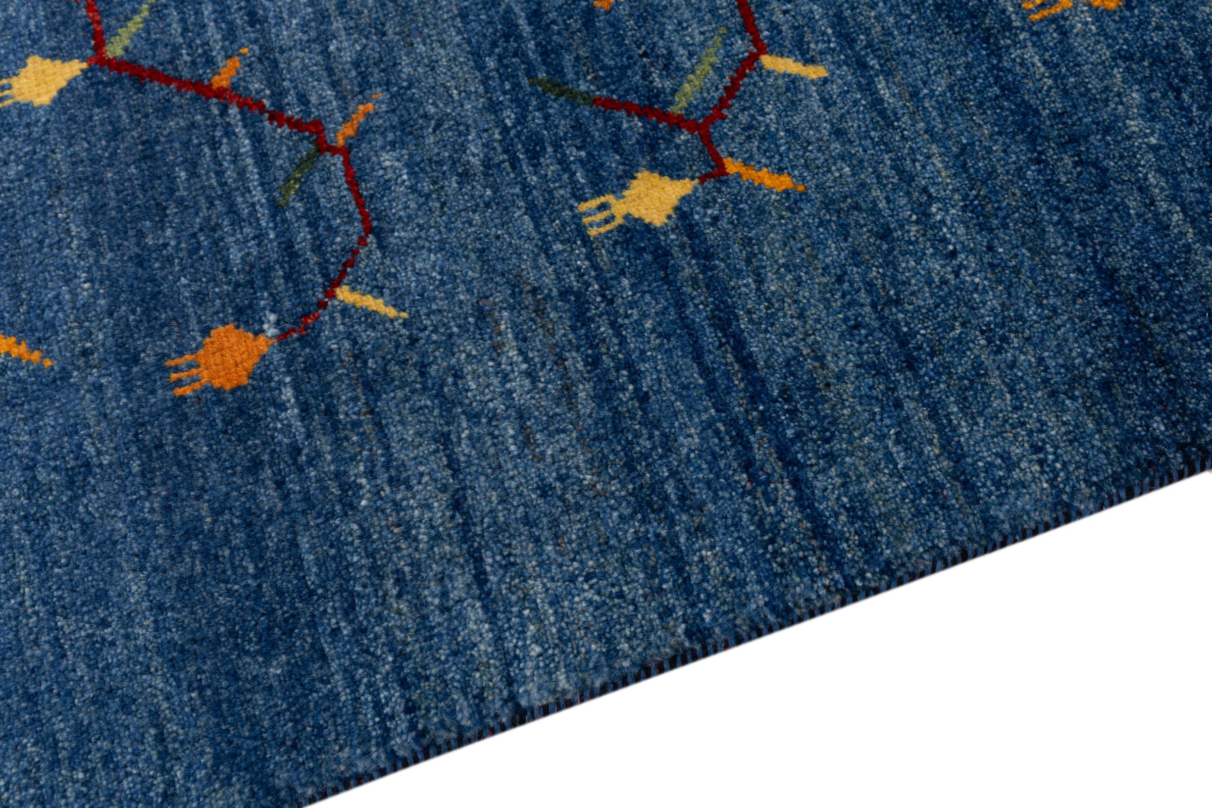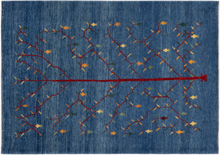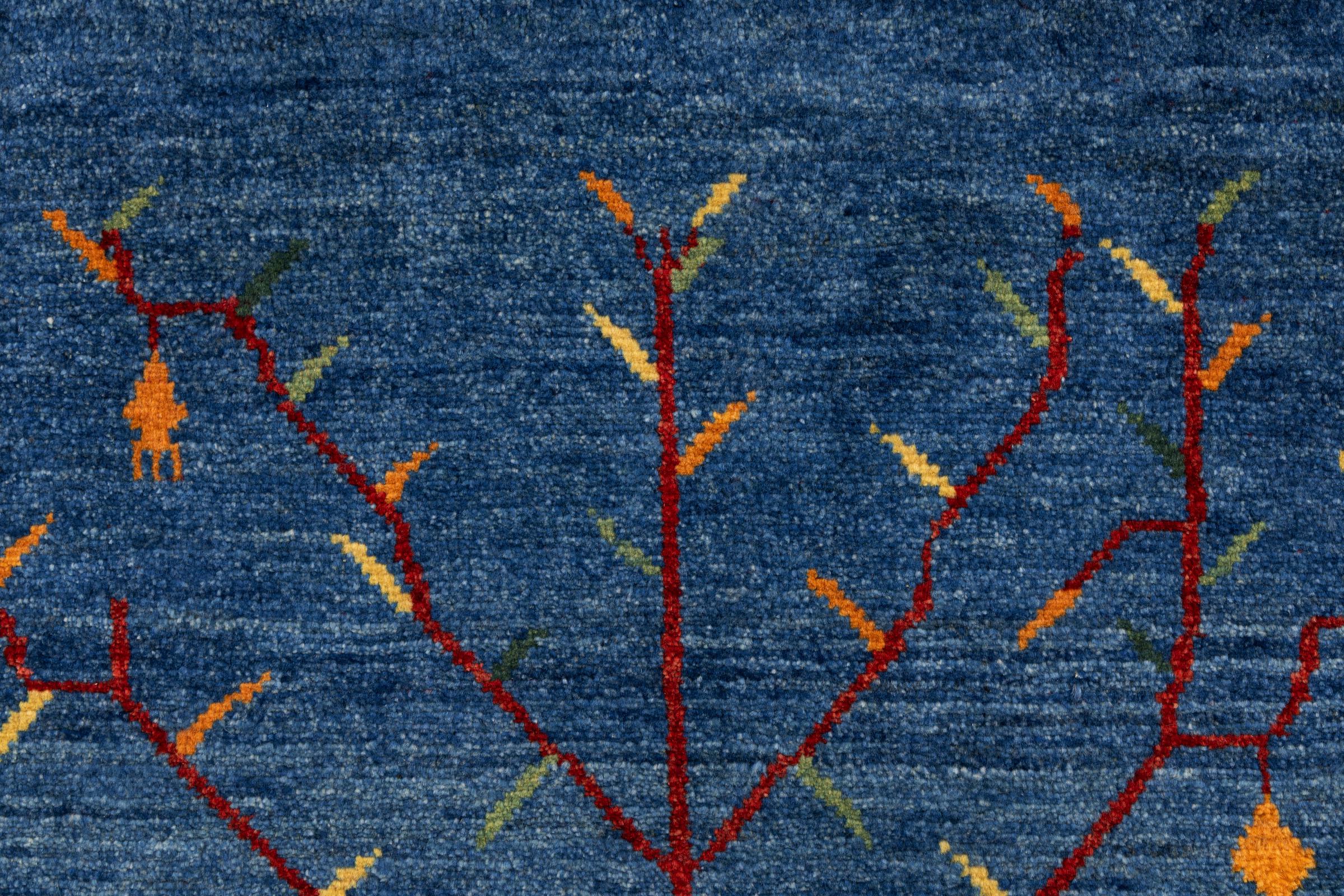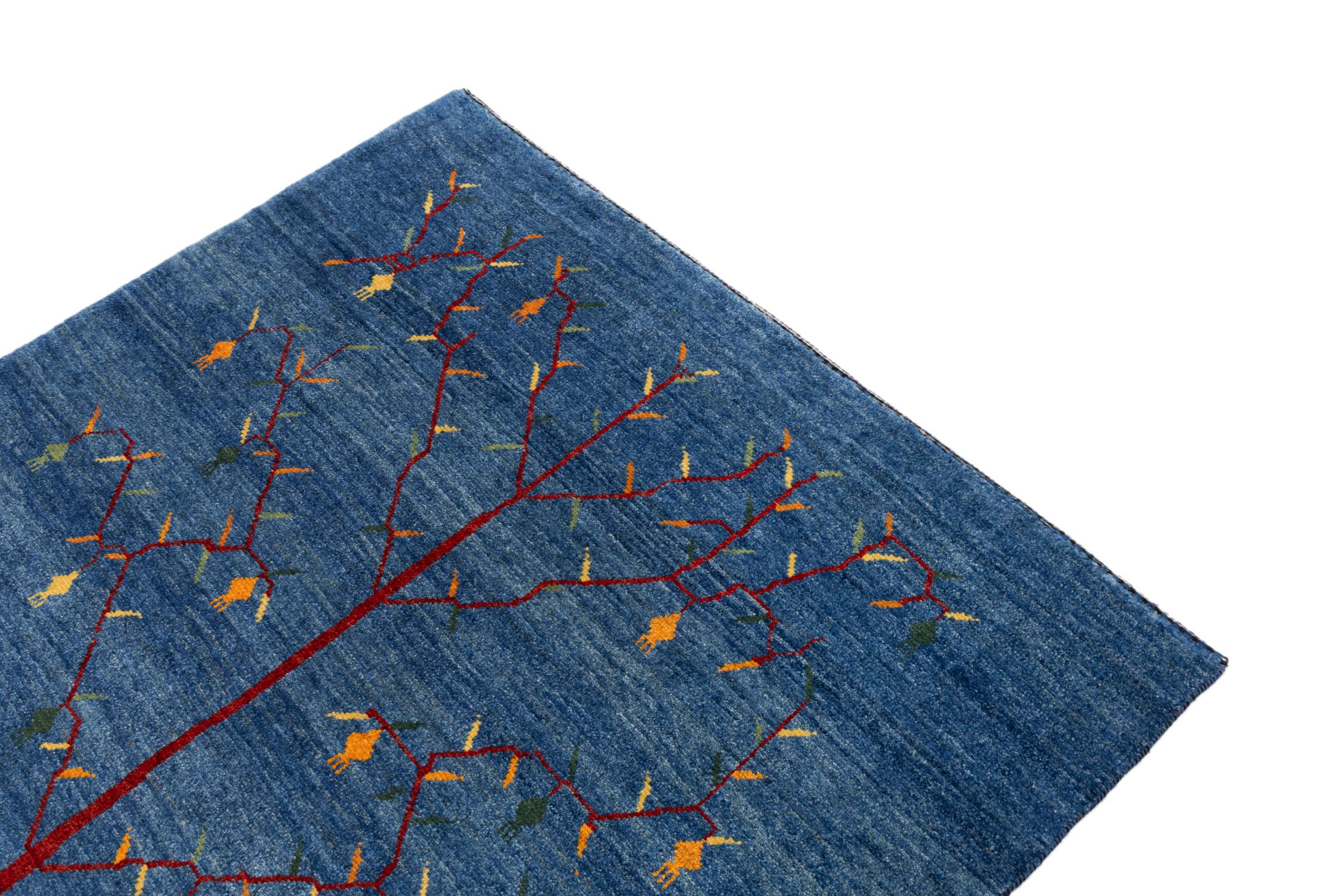 Dette smukke tæppe er en persisk Gabbeh og er en af ​​de højeste kvalitet Gabbeh tæpper. Tæpper er knyttet af nomader eller semi-nomader i Iran ved hjælp af traditionelt håndværk. De enkle motiver og mønstre er for det meste inspireret af nomadernes umiddelbare omgivelser. F.eks. Kan kameler, træer eller buske findes på traditionelle tæpper. Persiske Gabbeh-tæpper er lavet af uld fra lokale fårbesætninger. Ulden er derfor for det meste spundet for hånd. Hver af disse orientalske tæpper udgør en unik karakter af århundreder gammel kultur.