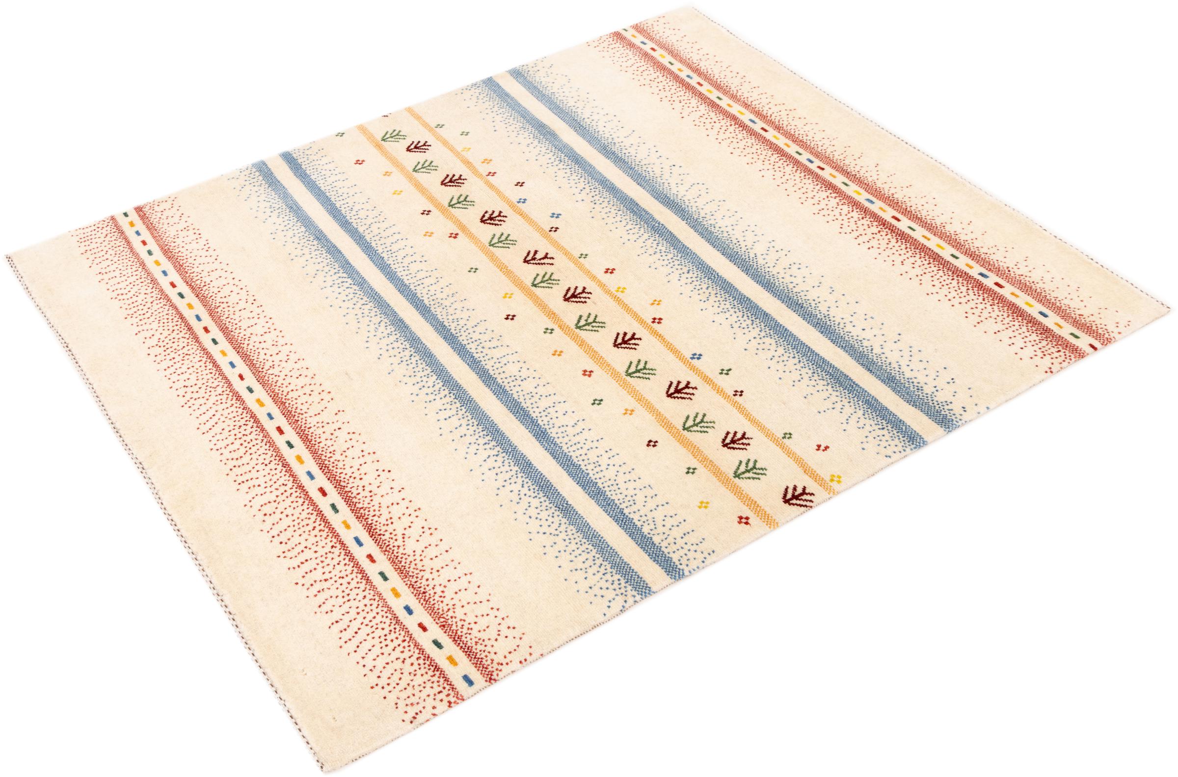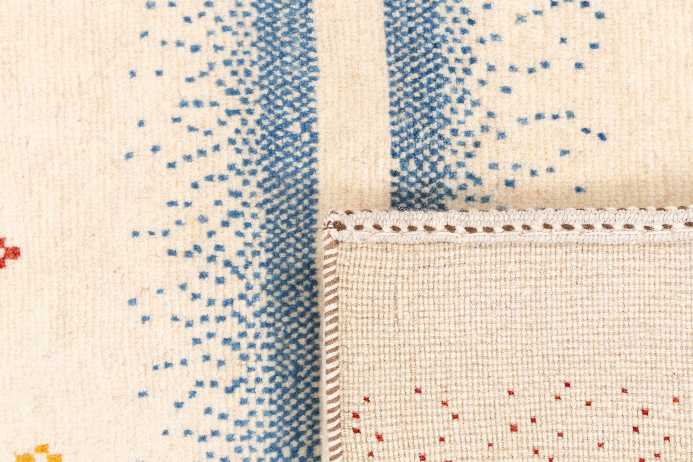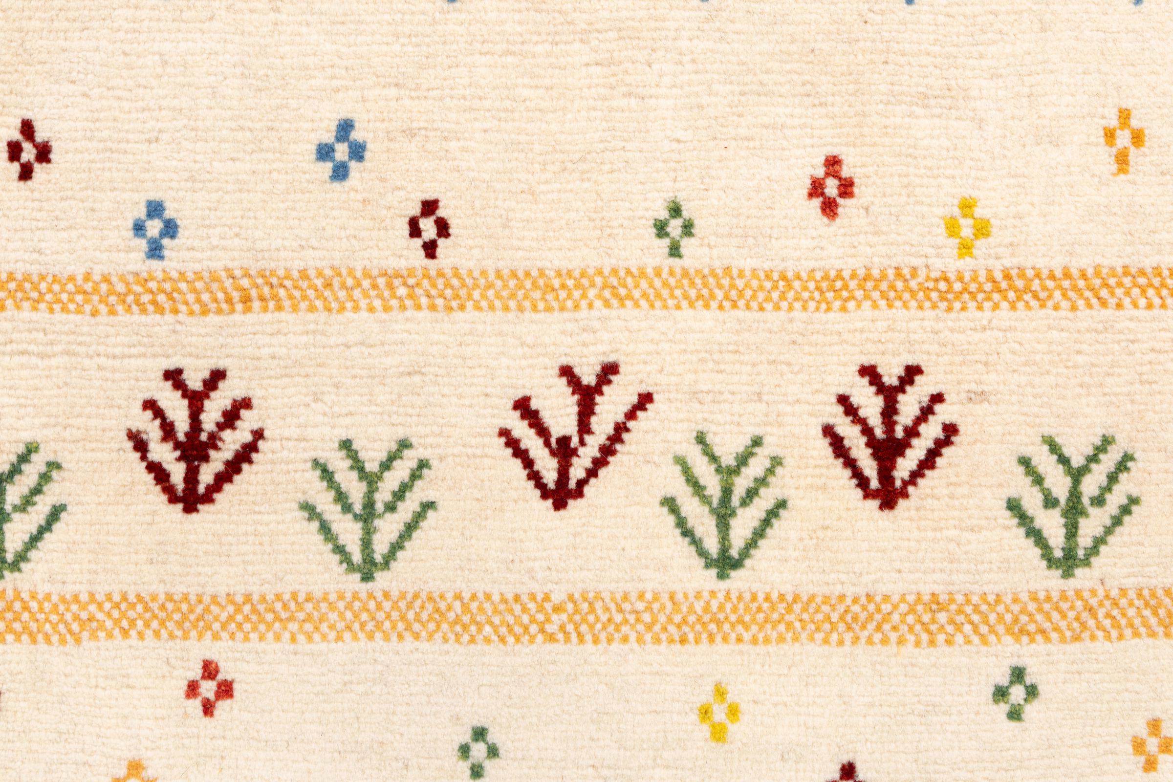 Dette smukke tæppe er en persisk Gabbeh og er en af ​​de højeste kvalitet Gabbeh tæpper. Tæpper er knyttet af nomader eller semi-nomader i Iran ved hjælp af traditionelt håndværk. De enkle motiver og mønstre er for det meste inspireret af nomadernes umiddelbare omgivelser. F.eks. Kan kameler, træer eller buske findes på traditionelle tæpper. Persiske Gabbeh-tæpper er lavet af uld fra lokale fårbesætninger. Ulden er derfor for det meste spundet for hånd. Hver af disse orientalske tæpper udgør en unik karakter af århundreder gammel kultur.