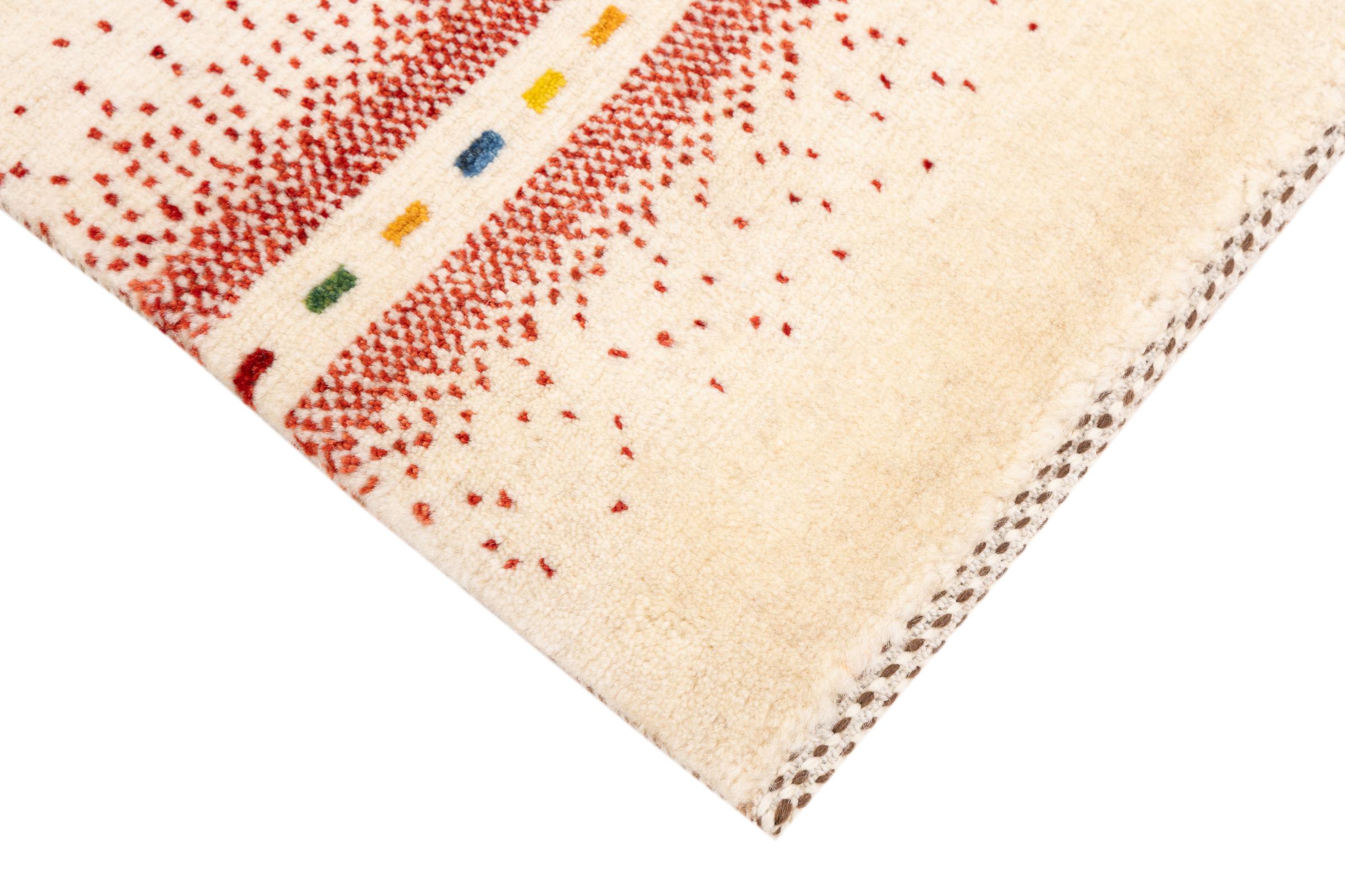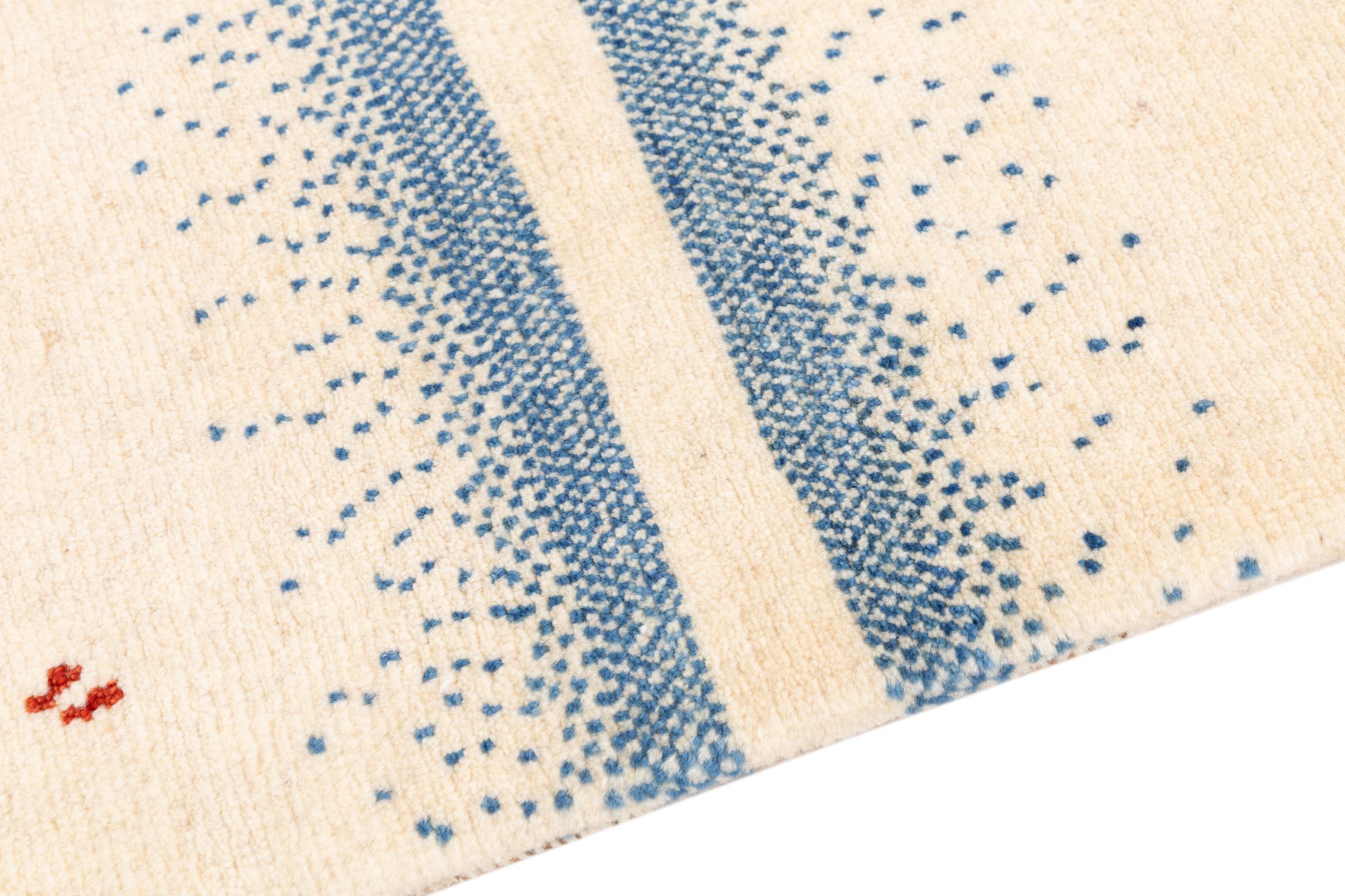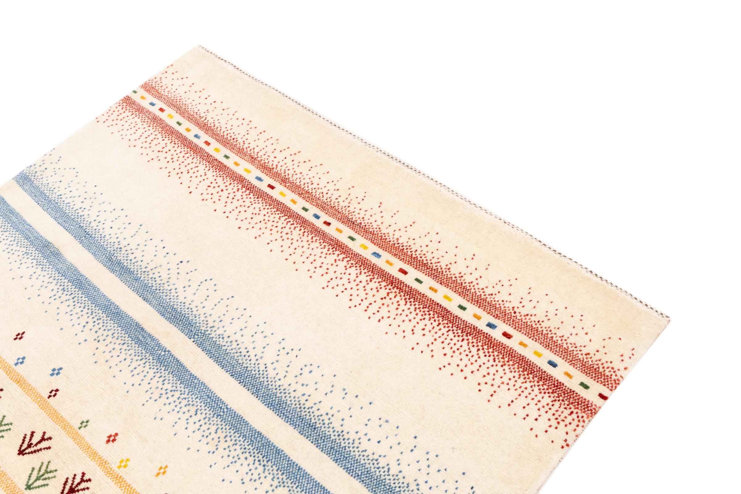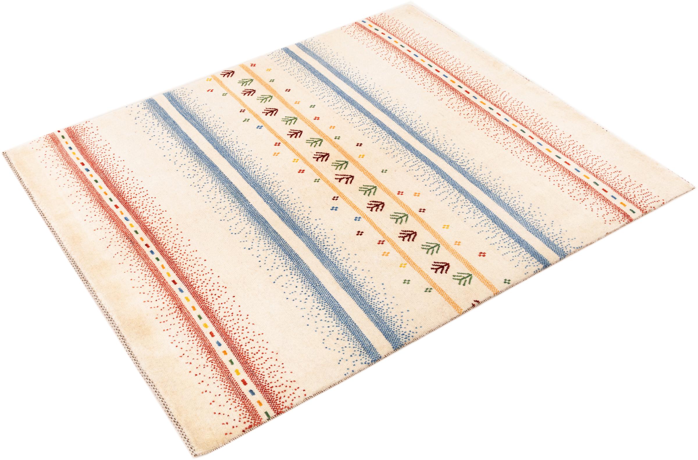 Dette smukke tæppe er en persisk Gabbeh og er en af ​​de højeste kvalitet Gabbeh tæpper. Tæpper er knyttet af nomader eller semi-nomader i Iran ved hjælp af traditionelt håndværk. De enkle motiver og mønstre er for det meste inspireret af nomadernes umiddelbare omgivelser. F.eks. Kan kameler, træer eller buske findes på traditionelle tæpper. Persiske Gabbeh-tæpper er lavet af uld fra lokale fårbesætninger. Ulden er derfor for det meste spundet for hånd. Hver af disse orientalske tæpper udgør en unik karakter af århundreder gammel kultur.