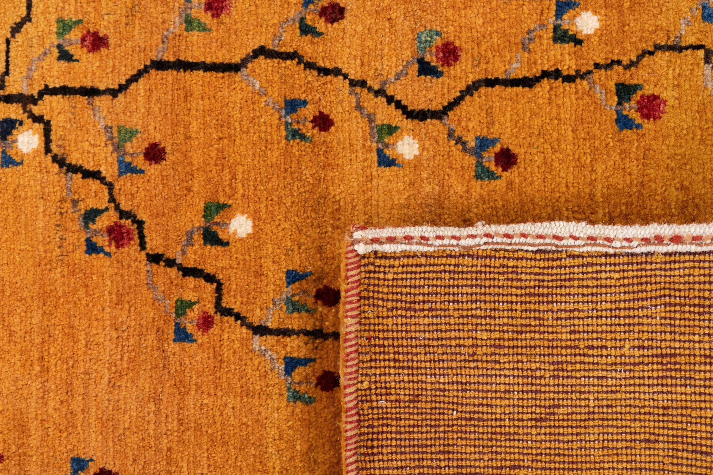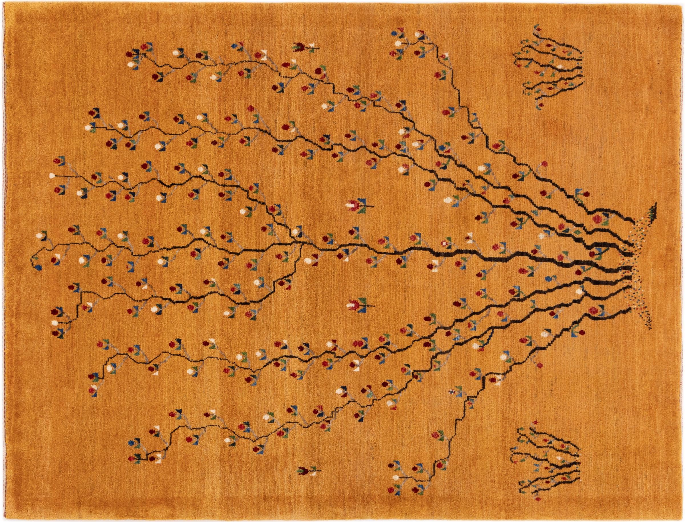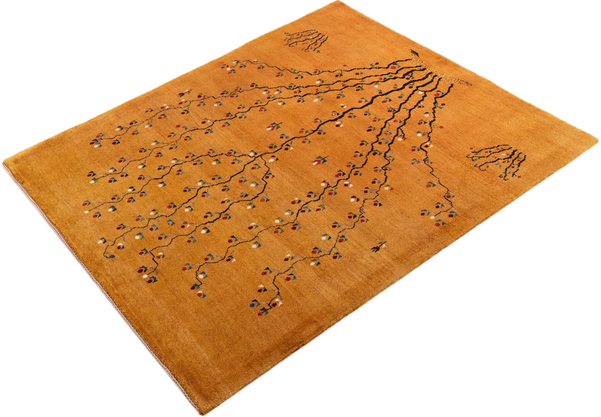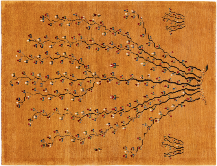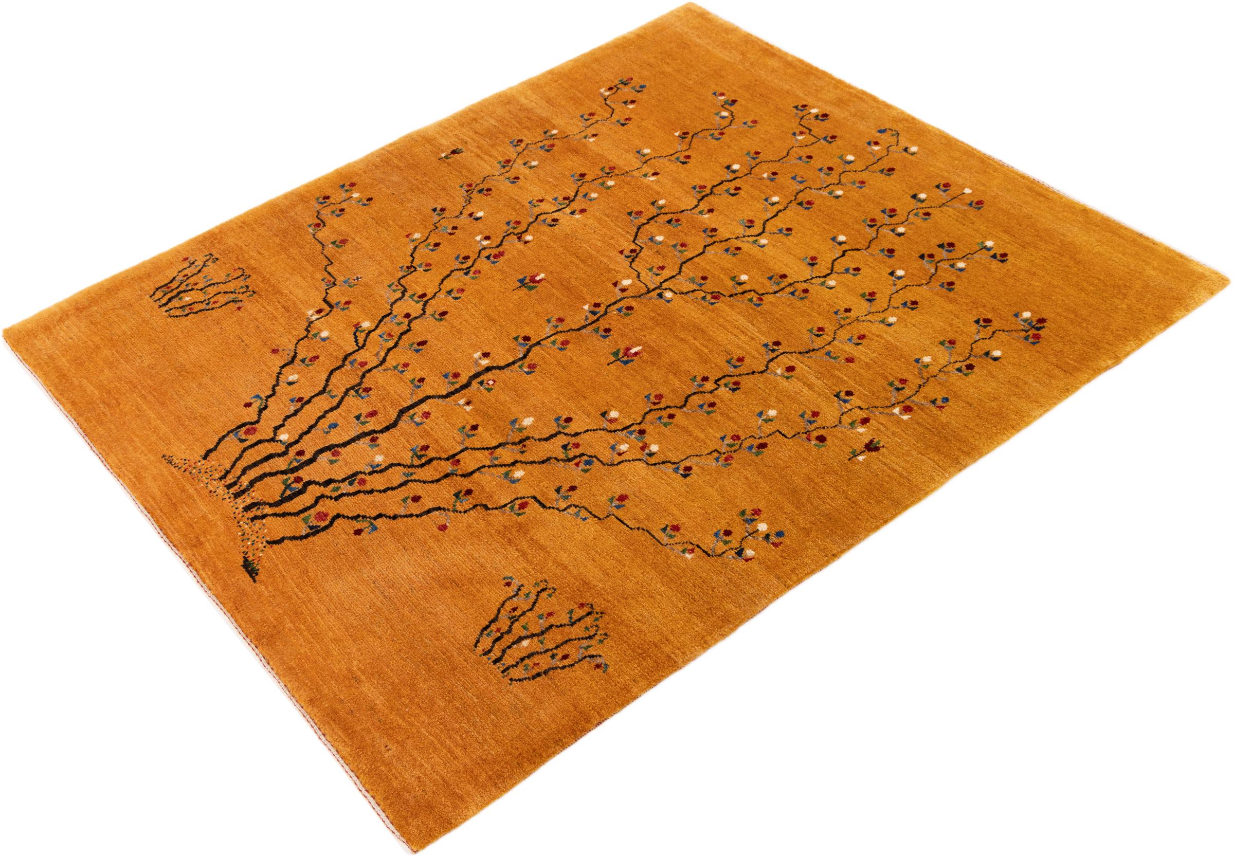 Dette smukke tæppe er en persisk Gabbeh og er en af ​​de højeste kvalitet Gabbeh tæpper. Tæpper er knyttet af nomader eller semi-nomader i Iran ved hjælp af traditionelt håndværk. De enkle motiver og mønstre er for det meste inspireret af nomadernes umiddelbare omgivelser. F.eks. Kan kameler, træer eller buske findes på traditionelle tæpper. Persiske Gabbeh-tæpper er lavet af uld fra lokale fårbesætninger. Ulden er derfor for det meste spundet for hånd. Hver af disse orientalske tæpper udgør en unik karakter af århundreder gammel kultur.