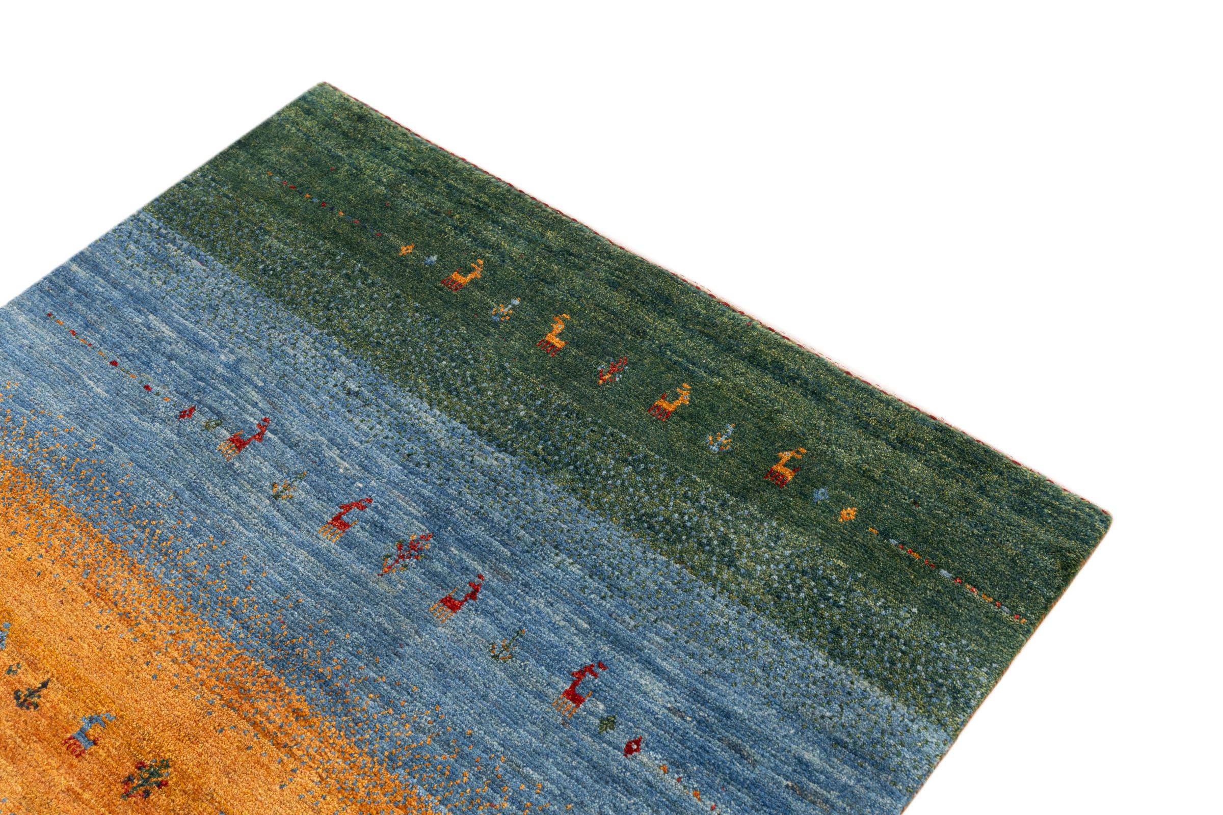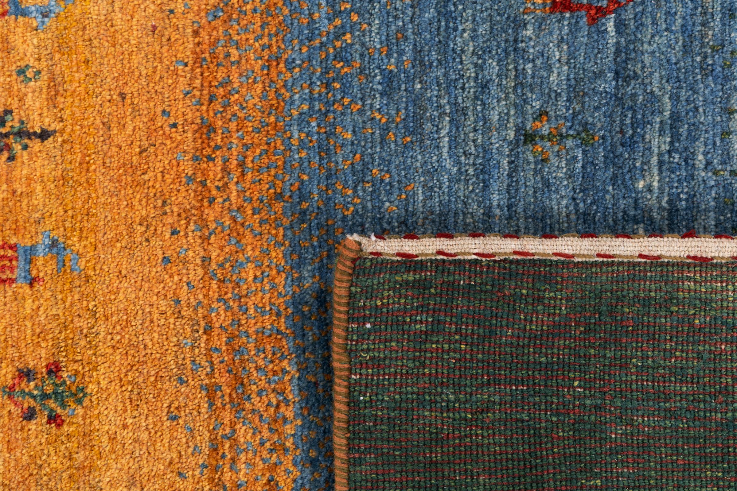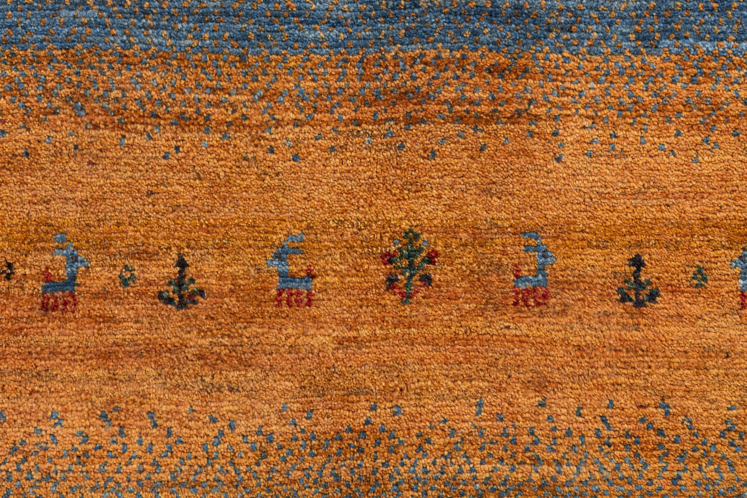 Dette smukke tæppe er en persisk Gabbeh og er en af ​​de højeste kvalitet Gabbeh tæpper. Tæpper er knyttet af nomader eller semi-nomader i Iran ved hjælp af traditionelt håndværk. De enkle motiver og mønstre er for det meste inspireret af nomadernes umiddelbare omgivelser. F.eks. Kan kameler, træer eller buske findes på traditionelle tæpper. Persiske Gabbeh-tæpper er lavet af uld fra lokale fårbesætninger. Ulden er derfor for det meste spundet for hånd. Hver af disse orientalske tæpper udgør en unik karakter af århundreder gammel kultur.