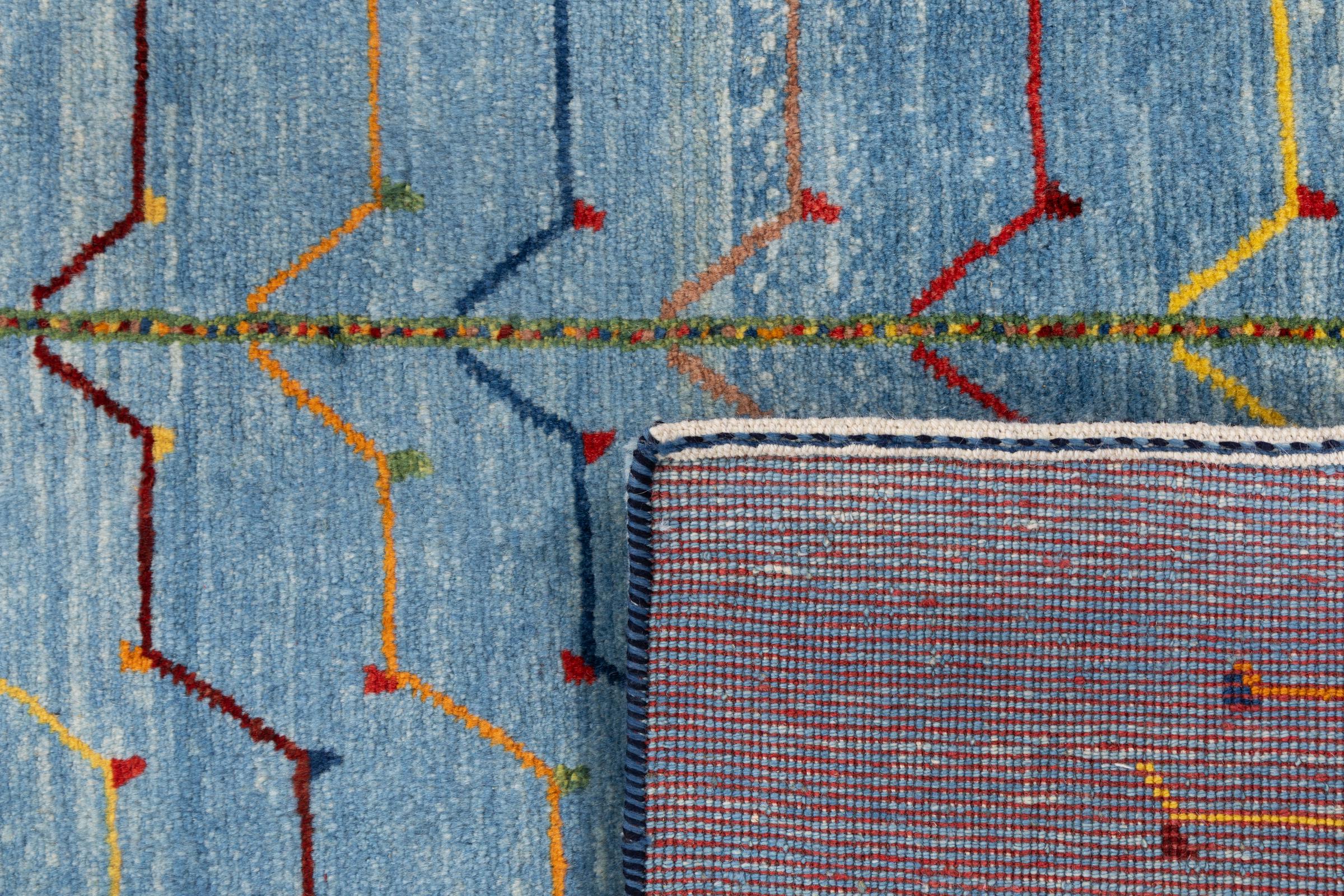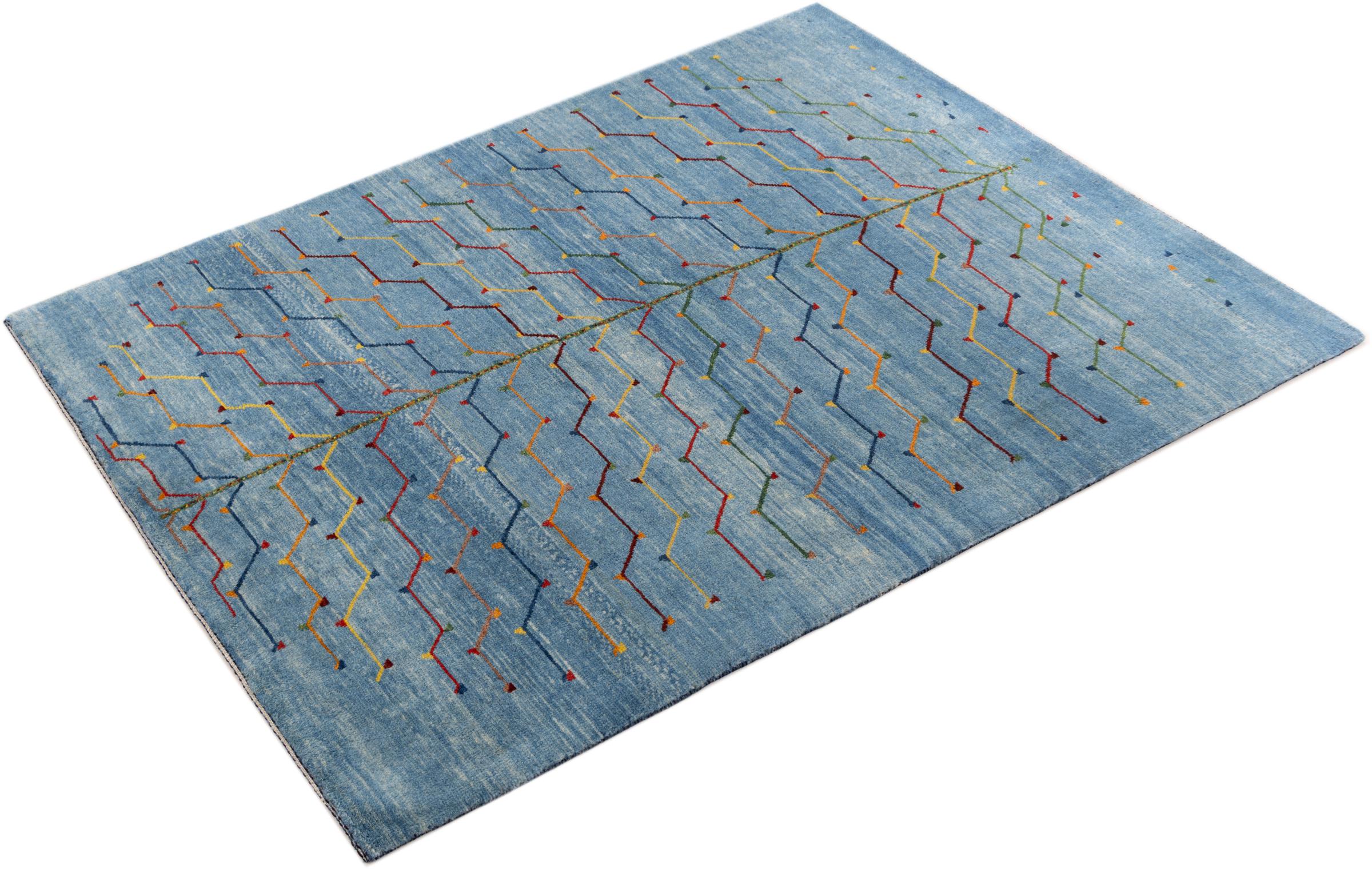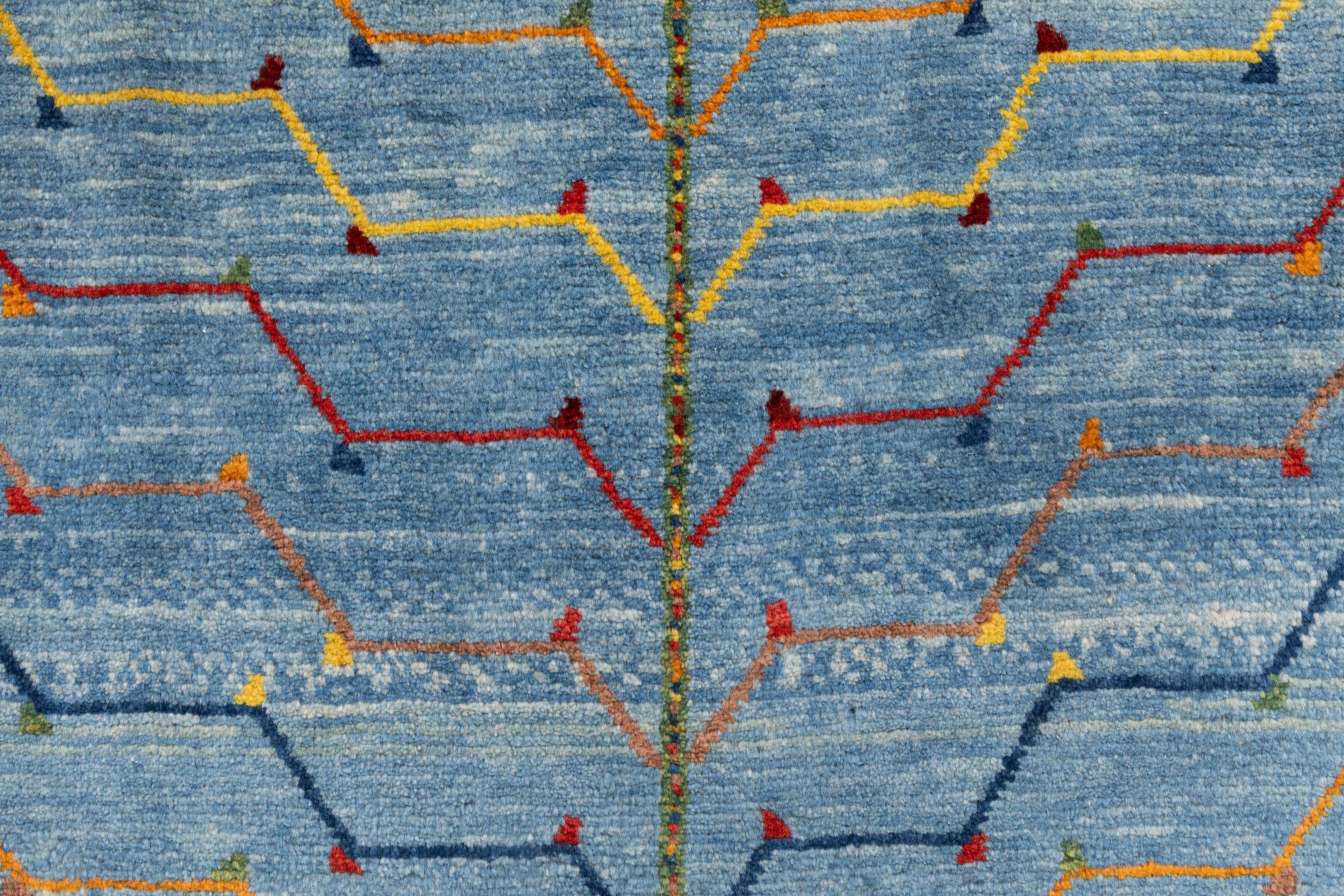 Dette smukke tæppe er en persisk Gabbeh og er en af ​​de højeste kvalitet Gabbeh tæpper. Tæpper er knyttet af nomader eller semi-nomader i Iran ved hjælp af traditionelt håndværk. De enkle motiver og mønstre er for det meste inspireret af nomadernes umiddelbare omgivelser. F.eks. Kan kameler, træer eller buske findes på traditionelle tæpper. Persiske Gabbeh-tæpper er lavet af uld fra lokale fårbesætninger. Ulden er derfor for det meste spundet for hånd. Hver af disse orientalske tæpper udgør en unik karakter af århundreder gammel kultur.