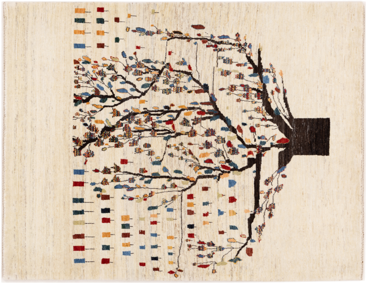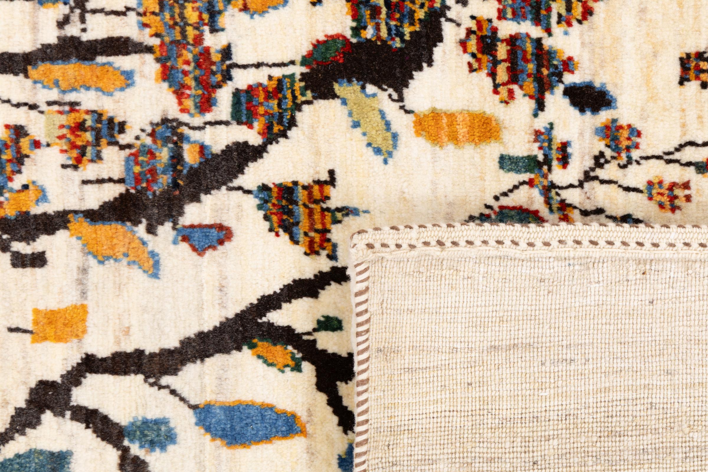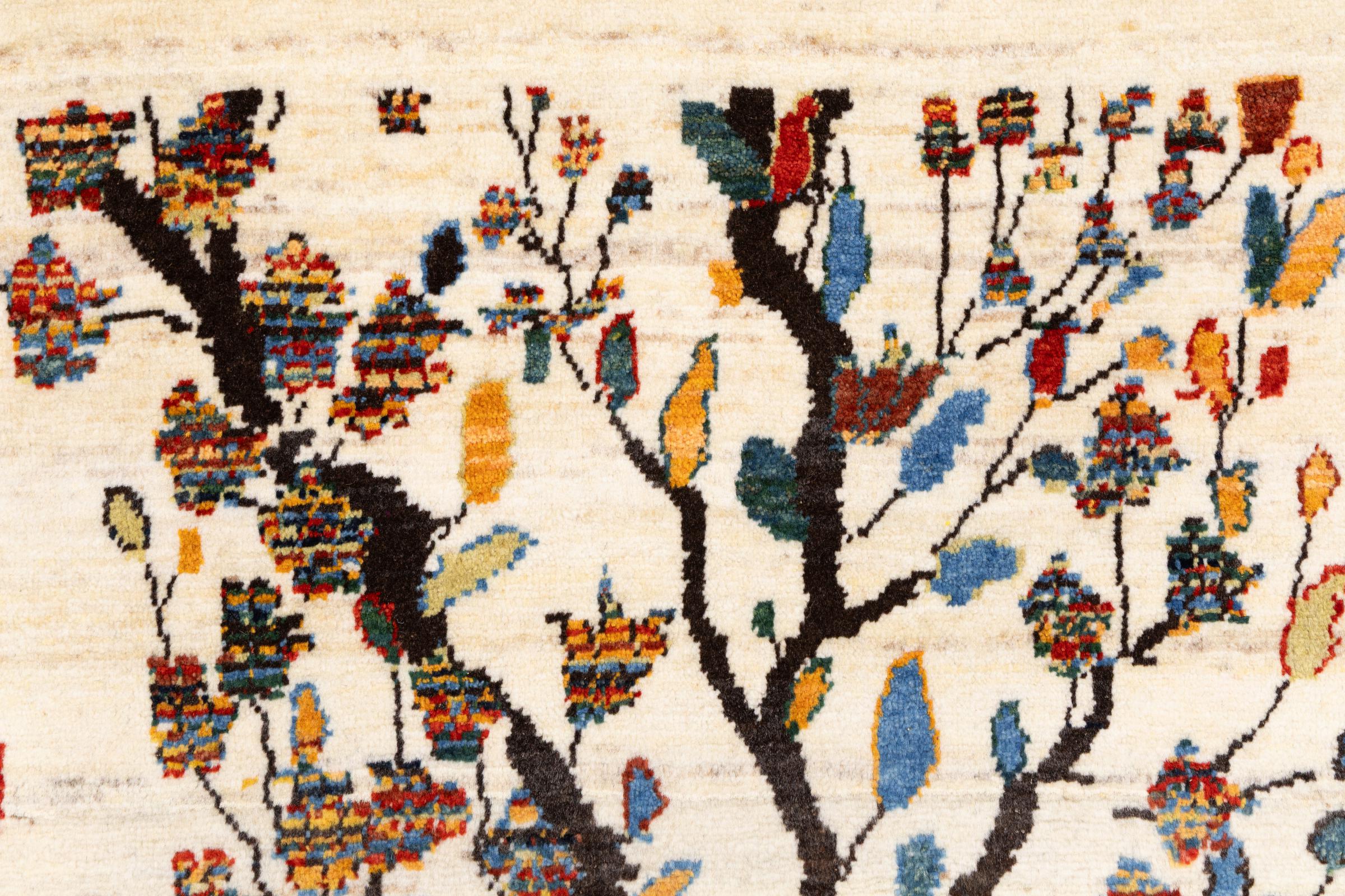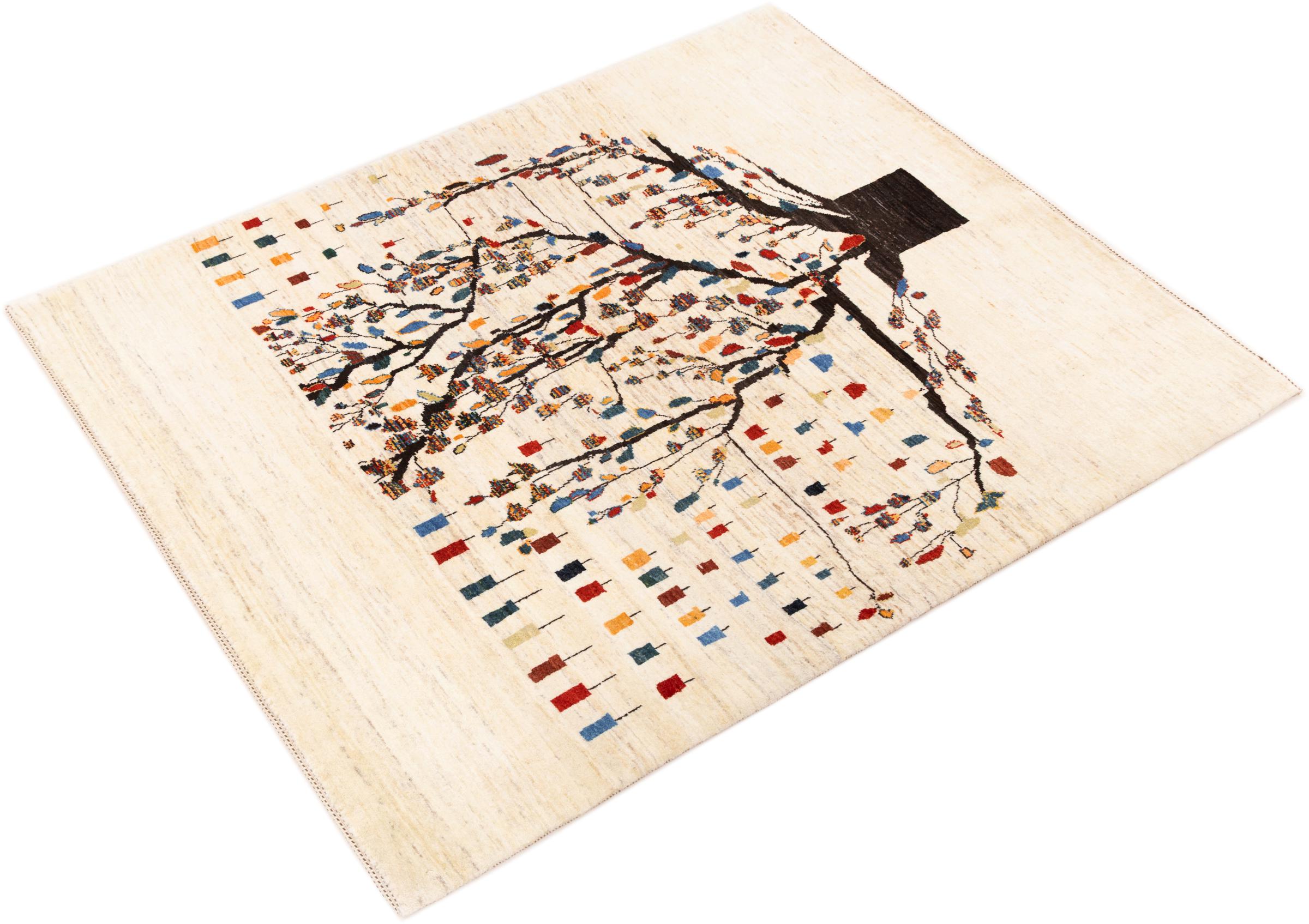 Dette smukke tæppe er en persisk Gabbeh og er en af ​​de højeste kvalitet Gabbeh tæpper. Tæpper er knyttet af nomader eller semi-nomader i Iran ved hjælp af traditionelt håndværk. De enkle motiver og mønstre er for det meste inspireret af nomadernes umiddelbare omgivelser. F.eks. Kan kameler, træer eller buske findes på traditionelle tæpper. Persiske Gabbeh-tæpper er lavet af uld fra lokale fårbesætninger. Ulden er derfor for det meste spundet for hånd. Hver af disse orientalske tæpper udgør en unik karakter af århundreder gammel kultur.