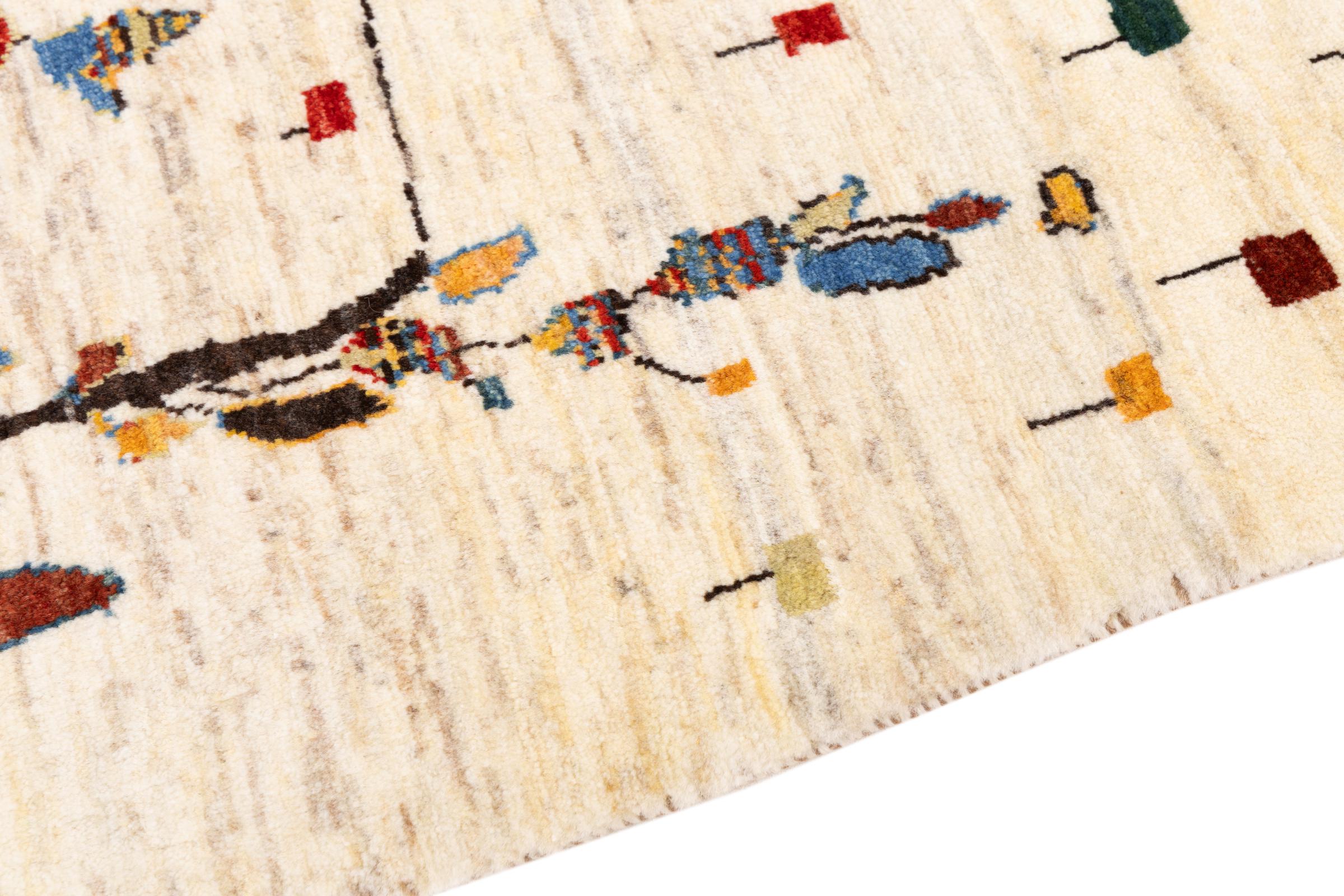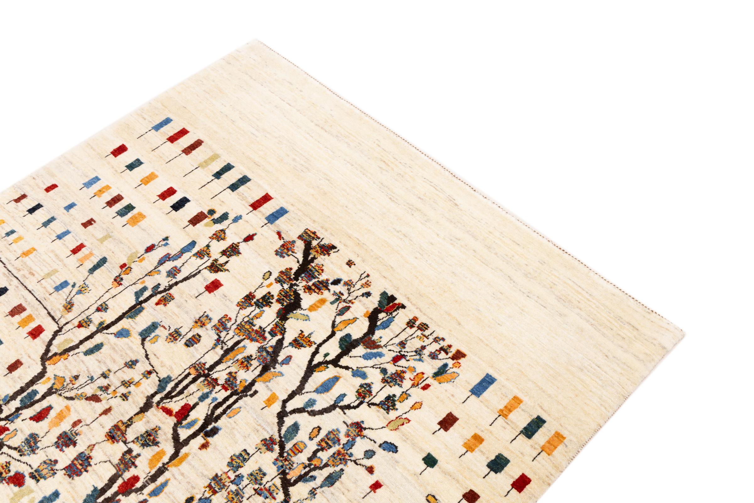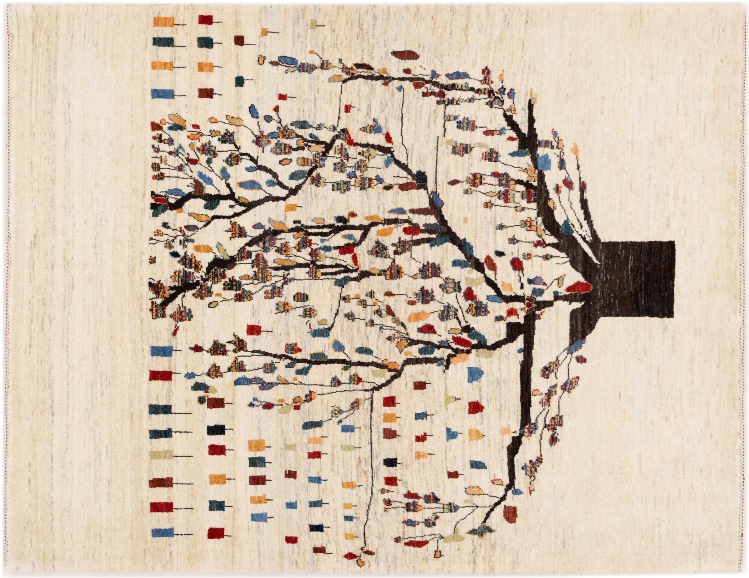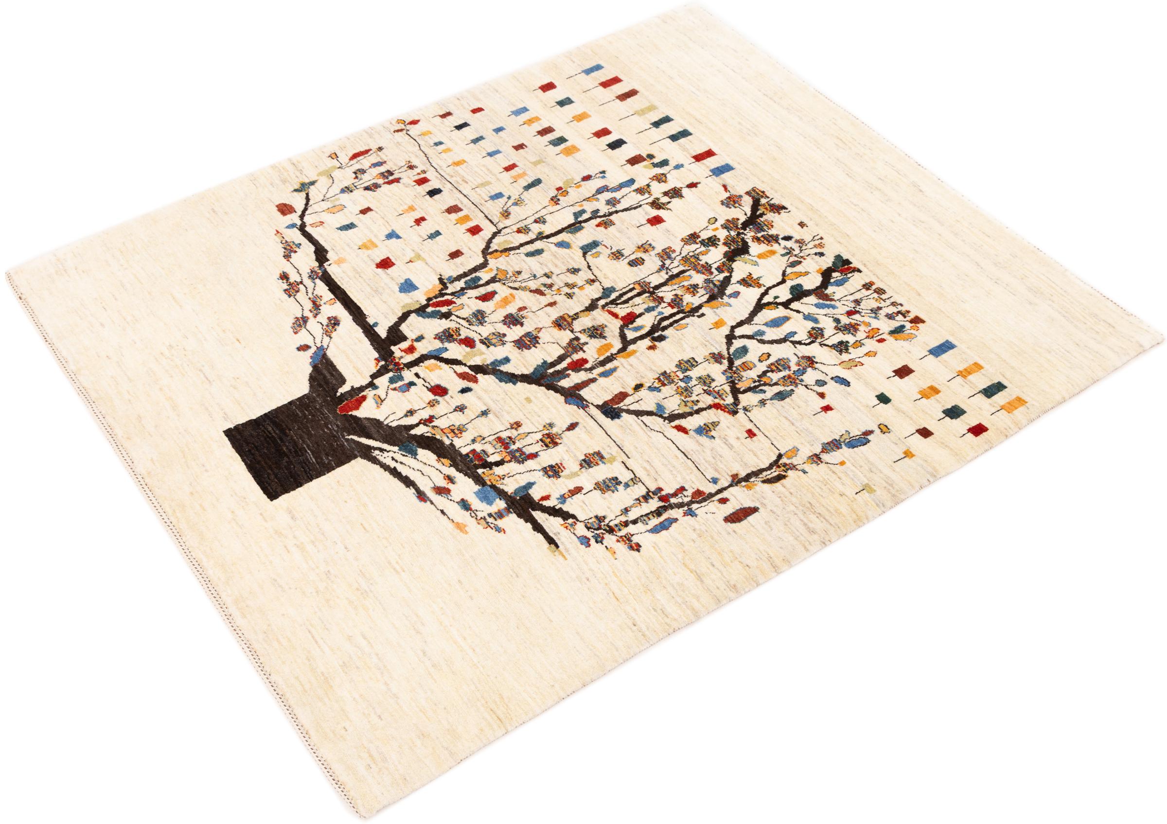 Dette smukke tæppe er en persisk Gabbeh og er en af ​​de højeste kvalitet Gabbeh tæpper. Tæpper er knyttet af nomader eller semi-nomader i Iran ved hjælp af traditionelt håndværk. De enkle motiver og mønstre er for det meste inspireret af nomadernes umiddelbare omgivelser. F.eks. Kan kameler, træer eller buske findes på traditionelle tæpper. Persiske Gabbeh-tæpper er lavet af uld fra lokale fårbesætninger. Ulden er derfor for det meste spundet for hånd. Hver af disse orientalske tæpper udgør en unik karakter af århundreder gammel kultur.