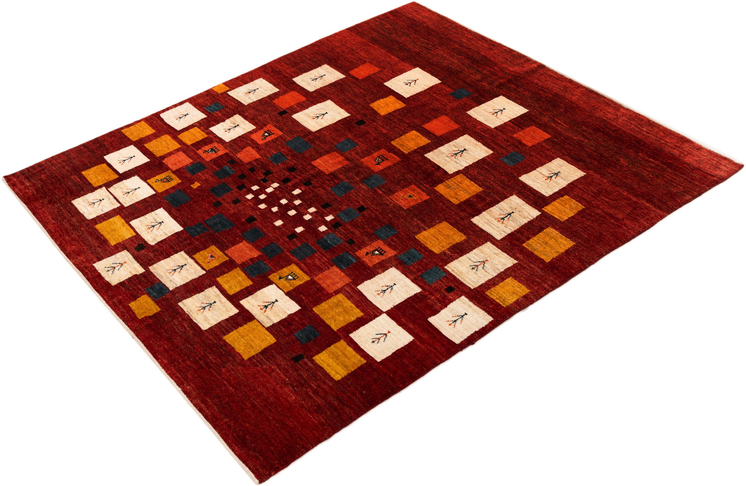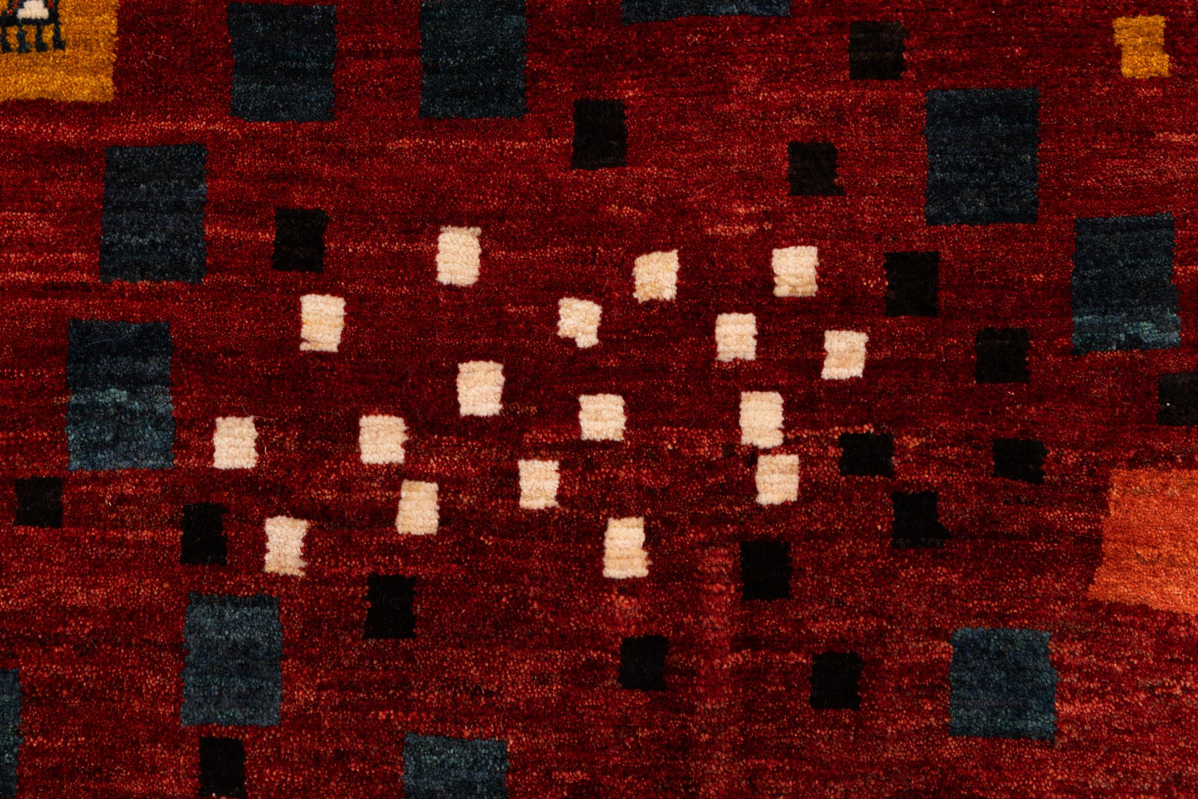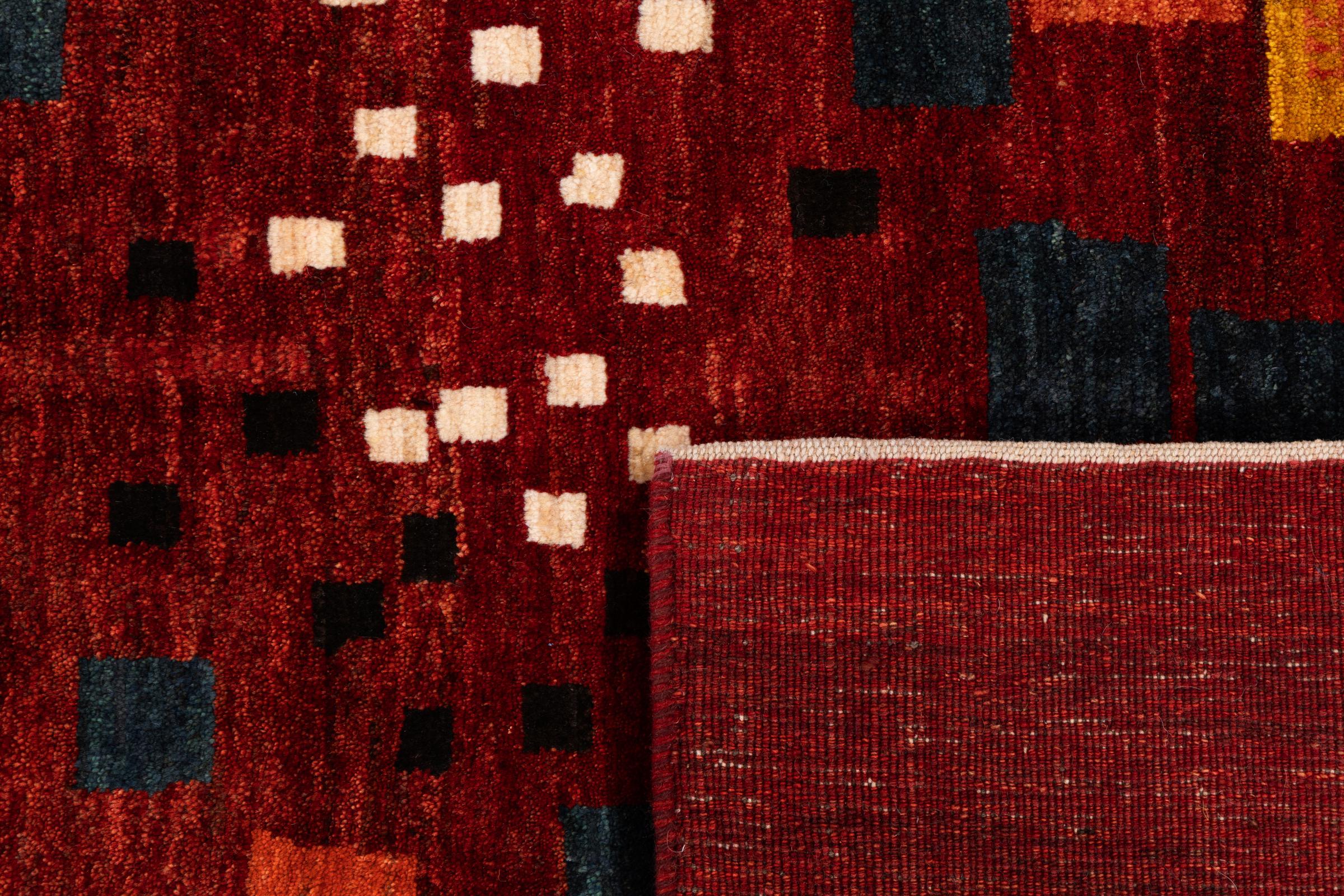 Dette smukke tæppe er en persisk Gabbeh og er en af ​​de højeste kvalitet Gabbeh tæpper. Tæpper er knyttet af nomader eller semi-nomader i Iran ved hjælp af traditionelt håndværk. De enkle motiver og mønstre er for det meste inspireret af nomadernes umiddelbare omgivelser. F.eks. Kan kameler, træer eller buske findes på traditionelle tæpper. Persiske Gabbeh-tæpper er lavet af uld fra lokale fårbesætninger. Ulden er derfor for det meste spundet for hånd. Hver af disse orientalske tæpper udgør en unik karakter af århundreder gammel kultur.