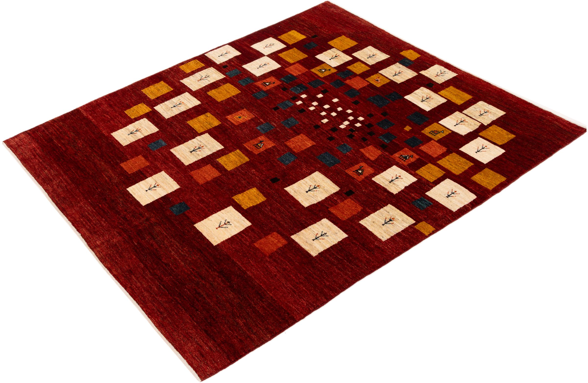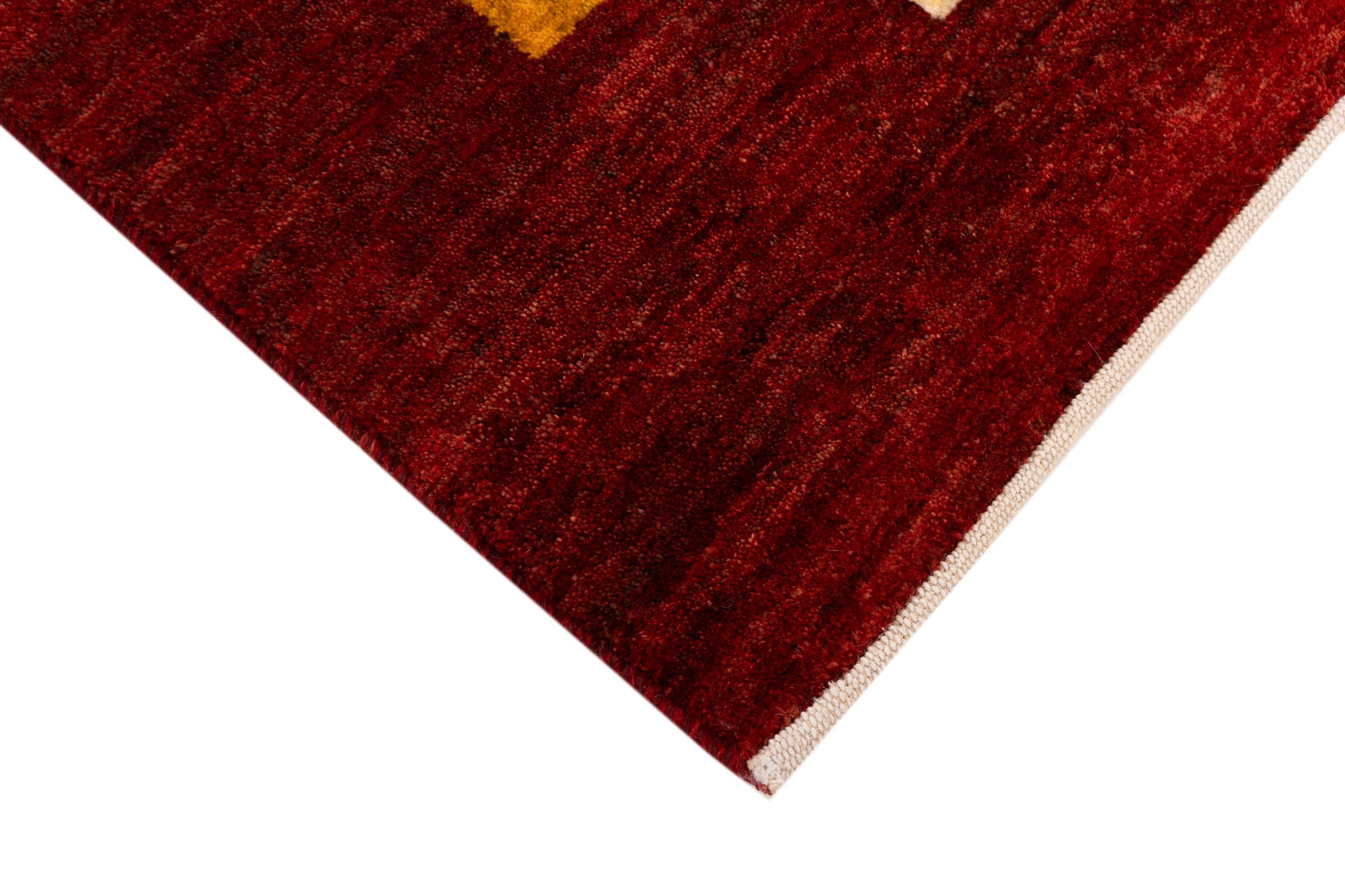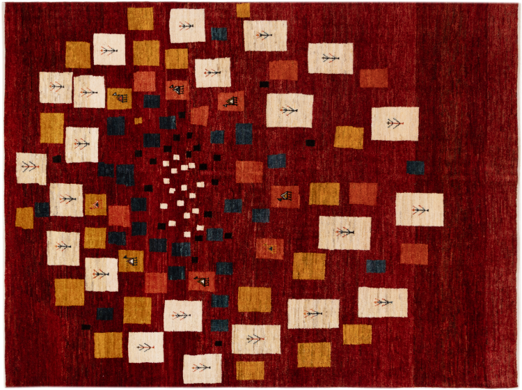 Dette smukke tæppe er en persisk Gabbeh og er en af ​​de højeste kvalitet Gabbeh tæpper. Tæpper er knyttet af nomader eller semi-nomader i Iran ved hjælp af traditionelt håndværk. De enkle motiver og mønstre er for det meste inspireret af nomadernes umiddelbare omgivelser. F.eks. Kan kameler, træer eller buske findes på traditionelle tæpper. Persiske Gabbeh-tæpper er lavet af uld fra lokale fårbesætninger. Ulden er derfor for det meste spundet for hånd. Hver af disse orientalske tæpper udgør en unik karakter af århundreder gammel kultur.