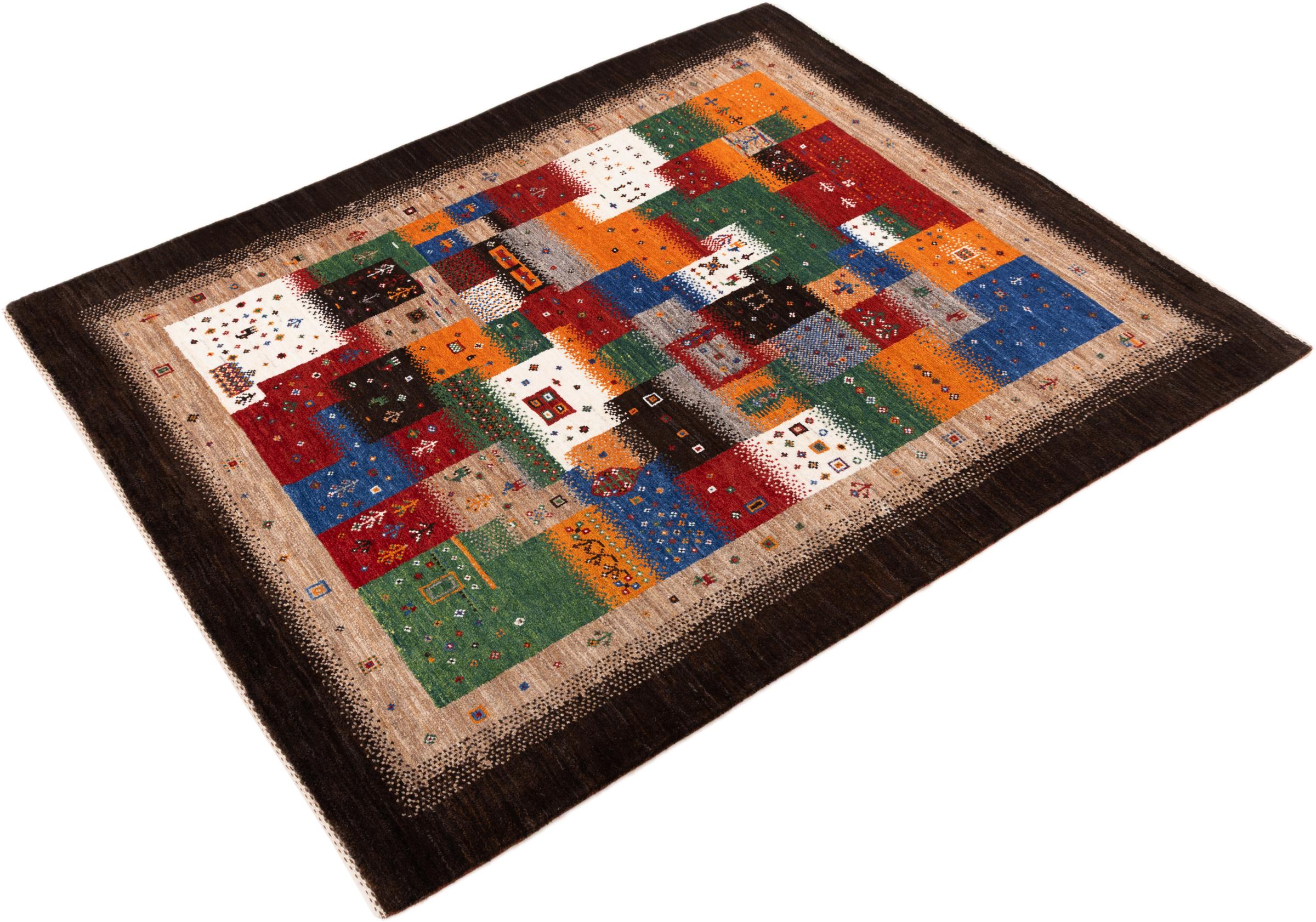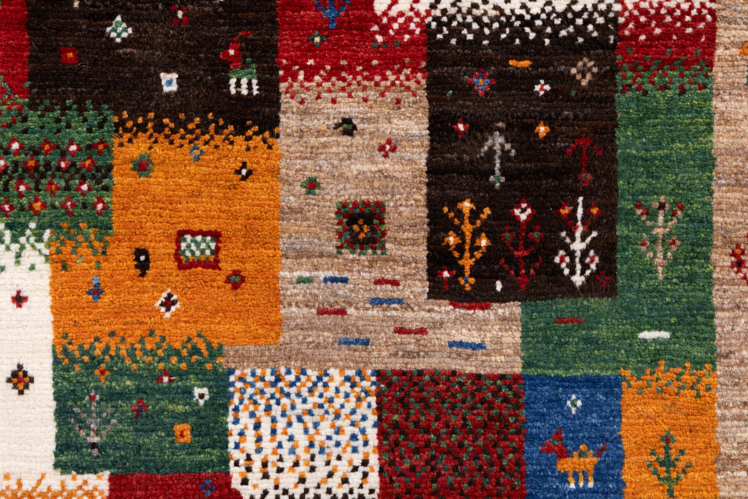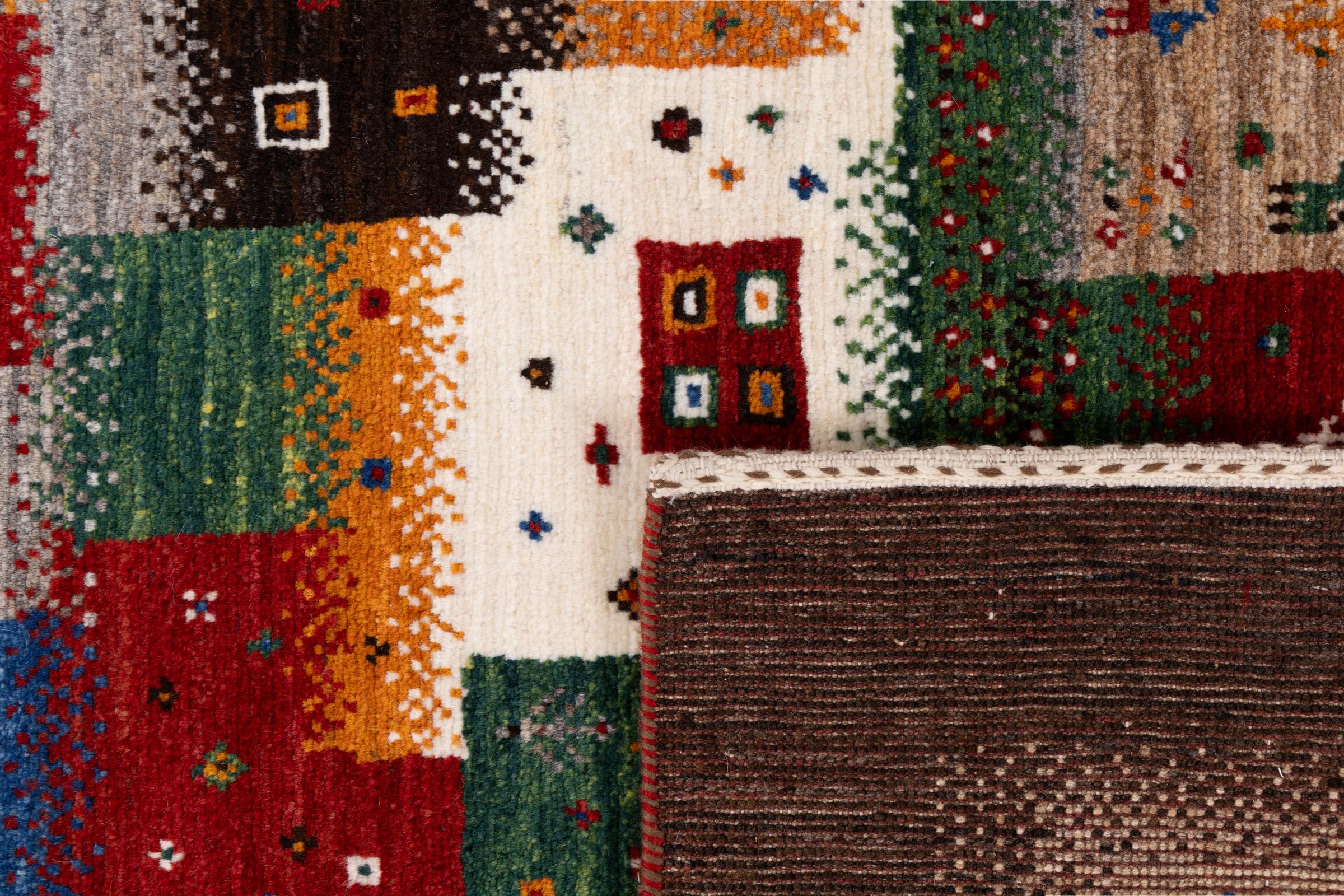 Dette smukke tæppe er en persisk Gabbeh og er en af ​​de højeste kvalitet Gabbeh tæpper. Tæpper er knyttet af nomader eller semi-nomader i Iran ved hjælp af traditionelt håndværk. De enkle motiver og mønstre er for det meste inspireret af nomadernes umiddelbare omgivelser. F.eks. Kan kameler, træer eller buske findes på traditionelle tæpper. Persiske Gabbeh-tæpper er lavet af uld fra lokale fårbesætninger. Ulden er derfor for det meste spundet for hånd. Hver af disse orientalske tæpper udgør en unik karakter af århundreder gammel kultur.