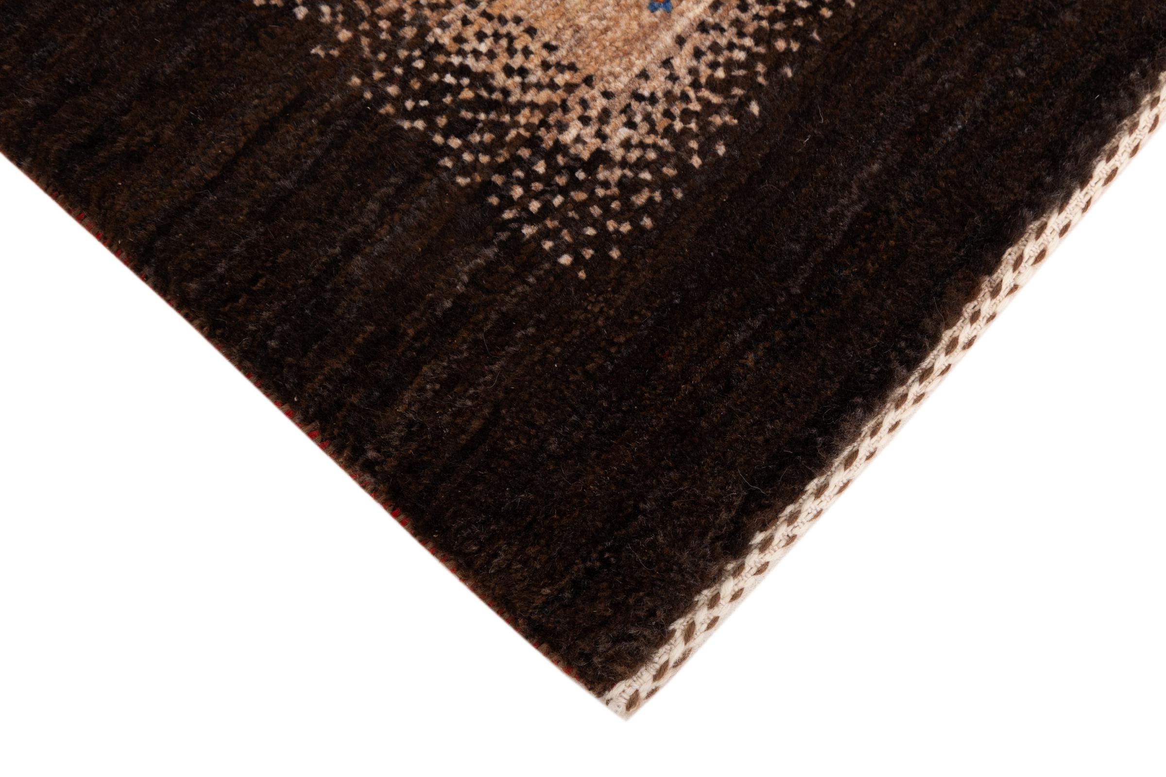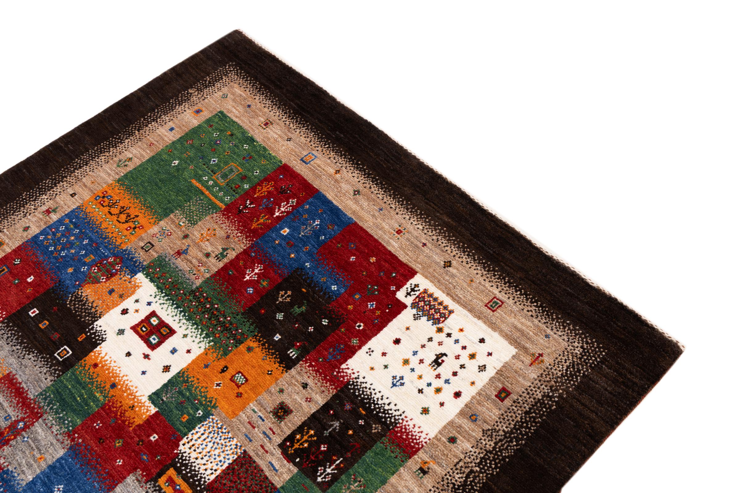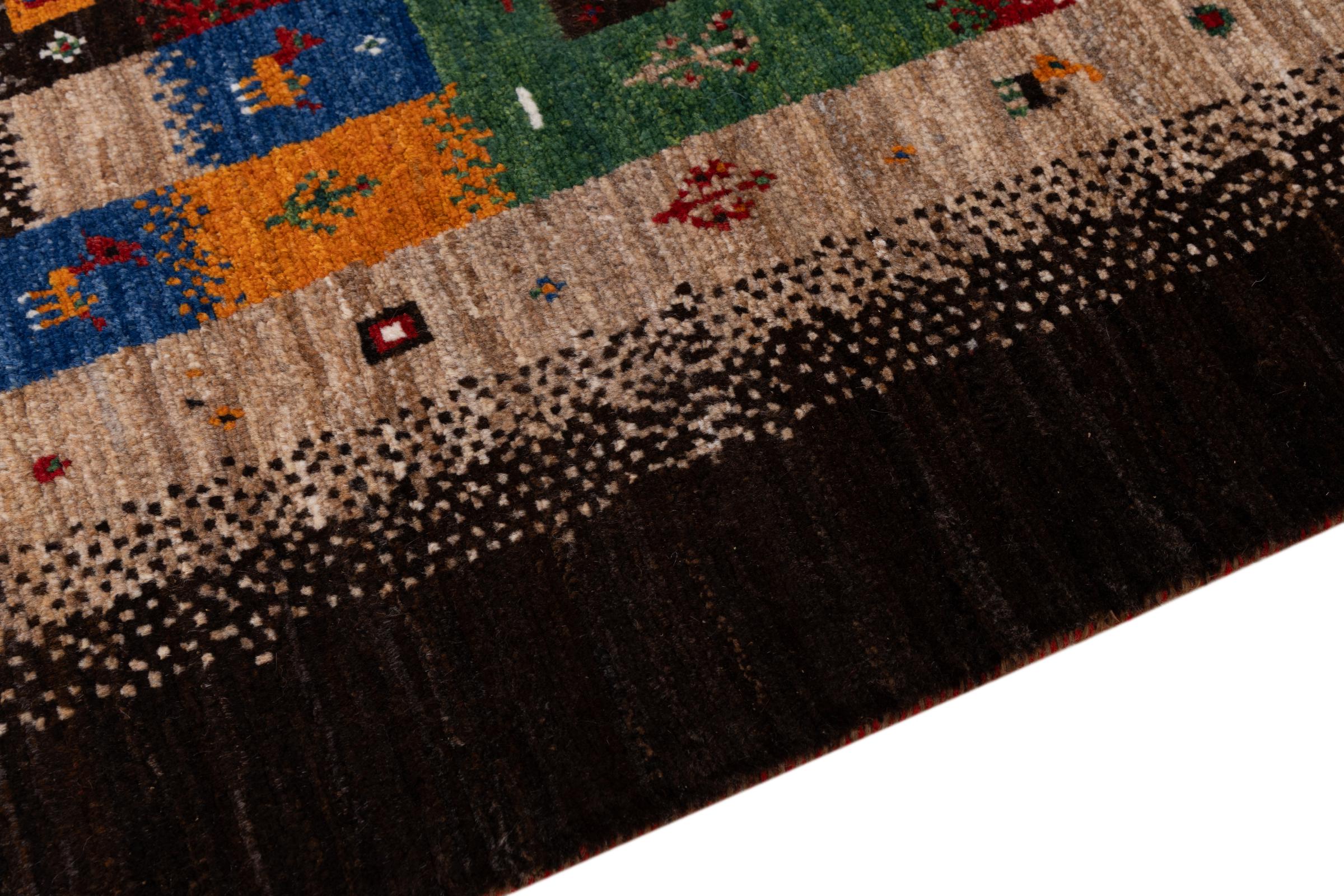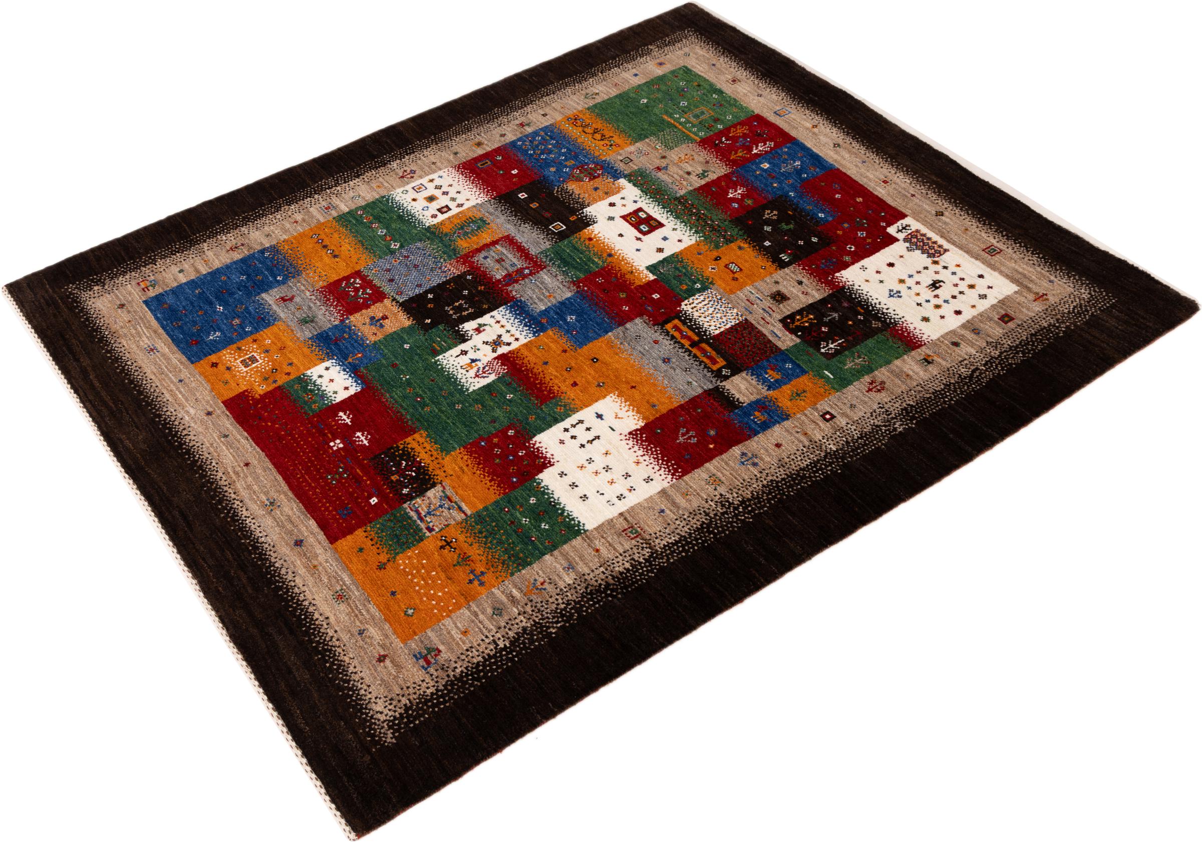 Dette smukke tæppe er en persisk Gabbeh og er en af ​​de højeste kvalitet Gabbeh tæpper. Tæpper er knyttet af nomader eller semi-nomader i Iran ved hjælp af traditionelt håndværk. De enkle motiver og mønstre er for det meste inspireret af nomadernes umiddelbare omgivelser. F.eks. Kan kameler, træer eller buske findes på traditionelle tæpper. Persiske Gabbeh-tæpper er lavet af uld fra lokale fårbesætninger. Ulden er derfor for det meste spundet for hånd. Hver af disse orientalske tæpper udgør en unik karakter af århundreder gammel kultur.