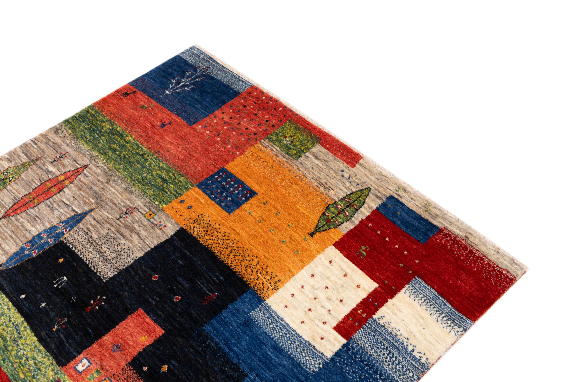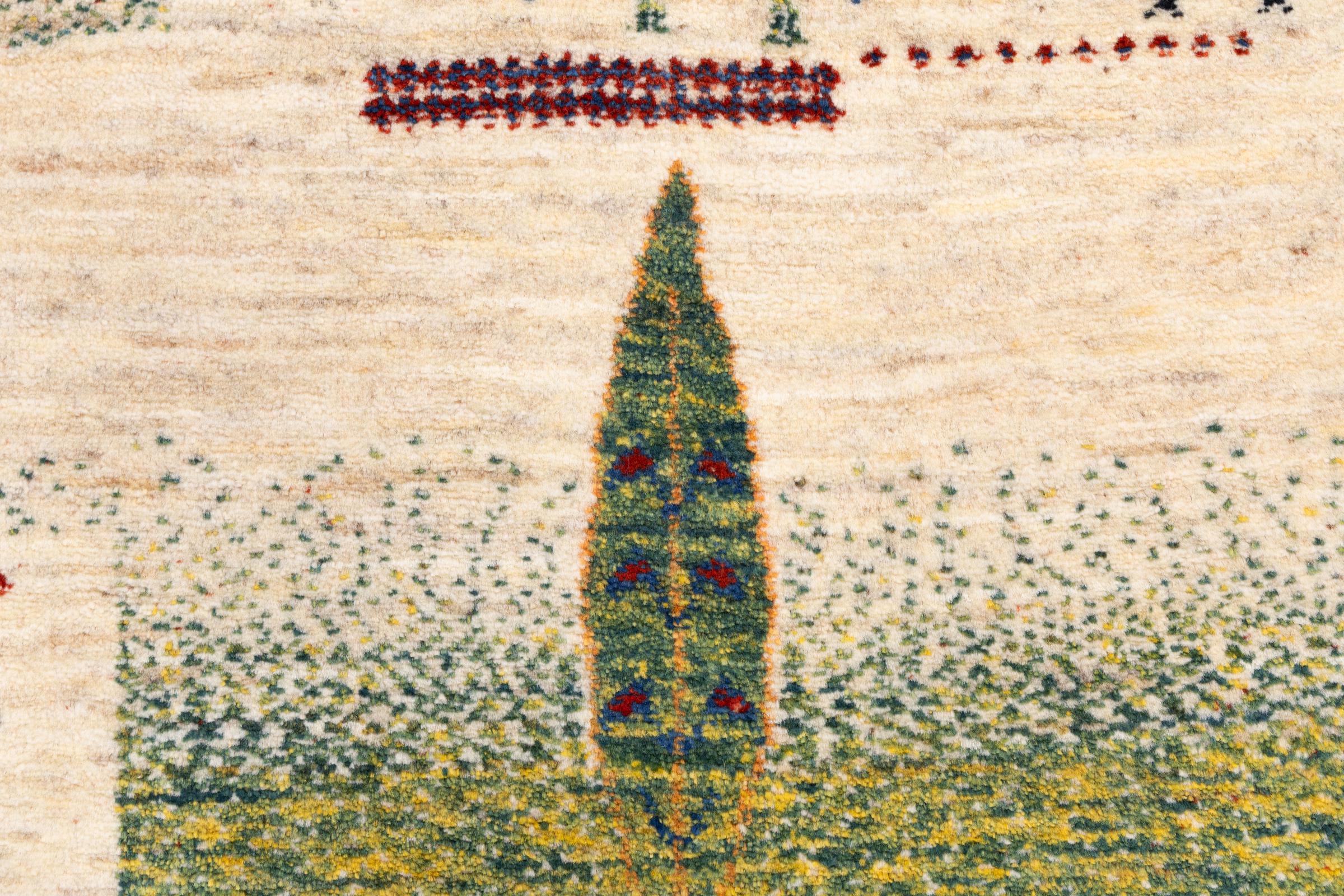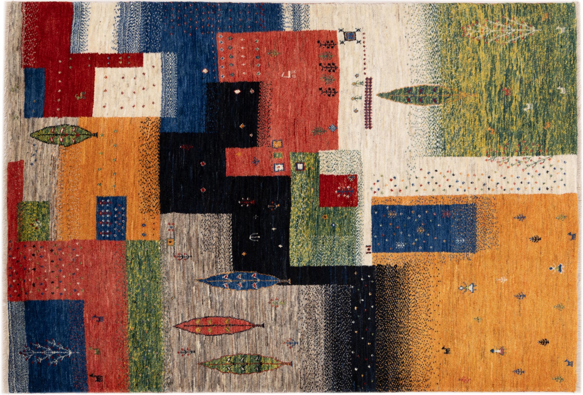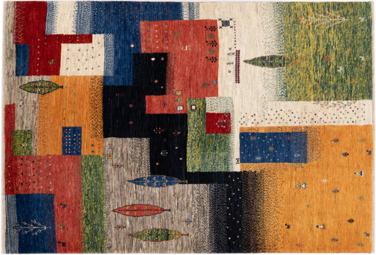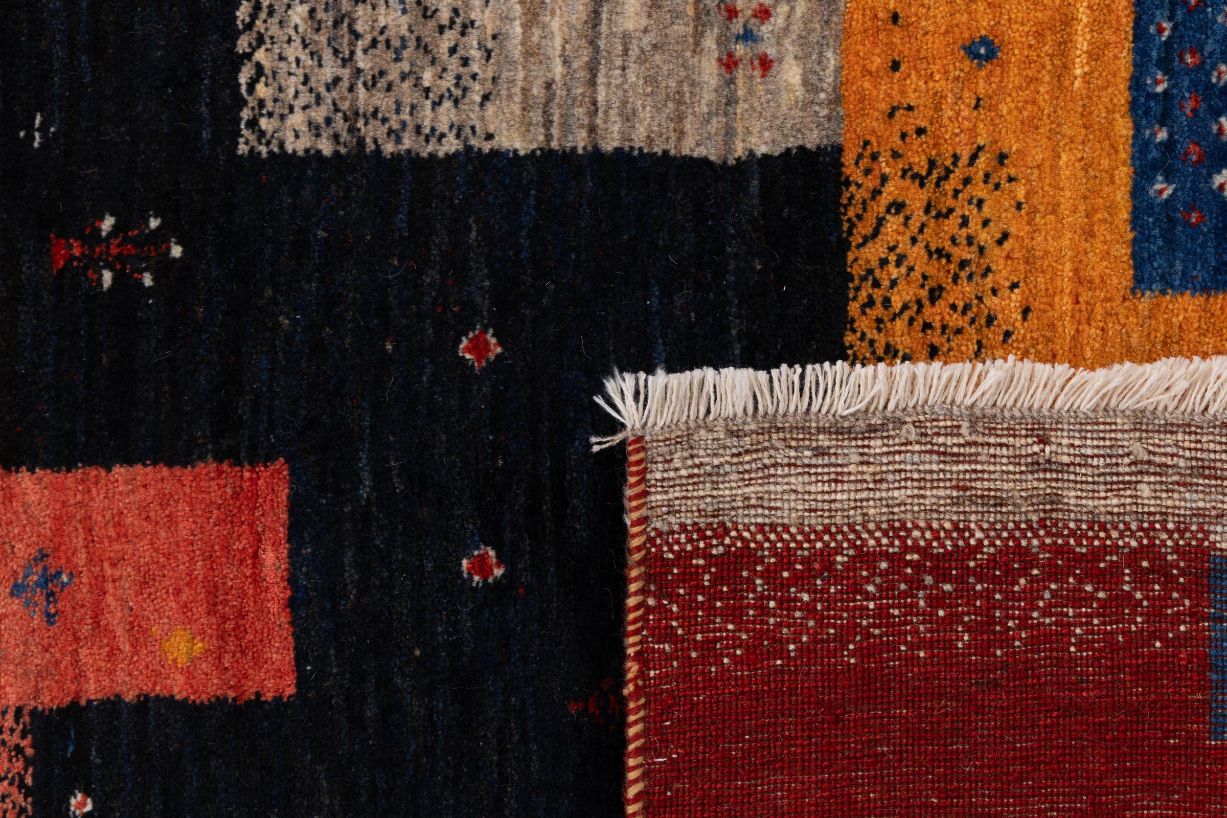 Dette smukke tæppe er en persisk Gabbeh og er en af ​​de højeste kvalitet Gabbeh tæpper. Tæpper er knyttet af nomader eller semi-nomader i Iran ved hjælp af traditionelt håndværk. De enkle motiver og mønstre er for det meste inspireret af nomadernes umiddelbare omgivelser. F.eks. Kan kameler, træer eller buske findes på traditionelle tæpper. Persiske Gabbeh-tæpper er lavet af uld fra lokale fårbesætninger. Ulden er derfor for det meste spundet for hånd. Hver af disse orientalske tæpper udgør en unik karakter af århundreder gammel kultur.
