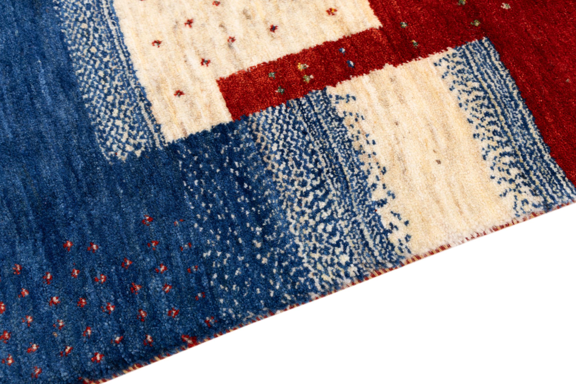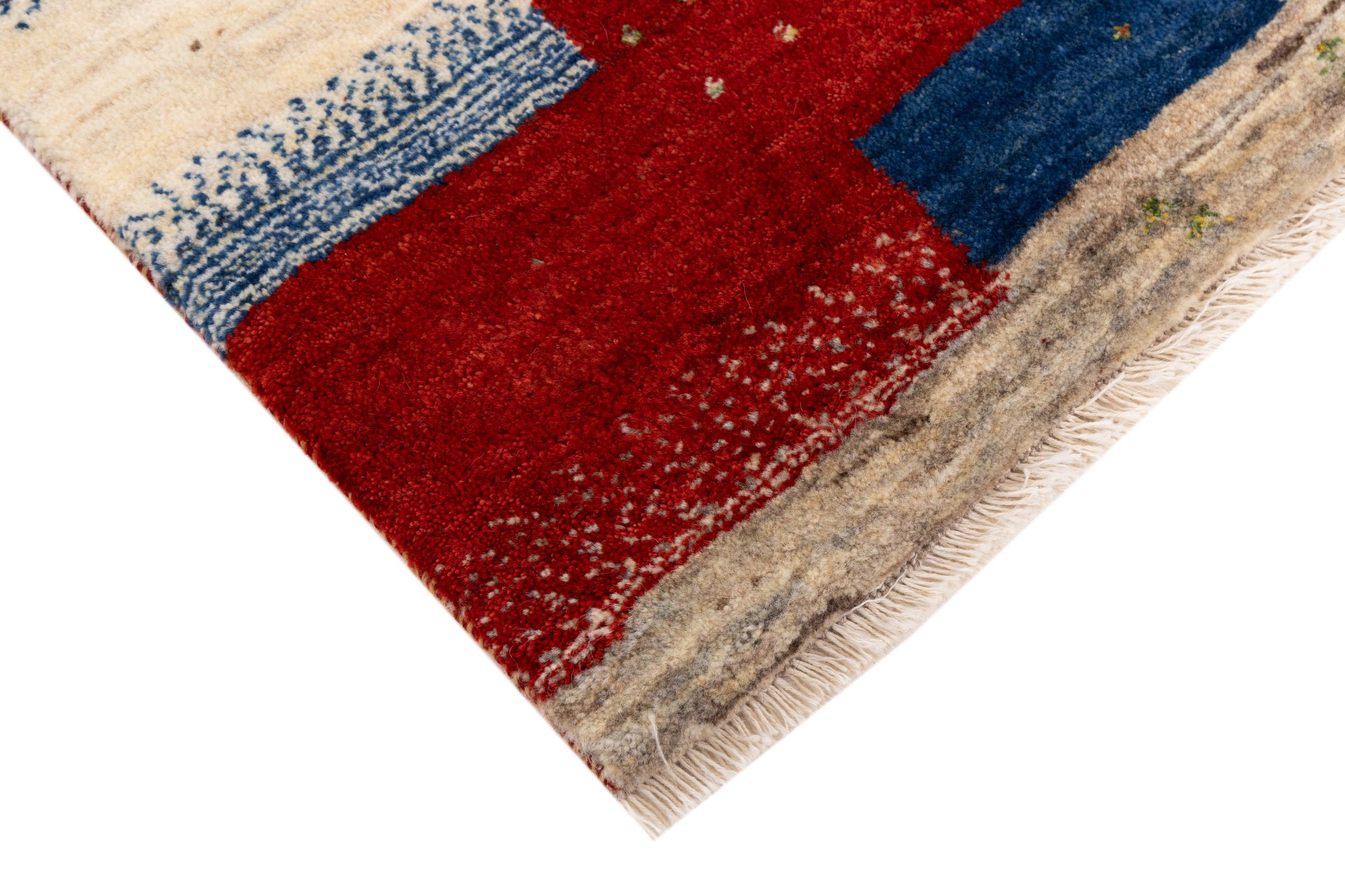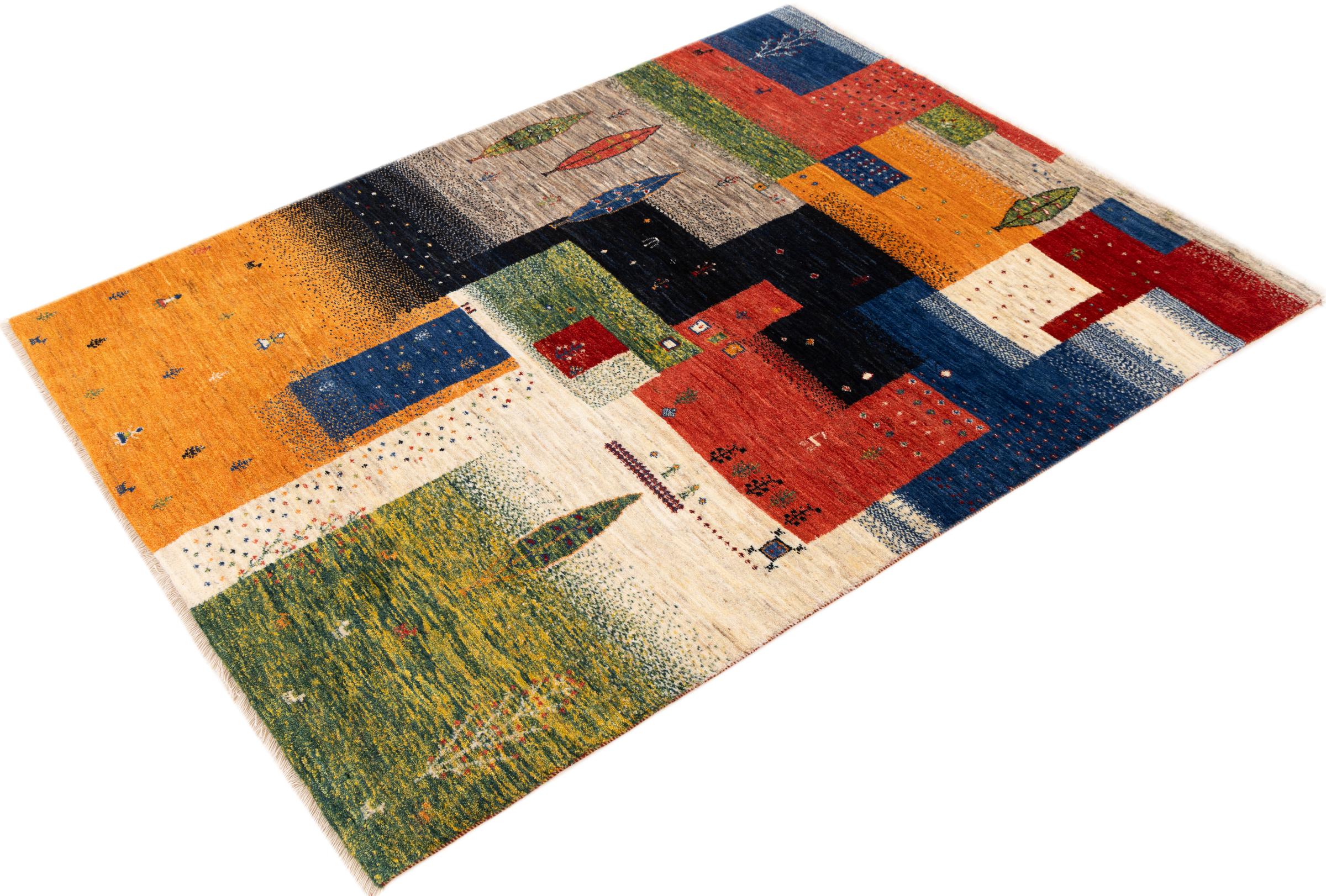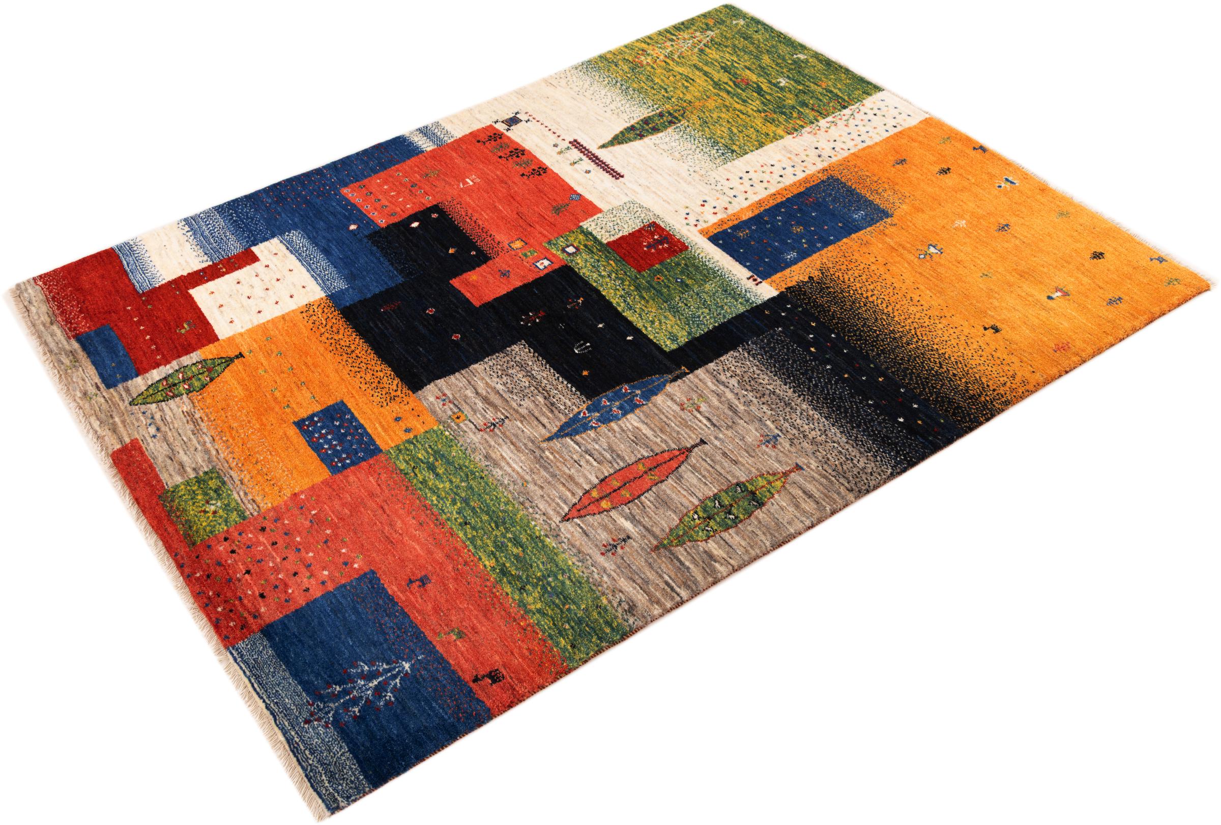 Dette smukke tæppe er en persisk Gabbeh og er en af ​​de højeste kvalitet Gabbeh tæpper. Tæpper er knyttet af nomader eller semi-nomader i Iran ved hjælp af traditionelt håndværk. De enkle motiver og mønstre er for det meste inspireret af nomadernes umiddelbare omgivelser. F.eks. Kan kameler, træer eller buske findes på traditionelle tæpper. Persiske Gabbeh-tæpper er lavet af uld fra lokale fårbesætninger. Ulden er derfor for det meste spundet for hånd. Hver af disse orientalske tæpper udgør en unik karakter af århundreder gammel kultur.
